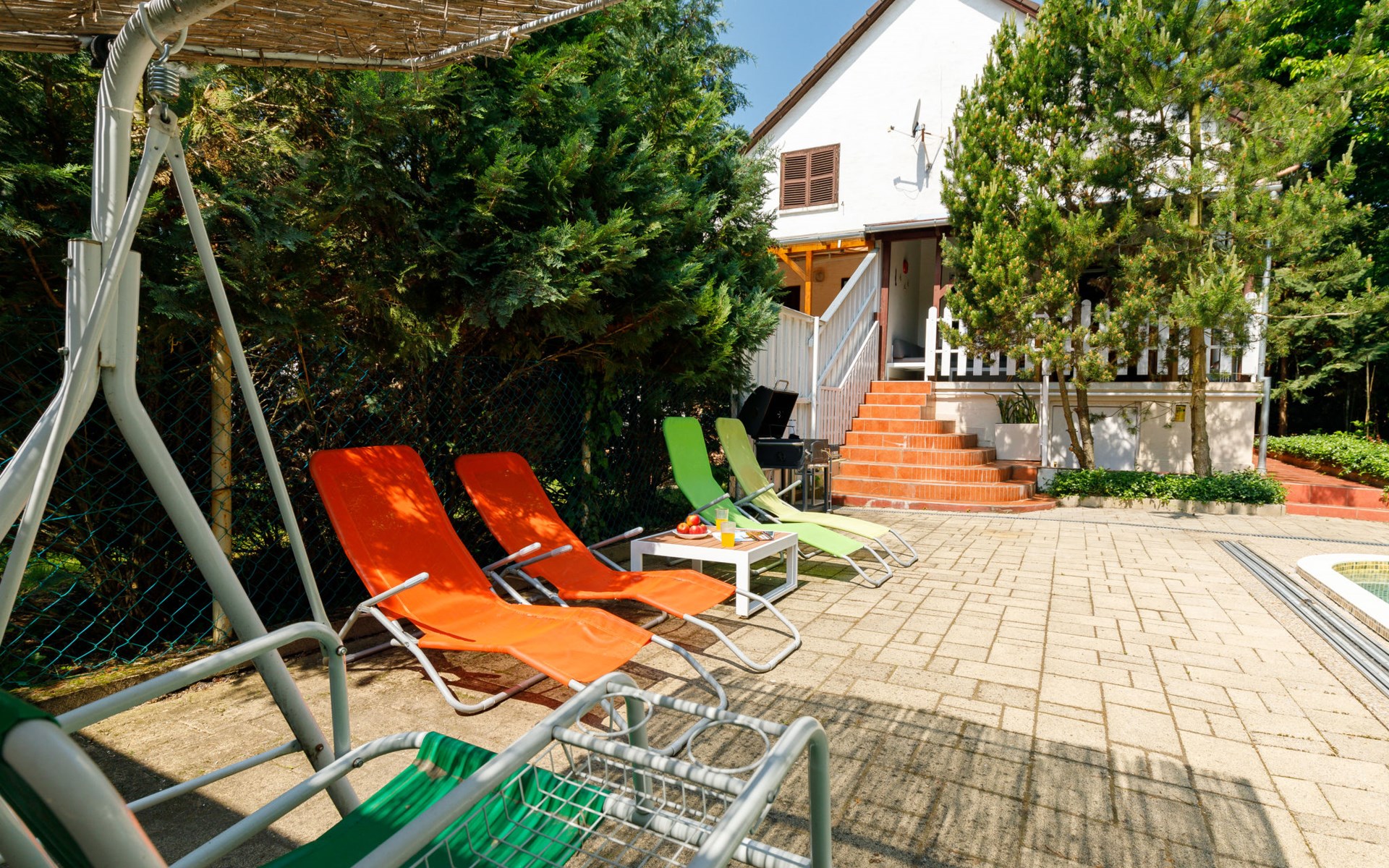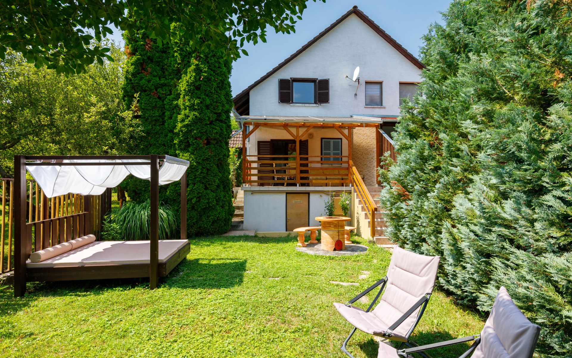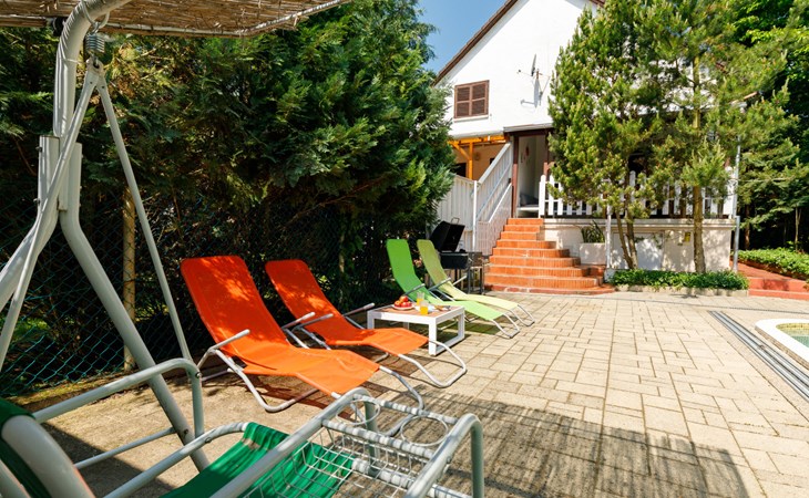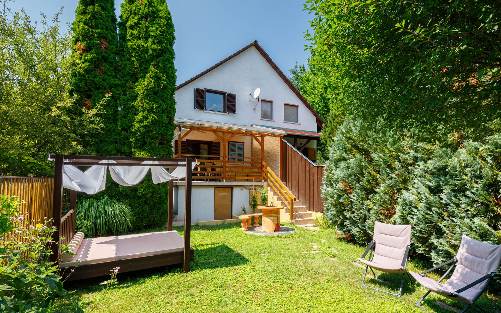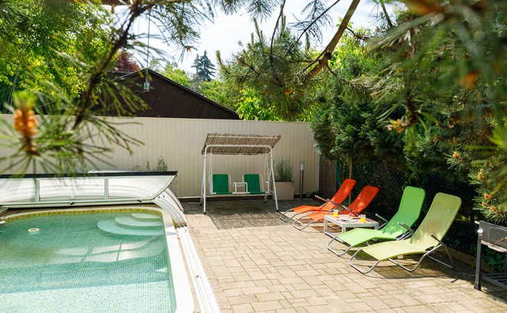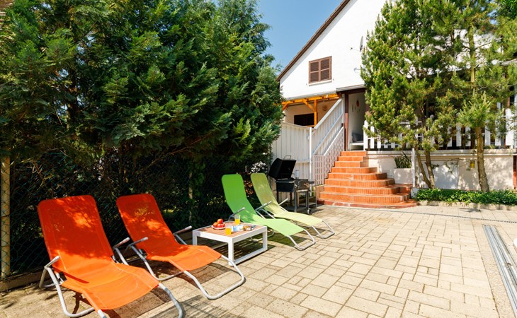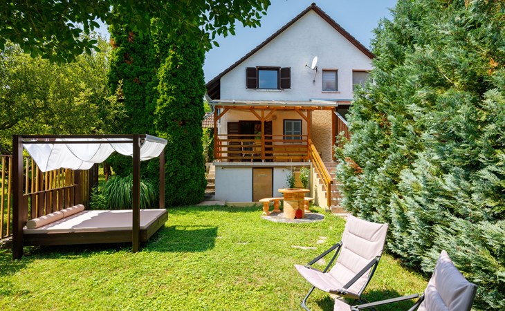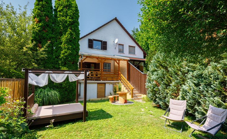 Balatonkenese 22 km from Siófok: The accommodation is a two-under-one-roof where the two parts are connected through the garden. There are two living rooms and two complete kitchen. In one part 6 persons can sleep, the other part offers 5 beds. Cosy semi-detached house, 2 storeys. In the resort, in a quiet position, 1 km from the lake, 700 m from the beach. Private: garden (fenced), swimming pool angular (6 x 3 m, 18 m2, depth 90 cm, seasonal availability: 01.May. - 15.Sep.) with shutter cover. Outdoor shower, garden furniture, barbecue. In the house: WiFi, air conditioning (extra). Grocery 1 km, supermarket 5 km, restaurant 800 m, bakery 1 km, café 1 km, bicycle rental 850 m, bus stop "Balatonkenese, újtelep" 210 m, railway station "Balatonkenese" 1 km, grass beach 730 m, thermal baths "Tamási Thermal Spa" 61 km. Surf school 7 km, sailing school 2 km, tennis 800 m, riding stable 2 km, cycle lane 150 m, children's playground 600 m. Nearby attractions: Siófok Zoo 18 km, Balatoni Bob Theme Park 10 km, Balatonfüred 47 km, The Benedictine Abbey of Tihany 54 km, Tamási Thermal Spa 53 km.
