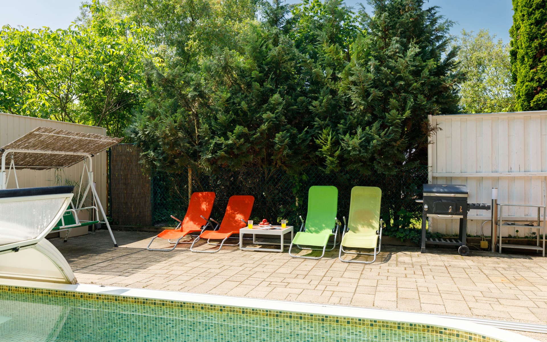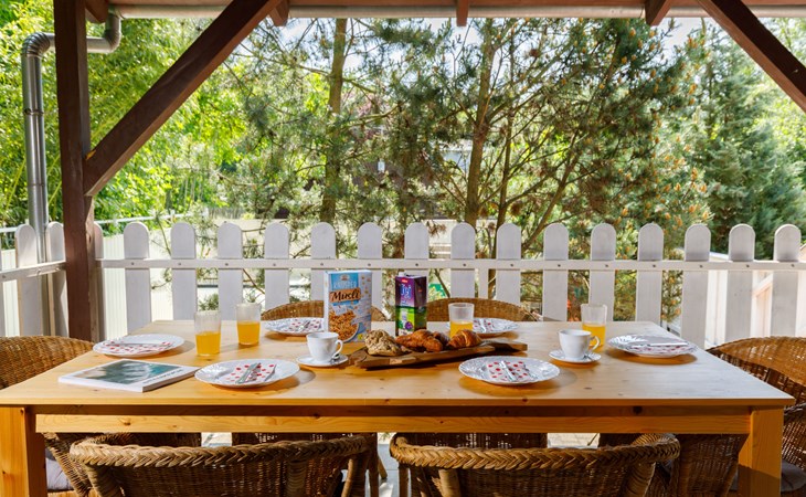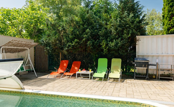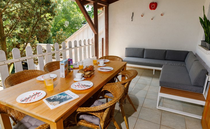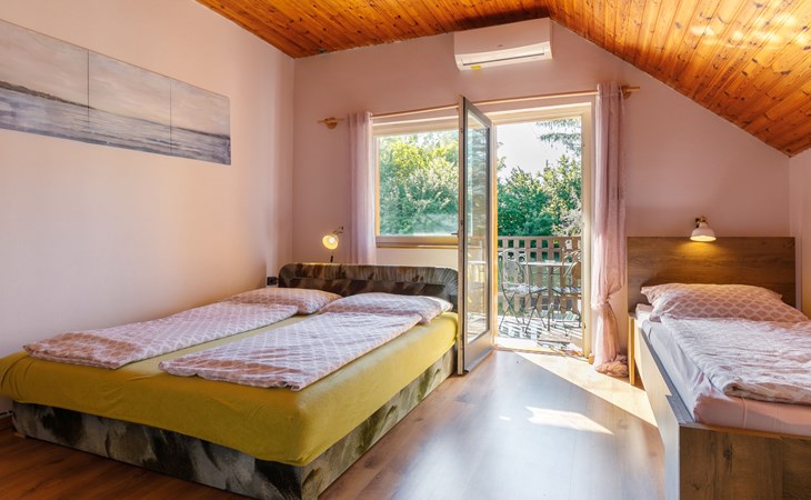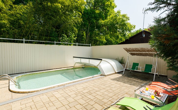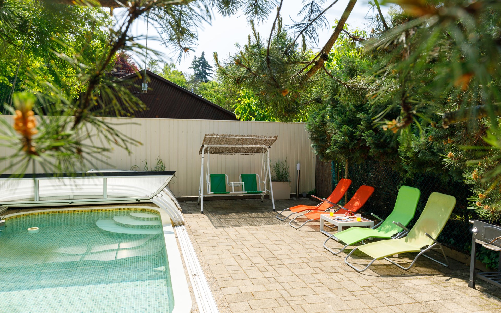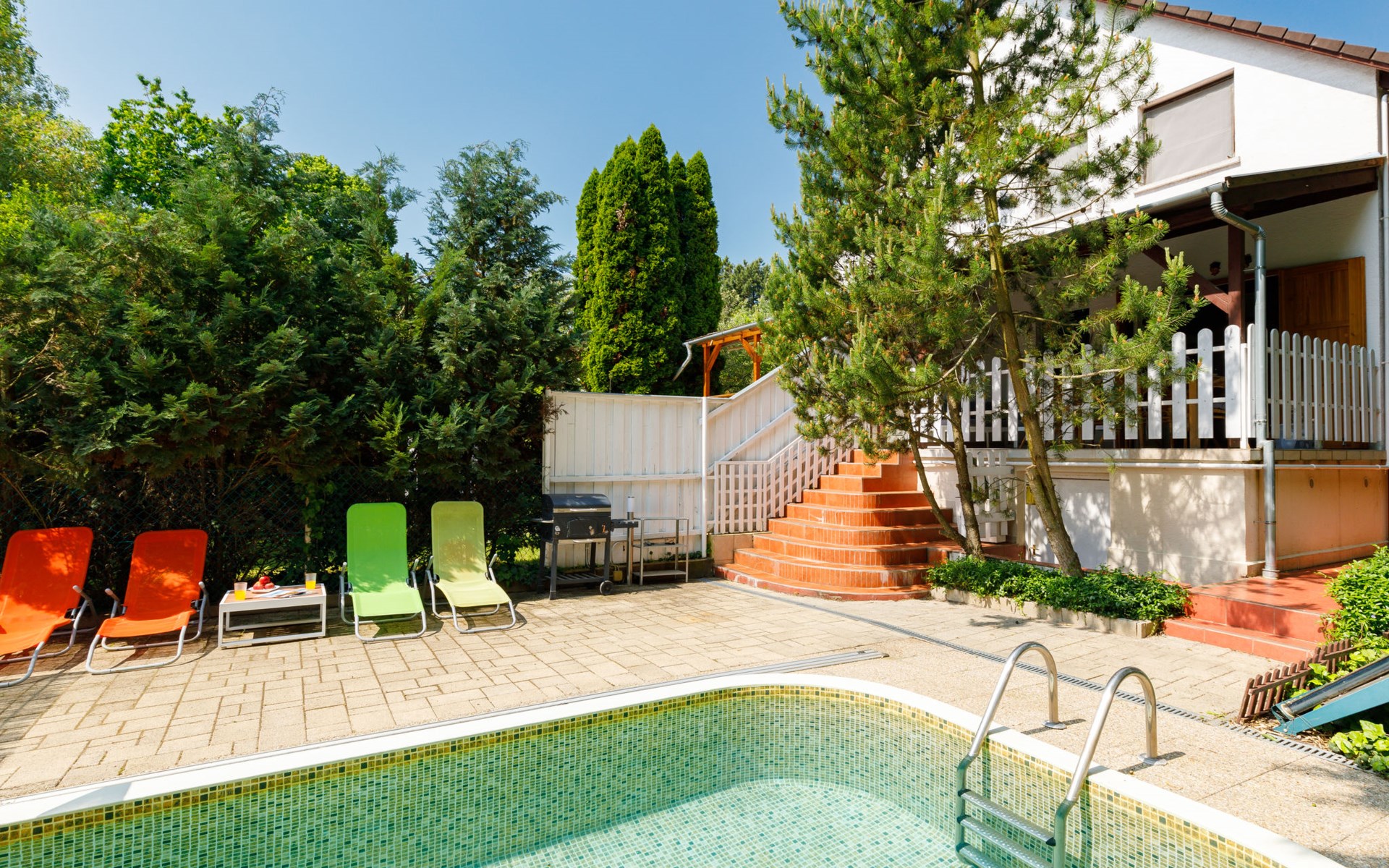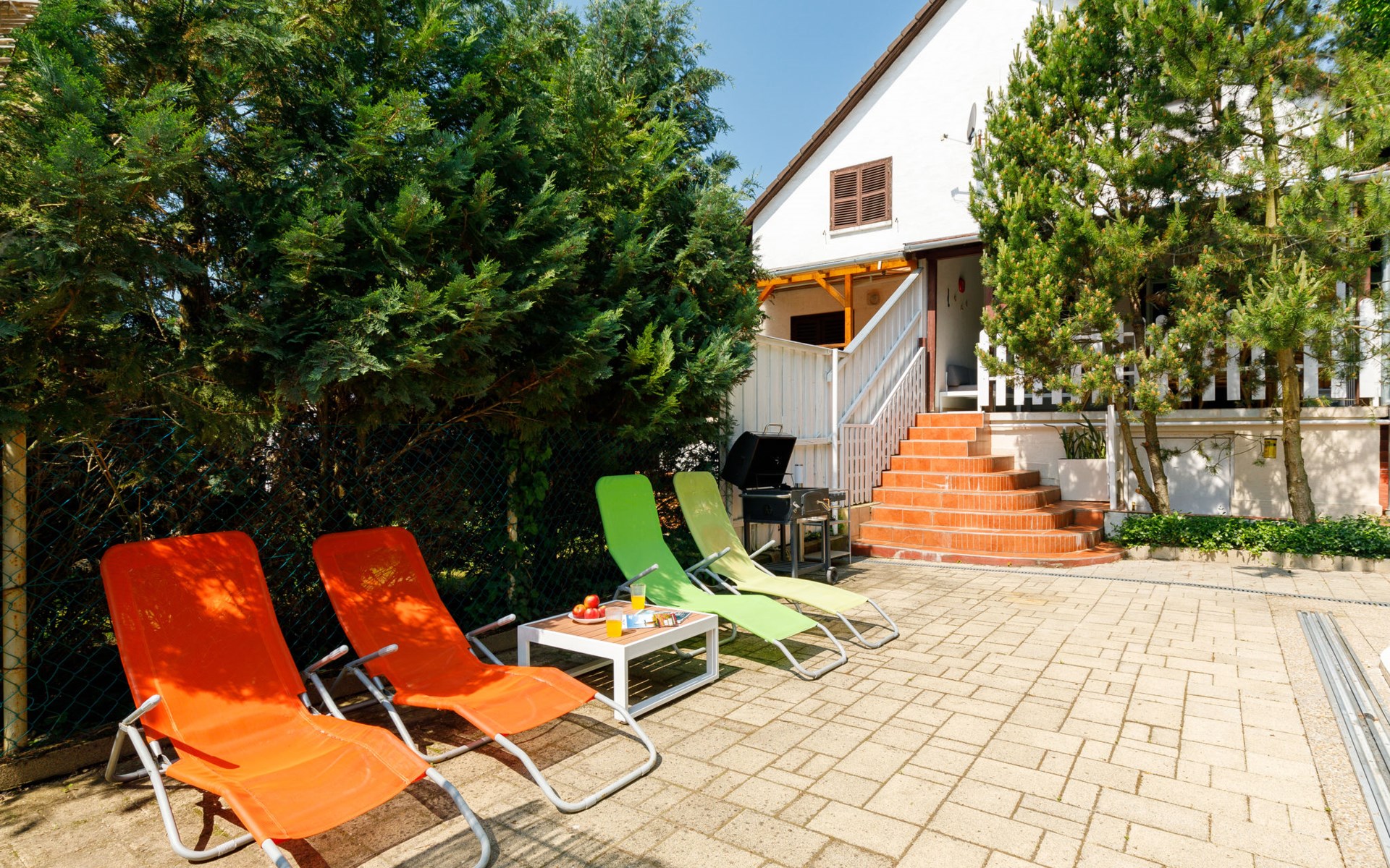 Balatonkenese 22 km from Siófok: The accommodation is a two-under-one-roof where the two parts are connected through the garden. There are two living rooms and two complete kitchen. In one part 6 persons can sleep, the other part offers 5 beds. Cosy semi-detached house, 2 storeys. In the resort, in a quiet position, 1 km from the lake, 700 m from the beach. Private: garden (fenced), swimming pool angular (6 x 3 m, 18 m2, depth 90 cm, seasonal availability: 01.May. - 15.Sep.) with shutter cover. Outdoor shower, garden furniture, barbecue. In the house: WiFi, air conditioning (extra). Grocery 1 km, supermarket 5 km, restaurant 800 m, bakery 1 km, café 1 km, bicycle rental 850 m, bus stop "Balatonkenese, újtelep" 210 m, railway station "Balatonkenese" 1 km, grass beach 730 m, thermal baths "Tamási Thermal Spa" 61 km. Surf school 7 km, sailing school 2 km, tennis 800 m, riding stable 2 km, cycle lane 150 m, children's playground 600 m. Nearby attractions: Siófok Zoo 18 km, Balatoni Bob Theme Park 10 km, Balatonfüred 47 km, The Benedictine Abbey of Tihany 54 km, Tamási Thermal Spa 53 km.