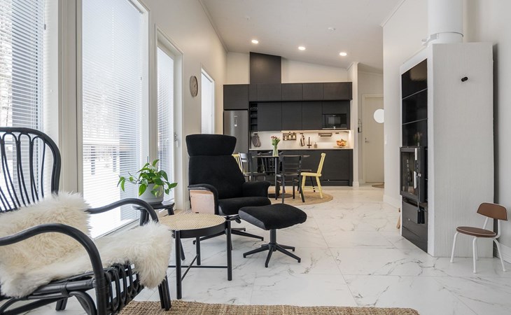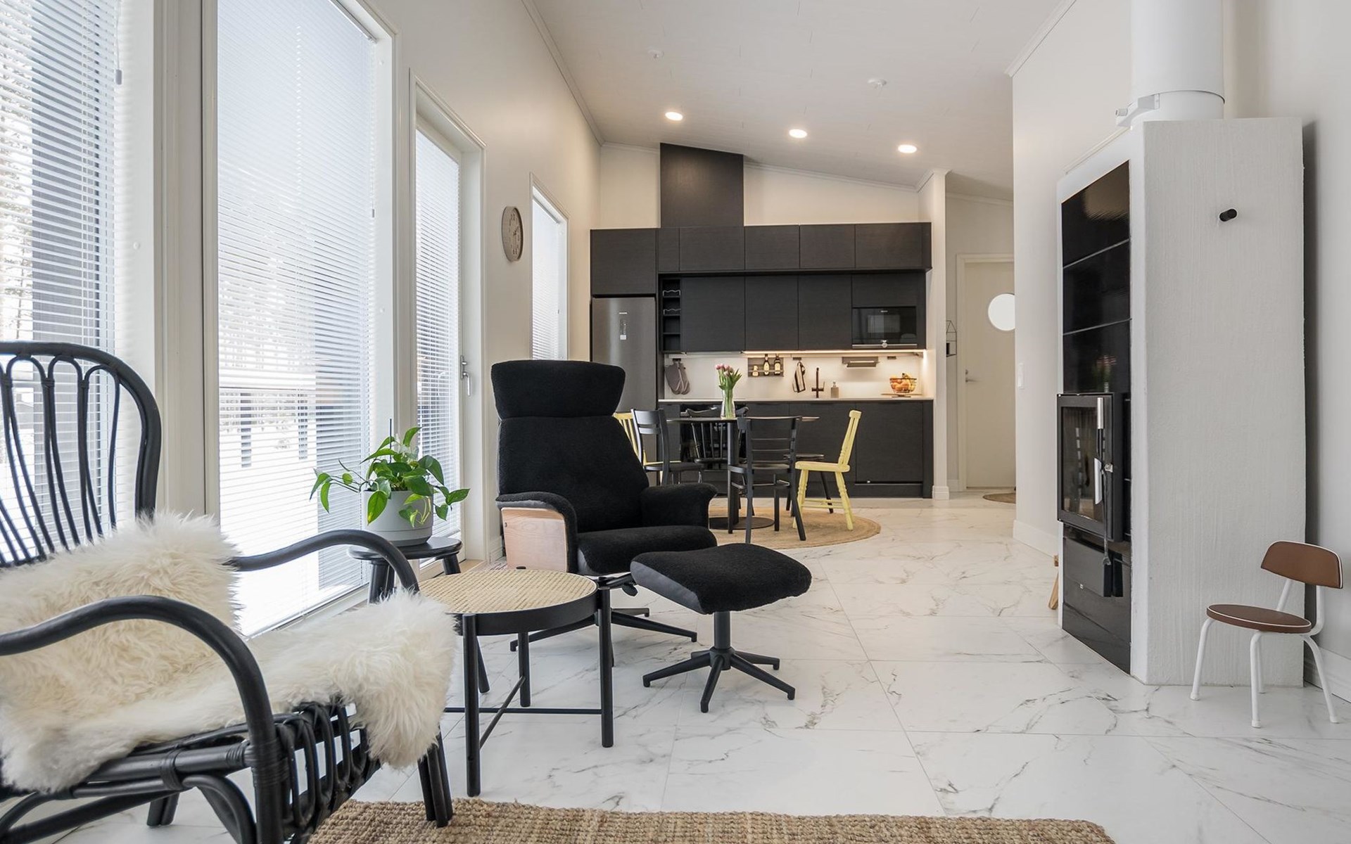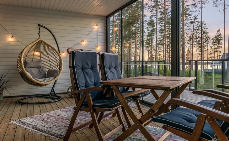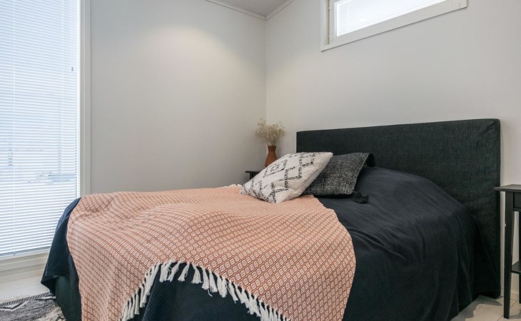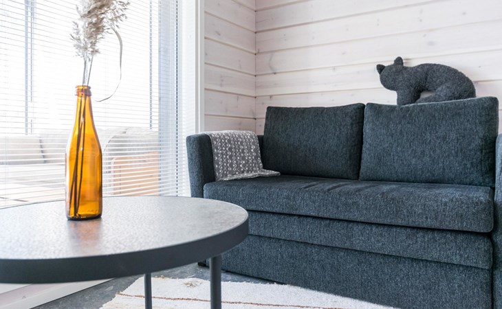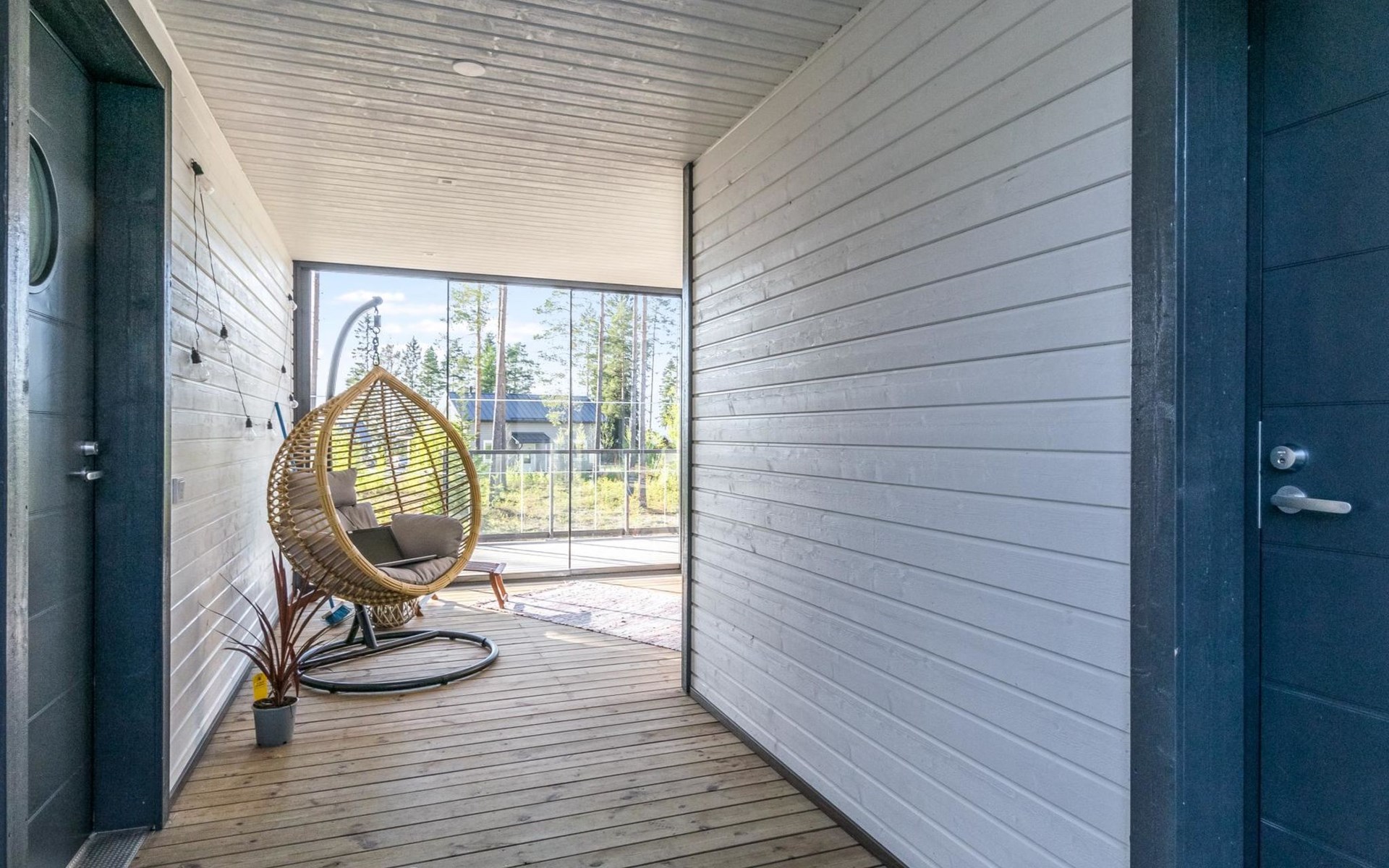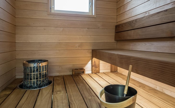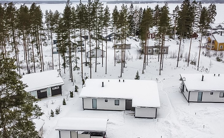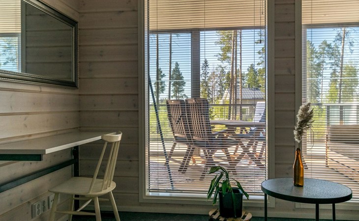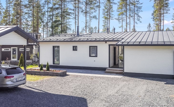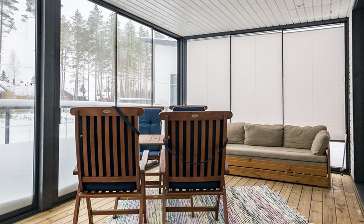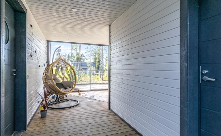Wooden holiday home with boarded outer walls, built in 2021. Living room (140x190 cm sofa bed), living room/kitchen, heat storing fireplace, separate WC, utility room (washing machine and tumble dryer). Two bedrooms, bedroom 1: double bed, bedroom 2: double bed 140x200 cm and sofa bed (120 cm). Access to the bedroom is from the glazed terrace, the room is also a dressing room for sauna. Sauna is equipped with electric sauna stove, washroom with shower and WC, spacious glazed terrace.