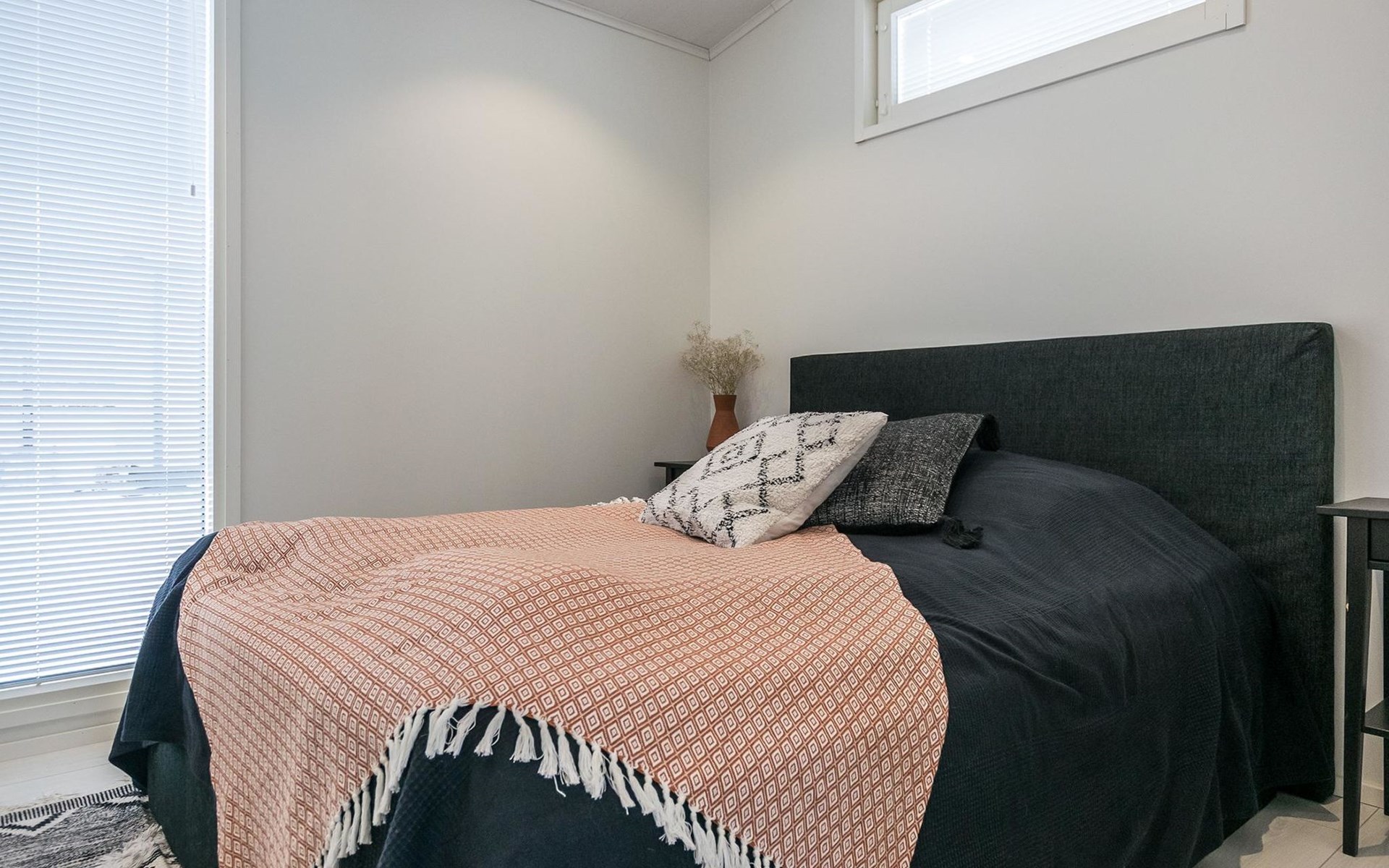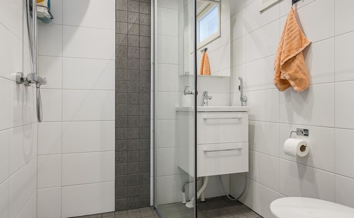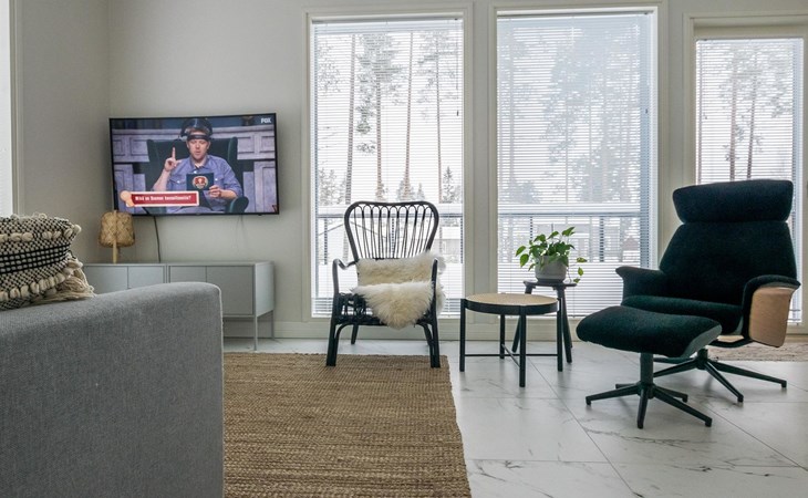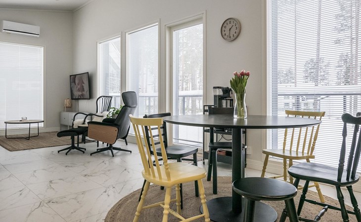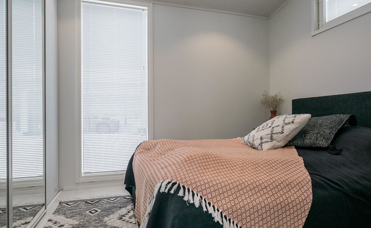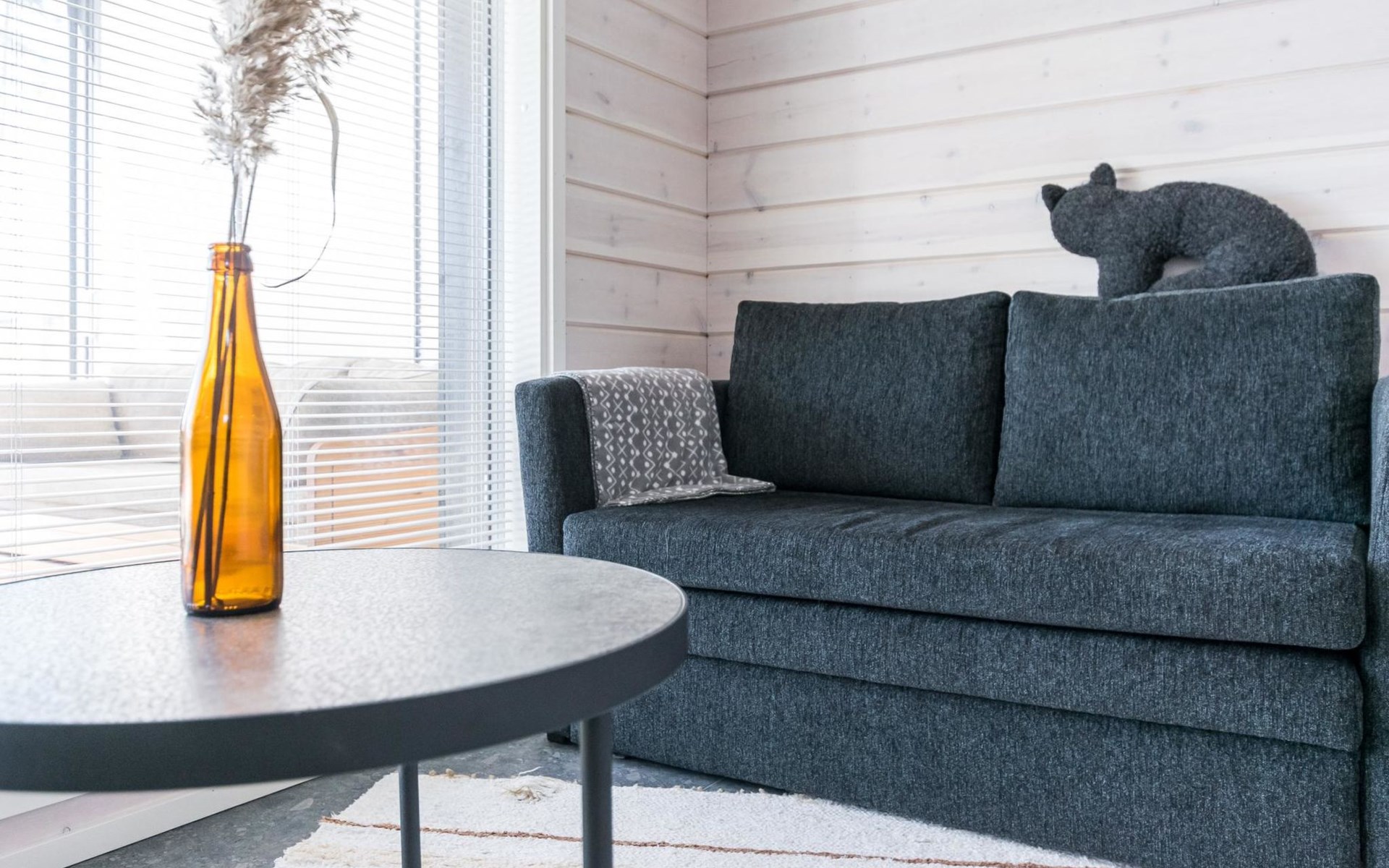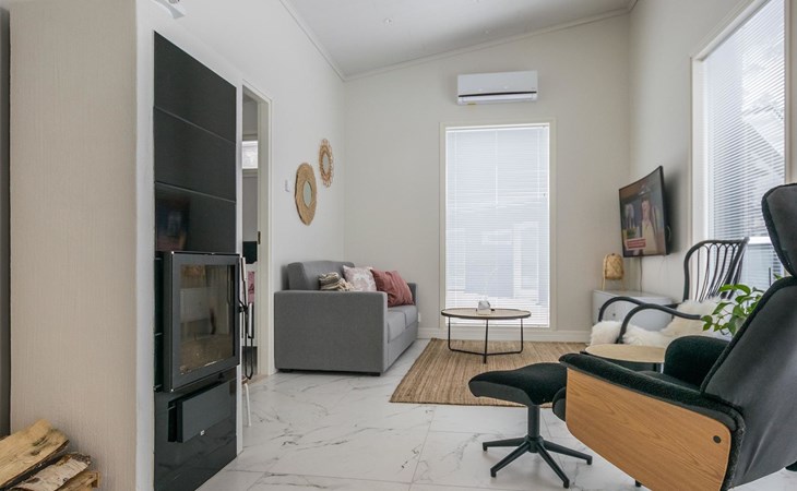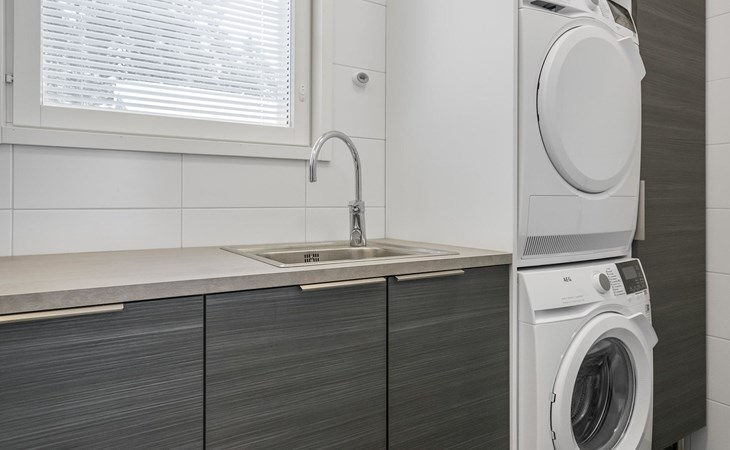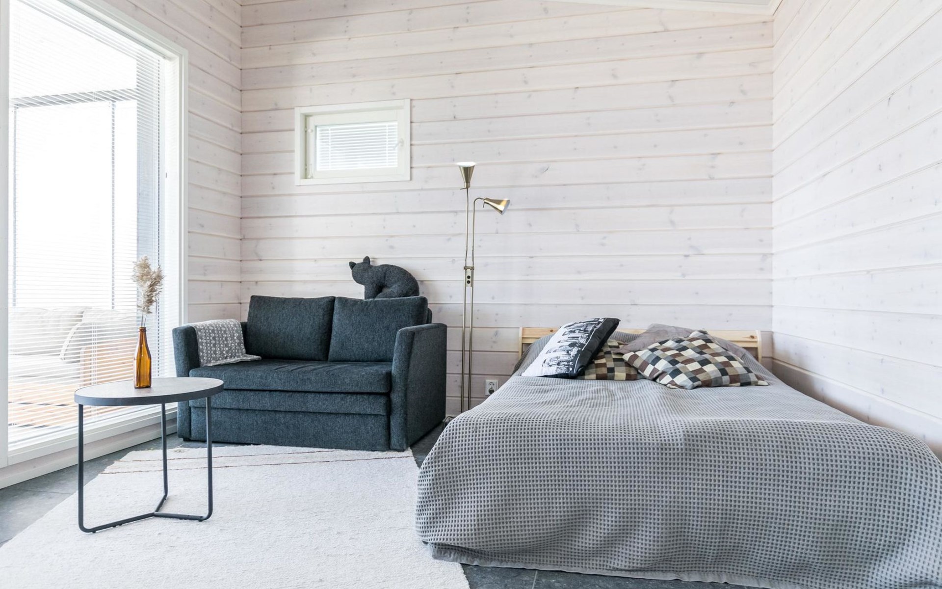 Wooden holiday home with boarded outer walls, built in 2021. Living room (140x190 cm sofa bed), living room/kitchen, heat storing fireplace, separate WC, utility room (washing machine and tumble dryer). Two bedrooms, bedroom 1: double bed, bedroom 2: double bed 140x200 cm and sofa bed (120 cm). Access to the bedroom is from the glazed terrace, the room is also a dressing room for sauna. Sauna is equipped with electric sauna stove, washroom with shower and WC, spacious glazed terrace.