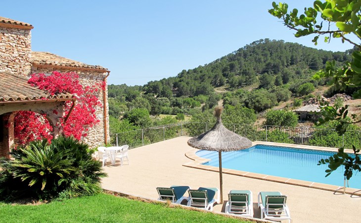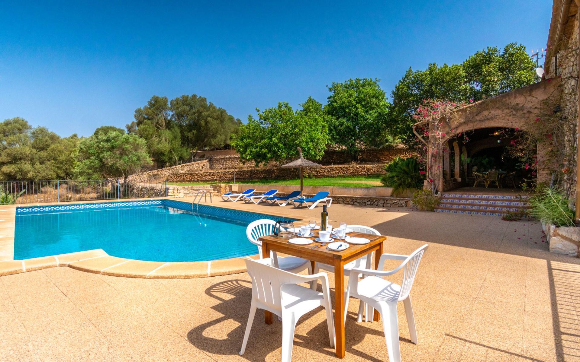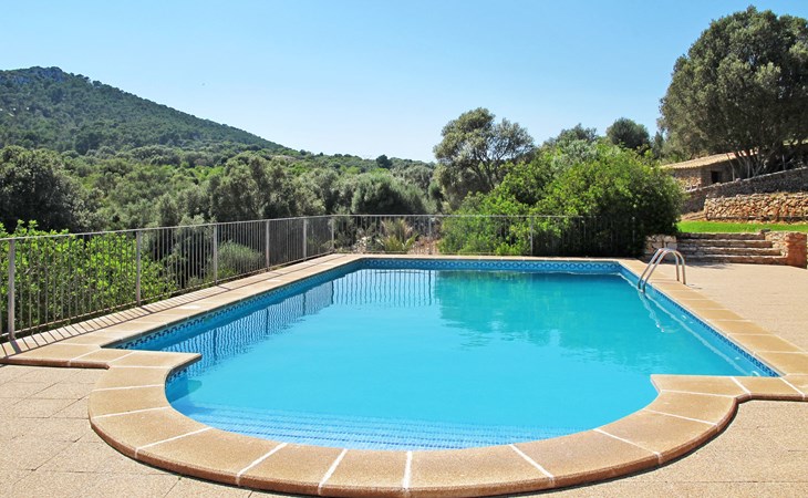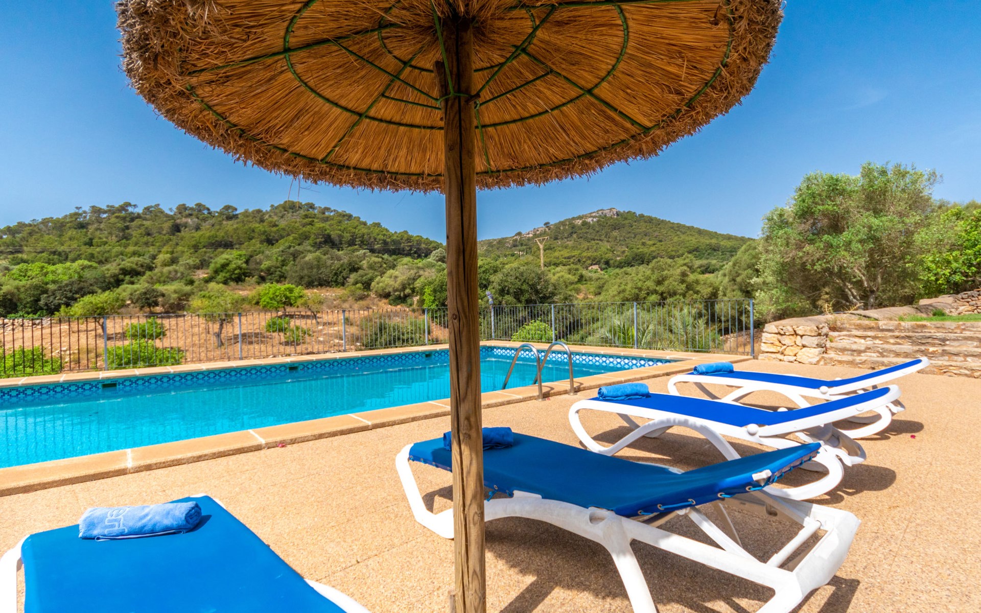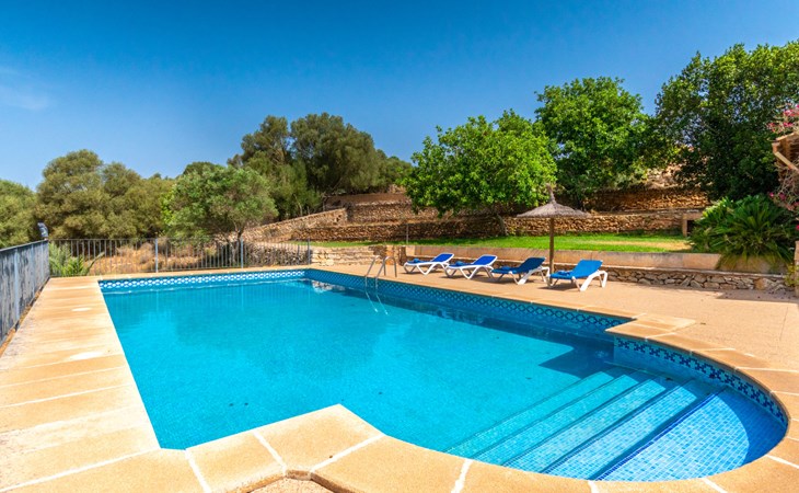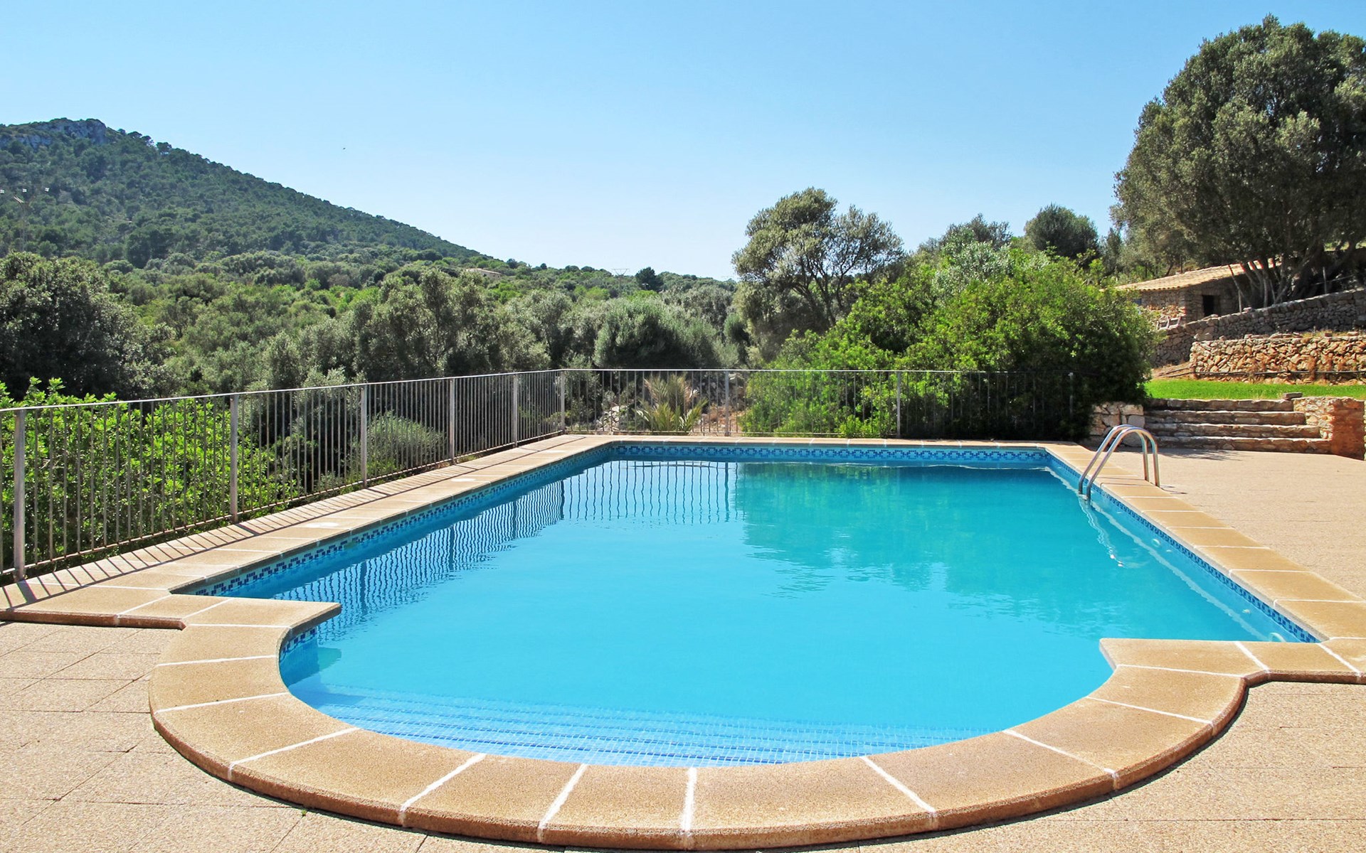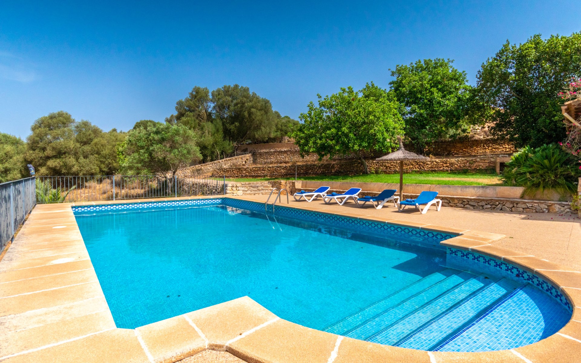 Farm estate "Can Caubo". 3 km from the centre of Calonge, 3.5 km from the centre of S'Horta, 57 km from the centre of Palma, on a slope, 6.5 km from the sea. Private: property 3'000 m2, terraced garden with lawn and trees, swimming pool (10 x 5 m, seasonal availability: 01.Jan. - 31.Dec.). Outdoor shower, terrace. In the house: central heating system. Parking on the premises. Shop 3 km, restaurant 1.4 km, bar 3 km, bus stop 200 m, sandy beach 6.5 km. Please note: car recommended. 1st floor is closed and not occupied.