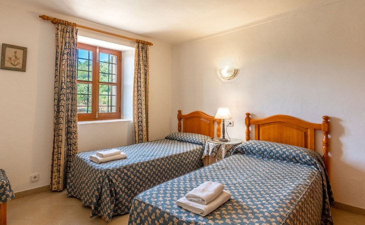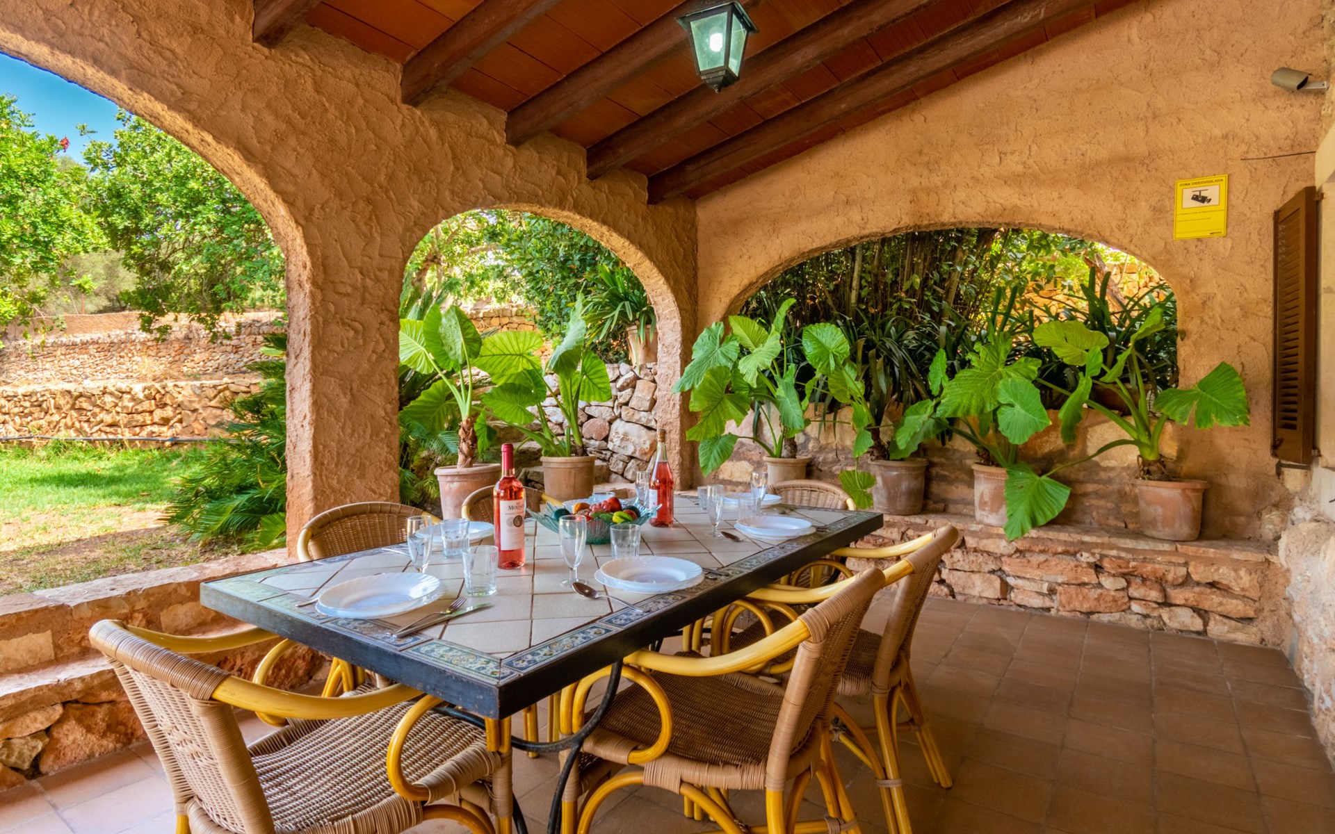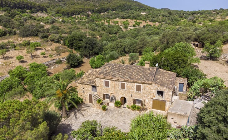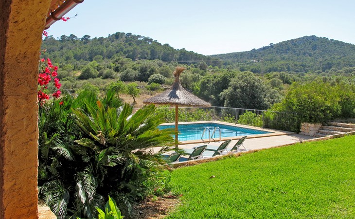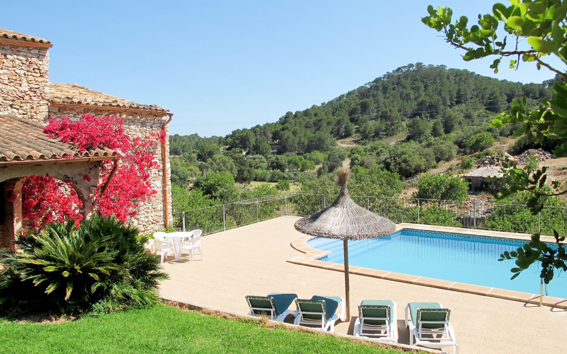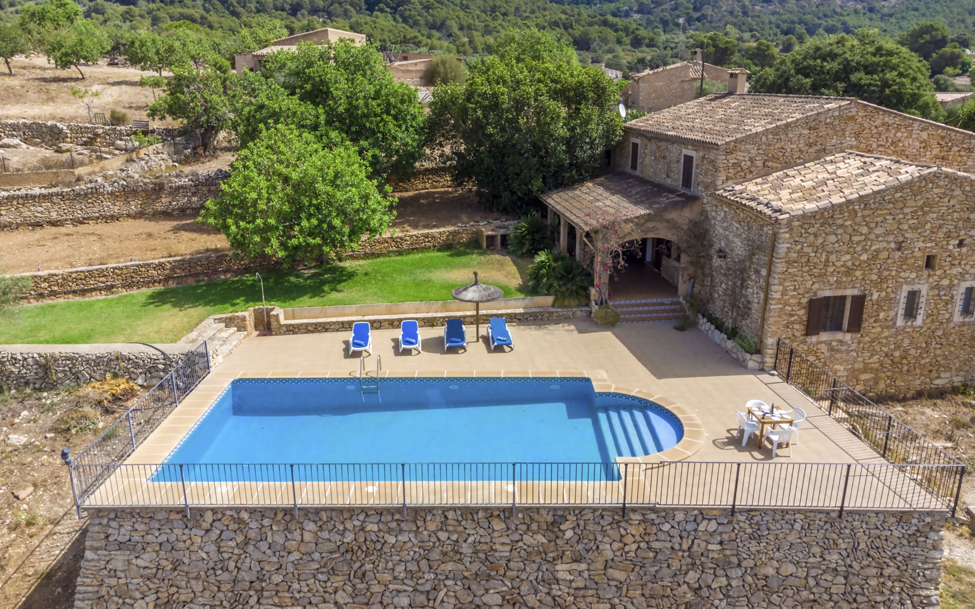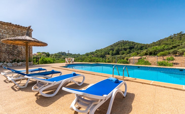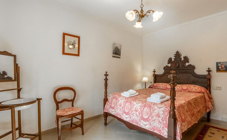 Farm estate "Can Caubo". 3 km from the centre of Calonge, 3.5 km from the centre of S'Horta, 57 km from the centre of Palma, on a slope, 6.5 km from the sea. Private: property 3'000 m2, terraced garden with lawn and trees, swimming pool (10 x 5 m, seasonal availability: 01.Jan. - 31.Dec.). Outdoor shower, terrace. In the house: central heating system. Parking on the premises. Shop 3 km, restaurant 1.4 km, bar 3 km, bus stop 200 m, sandy beach 6.5 km. Please note: car recommended. 1st floor is closed and not occupied.