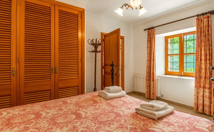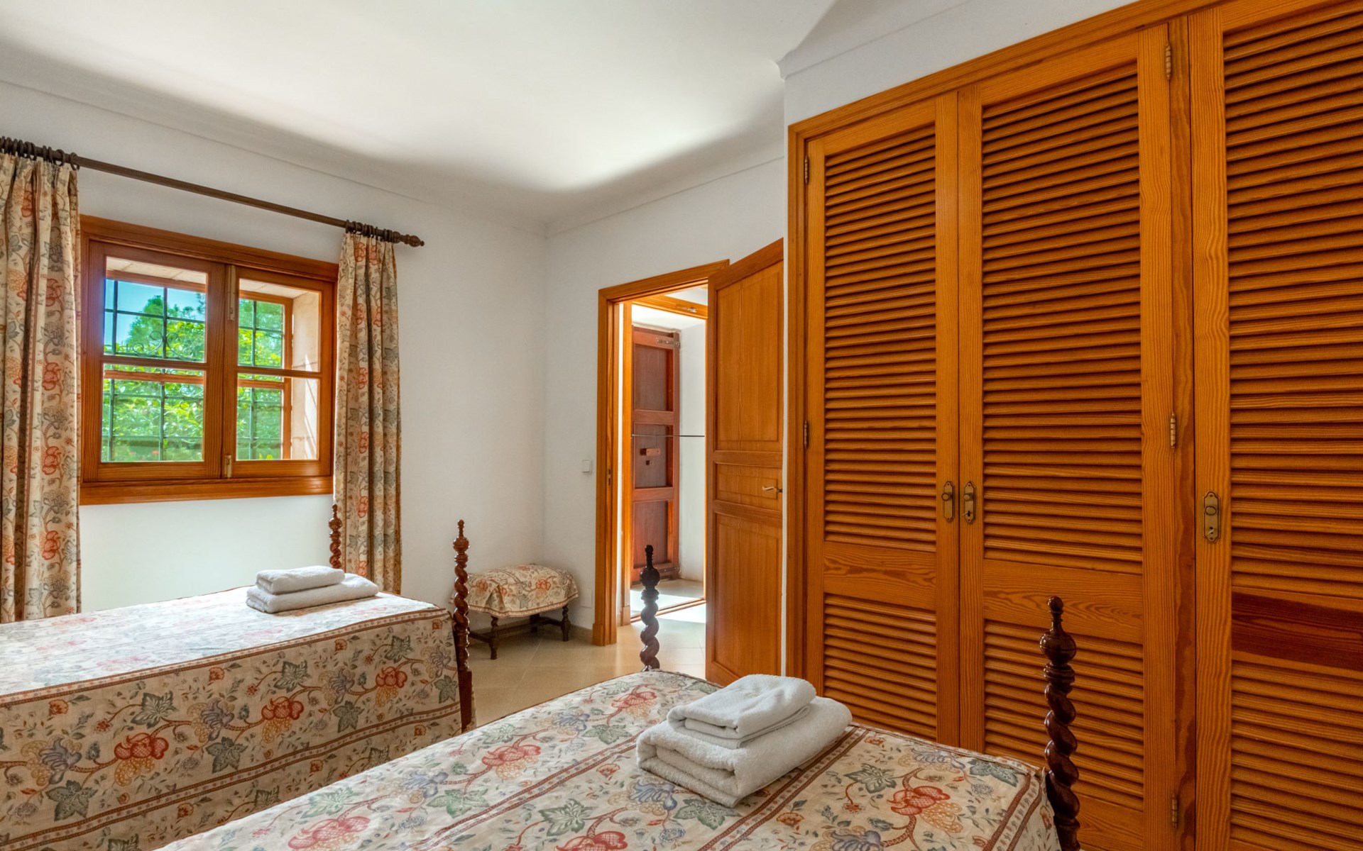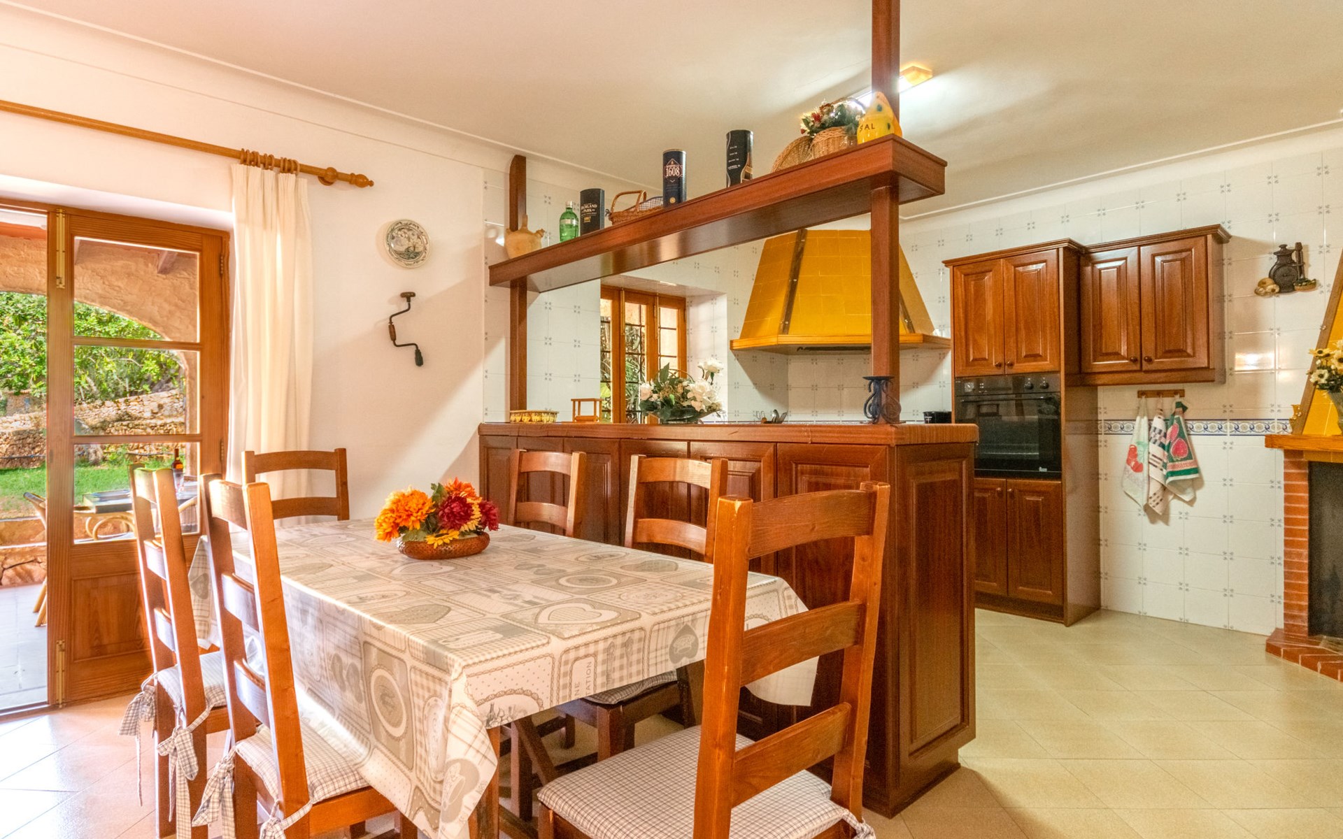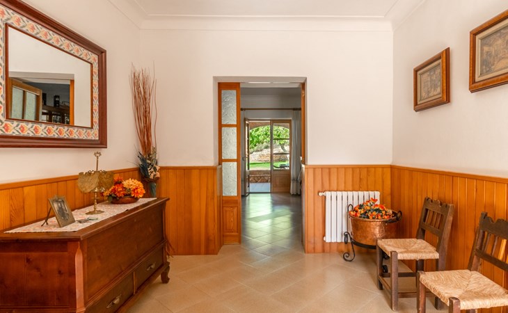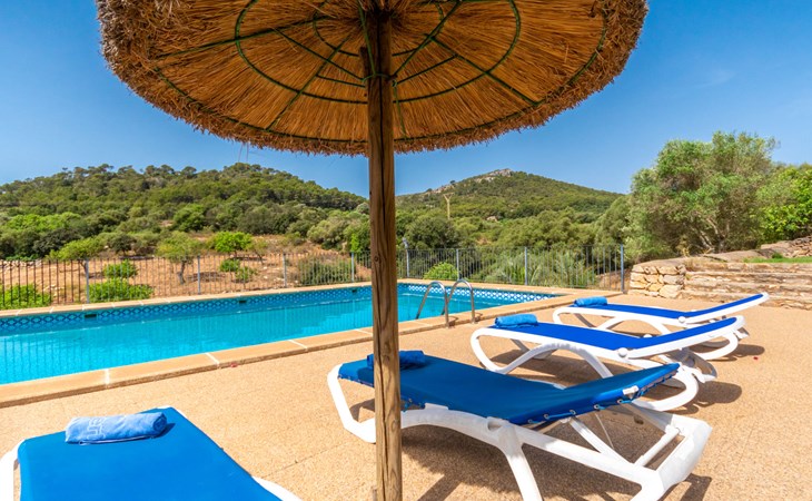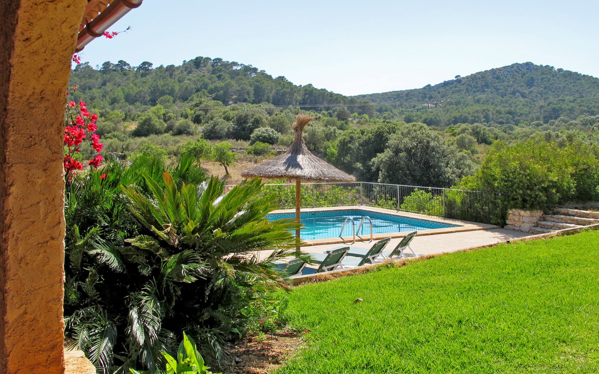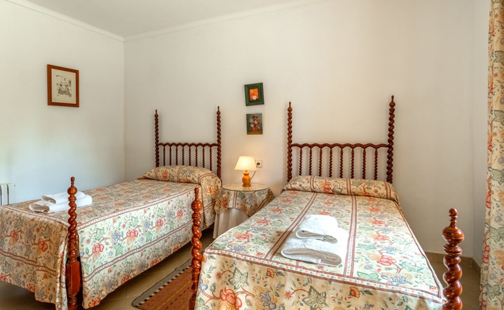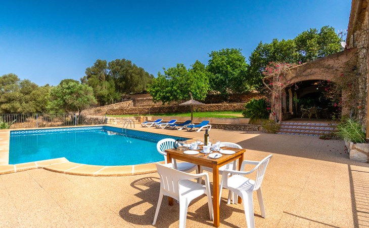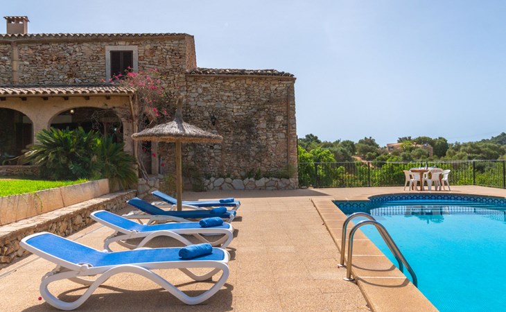 Farm estate "Can Caubo". 3 km from the centre of Calonge, 3.5 km from the centre of S'Horta, 57 km from the centre of Palma, on a slope, 6.5 km from the sea. Private: property 3'000 m2, terraced garden with lawn and trees, swimming pool (10 x 5 m, seasonal availability: 01.Jan. - 31.Dec.). Outdoor shower, terrace. In the house: central heating system. Parking on the premises. Shop 3 km, restaurant 1.4 km, bar 3 km, bus stop 200 m, sandy beach 6.5 km. Please note: car recommended. 1st floor is closed and not occupied.