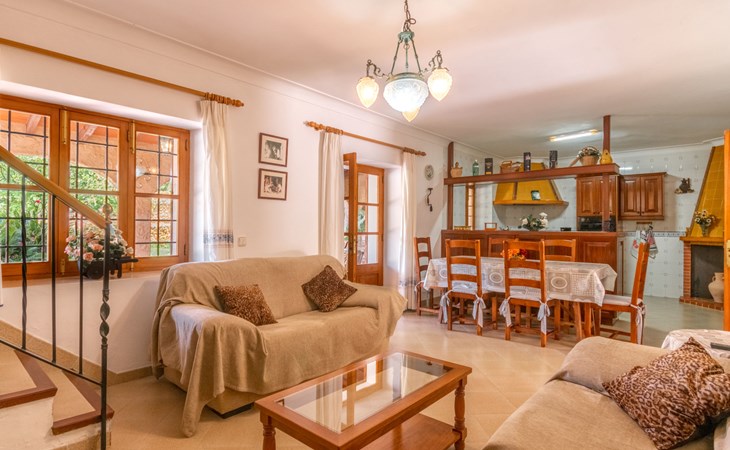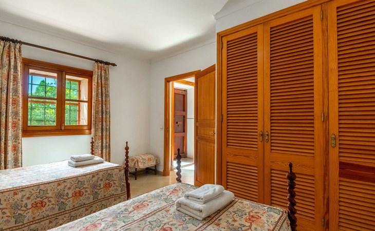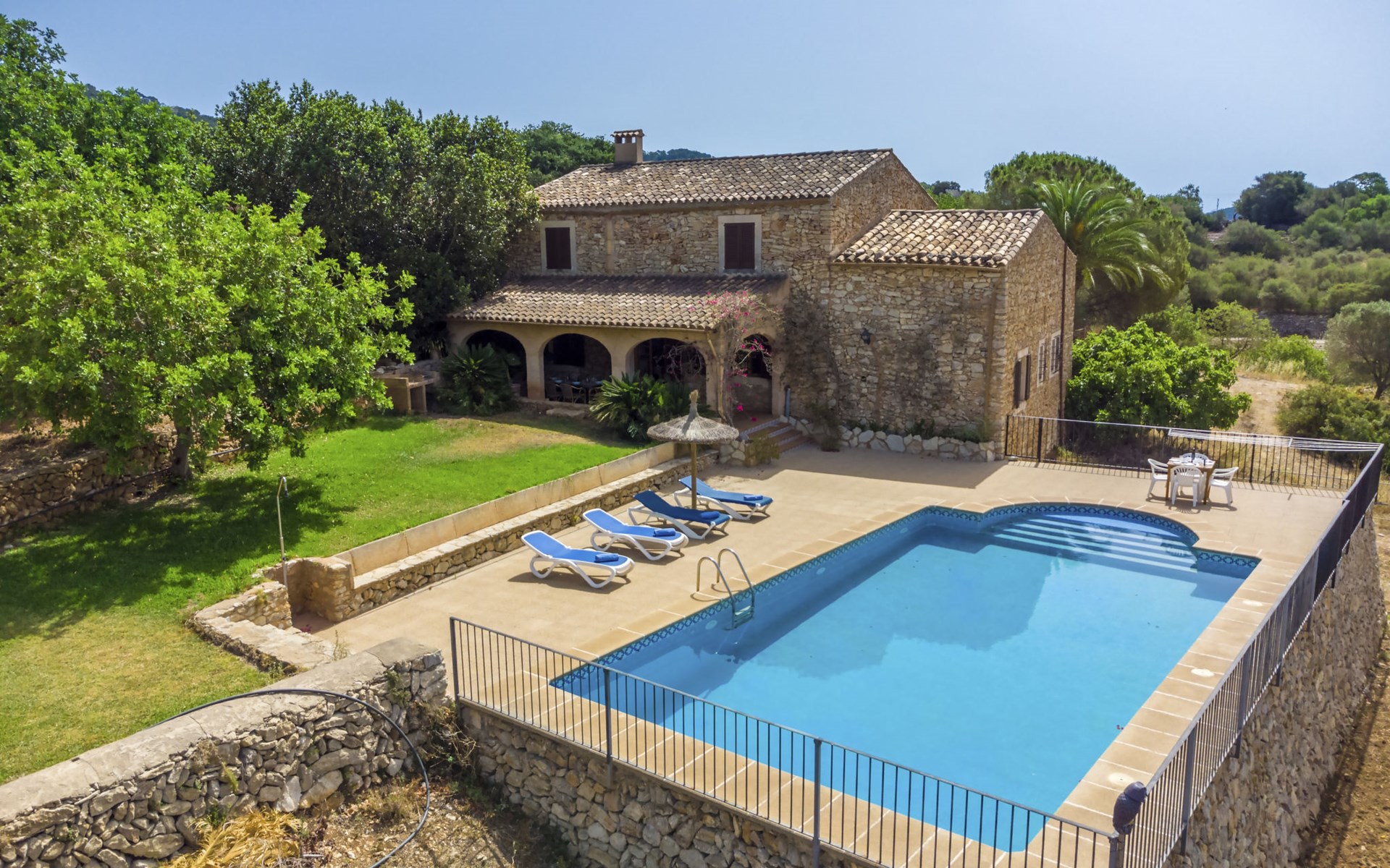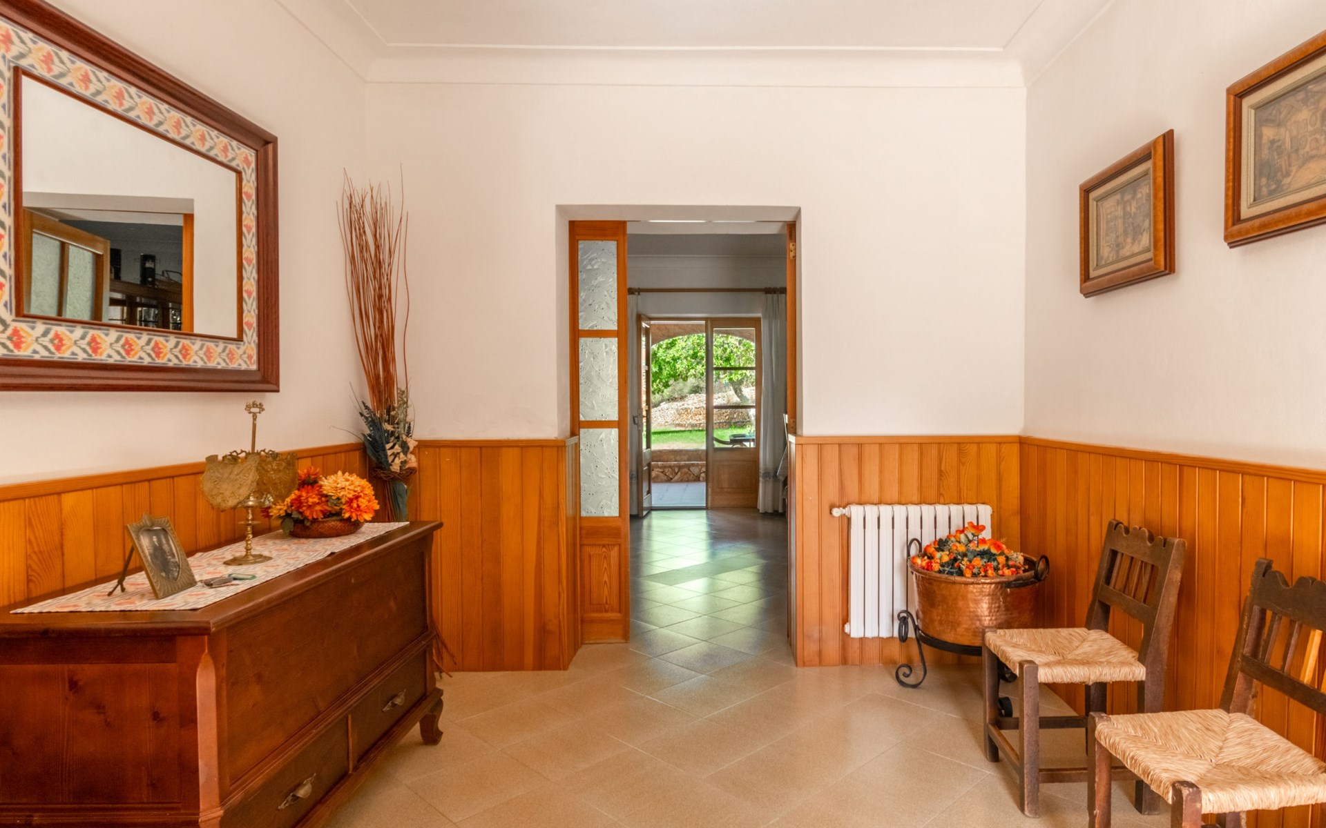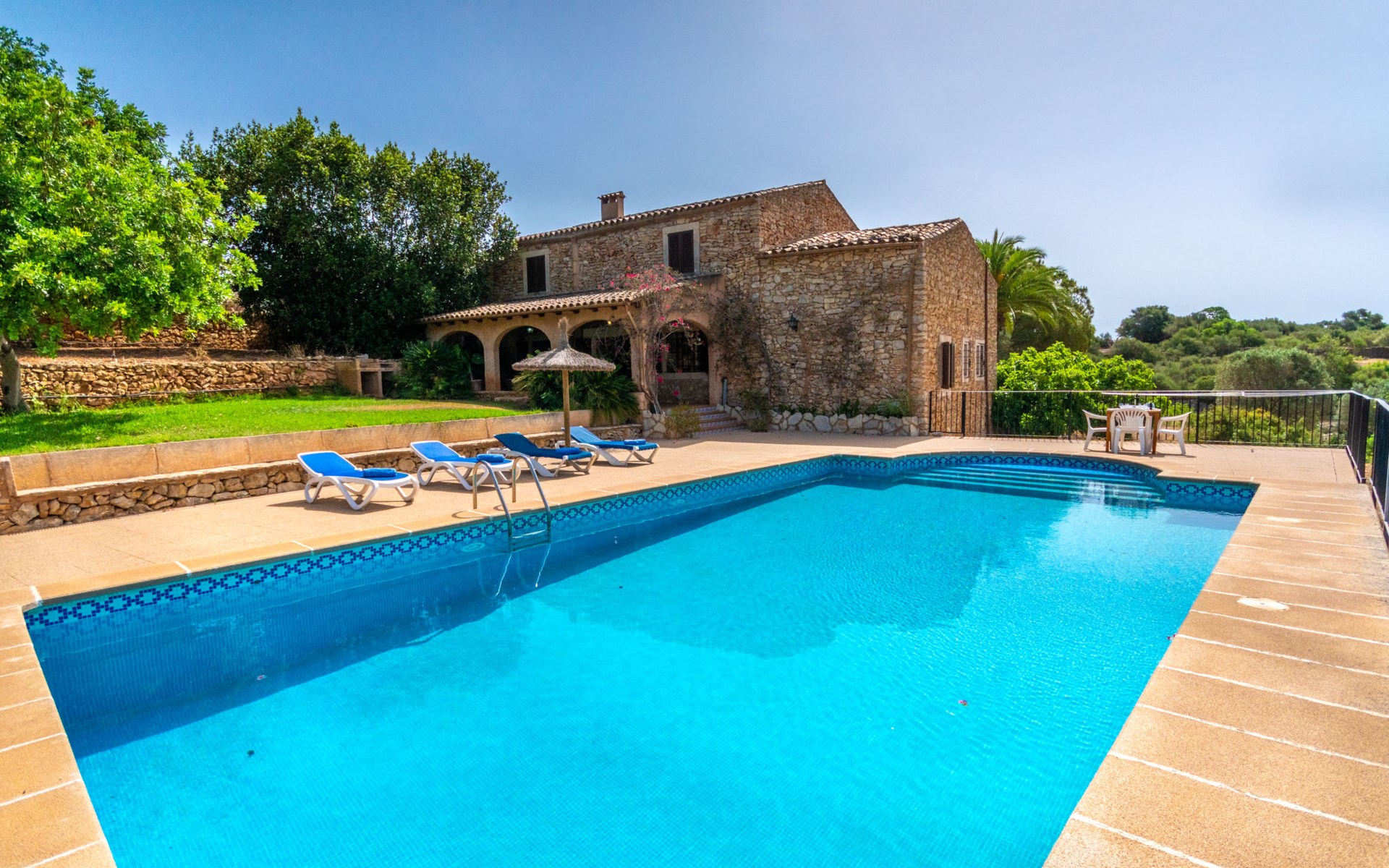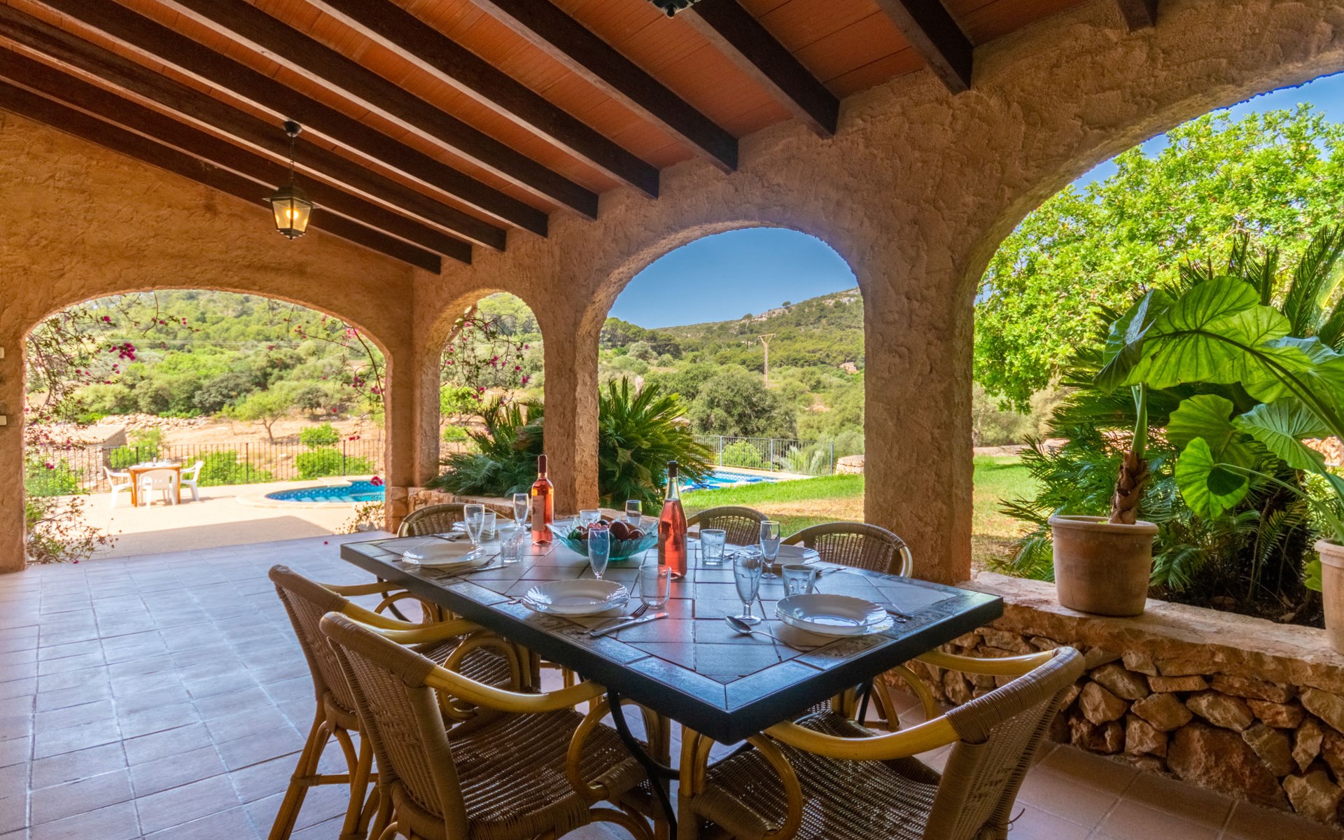 Farm estate "Can Caubo". 3 km from the centre of Calonge, 3.5 km from the centre of S'Horta, 57 km from the centre of Palma, on a slope, 6.5 km from the sea. Private: property 3'000 m2, terraced garden with lawn and trees, swimming pool (10 x 5 m, seasonal availability: 01.Jan. - 31.Dec.). Outdoor shower, terrace. In the house: central heating system. Parking on the premises. Shop 3 km, restaurant 1.4 km, bar 3 km, bus stop 200 m, sandy beach 6.5 km. Please note: car recommended. 1st floor is closed and not occupied.