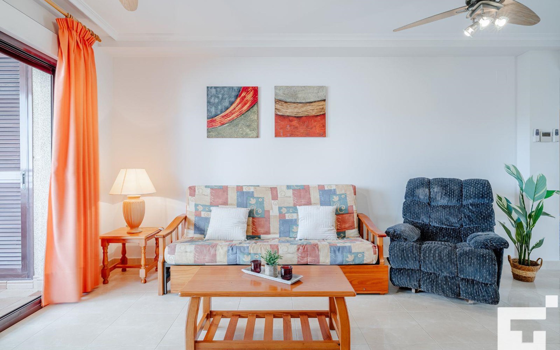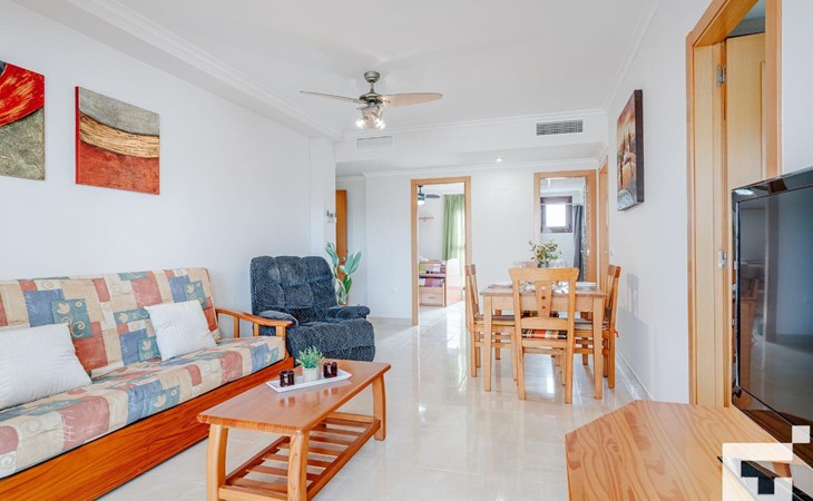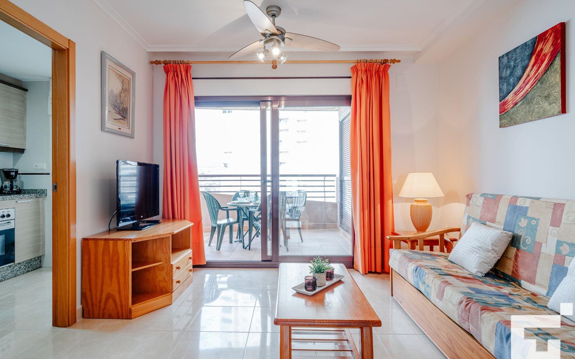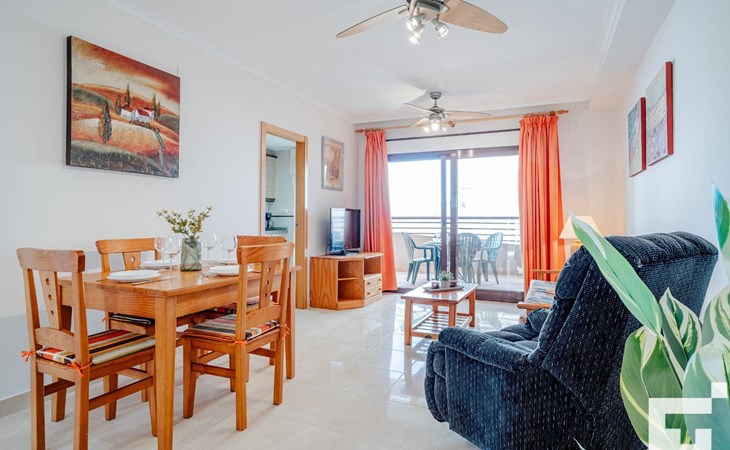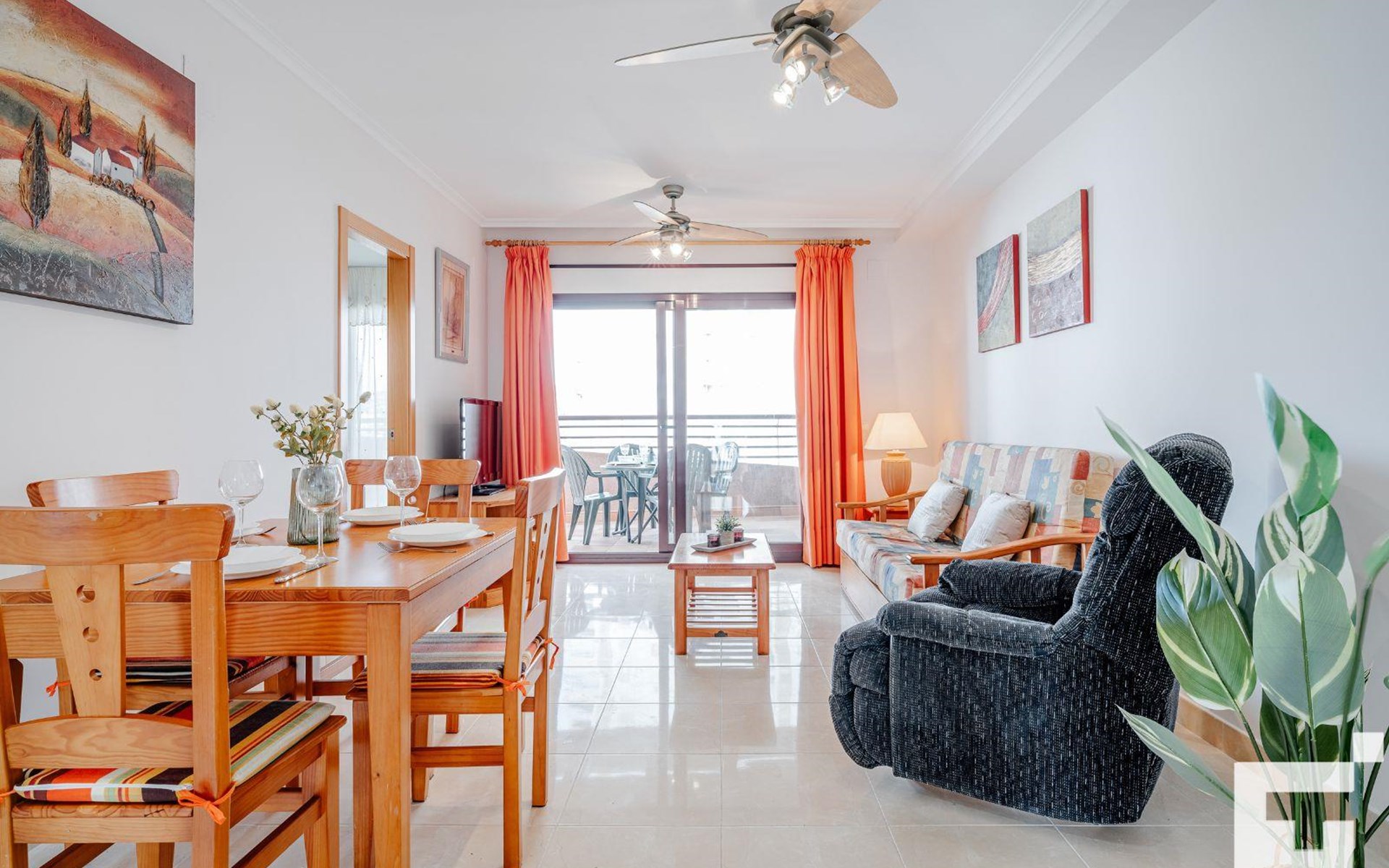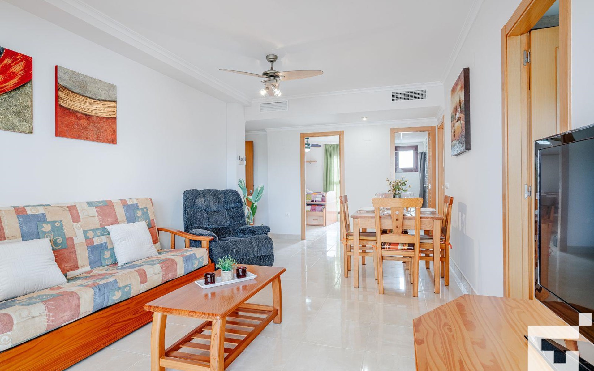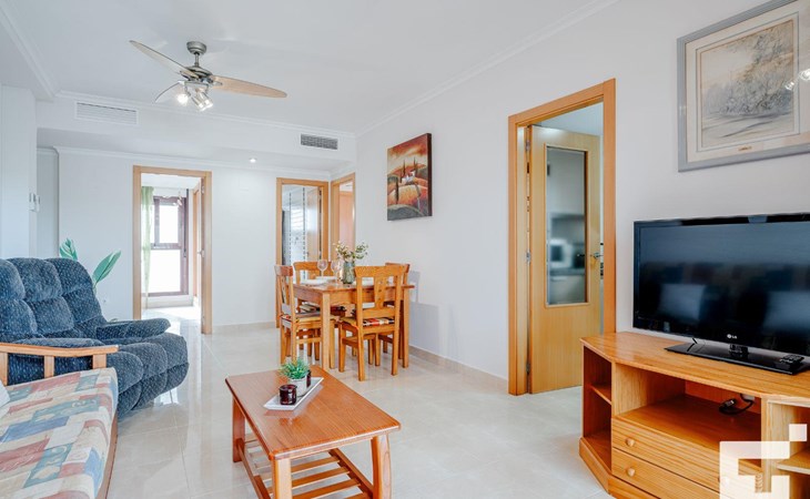 ๐บ Living-dining room with TV, ceiling fan, and access to the furnished terrace.