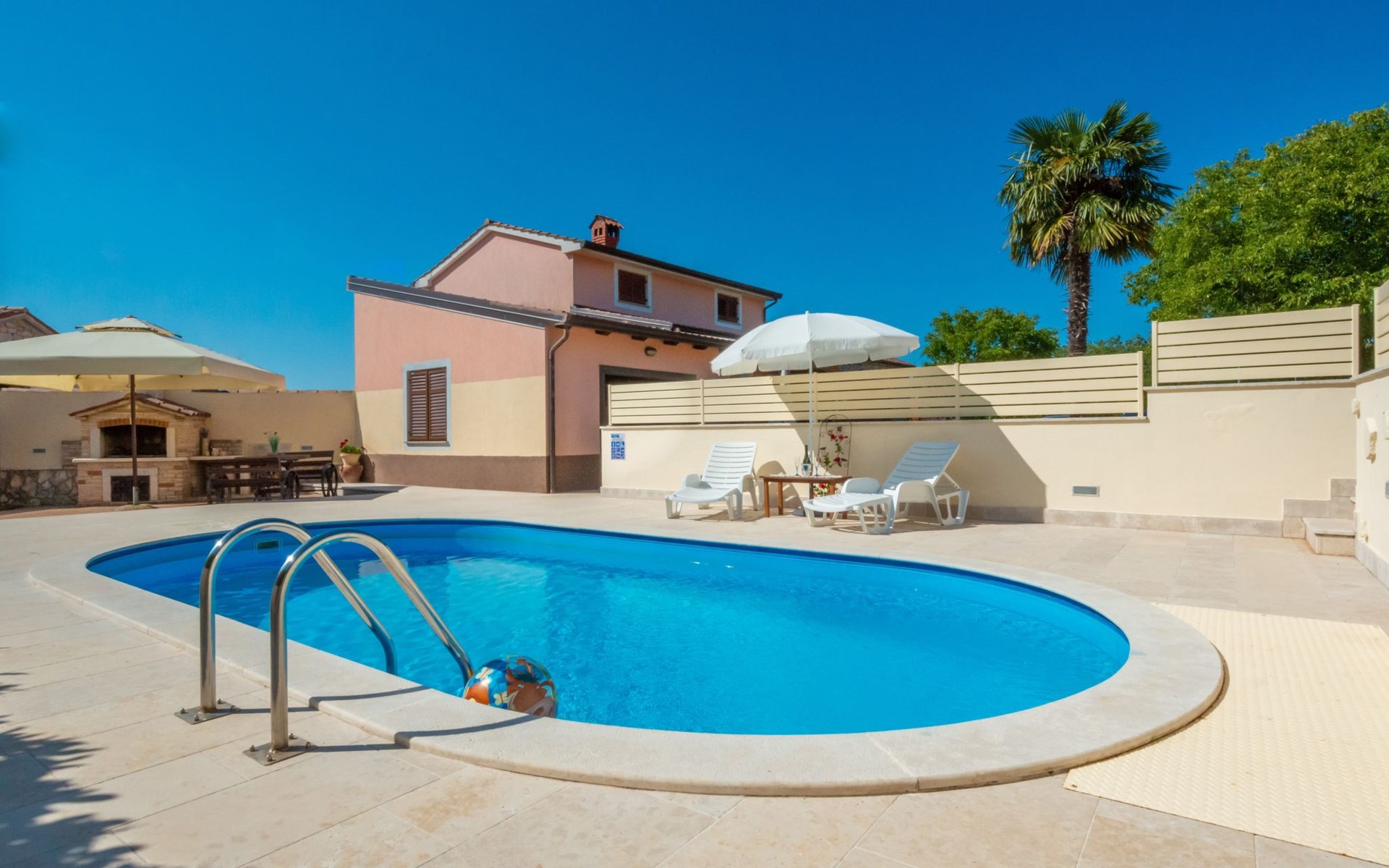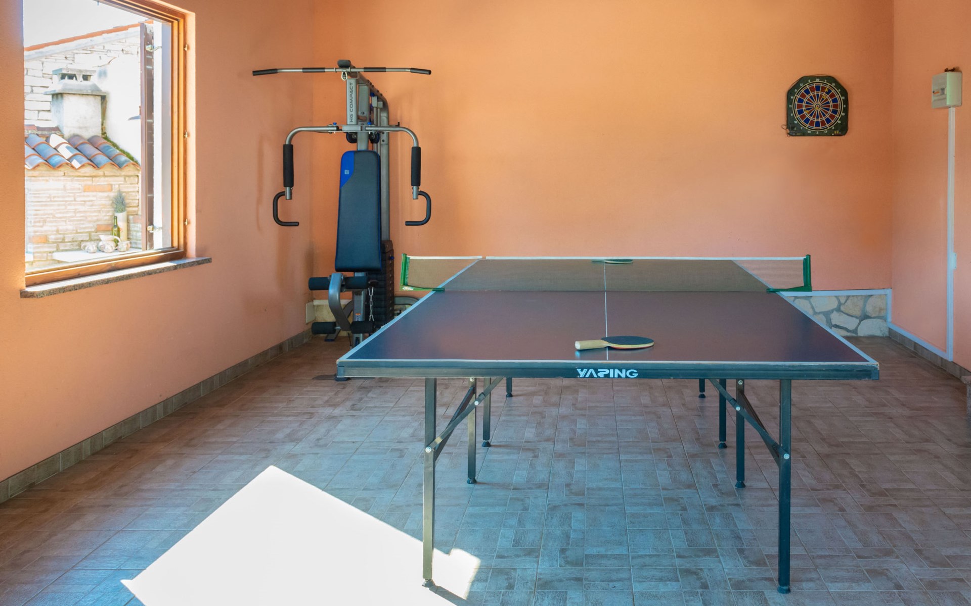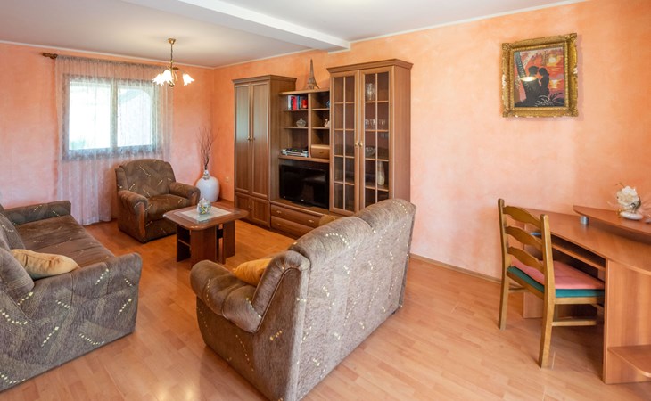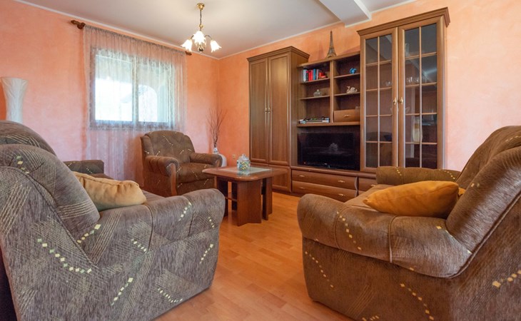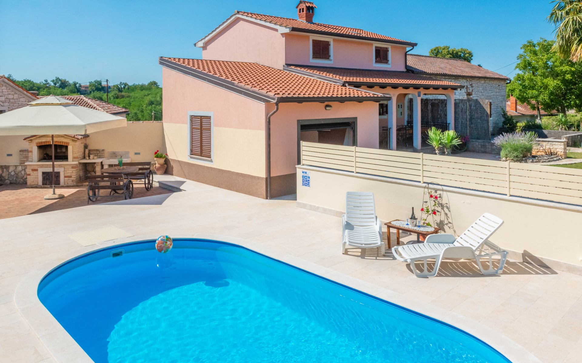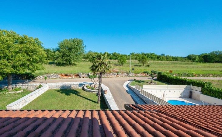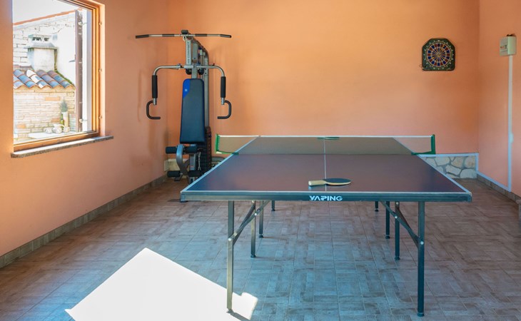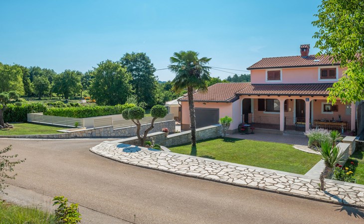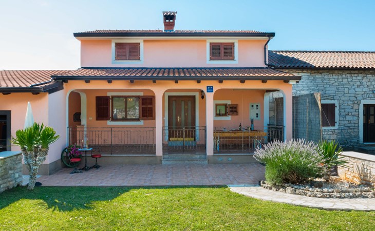 Semi-detached house "Medica", 2 storeys. In the hamlet Milotići 1 km from the centre of Tinjan, 12 km from the centre of Pazin, 20 km from the sea. Private: property 200 m2 with lawn and trees, swimming pool (24 m2, depth 135 cm, seasonal availability: 15.May. - 20.Sep.). Outdoor shower, table tennis, terrace, garden furniture, barbecue, pool maintenance by the owner/gardener. In the house: internet access. Parking on the premises, single garage. Shop 1 km, restaurant 1 km, bus stop 950 m, rocky beach 20 km.