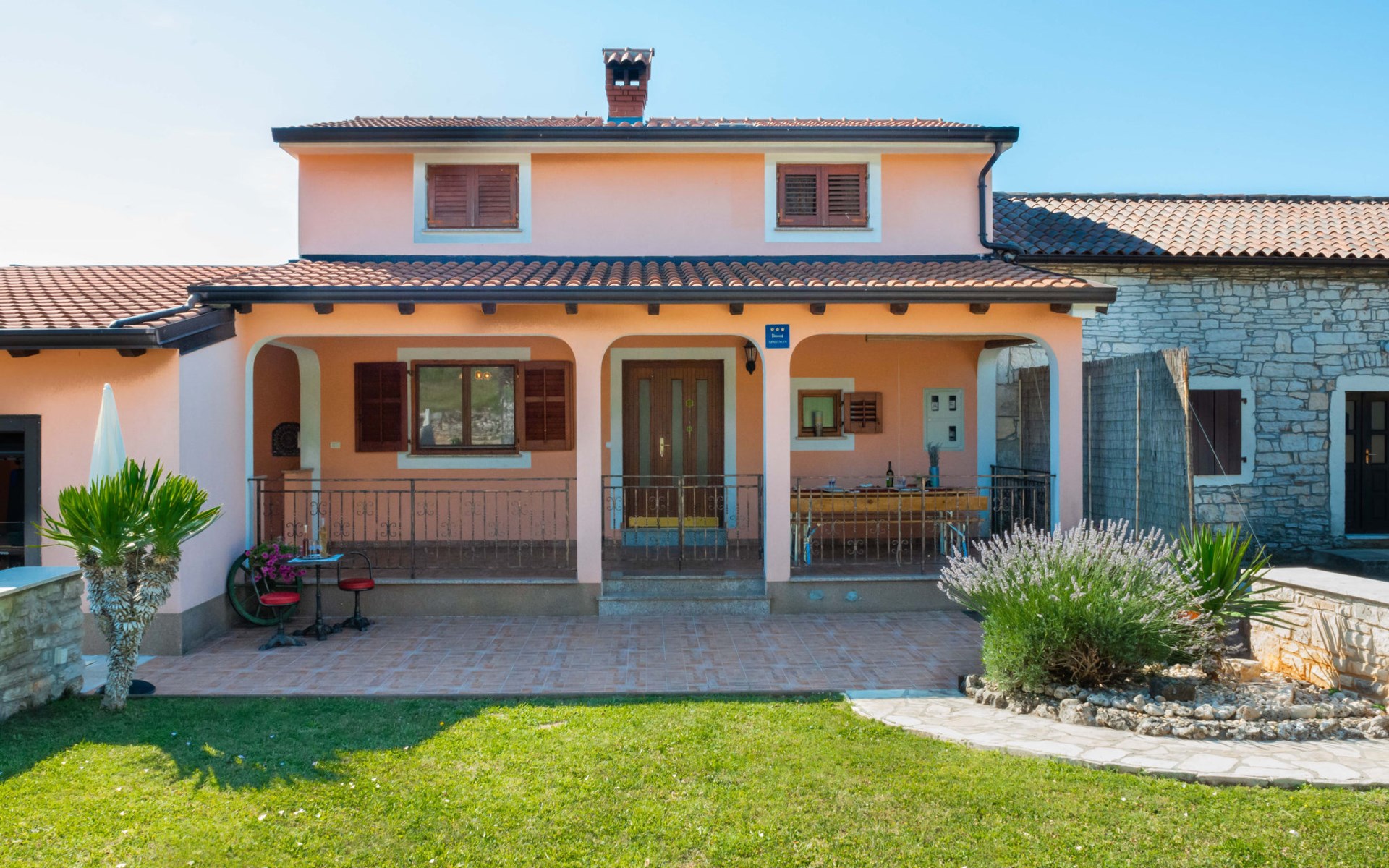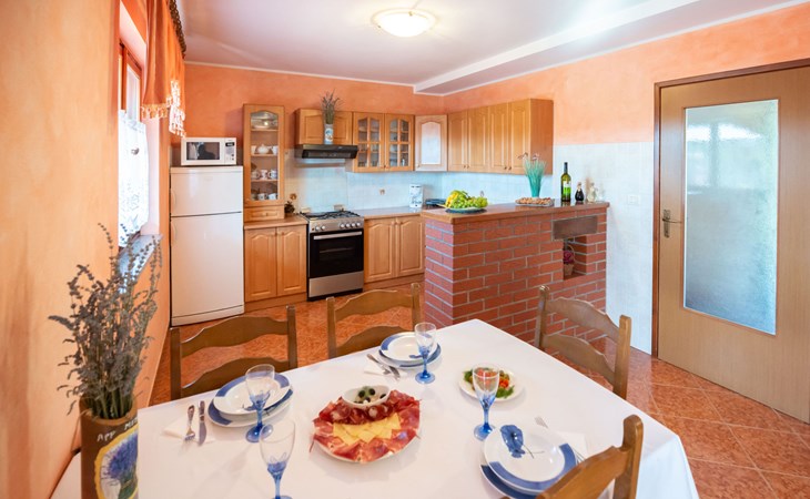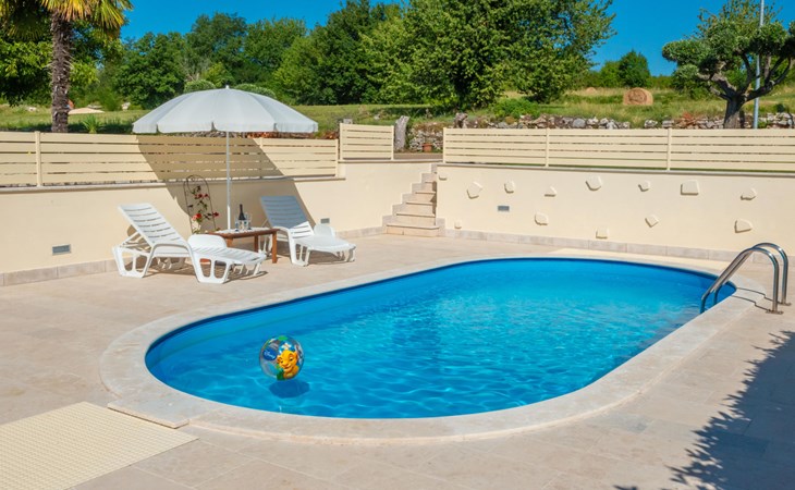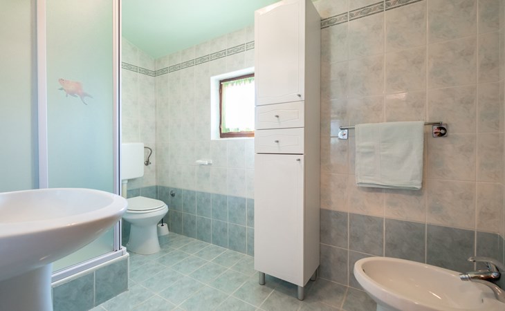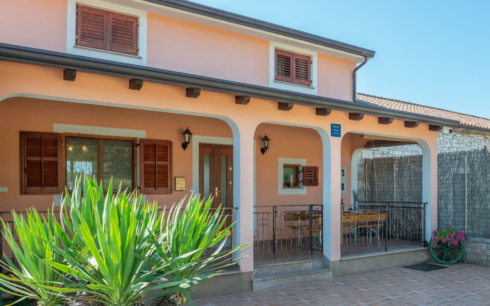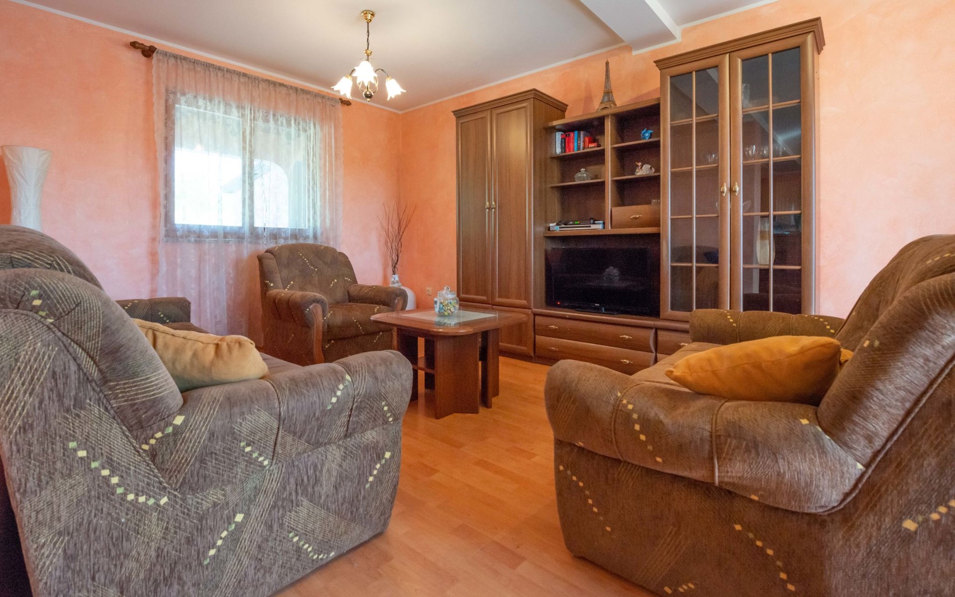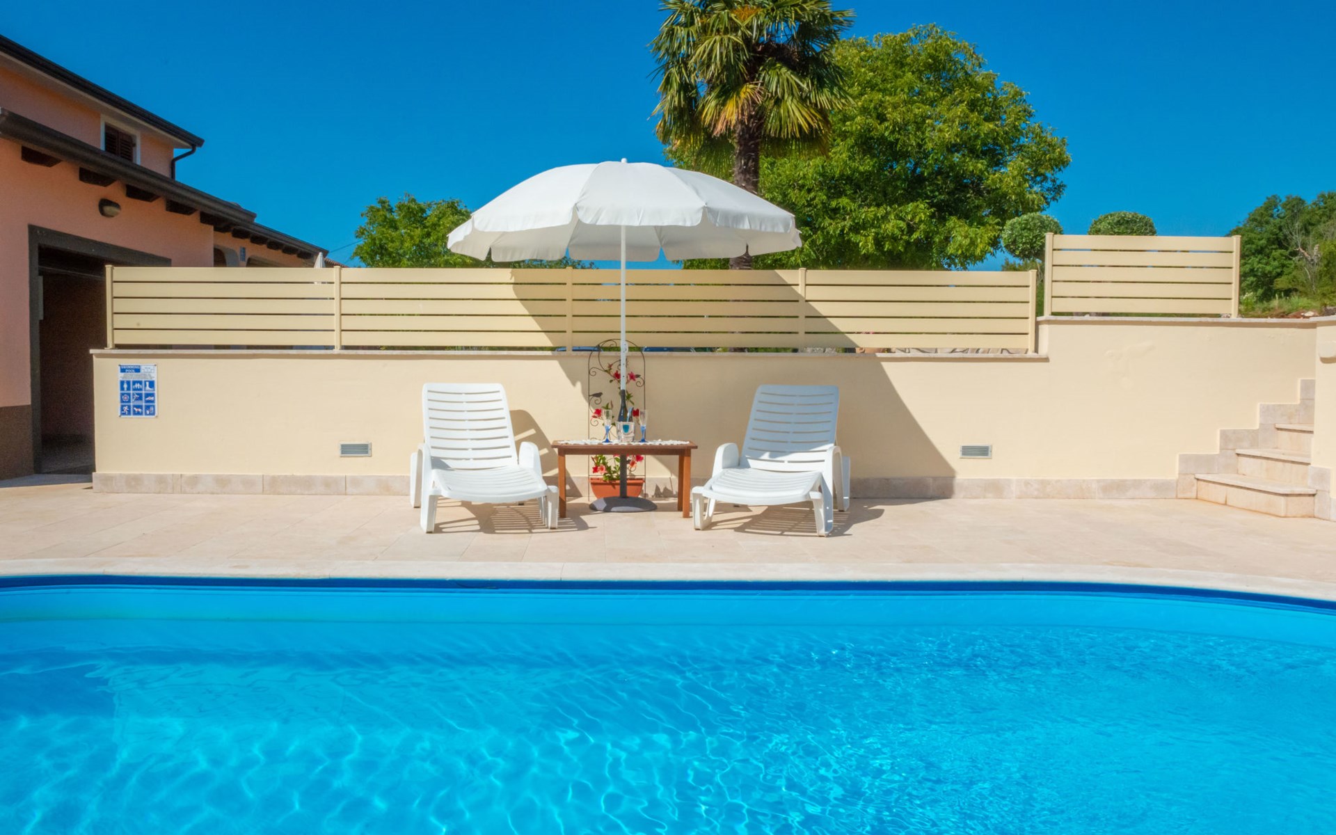 Semi-detached house "Medica", 2 storeys. In the hamlet Milotići 1 km from the centre of Tinjan, 12 km from the centre of Pazin, 20 km from the sea. Private: property 200 m2 with lawn and trees, swimming pool (24 m2, depth 135 cm, seasonal availability: 15.May. - 20.Sep.). Outdoor shower, table tennis, terrace, garden furniture, barbecue, pool maintenance by the owner/gardener. In the house: internet access. Parking on the premises, single garage. Shop 1 km, restaurant 1 km, bus stop 950 m, rocky beach 20 km.