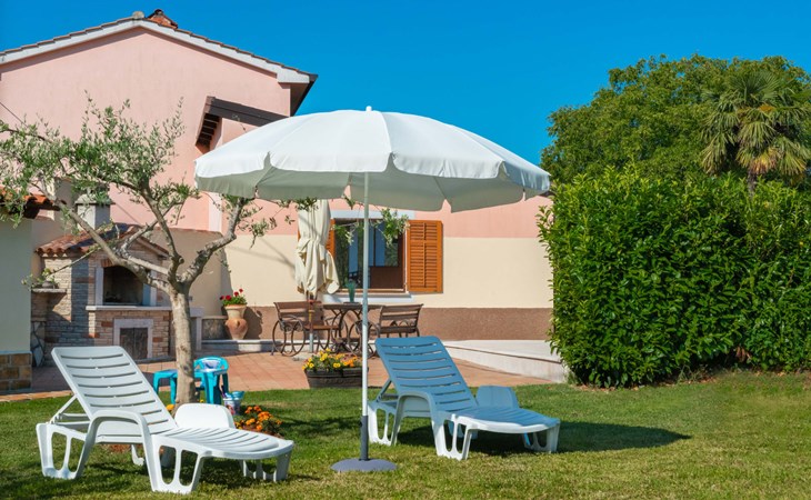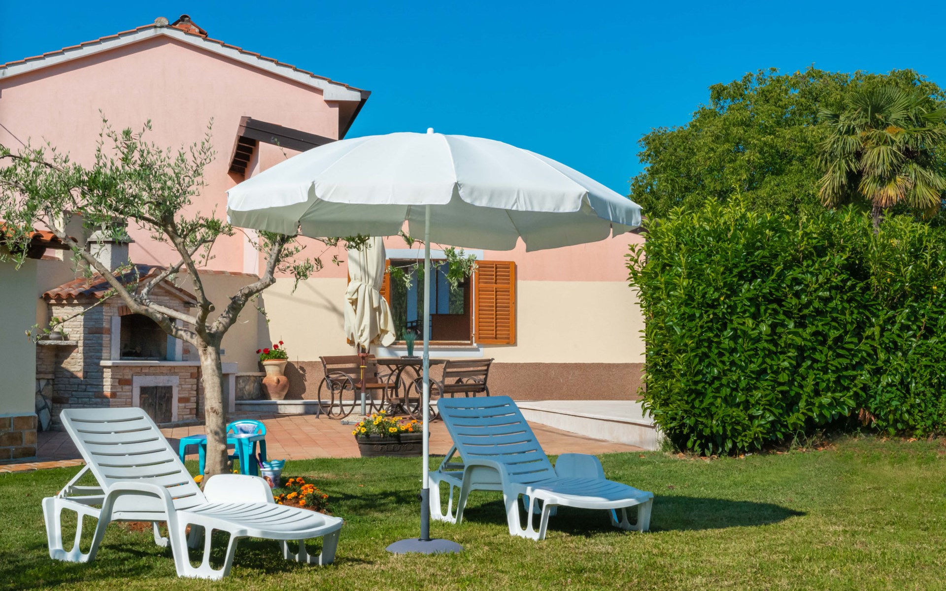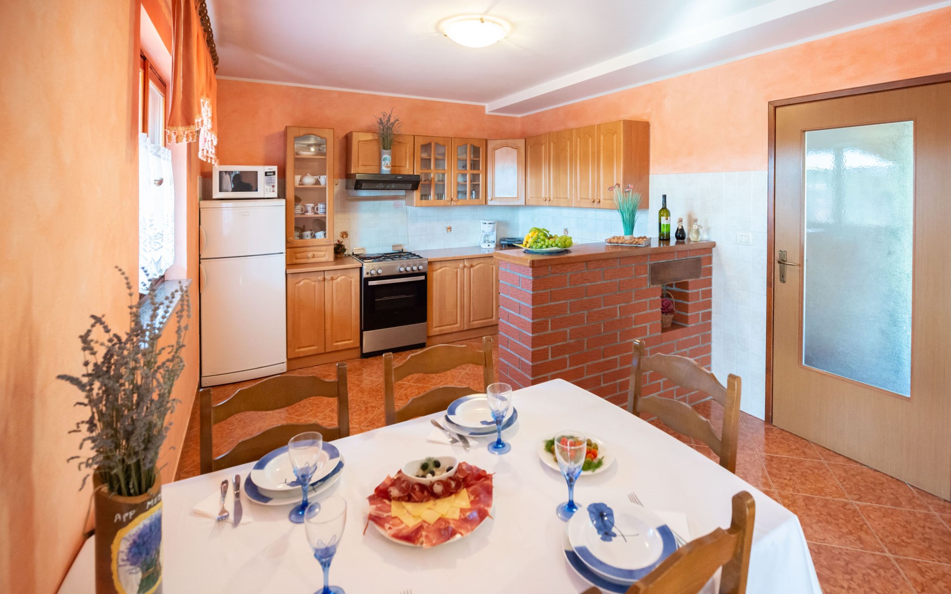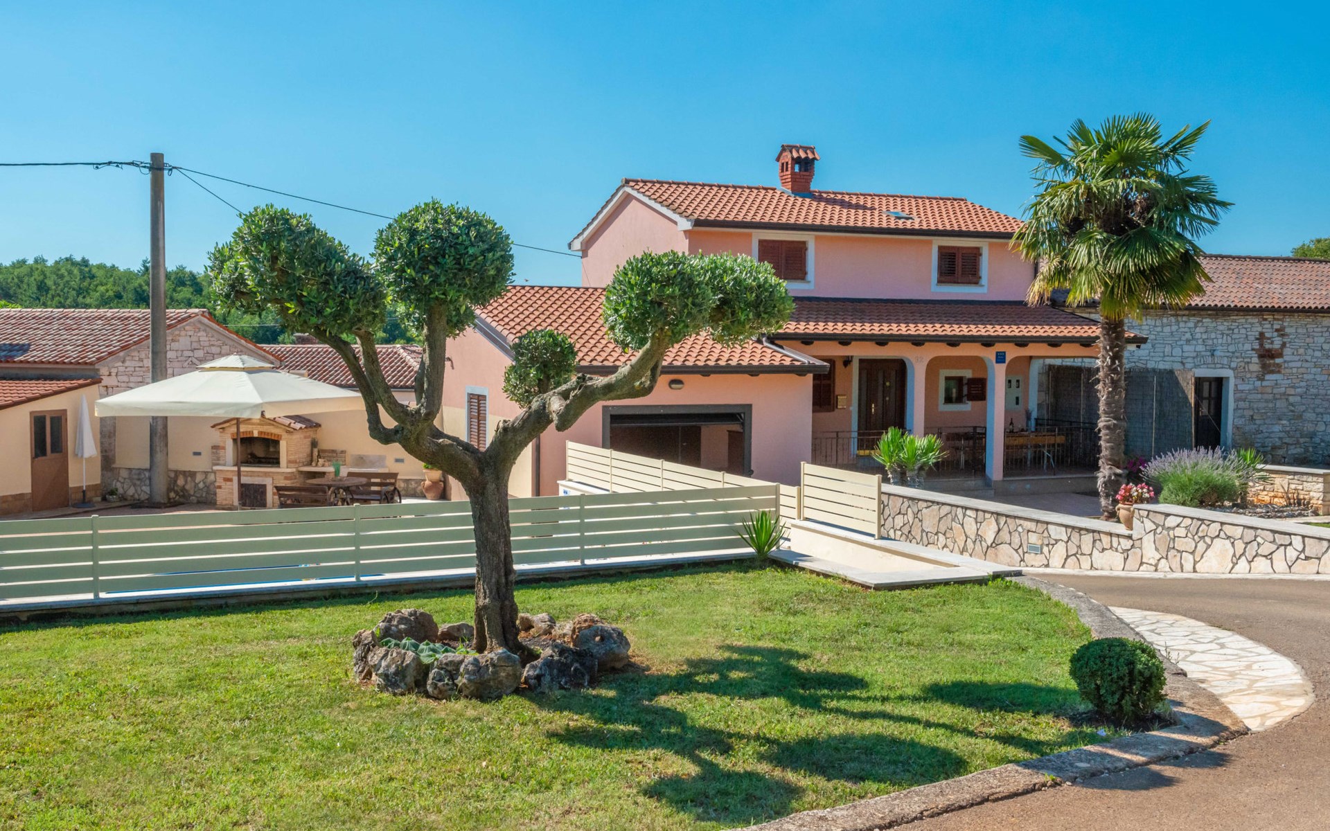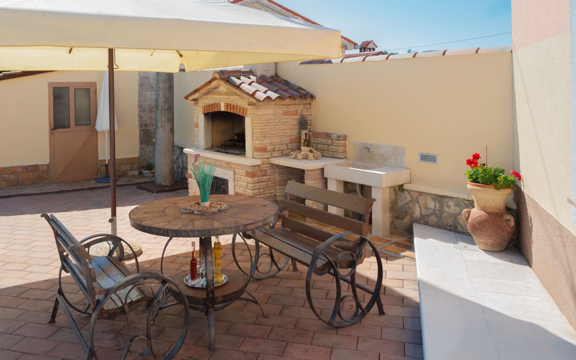 Semi-detached house "Medica", 2 storeys. In the hamlet Milotići 1 km from the centre of Tinjan, 12 km from the centre of Pazin, 20 km from the sea. Private: property 200 m2 with lawn and trees, swimming pool (24 m2, depth 135 cm, seasonal availability: 15.May. - 20.Sep.). Outdoor shower, table tennis, terrace, garden furniture, barbecue, pool maintenance by the owner/gardener. In the house: internet access. Parking on the premises, single garage. Shop 1 km, restaurant 1 km, bus stop 950 m, rocky beach 20 km.