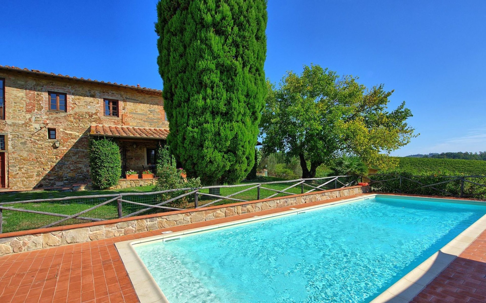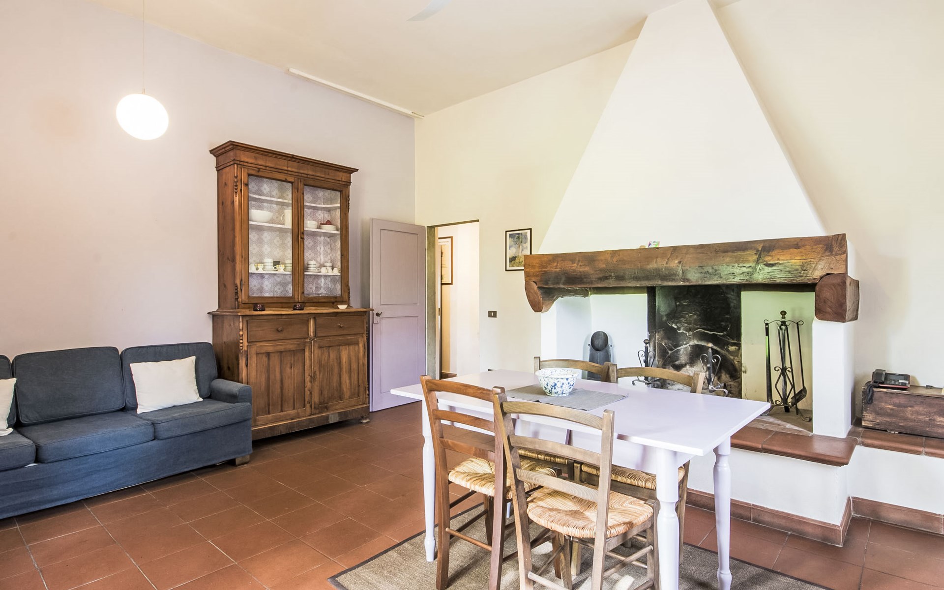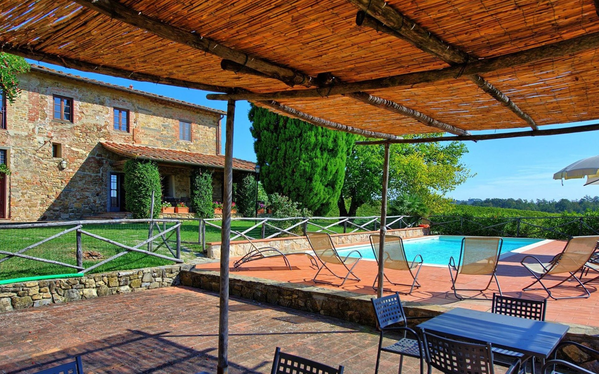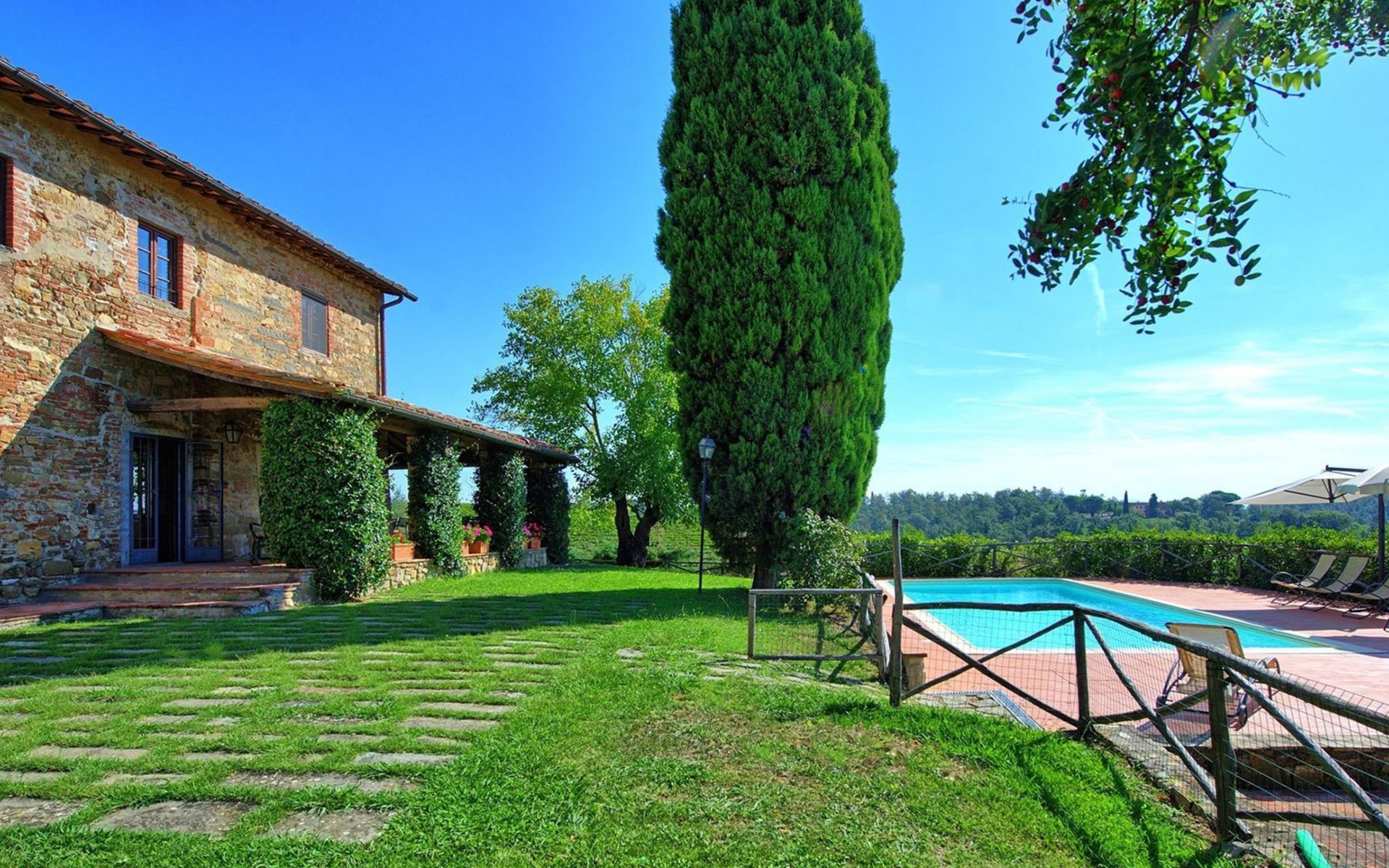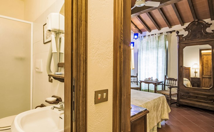 Large farmhouse, surrounded by vineyards and olive groves, consisting of the main object which can accommodate up to fourteen people and an adjacent, non-communicating apartment that can accommodate two more people. The owner lives in the property. Just a few hundred meters away, the owners own a restaurant where you can taste the typical dishes of the local tradition. Country house "Il Frantoio". 7 km from the centre of Montelupo Fiorentino, 20 km from the centre of Firenze, 68 km from the centre of Pisa, in a sunny position, in the countryside. Private: garden (not fenced), swimming pool (12 x 6 m, depth 200 - 110 cm, seasonal availability: 15.May. - 15.Sep.). Outdoor shower, garden furniture, barbecue. In the complex: restaurant, heating to be paid on the spot, heating available only from 01.Nov. - 04.Apr.. Motor access to the house (300 m via unmade road). Parking on the premises. Shop 4 km, grocery 4 km, supermarket 4 km, restaurant 1 km. Golf course (18 hole) 35 km. Nearby attractions: Carmignano 10 km, San Casciano in Val di Pesa 23 km, San Miniato 25 km, Vinci 27 km, San Gimignano 47 km, Volterra 65 km. Suitable for events. Local sale of farm products.