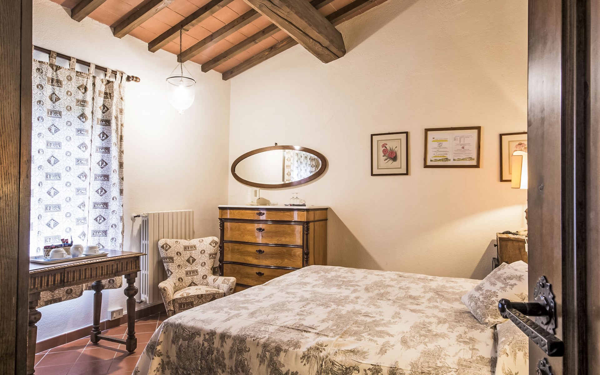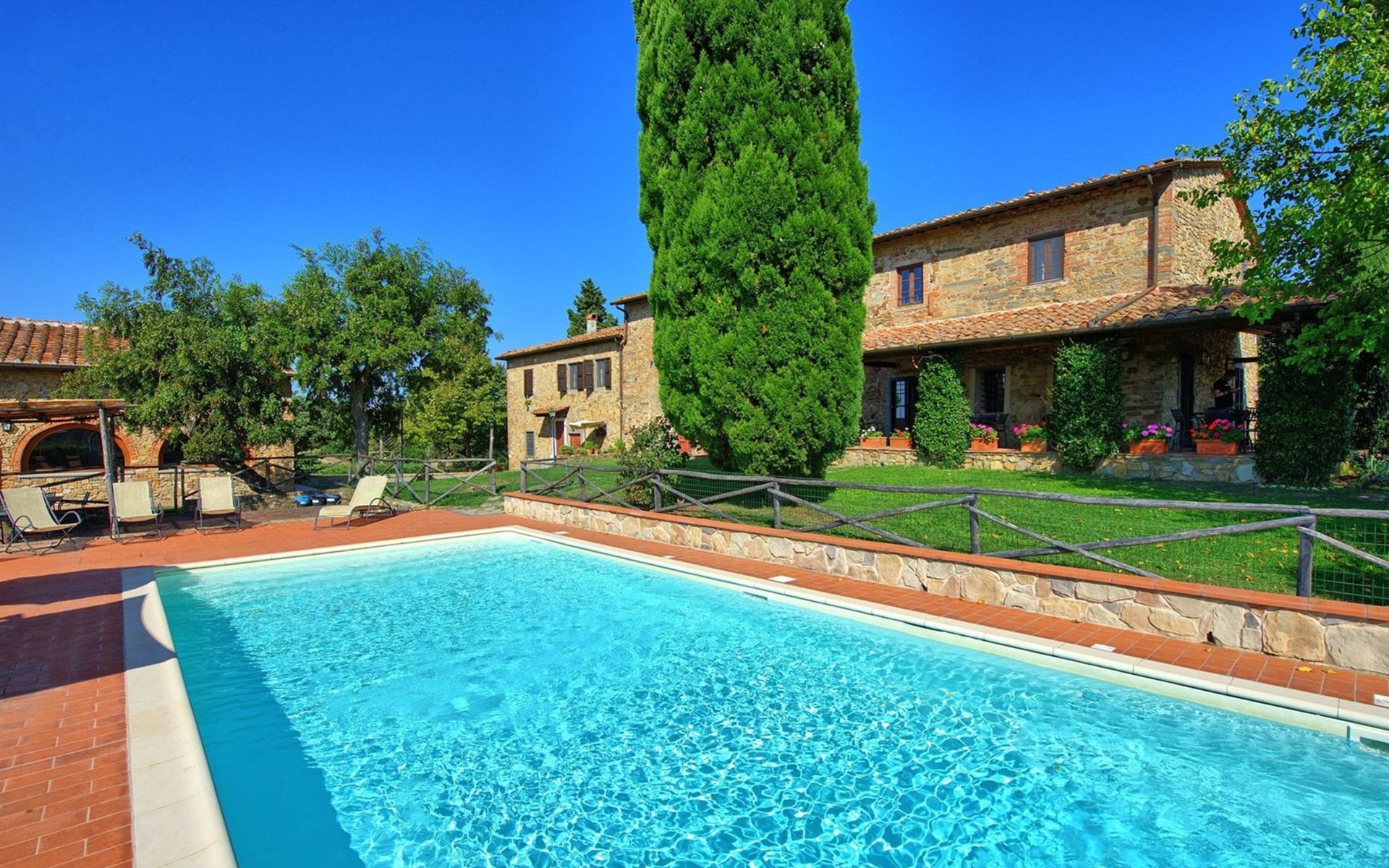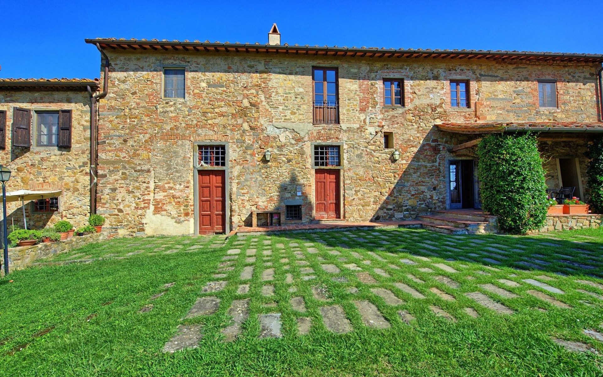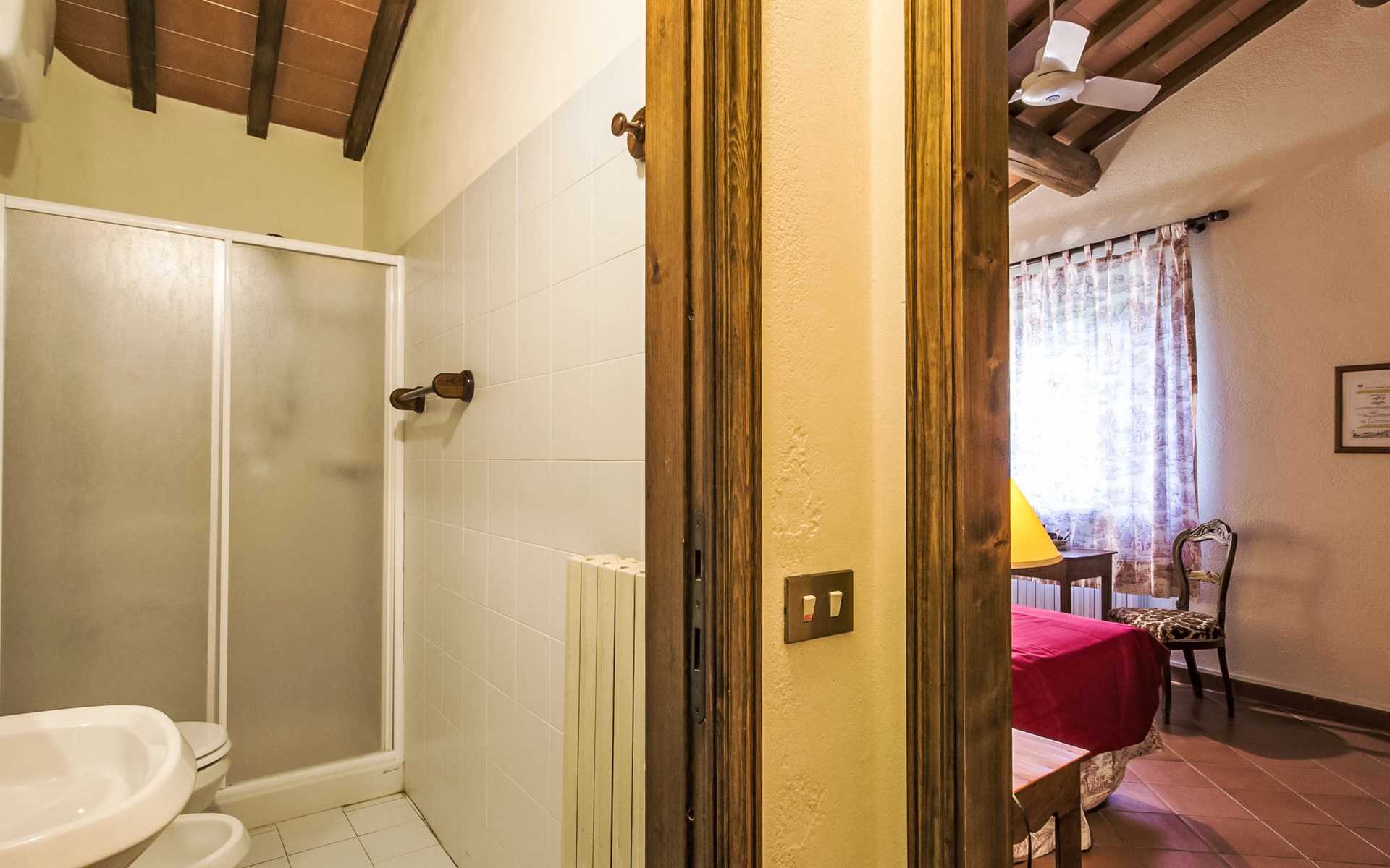 Large farmhouse, surrounded by vineyards and olive groves, consisting of the main object which can accommodate up to fourteen people and an adjacent, non-communicating apartment that can accommodate two more people. The owner lives in the property. Just a few hundred meters away, the owners own a restaurant where you can taste the typical dishes of the local tradition. Country house "Il Frantoio". 7 km from the centre of Montelupo Fiorentino, 20 km from the centre of Firenze, 68 km from the centre of Pisa, in a sunny position, in the countryside. Private: garden (not fenced), swimming pool (12 x 6 m, depth 200 - 110 cm, seasonal availability: 15.May. - 15.Sep.). Outdoor shower, garden furniture, barbecue. In the complex: restaurant, heating to be paid on the spot, heating available only from 01.Nov. - 04.Apr.. Motor access to the house (300 m via unmade road). Parking on the premises. Shop 4 km, grocery 4 km, supermarket 4 km, restaurant 1 km. Golf course (18 hole) 35 km. Nearby attractions: Carmignano 10 km, San Casciano in Val di Pesa 23 km, San Miniato 25 km, Vinci 27 km, San Gimignano 47 km, Volterra 65 km. Suitable for events. Local sale of farm products.