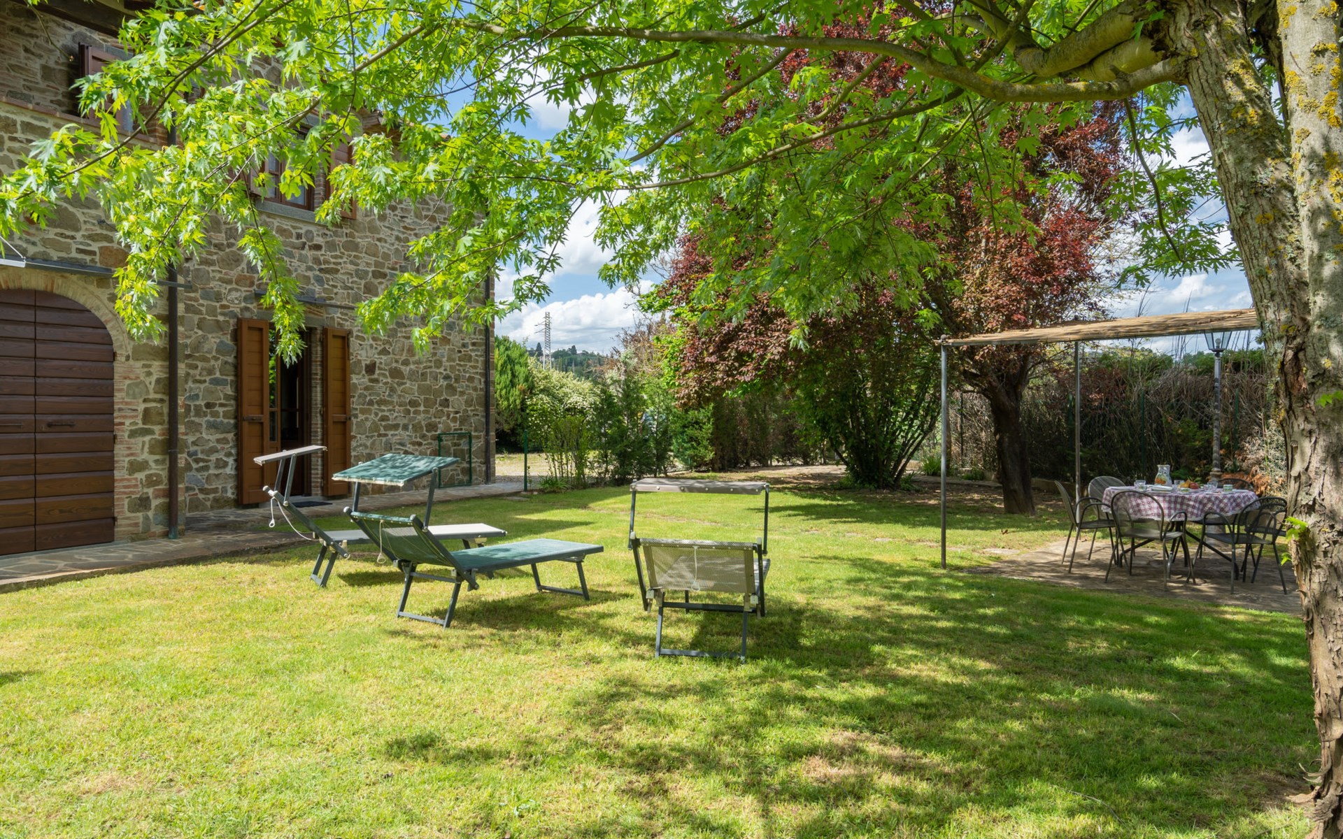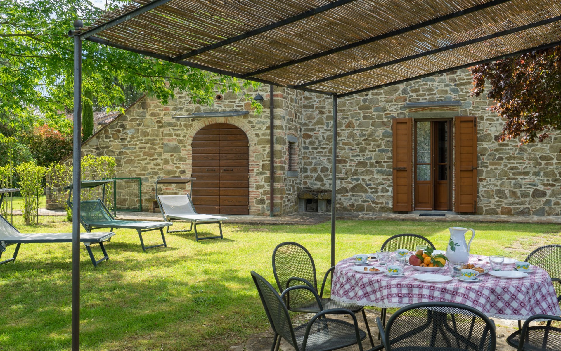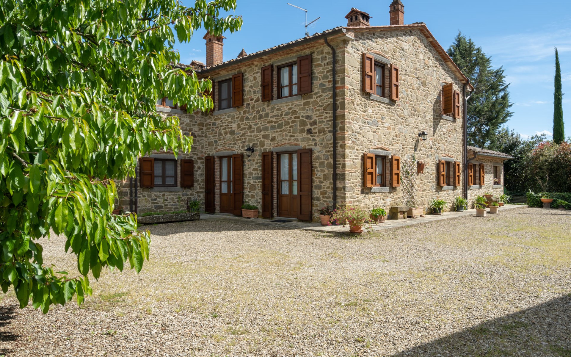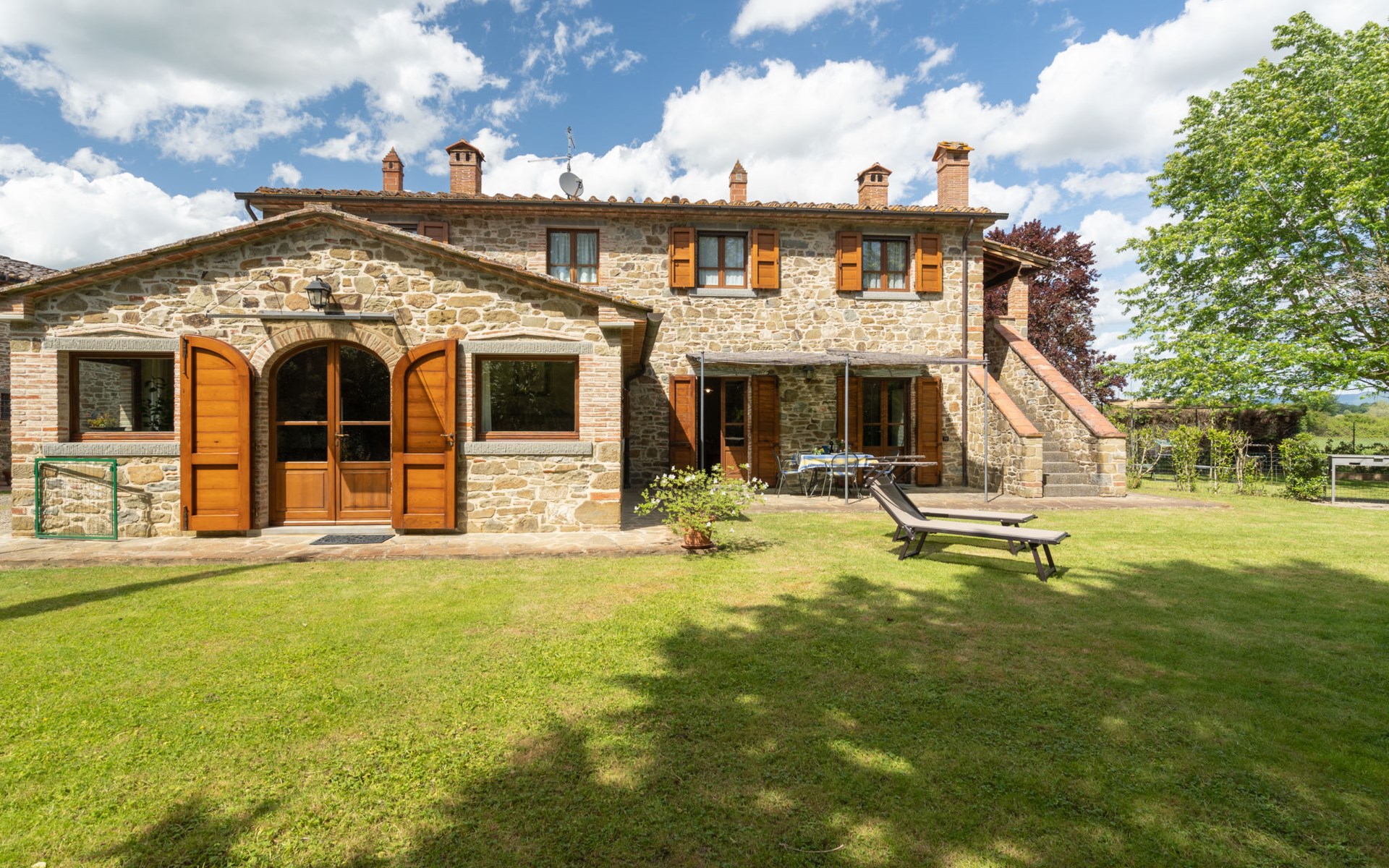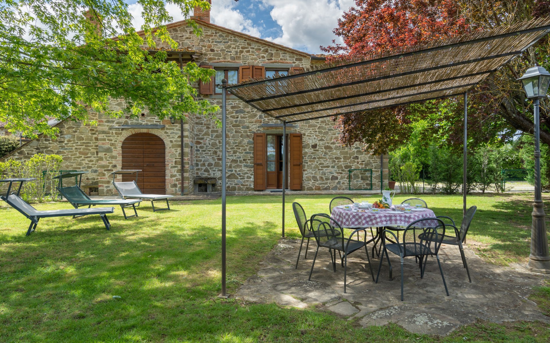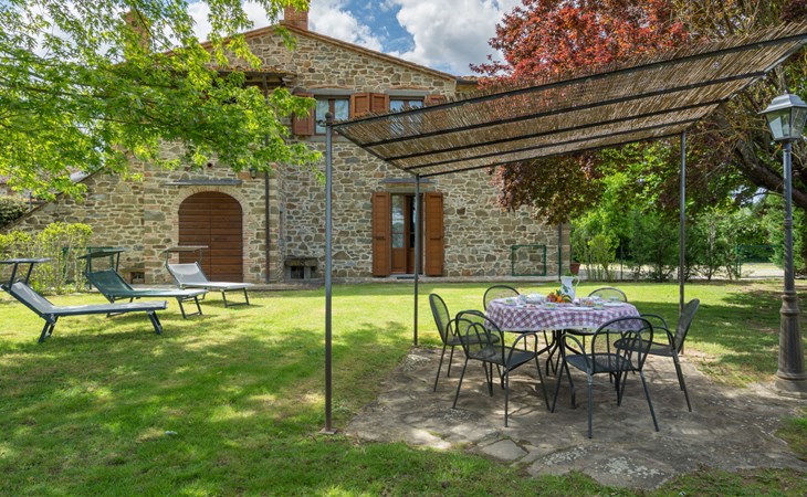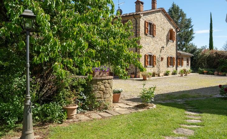 Cosy cottage, recently renovated, divided into two spaciuos parts, each with private garden of 400 m2. Under conservation act. A large fenced garden surrounds this house and the owners house which lay nearby. Swimming pool with outdoor hot water shower. View of the sunflowers fields, typical of the tuscan landcape. Sunset over the famous Gargonza castle. Private gate. Video entry phone for each apartments. The interiors are well kept, have terracotta and parquet floorings, beamed ceilings, stone archways, bedrooms had ceiling fan. Wrought iron beds. Siena 50 km. Florence 60 km. Rome is approx 2 hours by car. Cosy working farm "Casale il Giglio", renovated in 2004. 5 km from the centre of Monte San Savino, 19 km from the centre of Arezzo, 30 km from the centre of Terme di Rapolano, in the countryside. Private: garden 800 m2 (fenced), swimming pool (11 x 5 m, depth 100 - 175 cm, seasonal availability: 27.Apr. - 12.Oct.) with salt-electrolysis pool-cleaning system. Unconventional pool shape. Outdoor shower, table tennis, boules, garden furniture. In the complex: WiFi, table football, heating to be paid on the spot, heating available only from 01.Nov. - 15.Apr.. Available: bicycles (4). Parking at the house. Shop 5 km, restaurant 5 km, café 5 km, bus stop 800 m, railway station "Monte San Savino" 5 km, thermal baths "Rapolano Terme" 28 km. Riding stable 10 km. Nearby attractions: Lucignano 12 km, Rapolano Terme 28 km, Cortona 32 km, Montepulciano 37 km, Gaiole in Chianti 45 km. Please note: car recommended. Suitable for families, suitable for seniors. The owner lives on the same property.