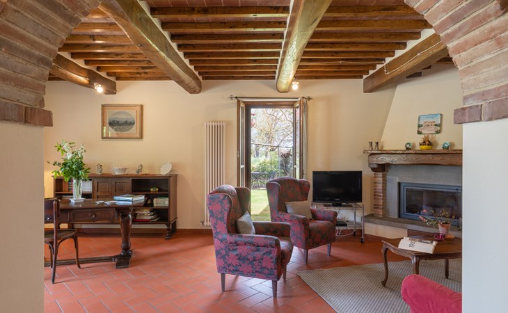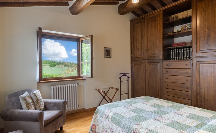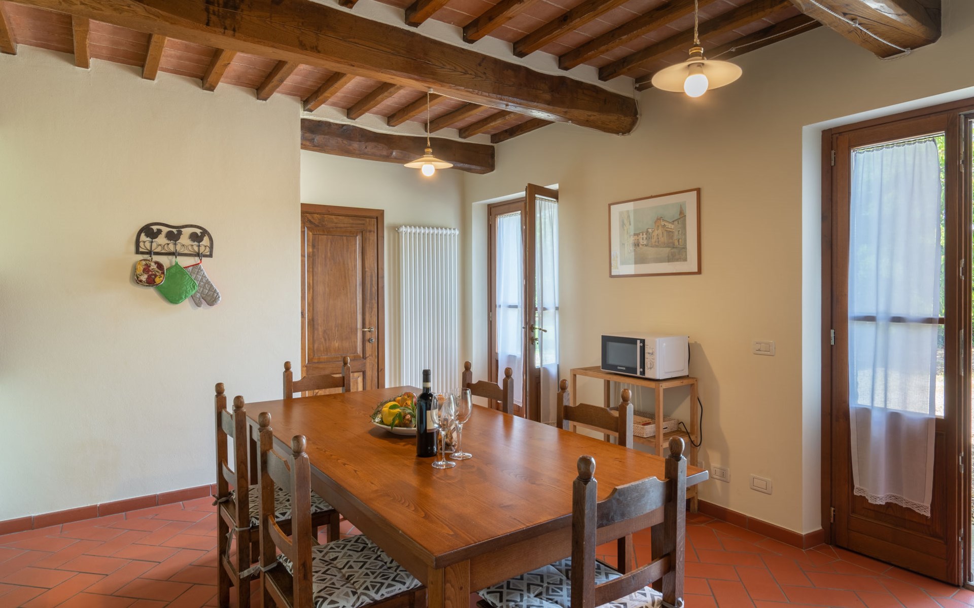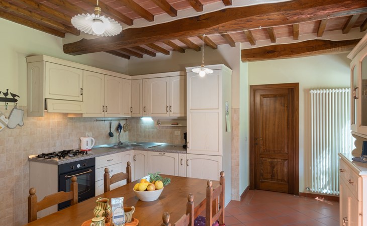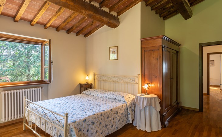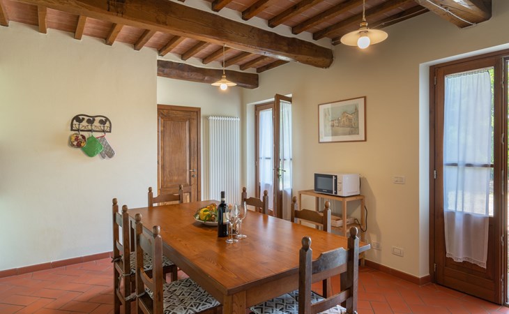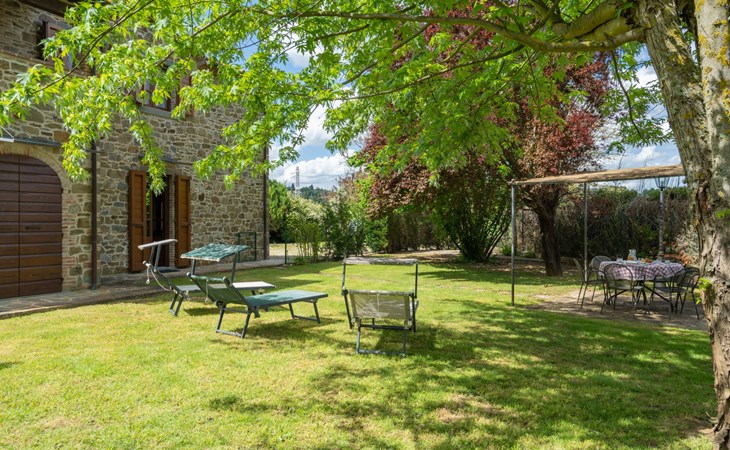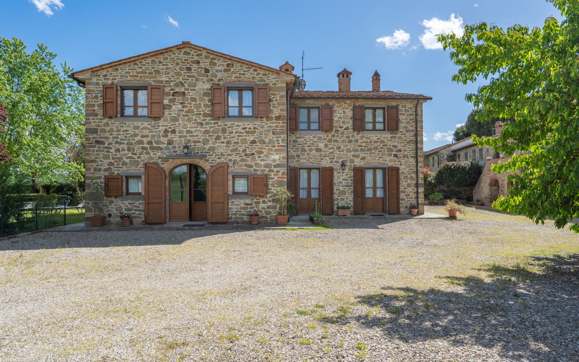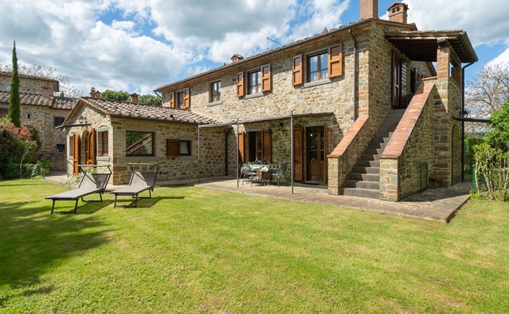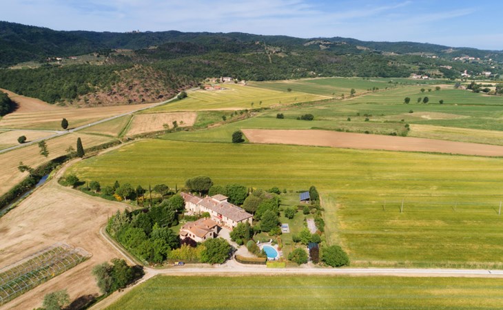 Cosy cottage, recently renovated, divided into two spaciuos parts, each with private garden of 400 m2. Under conservation act. A large fenced garden surrounds this house and the owners house which lay nearby. Swimming pool with outdoor hot water shower. View of the sunflowers fields, typical of the tuscan landcape. Sunset over the famous Gargonza castle. Private gate. Video entry phone for each apartments. The interiors are well kept, have terracotta and parquet floorings, beamed ceilings, stone archways, bedrooms had ceiling fan. Wrought iron beds. Siena 50 km. Florence 60 km. Rome is approx 2 hours by car. Cosy working farm "Casale il Giglio", renovated in 2004. 5 km from the centre of Monte San Savino, 19 km from the centre of Arezzo, 30 km from the centre of Terme di Rapolano, in the countryside. Private: garden 800 m2 (fenced), swimming pool (11 x 5 m, depth 100 - 175 cm, seasonal availability: 27.Apr. - 12.Oct.) with salt-electrolysis pool-cleaning system. Unconventional pool shape. Outdoor shower, table tennis, boules, garden furniture. In the complex: WiFi, table football, heating to be paid on the spot, heating available only from 01.Nov. - 15.Apr.. Available: bicycles (4). Parking at the house. Shop 5 km, restaurant 5 km, café 5 km, bus stop 800 m, railway station "Monte San Savino" 5 km, thermal baths "Rapolano Terme" 28 km. Riding stable 10 km. Nearby attractions: Lucignano 12 km, Rapolano Terme 28 km, Cortona 32 km, Montepulciano 37 km, Gaiole in Chianti 45 km. Please note: car recommended. Suitable for families, suitable for seniors. The owner lives on the same property.