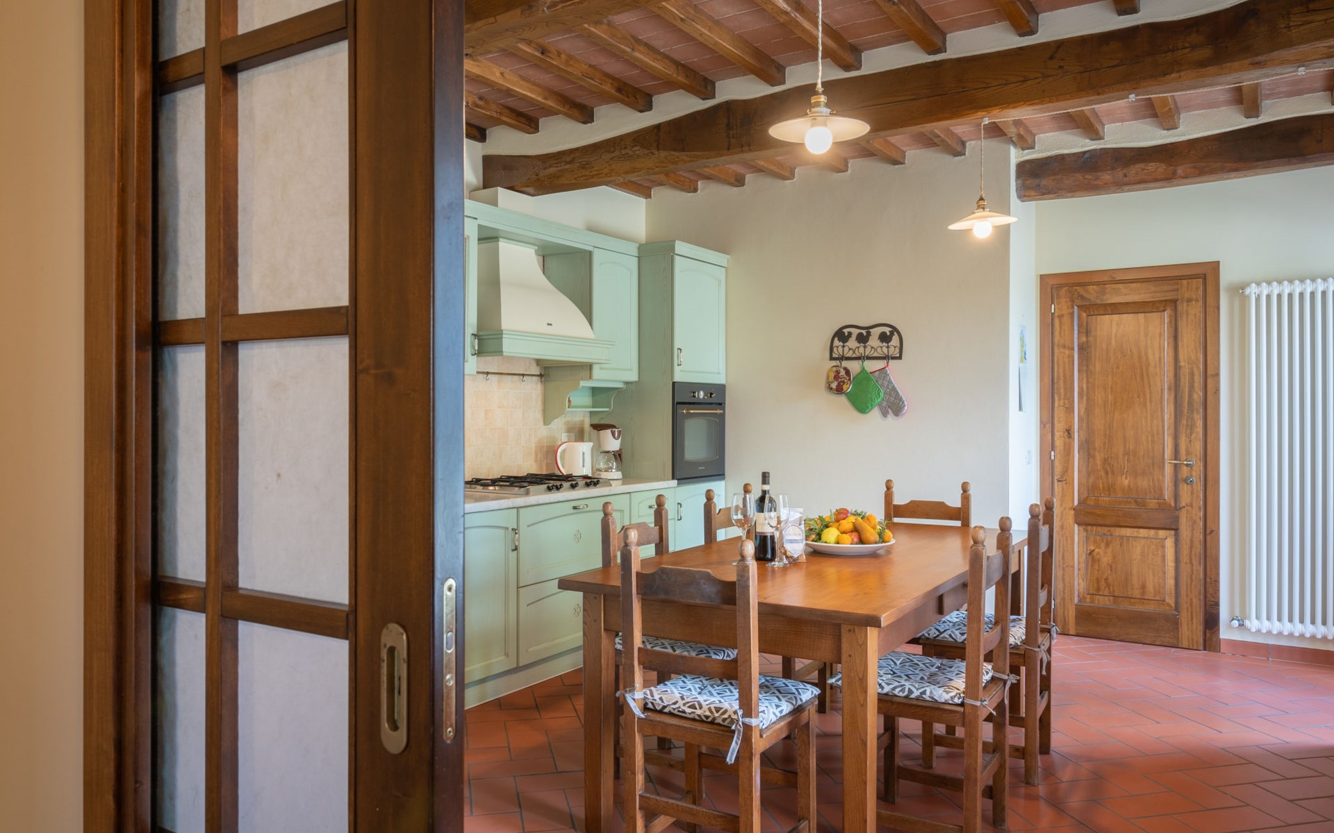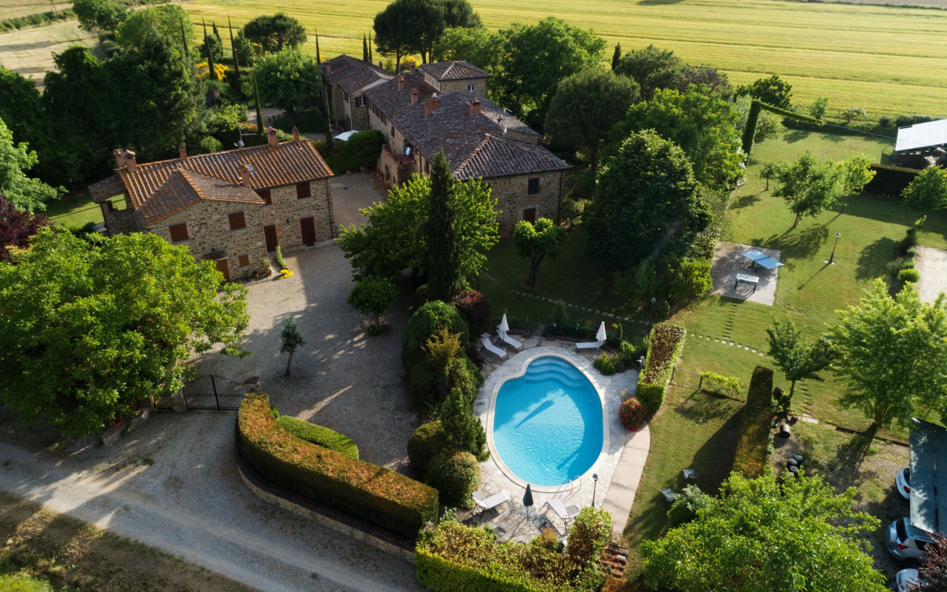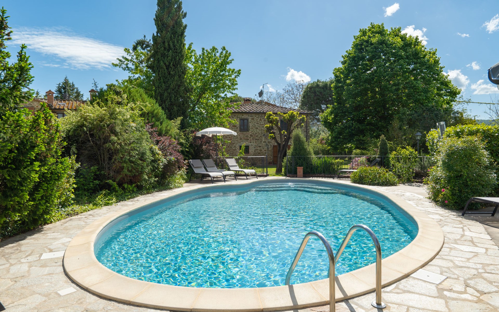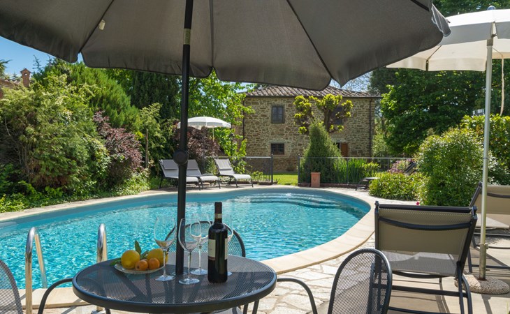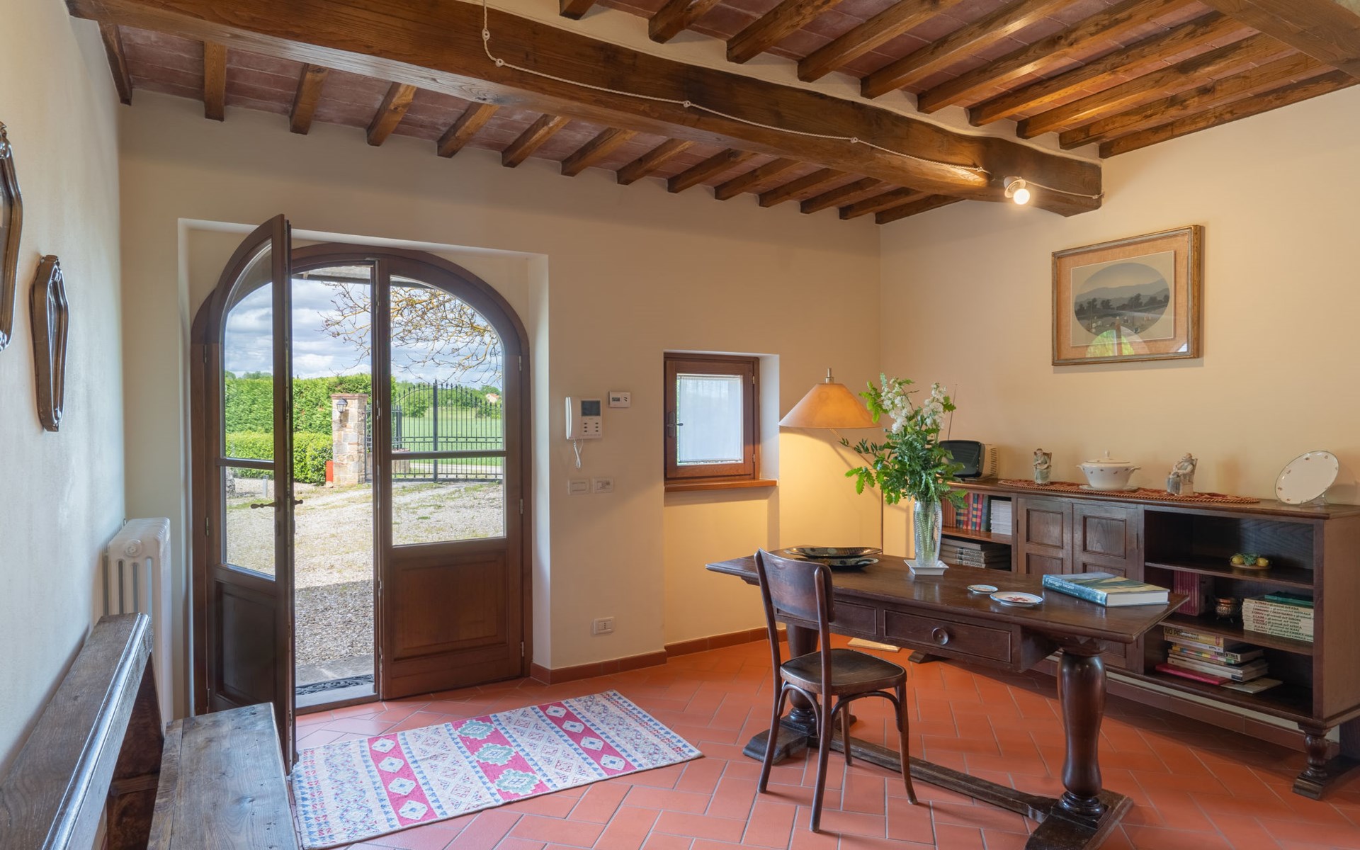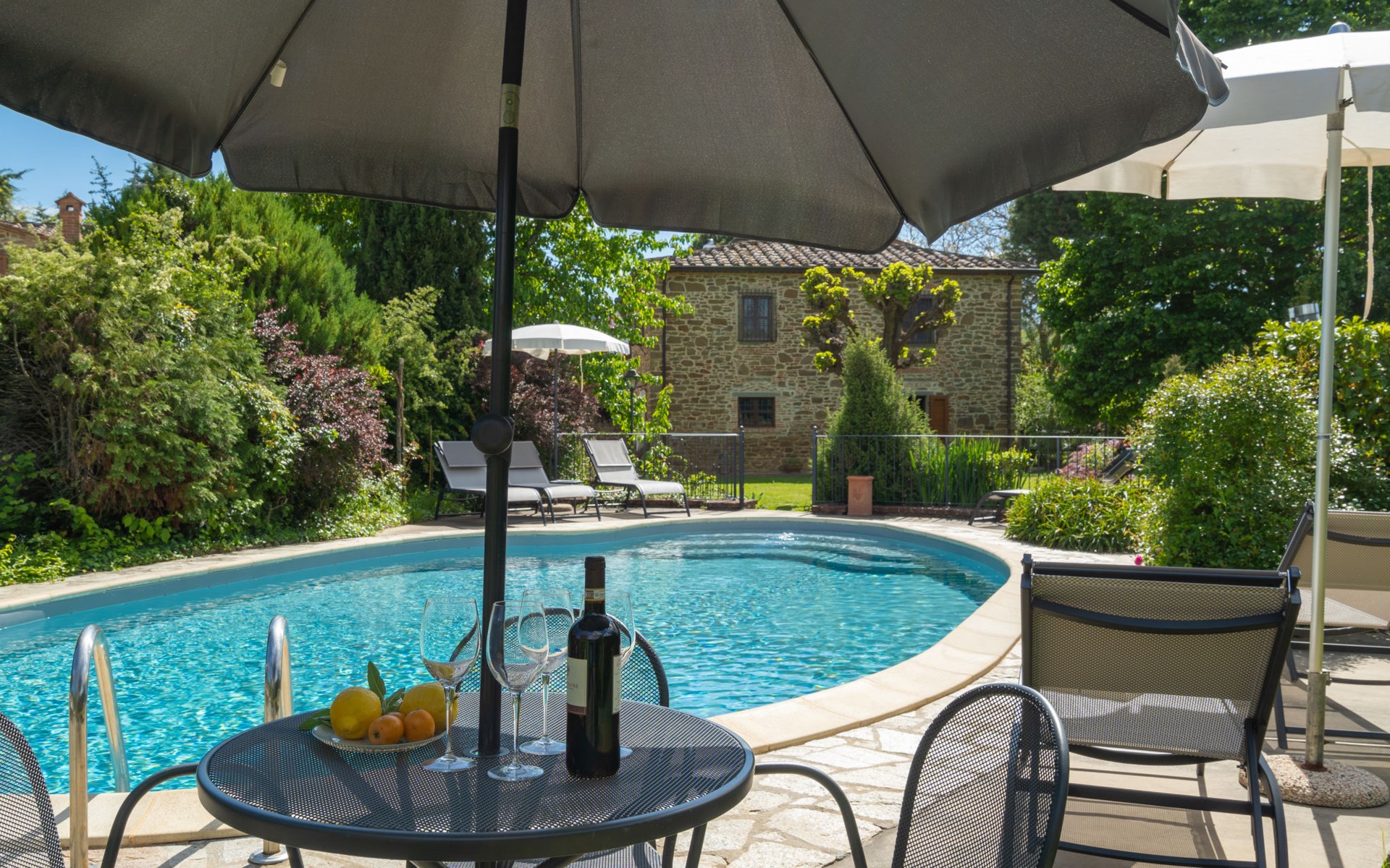 Cosy cottage, recently renovated, divided into two spaciuos parts, each with private garden of 400 m2. Under conservation act. A large fenced garden surrounds this house and the owners house which lay nearby. Swimming pool with outdoor hot water shower. View of the sunflowers fields, typical of the tuscan landcape. Sunset over the famous Gargonza castle. Private gate. Video entry phone for each apartments. The interiors are well kept, have terracotta and parquet floorings, beamed ceilings, stone archways, bedrooms had ceiling fan. Wrought iron beds. Siena 50 km. Florence 60 km. Rome is approx 2 hours by car. Cosy working farm "Casale il Giglio", renovated in 2004. 5 km from the centre of Monte San Savino, 19 km from the centre of Arezzo, 30 km from the centre of Terme di Rapolano, in the countryside. Private: garden 800 m2 (fenced), swimming pool (11 x 5 m, depth 100 - 175 cm, seasonal availability: 27.Apr. - 12.Oct.) with salt-electrolysis pool-cleaning system. Unconventional pool shape. Outdoor shower, table tennis, boules, garden furniture. In the complex: WiFi, table football, heating to be paid on the spot, heating available only from 01.Nov. - 15.Apr.. Available: bicycles (4). Parking at the house. Shop 5 km, restaurant 5 km, café 5 km, bus stop 800 m, railway station "Monte San Savino" 5 km, thermal baths "Rapolano Terme" 28 km. Riding stable 10 km. Nearby attractions: Lucignano 12 km, Rapolano Terme 28 km, Cortona 32 km, Montepulciano 37 km, Gaiole in Chianti 45 km. Please note: car recommended. Suitable for families, suitable for seniors. The owner lives on the same property.