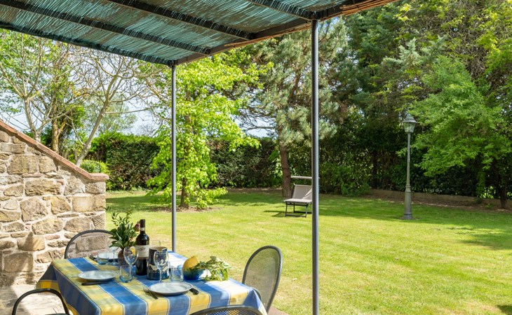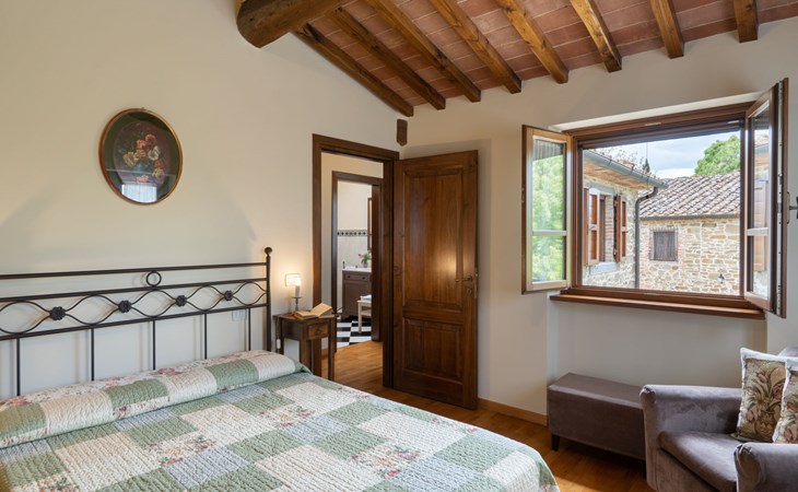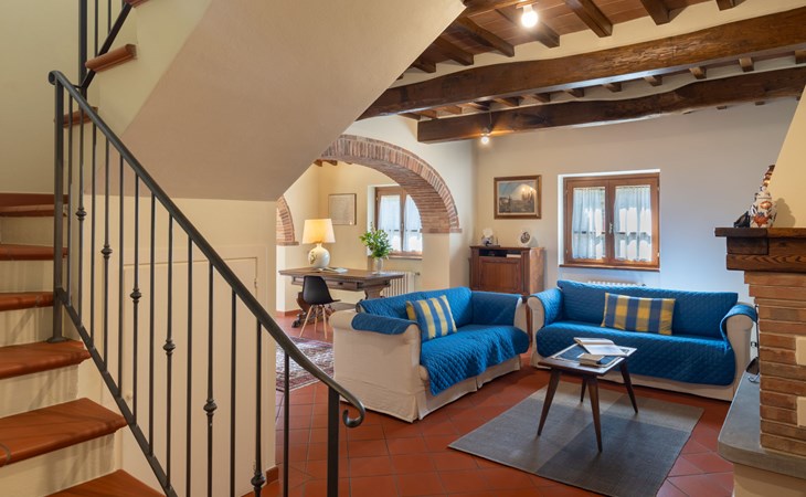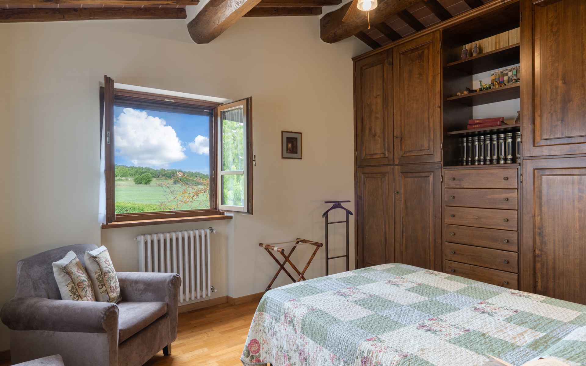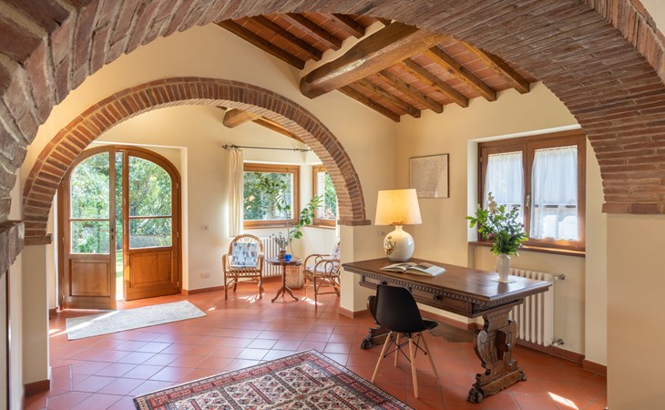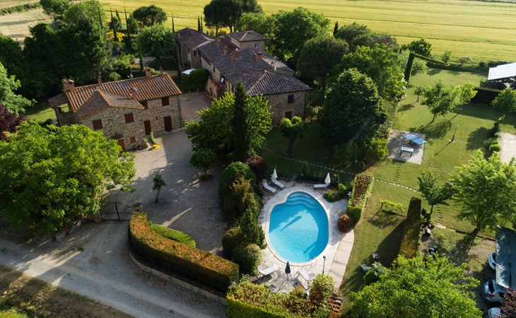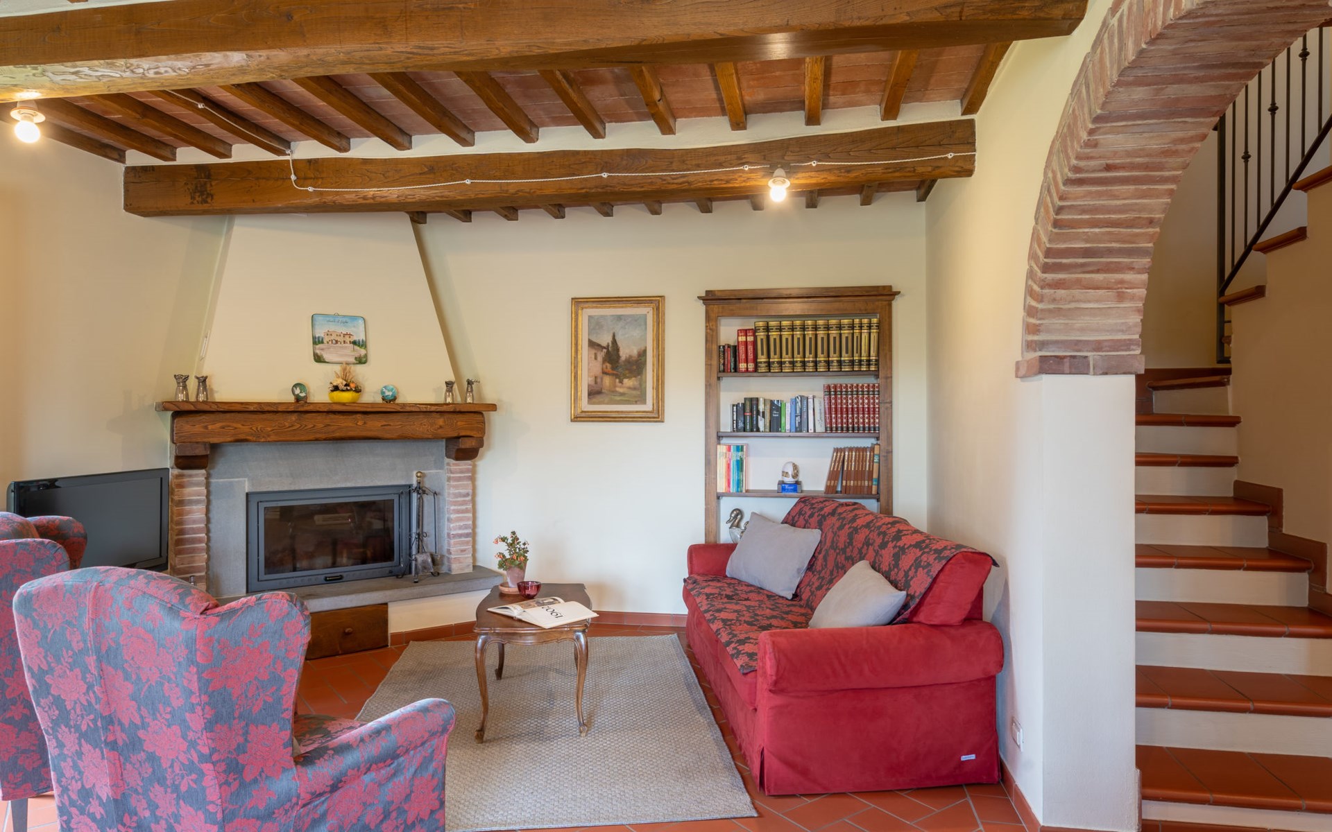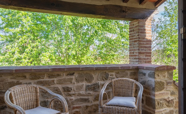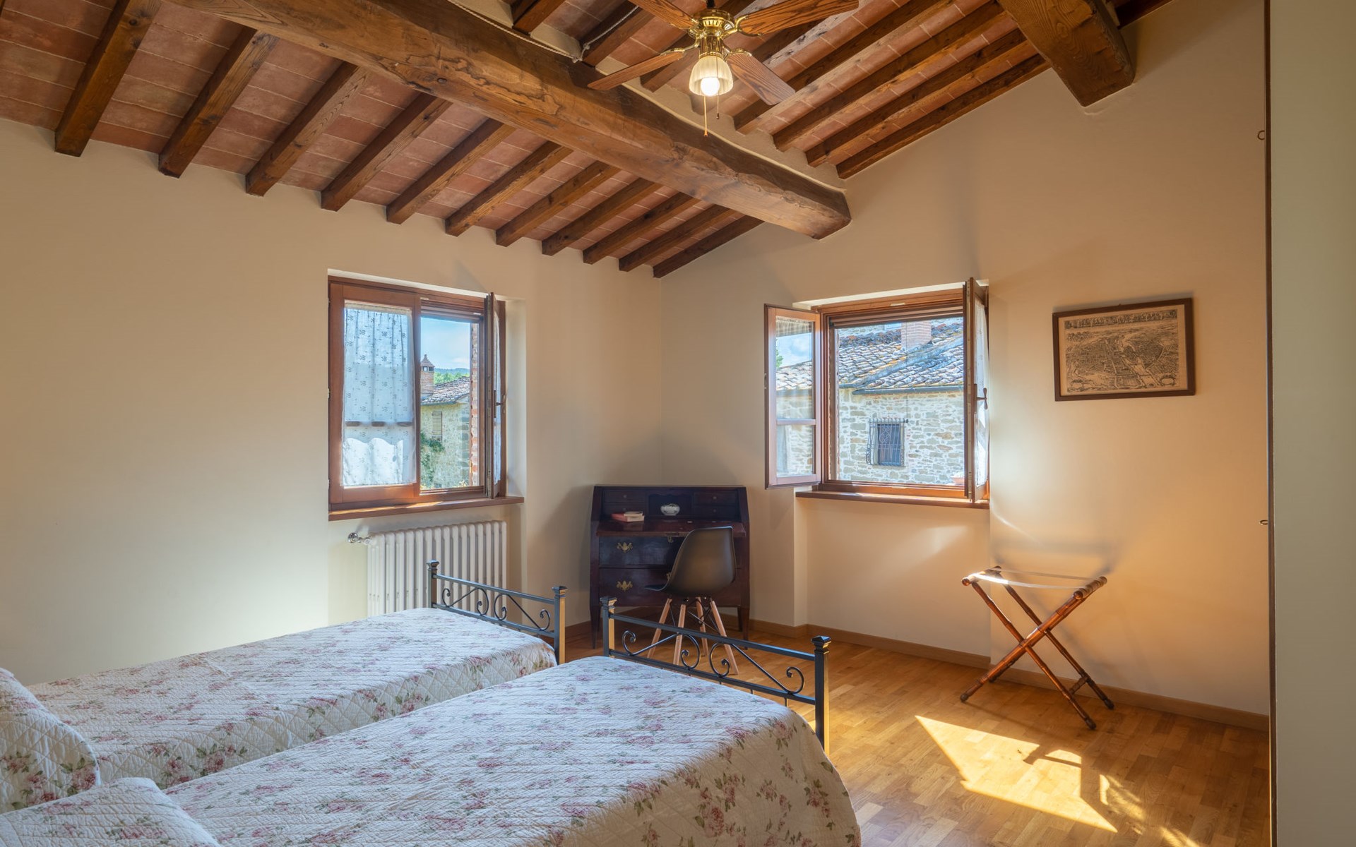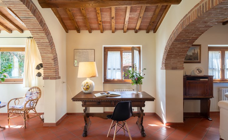 Cosy cottage, recently renovated, divided into two spaciuos parts, each with private garden of 400 m2. Under conservation act. A large fenced garden surrounds this house and the owners house which lay nearby. Swimming pool with outdoor hot water shower. View of the sunflowers fields, typical of the tuscan landcape. Sunset over the famous Gargonza castle. Private gate. Video entry phone for each apartments. The interiors are well kept, have terracotta and parquet floorings, beamed ceilings, stone archways, bedrooms had ceiling fan. Wrought iron beds. Siena 50 km. Florence 60 km. Rome is approx 2 hours by car. Cosy working farm "Casale il Giglio", renovated in 2004. 5 km from the centre of Monte San Savino, 19 km from the centre of Arezzo, 30 km from the centre of Terme di Rapolano, in the countryside. Private: garden 800 m2 (fenced), swimming pool (11 x 5 m, depth 100 - 175 cm, seasonal availability: 27.Apr. - 12.Oct.) with salt-electrolysis pool-cleaning system. Unconventional pool shape. Outdoor shower, table tennis, boules, garden furniture. In the complex: WiFi, table football, heating to be paid on the spot, heating available only from 01.Nov. - 15.Apr.. Available: bicycles (4). Parking at the house. Shop 5 km, restaurant 5 km, café 5 km, bus stop 800 m, railway station "Monte San Savino" 5 km, thermal baths "Rapolano Terme" 28 km. Riding stable 10 km. Nearby attractions: Lucignano 12 km, Rapolano Terme 28 km, Cortona 32 km, Montepulciano 37 km, Gaiole in Chianti 45 km. Please note: car recommended. Suitable for families, suitable for seniors. The owner lives on the same property.