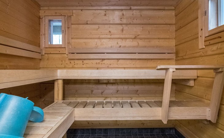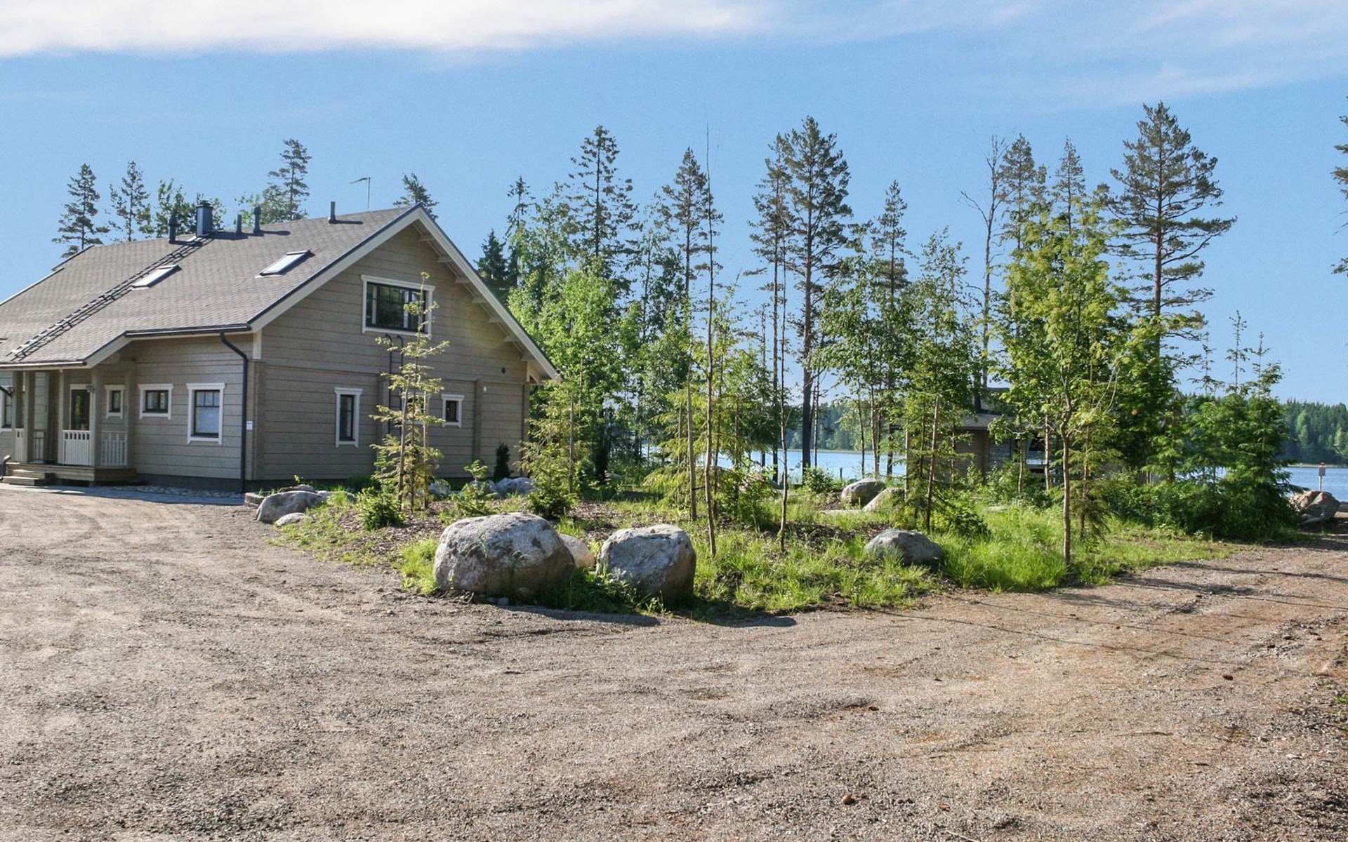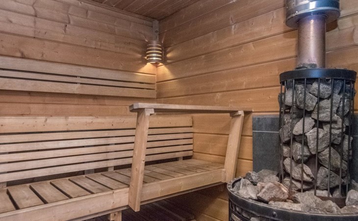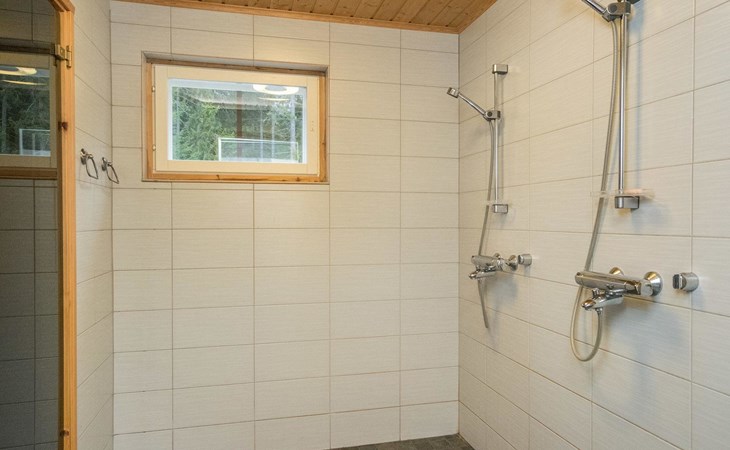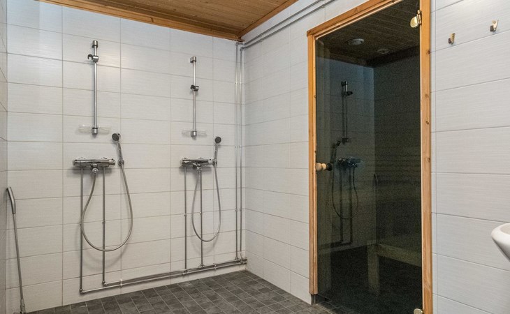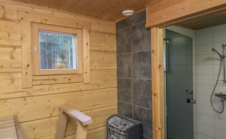Separate lakeside sauna 30 m² with wood-burning sauna stove, washroom with 2 showers and WC, fireplace room, 15 m² glazed living area with outdoor kitchen between the spaces.