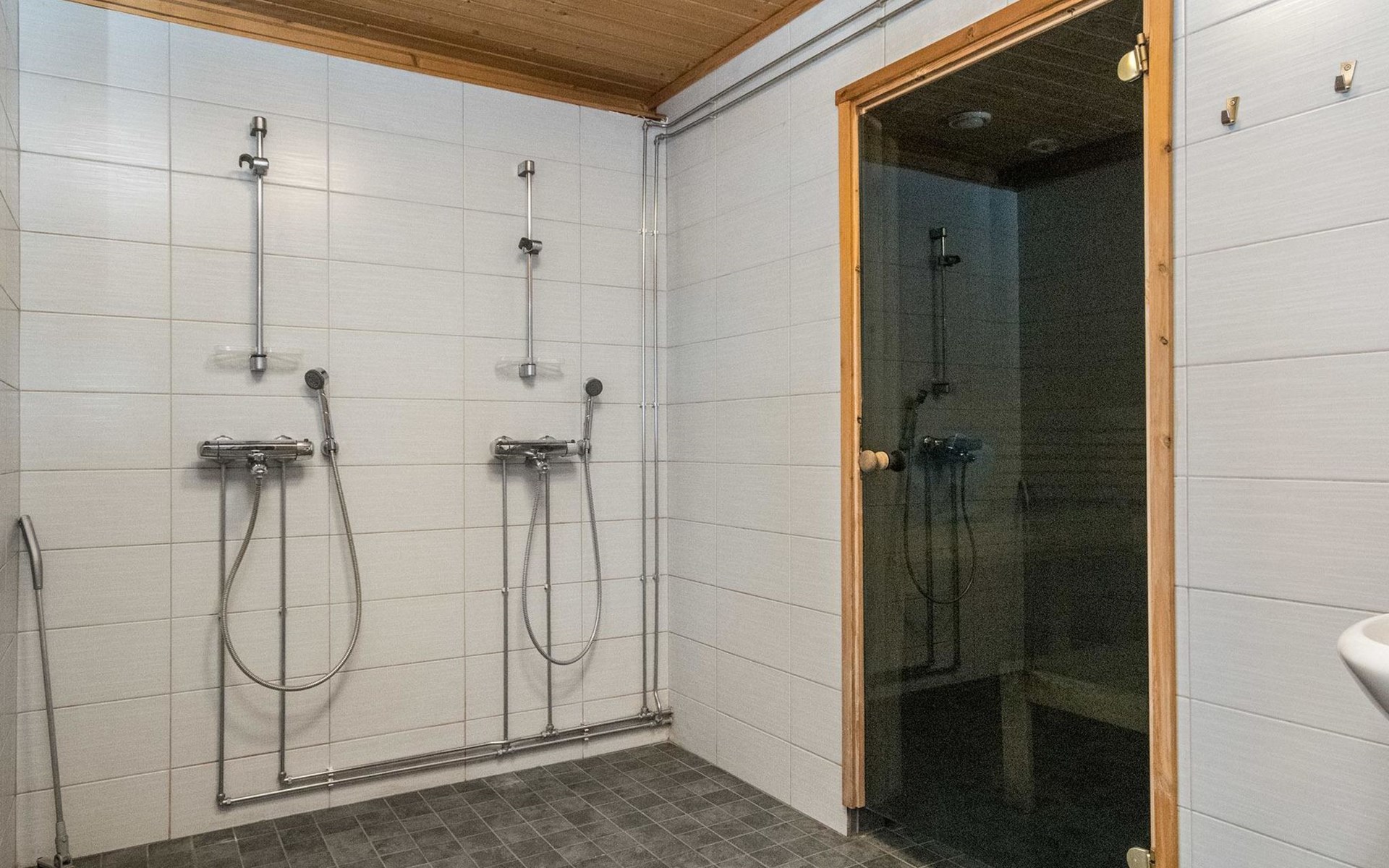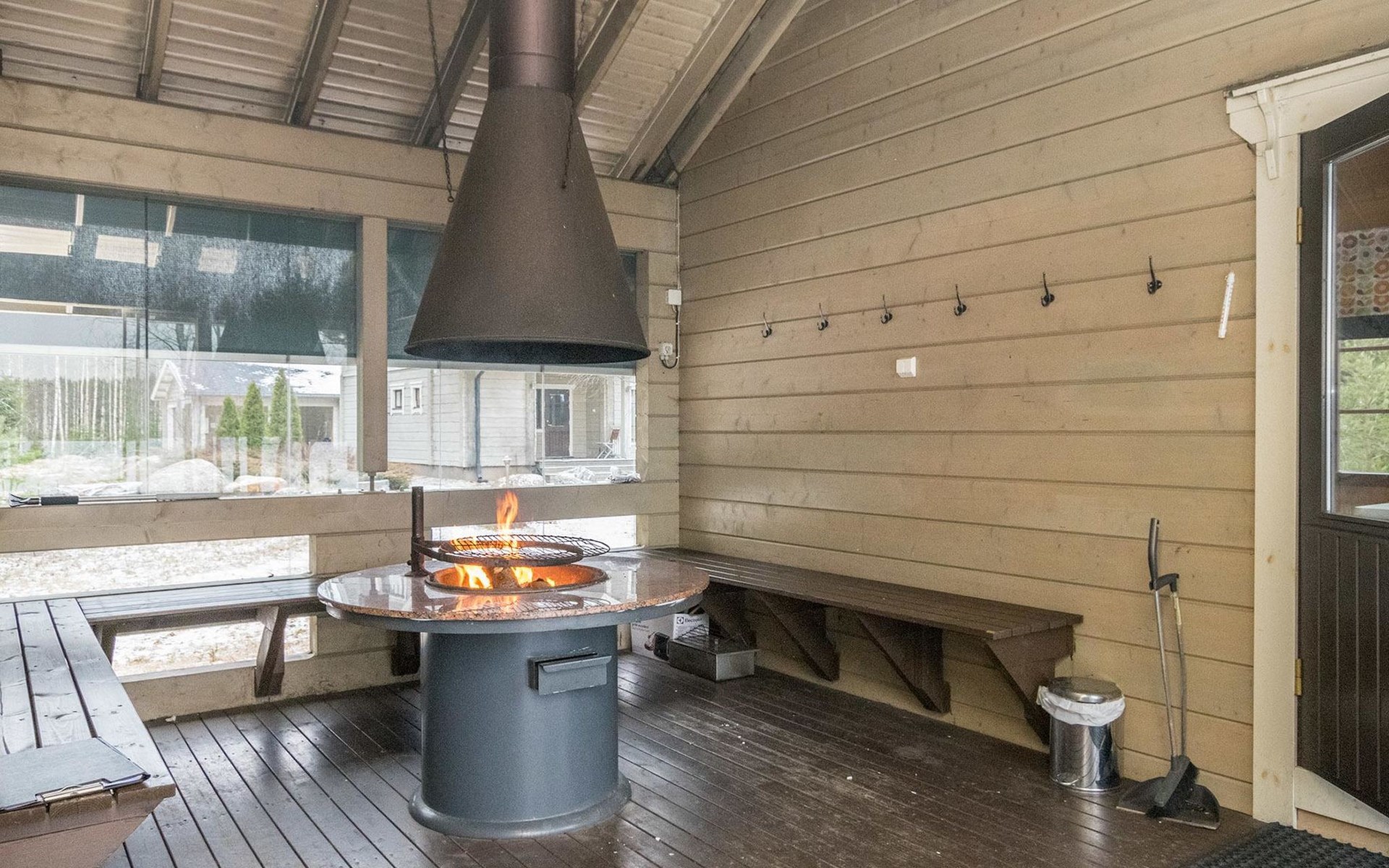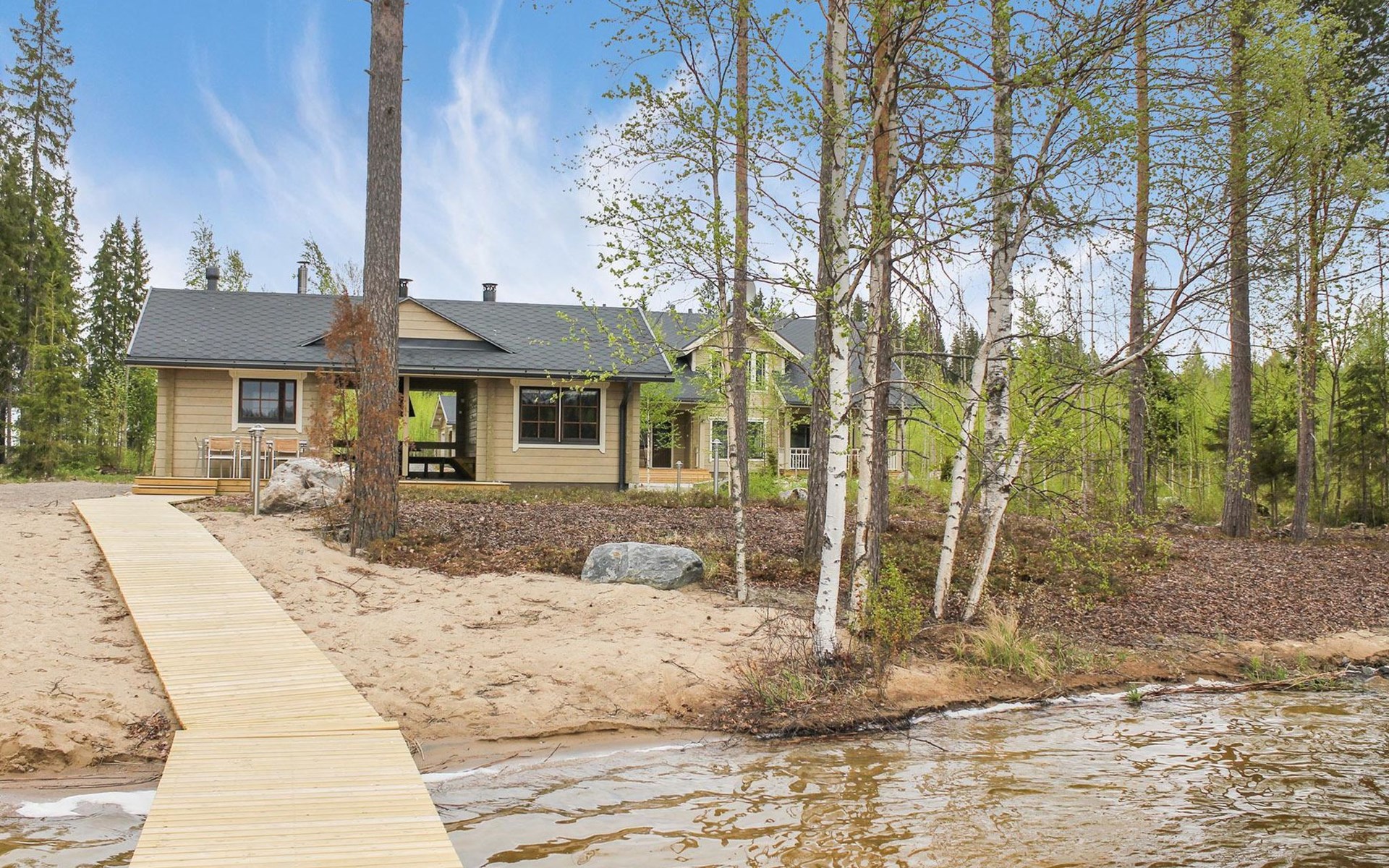 Separate lakeside sauna 30 m² with wood-burning sauna stove, washroom with 2 showers and WC, fireplace room, 15 m² glazed living area with outdoor kitchen between the spaces.