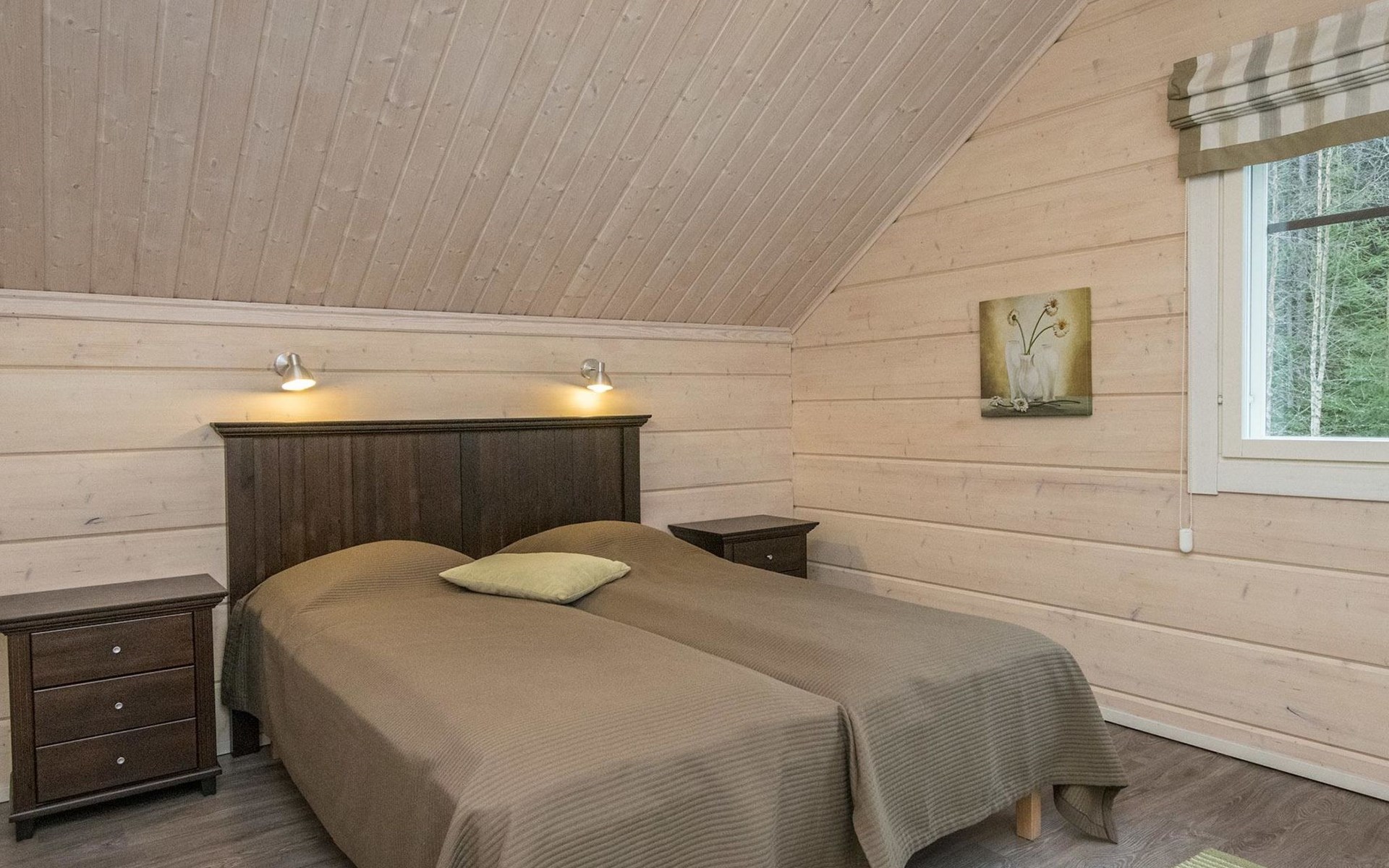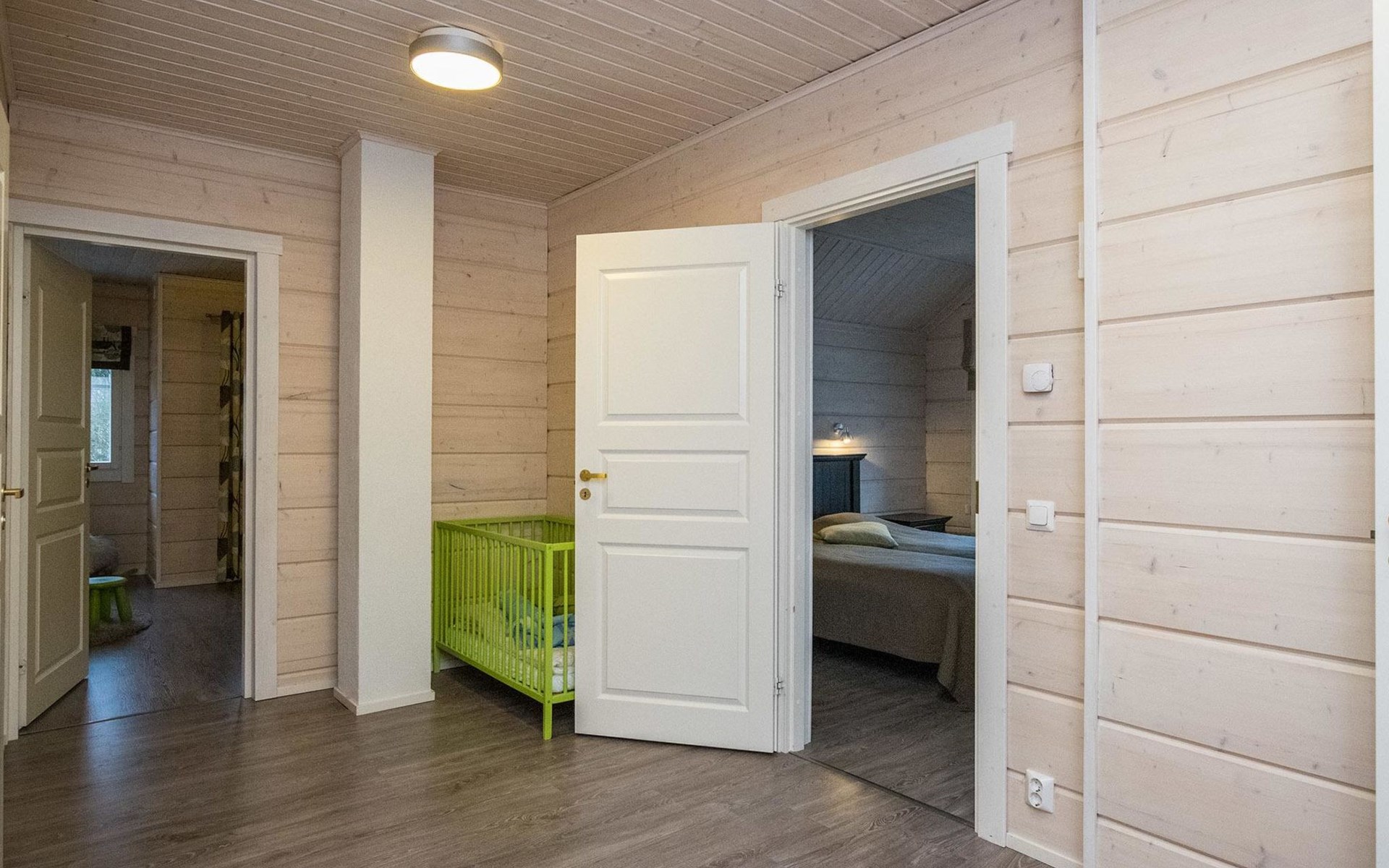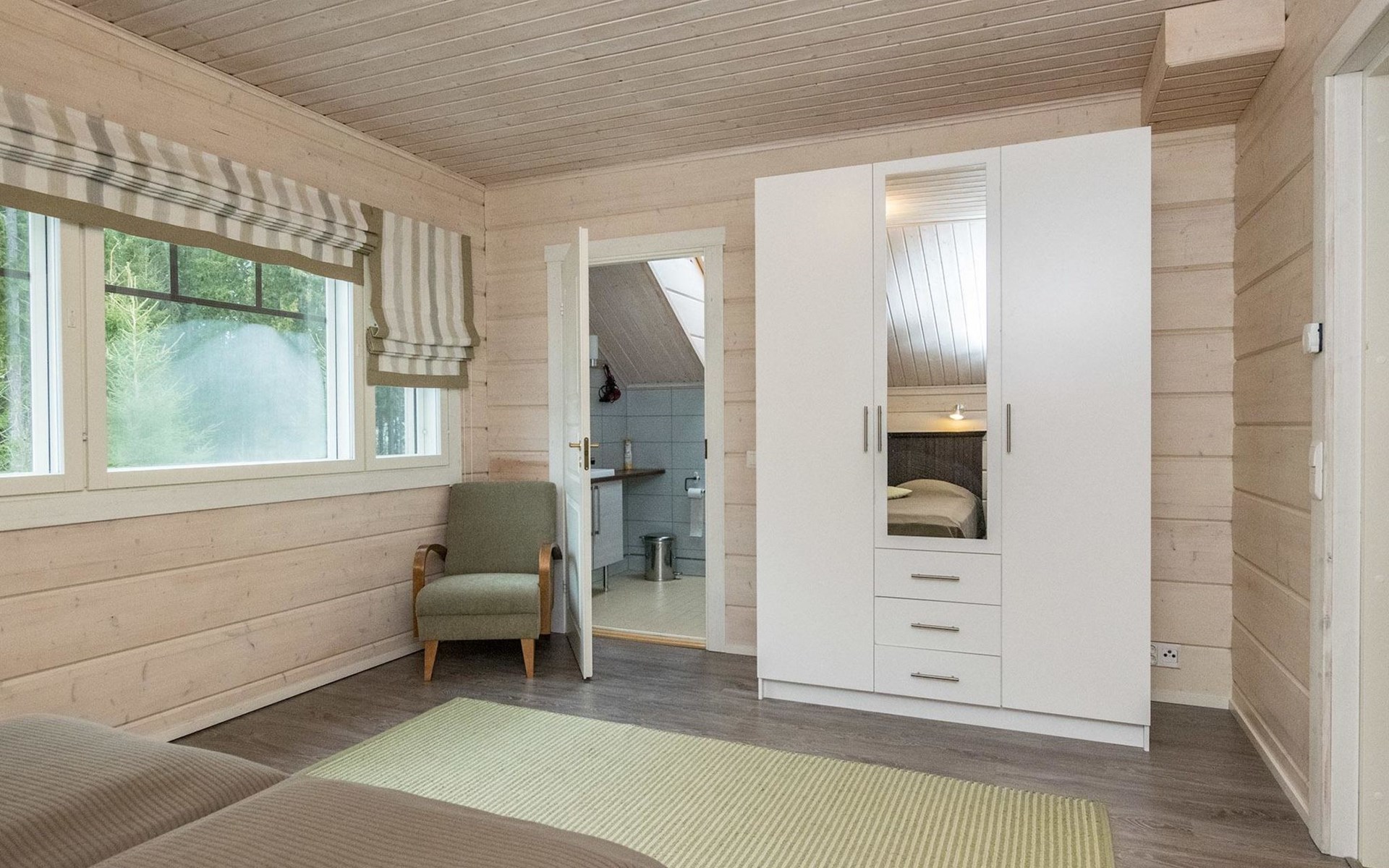 Log cabin 2010, kitchen, living room, bedroom (11 m²) two beds, utility room, washroom (2 showers) sauna, electric sauna stove, separate WC, terrace.