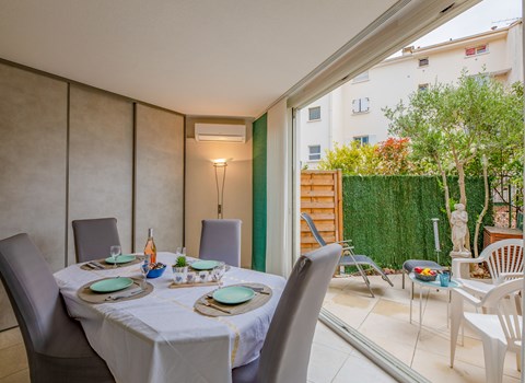 Apartment block "La Chouetterie". In the resort 1 km from the centre of Carnac Plage, from the sea, 200 m from the beach. Shop 900 m, grocery 50 m, supermarket, restaurant 550 m, bar 900 m, café, sandy beach "Grand Plage" 200 m, thermal baths "Thalassothérapie de Carnac" 1.3 km. Sports harbour 3.3 km, golf course (18 hole) 15 km, surf school 5 km, sailing school 1.7 km, tennis 650 m. Nearby attractions: Alignements de Carnac 5 km, Auray et port de St Goustan 13 km, Presqu'ile de Quiberon 25 km, Vannes 30 km, Lorient 50 km.