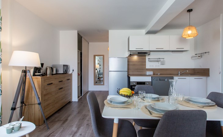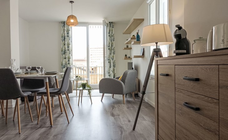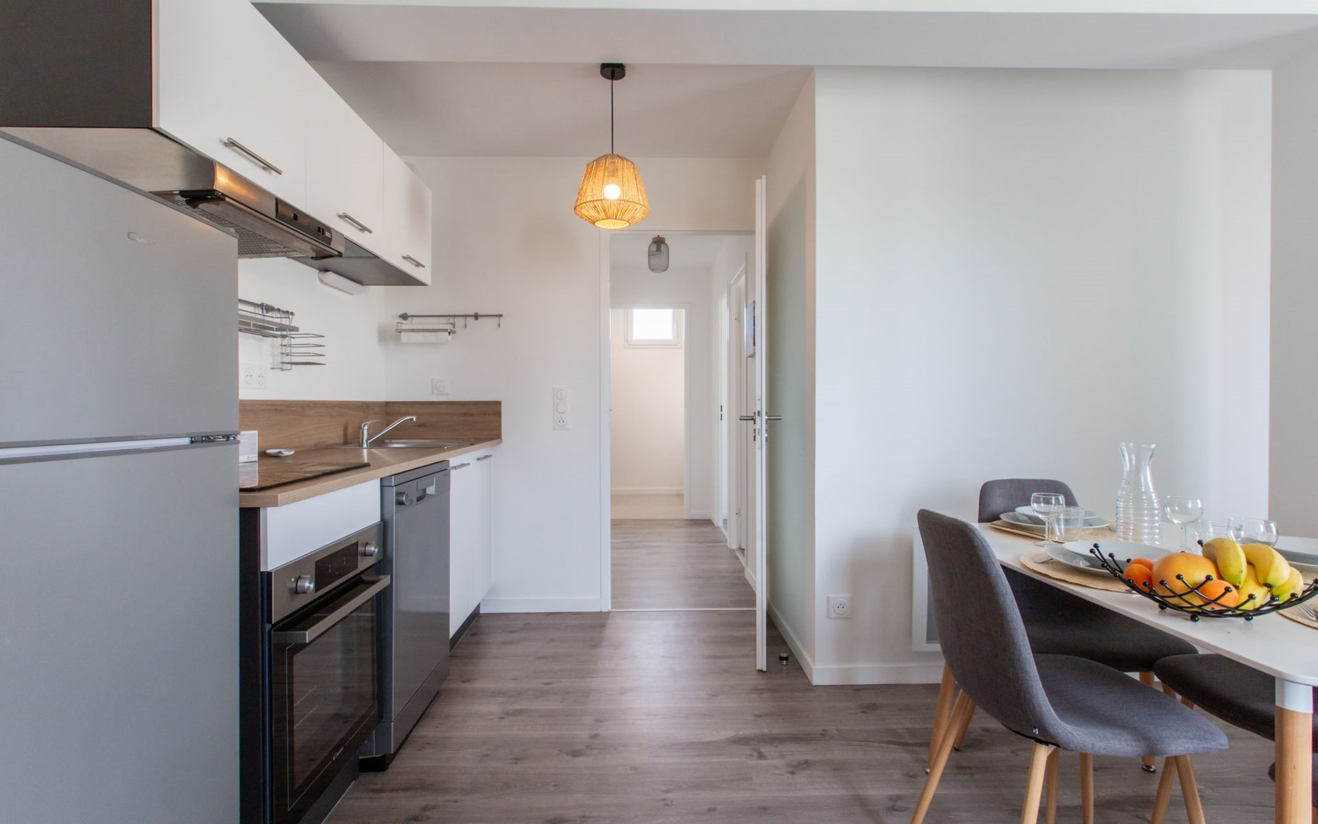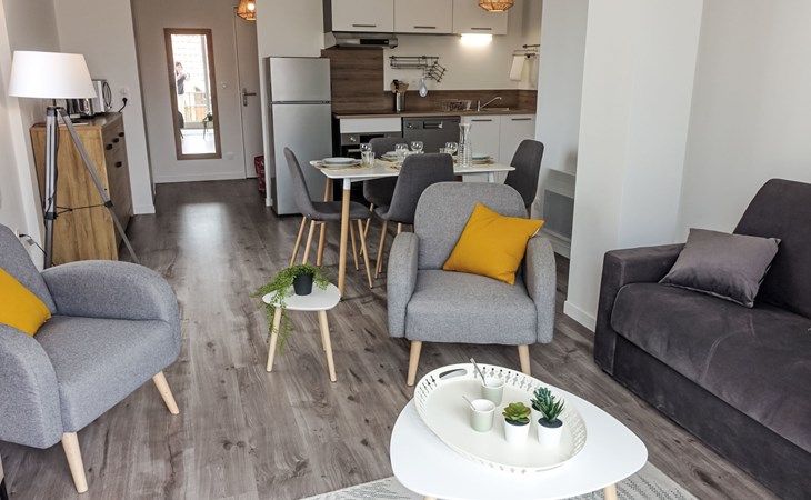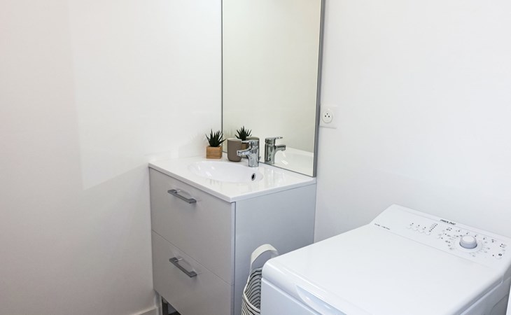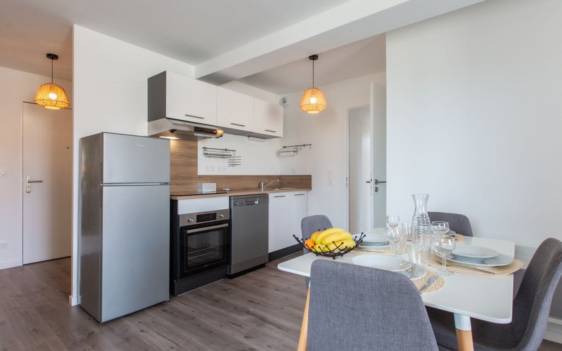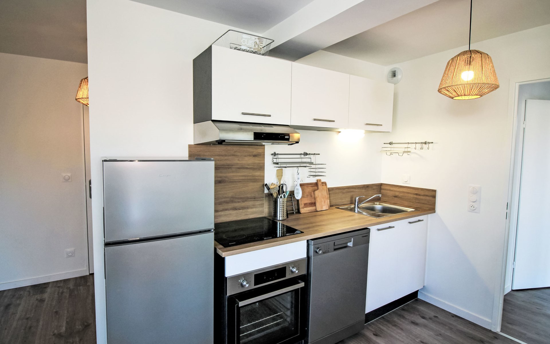 Capbreton: Apartment block "Cap Océan", 2 storeys, built in 2023. 17 apartments in the residence. In the resort, 150 m from the sea, 150 m from the beach. In the complex: washing machine, tumble dryer (for shared use). Public parking on the road. Shop 300 m, grocery 150 m, supermarket 1.8 km, restaurant 50 m, bakery 150 m, bicycle rental 100 m, sandy beach "Du Prévent". Golf course (18 hole) 4 km, surf school 150 m, tennis 3 km, minigolf 200 m, riding stable 1 km. Nearby attractions: Seignosse 15 km, Bayonne 22 km, Dax 37 km, Biarritz 37 km. Well-known lakes can easily be reached: Réserve Naturelle des Marais d’Orx, Réserve Naturelle du courant d’Huchet.