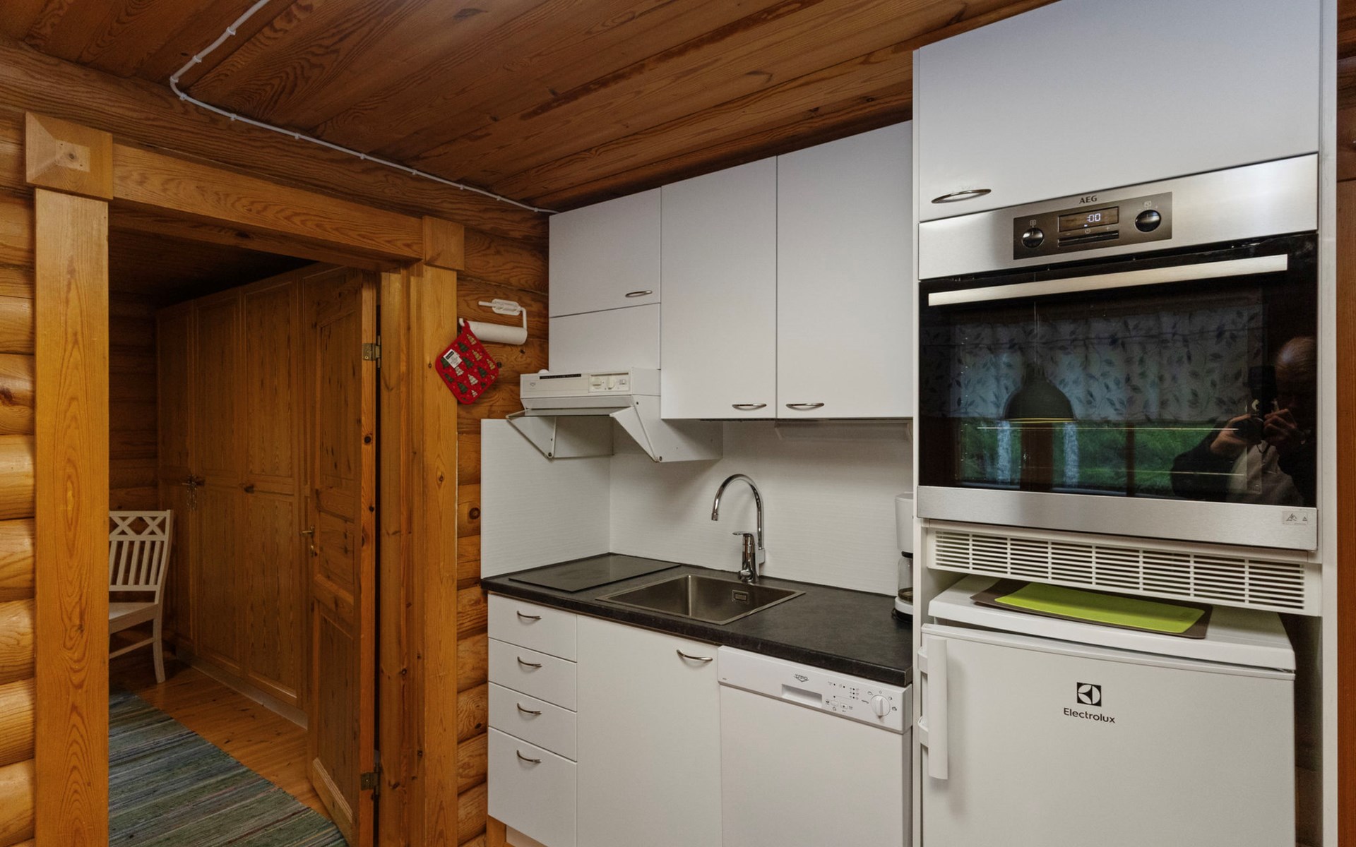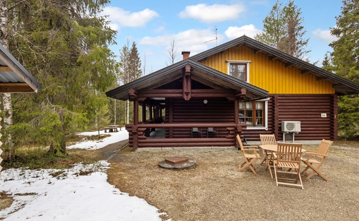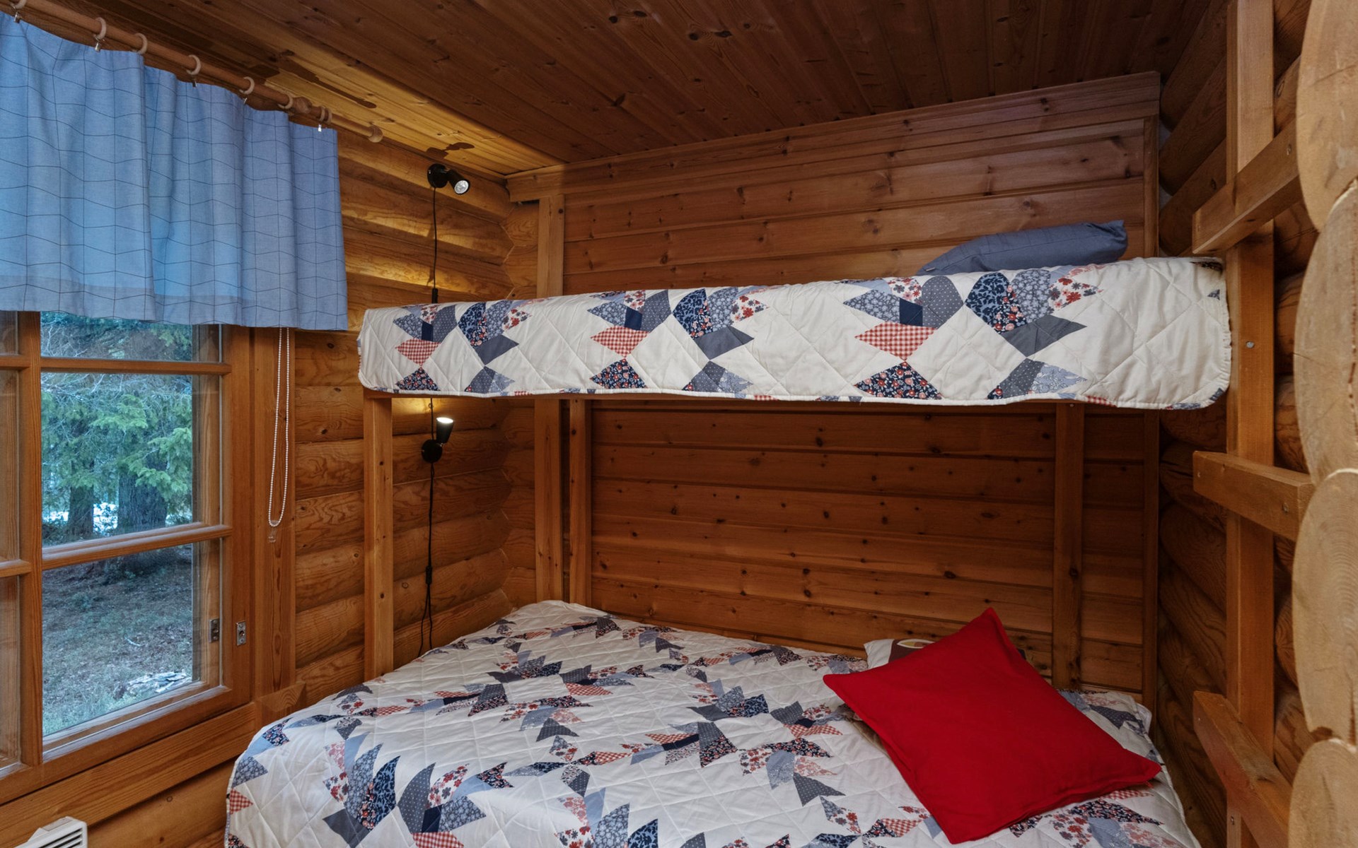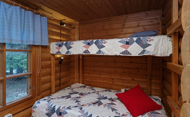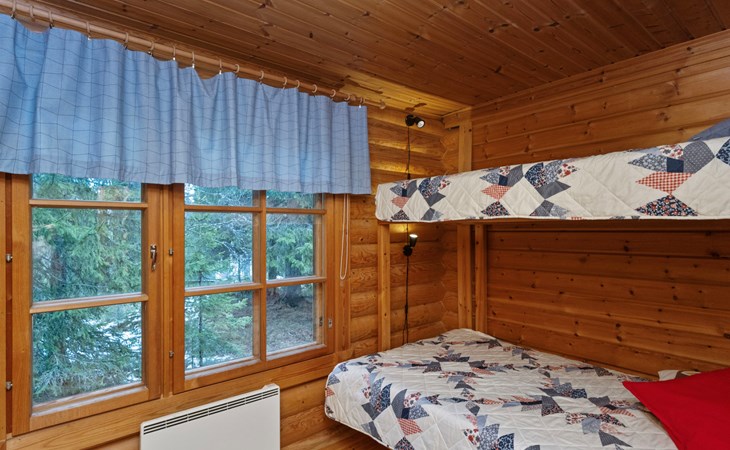 Log-built apartment for 6, built in 1990, basic amenities, bedroom 1: double bed, bedroom 2: bunk bed (lower bed 140 cm), loft (15 m², low room height, steep stairs): 2 beds, combined kitchen/living room, electric sauna.
