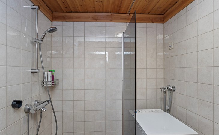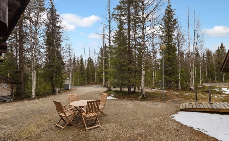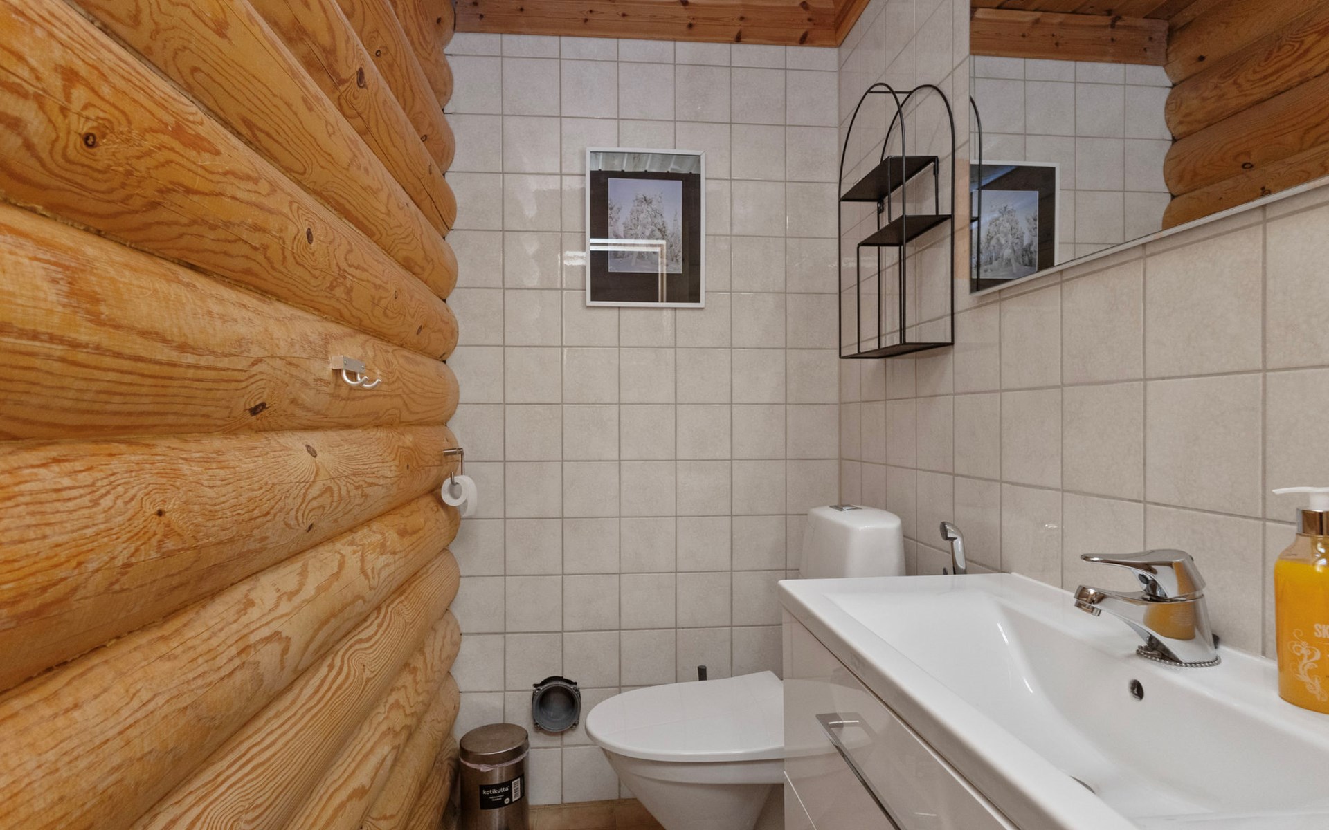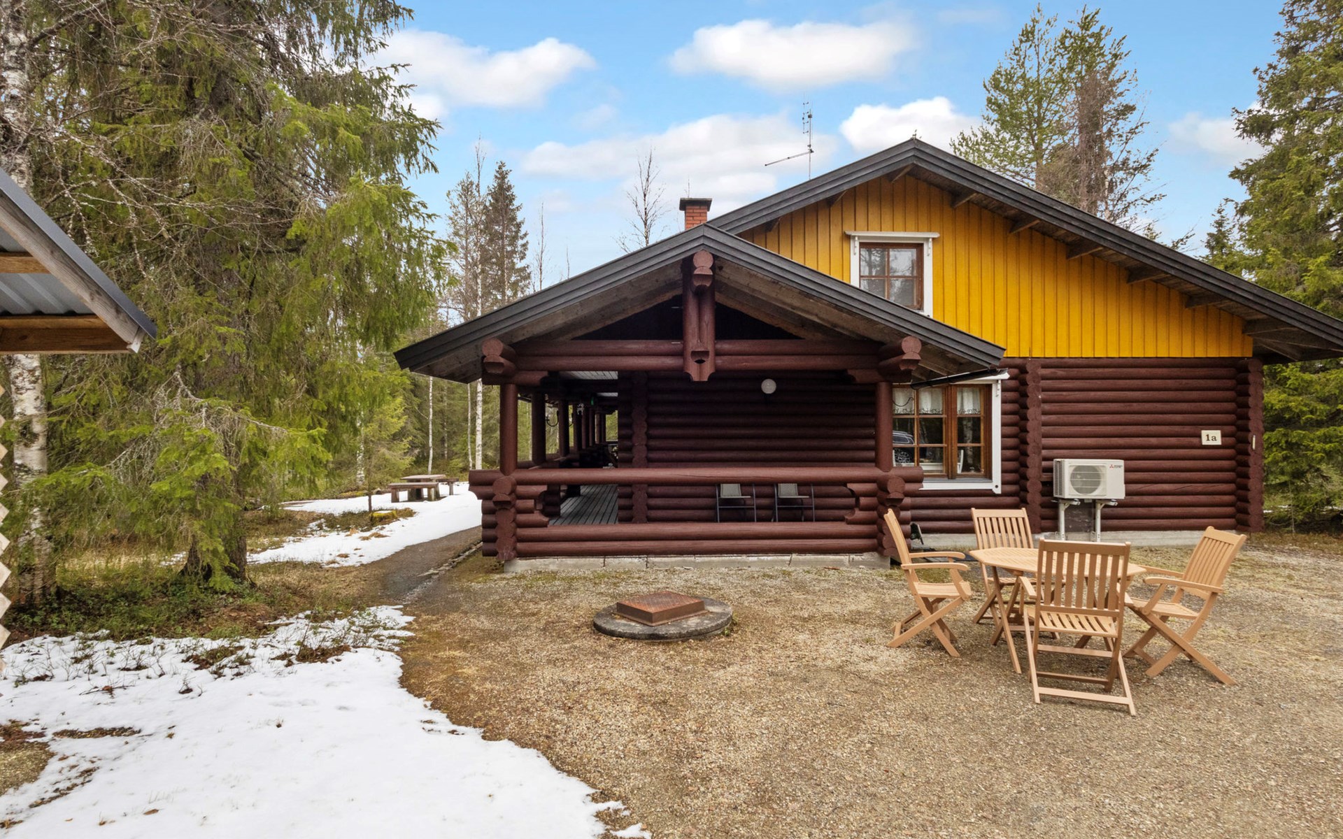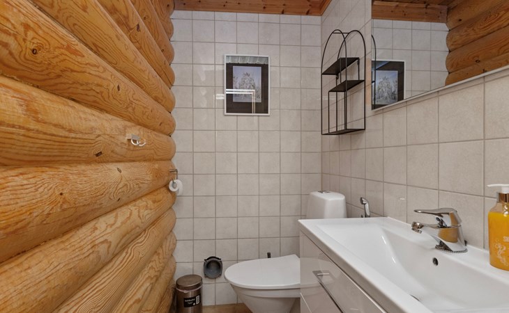 Log-built apartment for 6, built in 1990, basic amenities, bedroom 1: double bed, bedroom 2: bunk bed (lower bed 140 cm), loft (15 m², low room height, steep stairs): 2 beds, combined kitchen/living room, electric sauna.