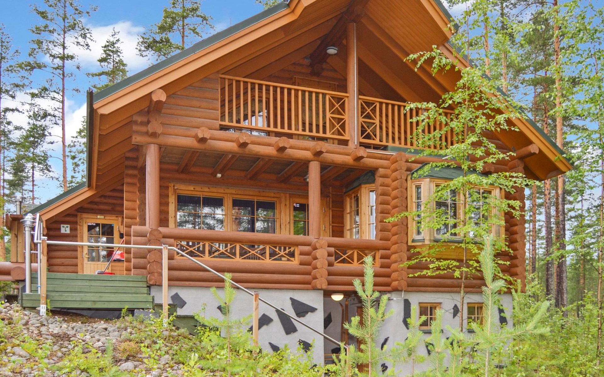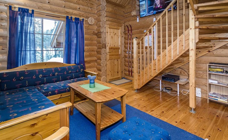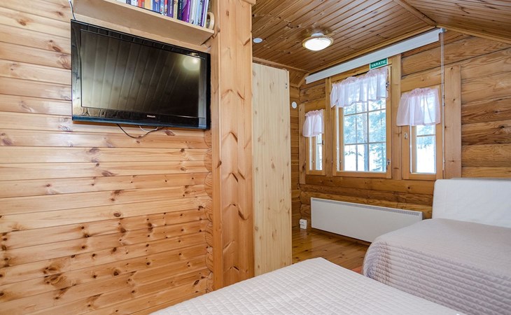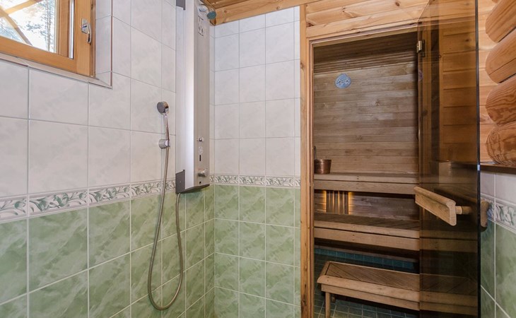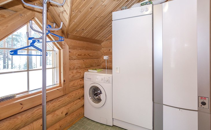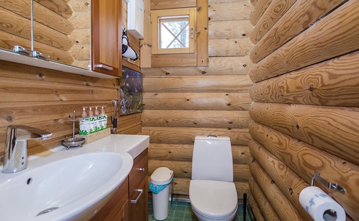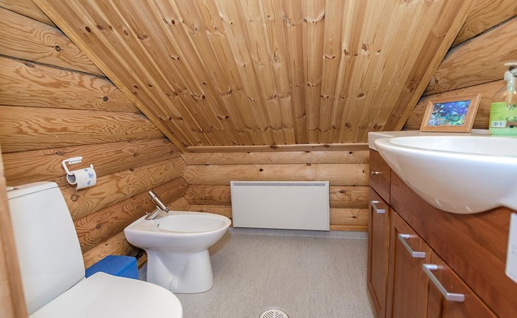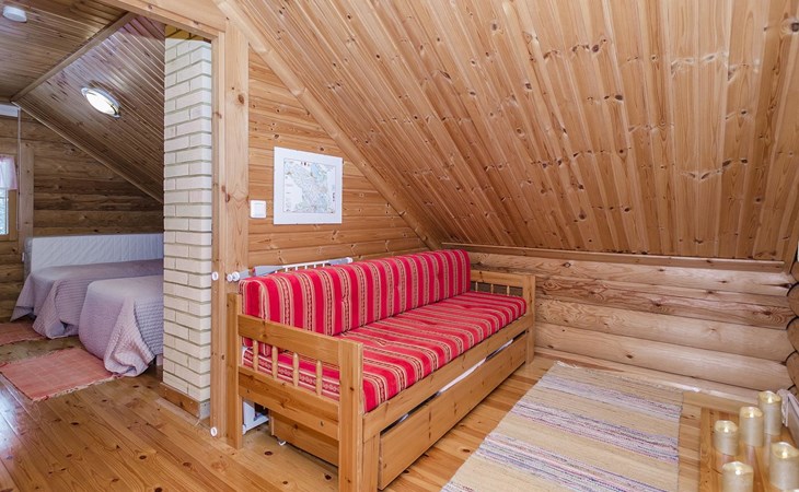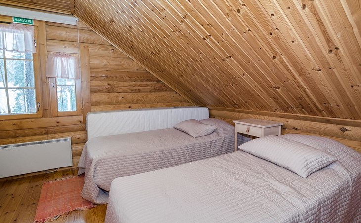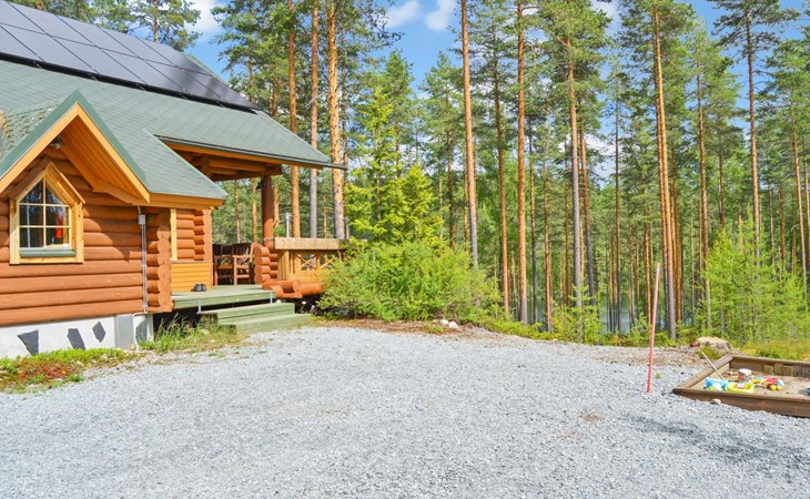 Log cabin 2003, living room/kitchen, bedroom with 2 beds, on the upper floor bedroom with 2 beds, private WC and TV, loft with spreadable sofa bed. In addition, 2 mattresses. Electric sauna, washroom, terrace, balcony. Wood heated barrel sauna by the lake.