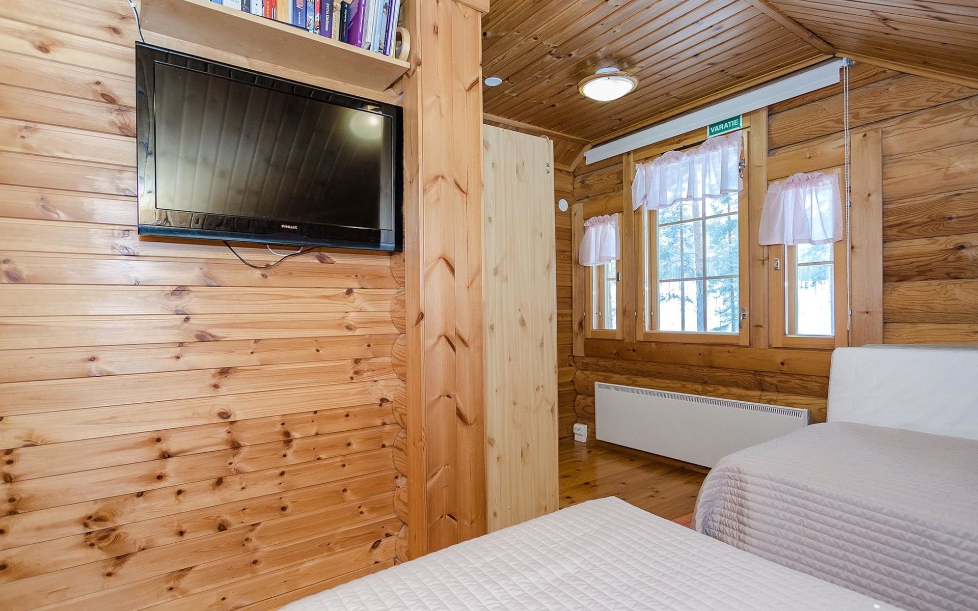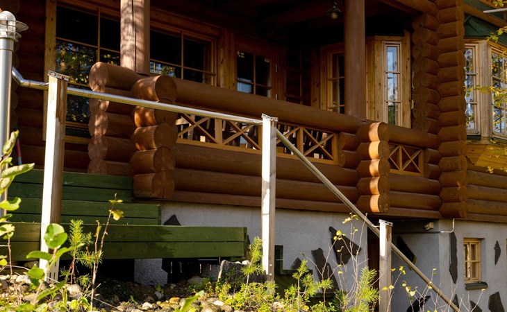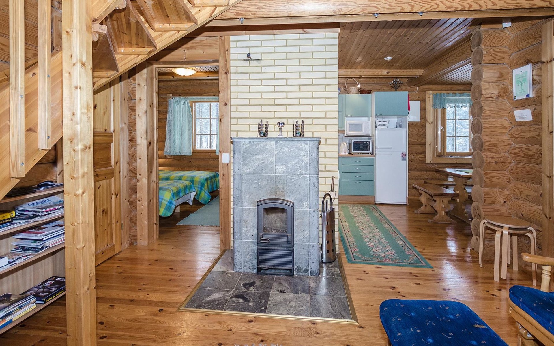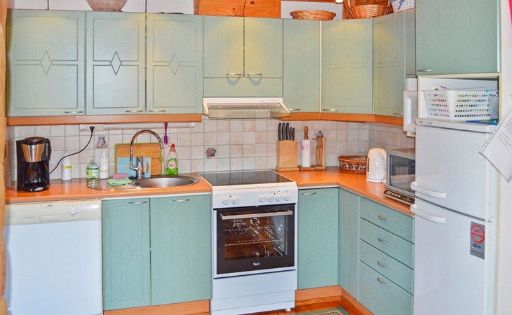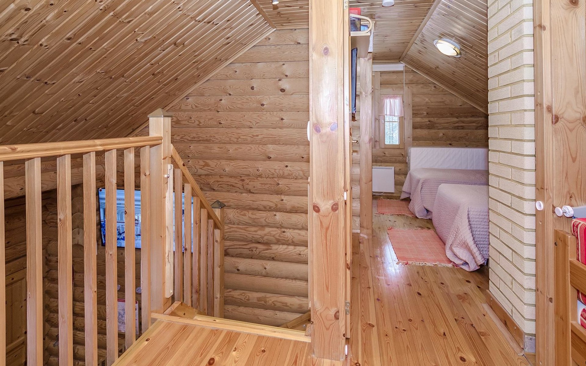 Log cabin 2003, living room/kitchen, bedroom with 2 beds, on the upper floor bedroom with 2 beds, private WC and TV, loft with spreadable sofa bed. In addition, 2 mattresses. Electric sauna, washroom, terrace, balcony. Wood heated barrel sauna by the lake.