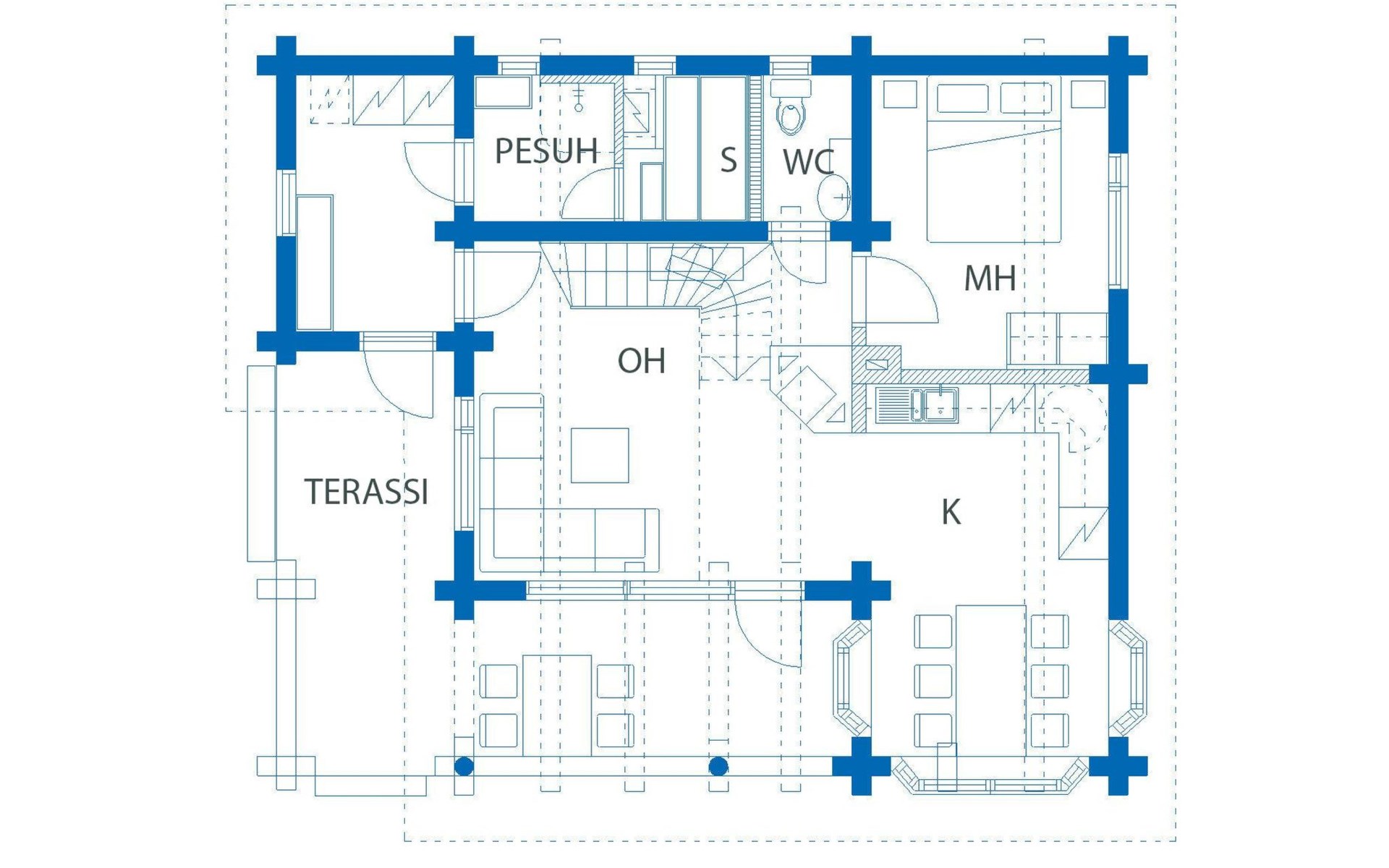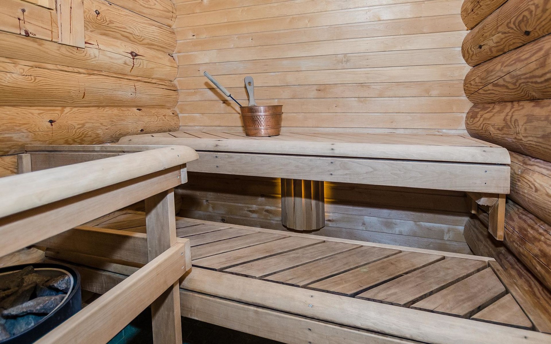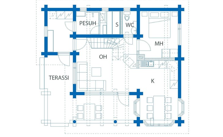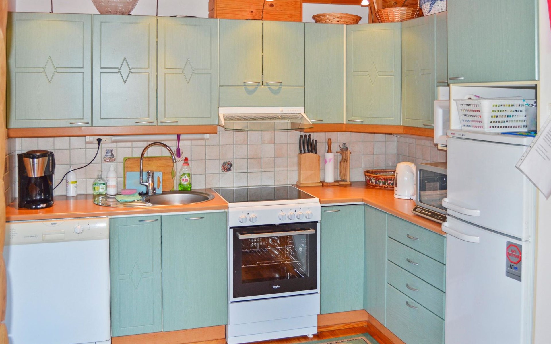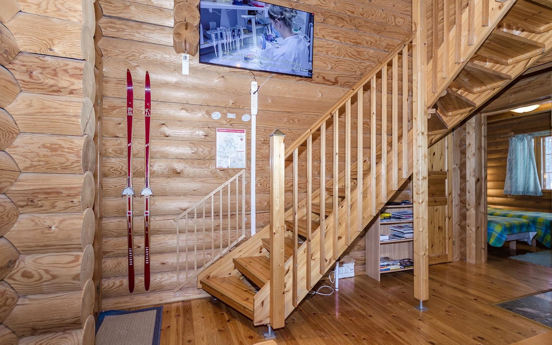 Log cabin 2003, living room/kitchen, bedroom with 2 beds, on the upper floor bedroom with 2 beds, private WC and TV, loft with spreadable sofa bed. In addition, 2 mattresses. Electric sauna, washroom, terrace, balcony. Wood heated barrel sauna by the lake.