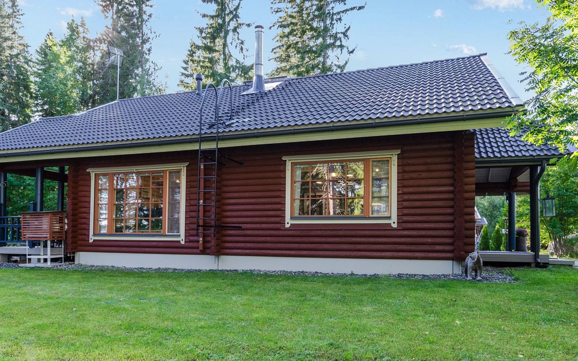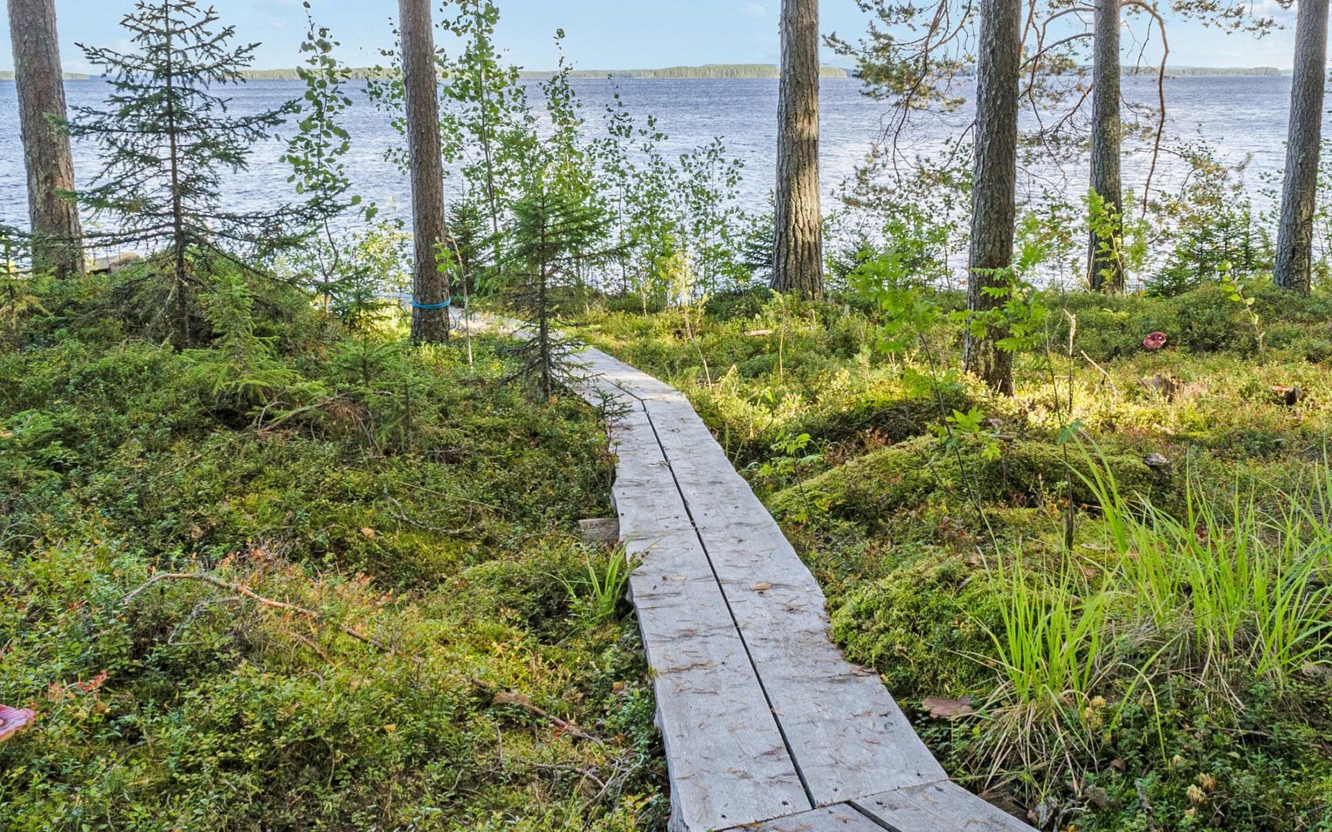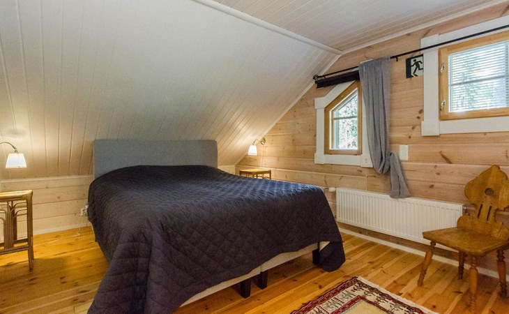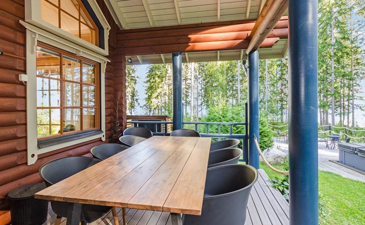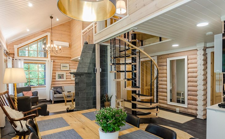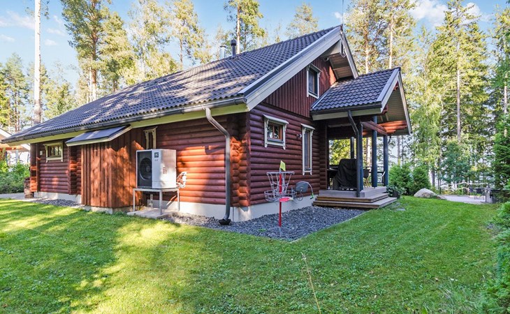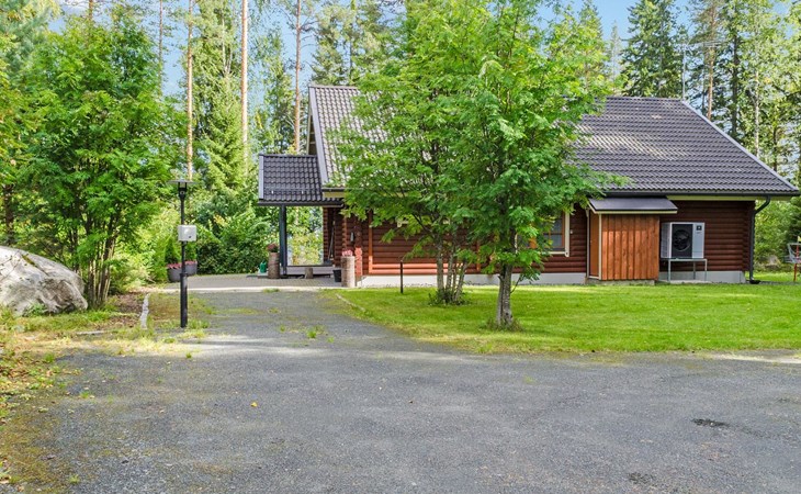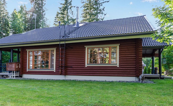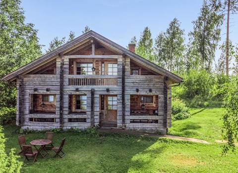 72 km to the north from Joensuu, lake Pielinen 65 m (871.2 km²), own rocky beach, own boat. Boardwalk leading to the lakeside. The log cabin was built in 2005 and completely renovated in 2020. Living room/kitchen, 2 bedrooms on the ground floor, one with double bed and the other with 2 beds. On the upper floor, there is a lounge loft and 2 bedrooms, one with a double bed and the other with 2 beds. Dressing/laundry room, washroom, electric sauna, terrace, and large patio.