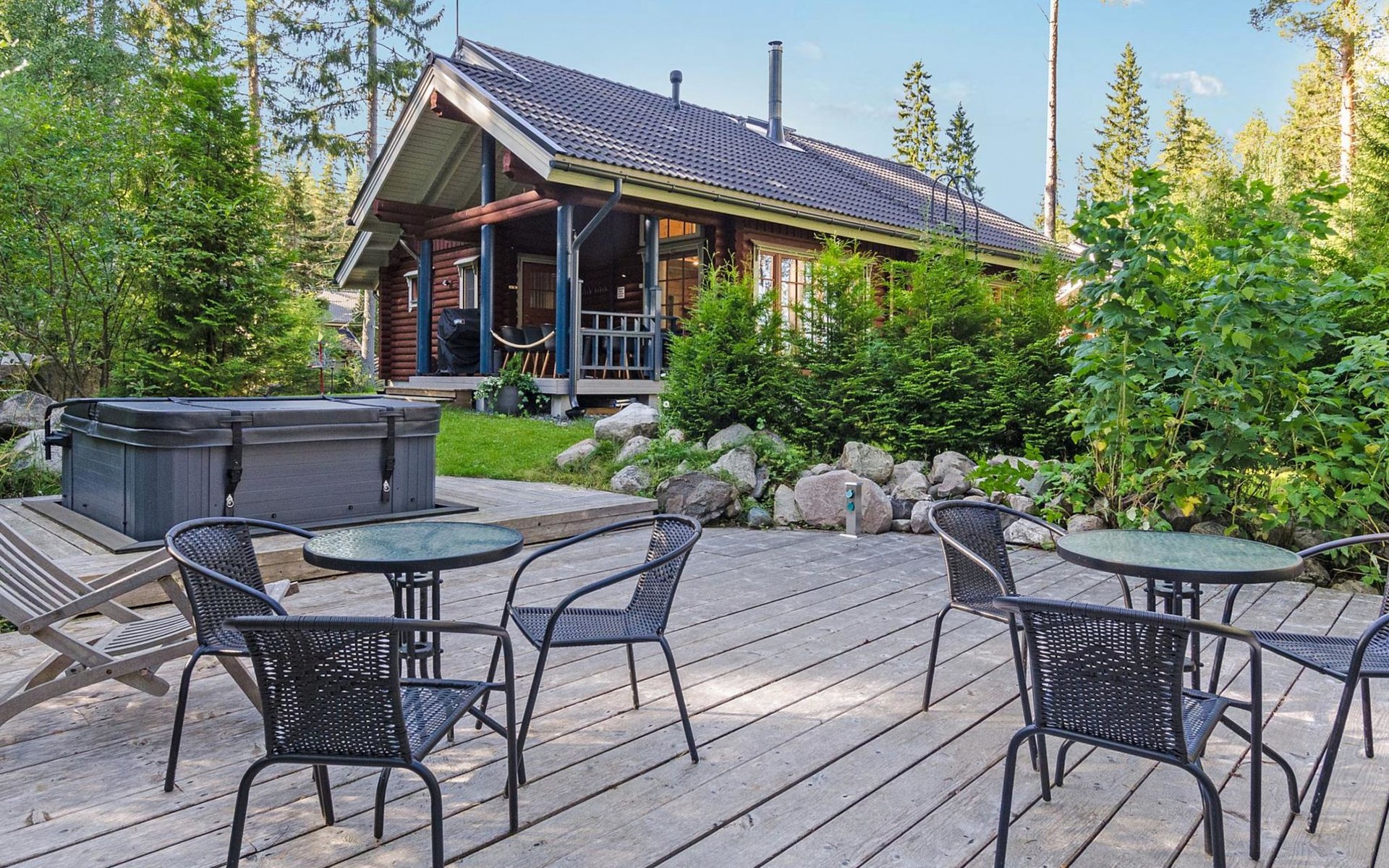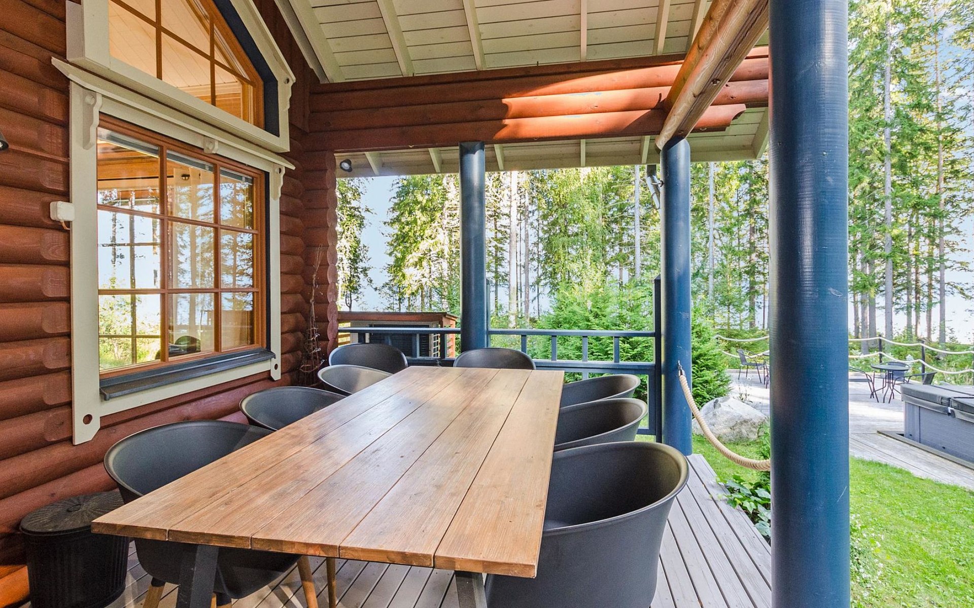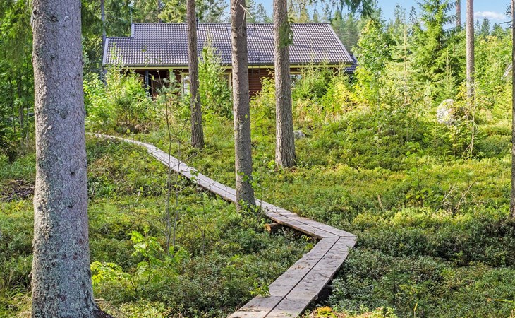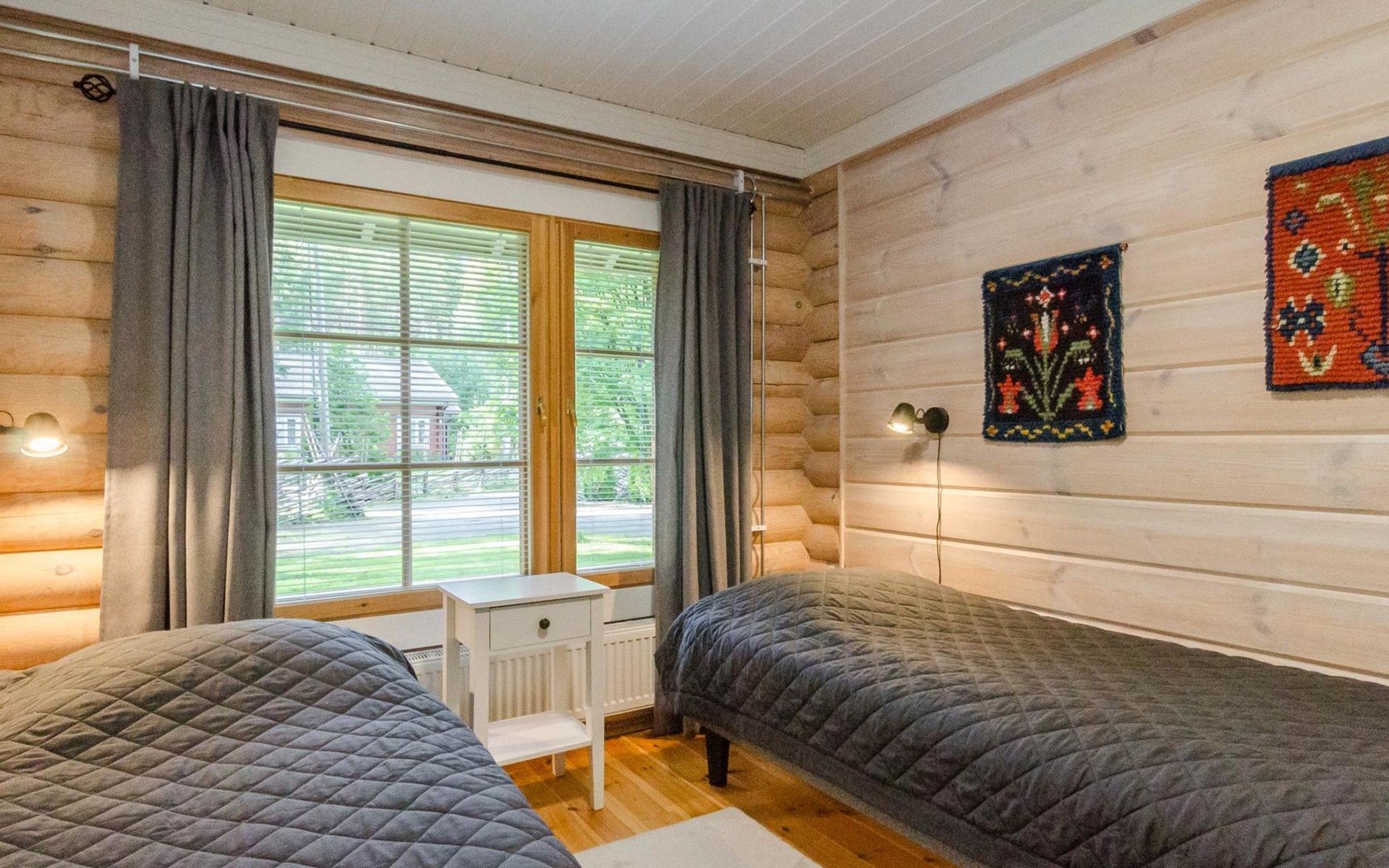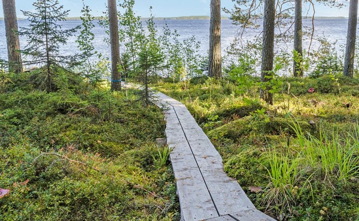 72 km to the north from Joensuu, lake Pielinen 65 m (871.2 km²), own rocky beach, own boat. Boardwalk leading to the lakeside. The log cabin was built in 2005 and completely renovated in 2020. Living room/kitchen, 2 bedrooms on the ground floor, one with double bed and the other with 2 beds. On the upper floor, there is a lounge loft and 2 bedrooms, one with a double bed and the other with 2 beds. Dressing/laundry room, washroom, electric sauna, terrace, and large patio.