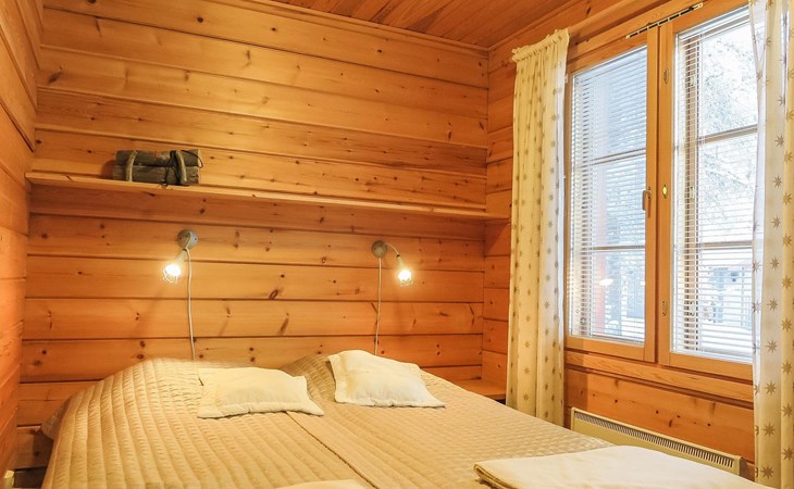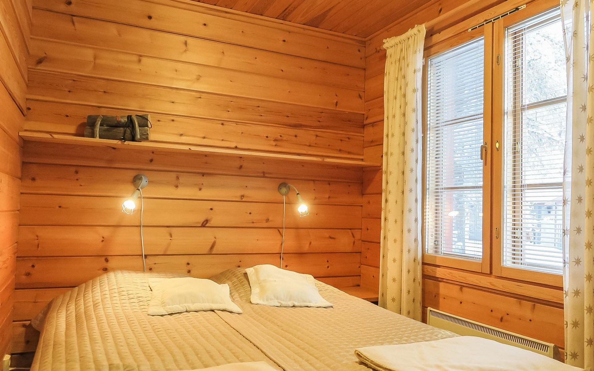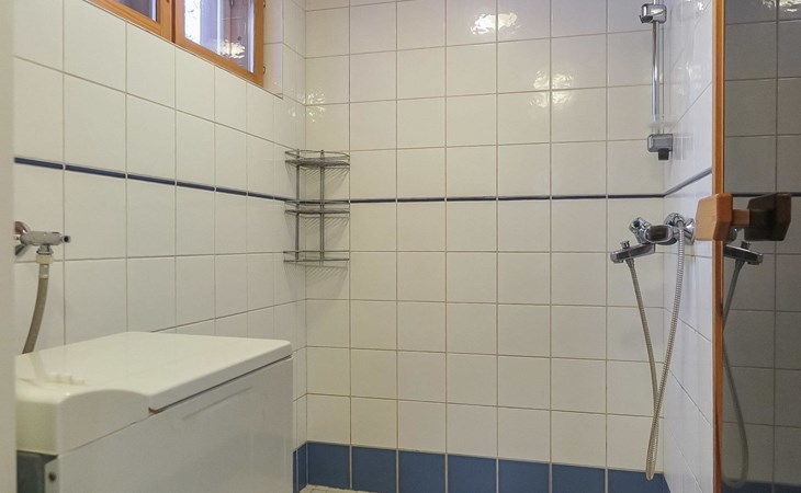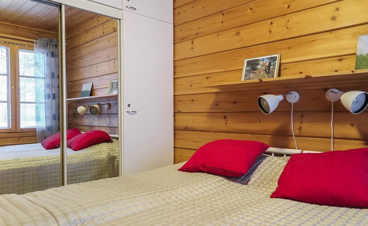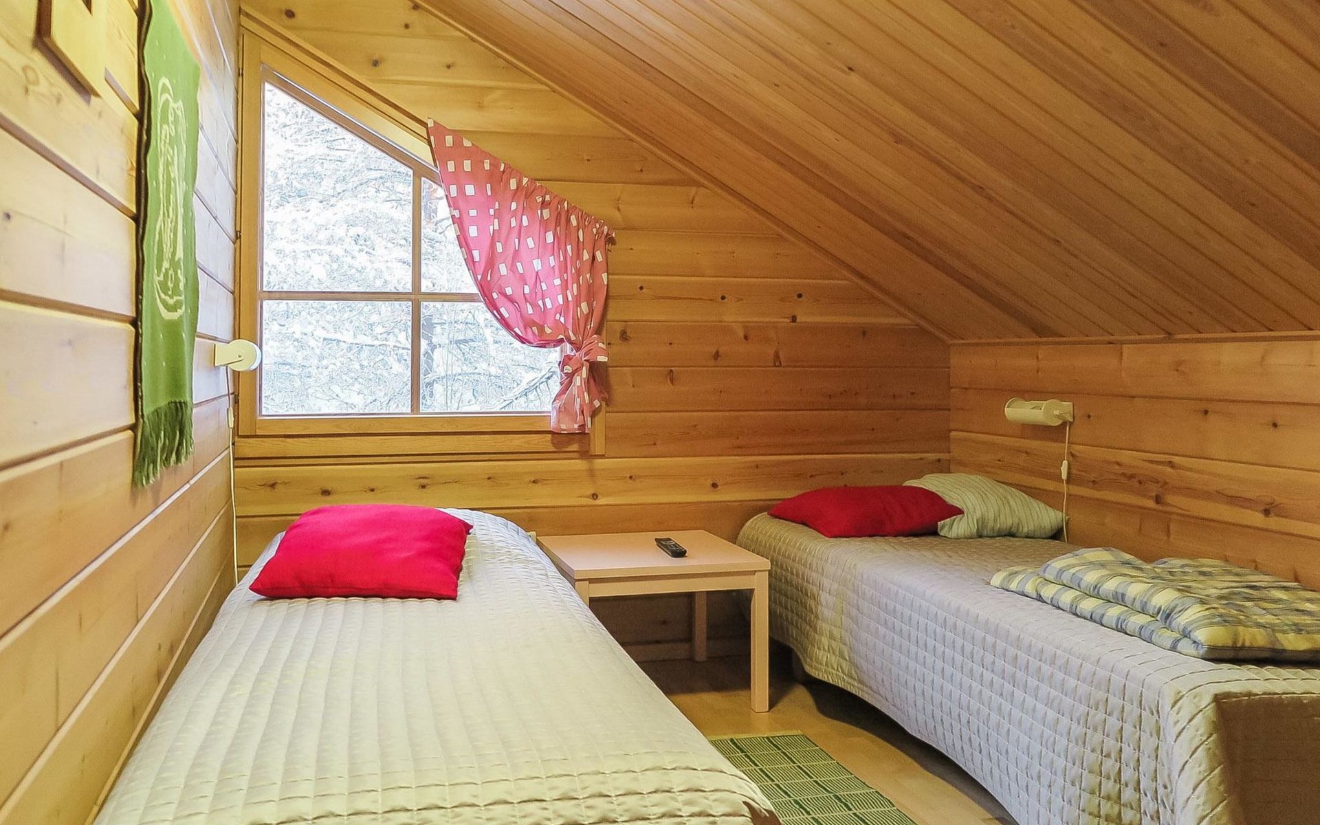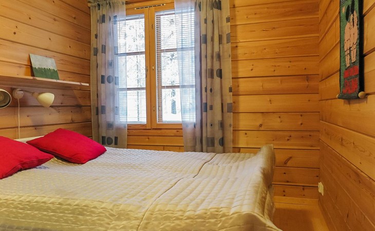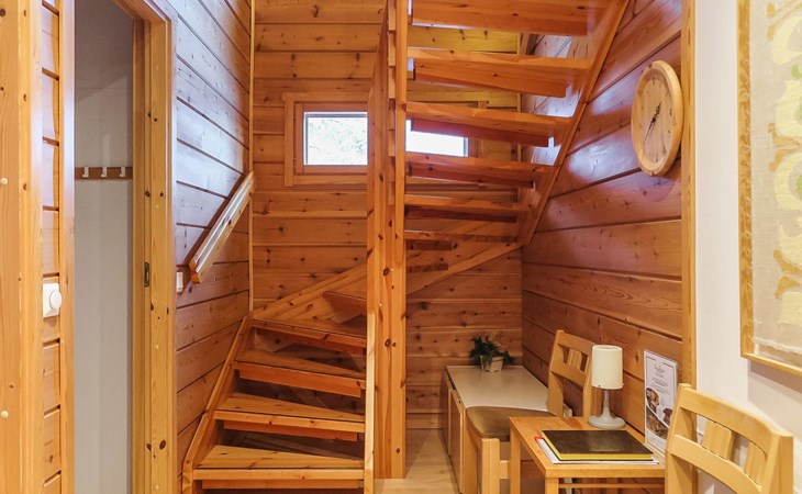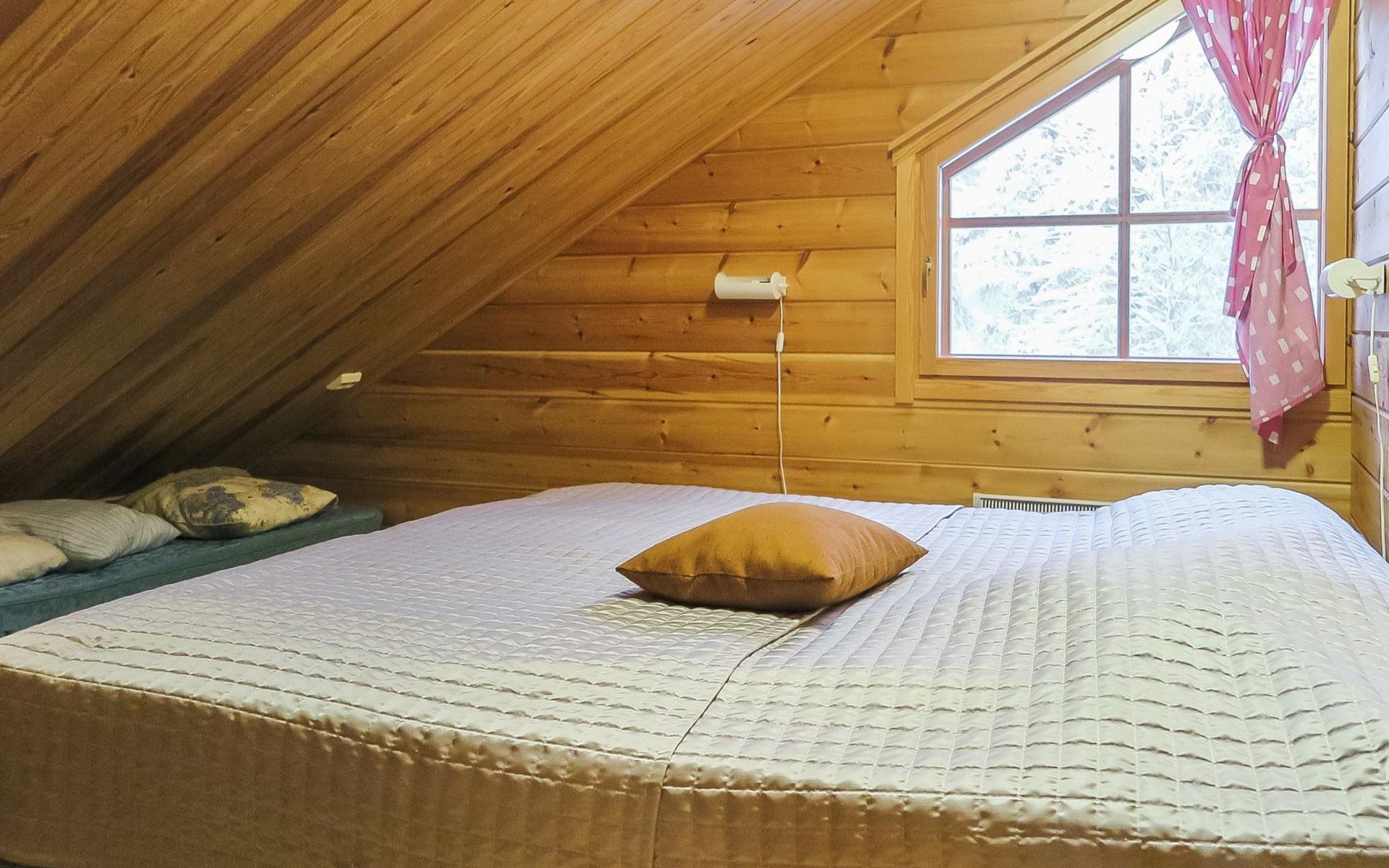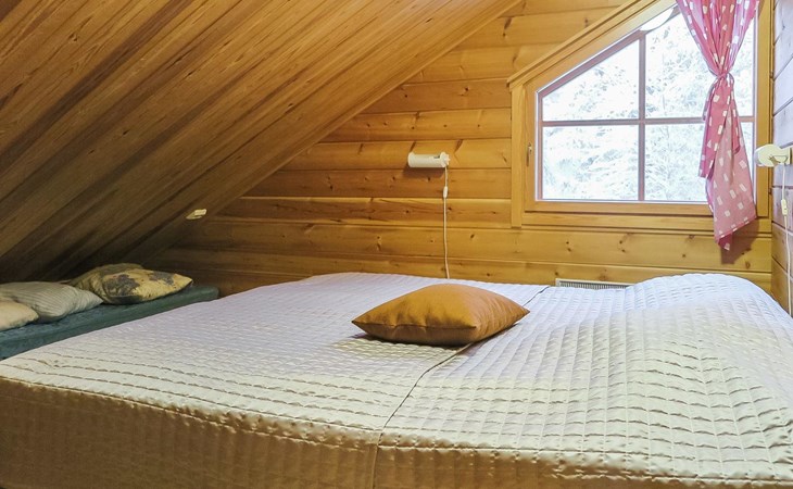 On the ground floor living area/kitchen, 2 bedrooms, each with 2 beds, sauna, washroom, separate WC and a covered porch. On the upper floor there are 2 bedrooms with sloped roofs, each with 2 beds, WC also on the upper floor.