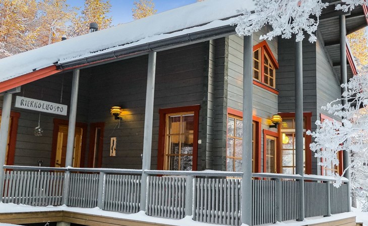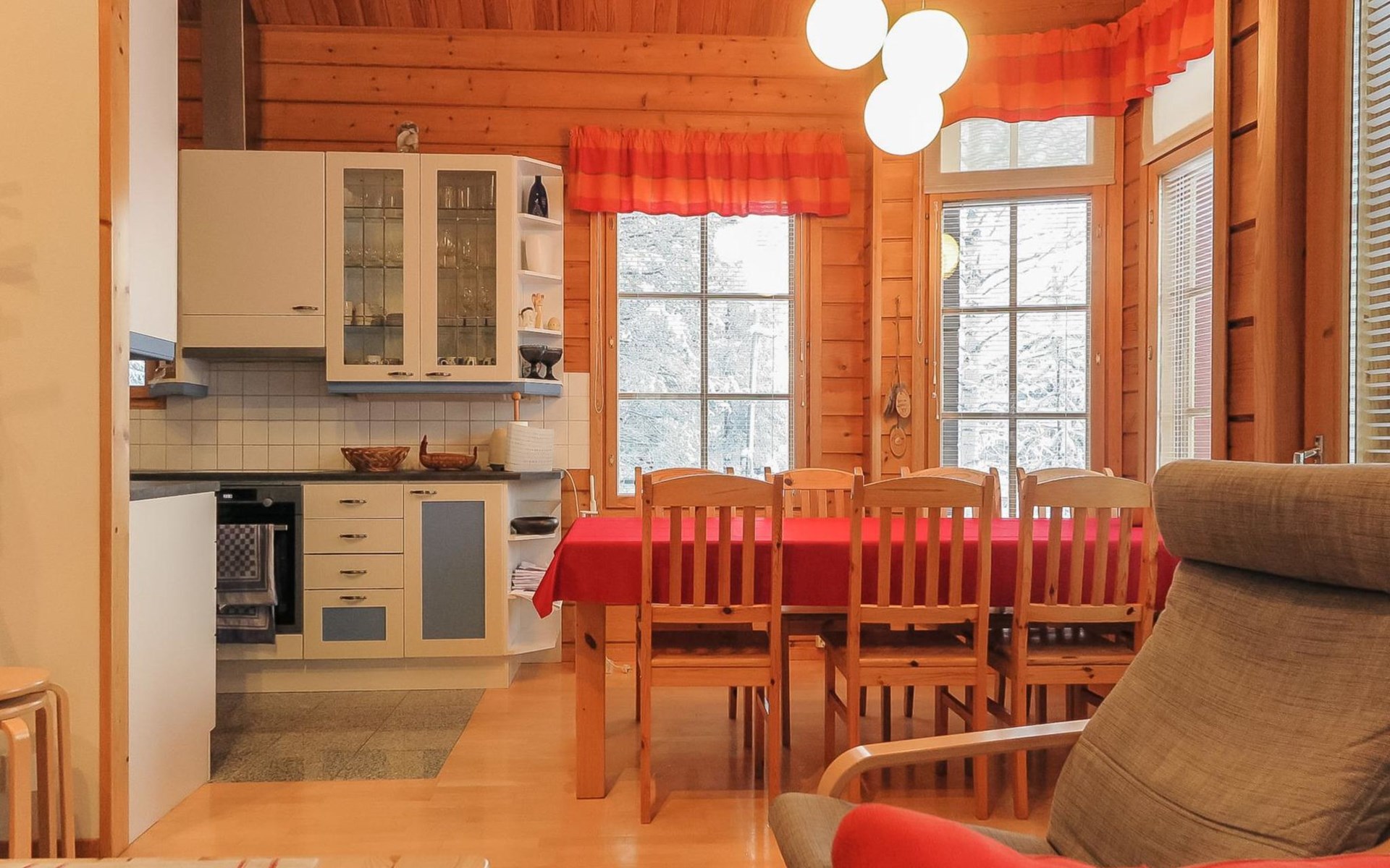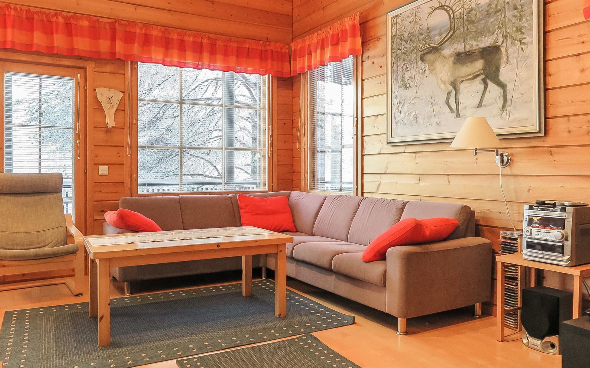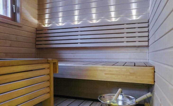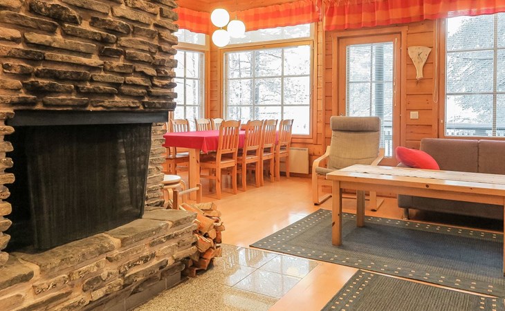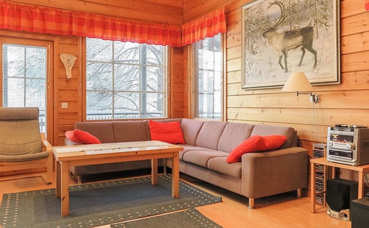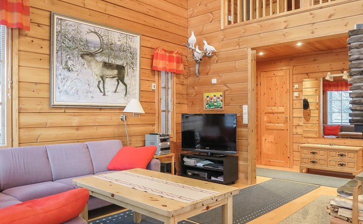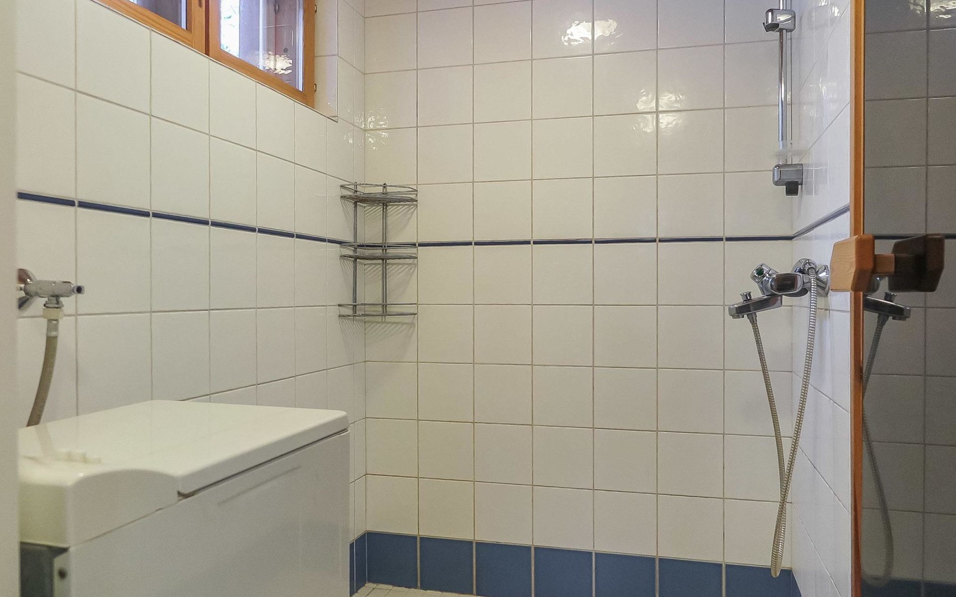 On the ground floor living area/kitchen, 2 bedrooms, each with 2 beds, sauna, washroom, separate WC and a covered porch. On the upper floor there are 2 bedrooms with sloped roofs, each with 2 beds, WC also on the upper floor.