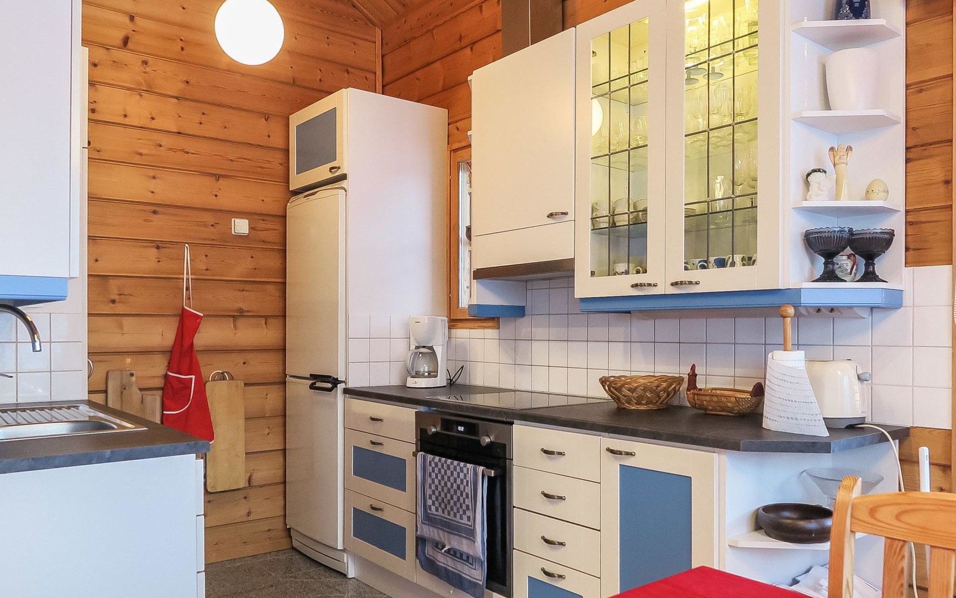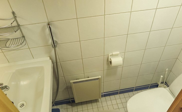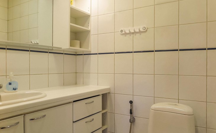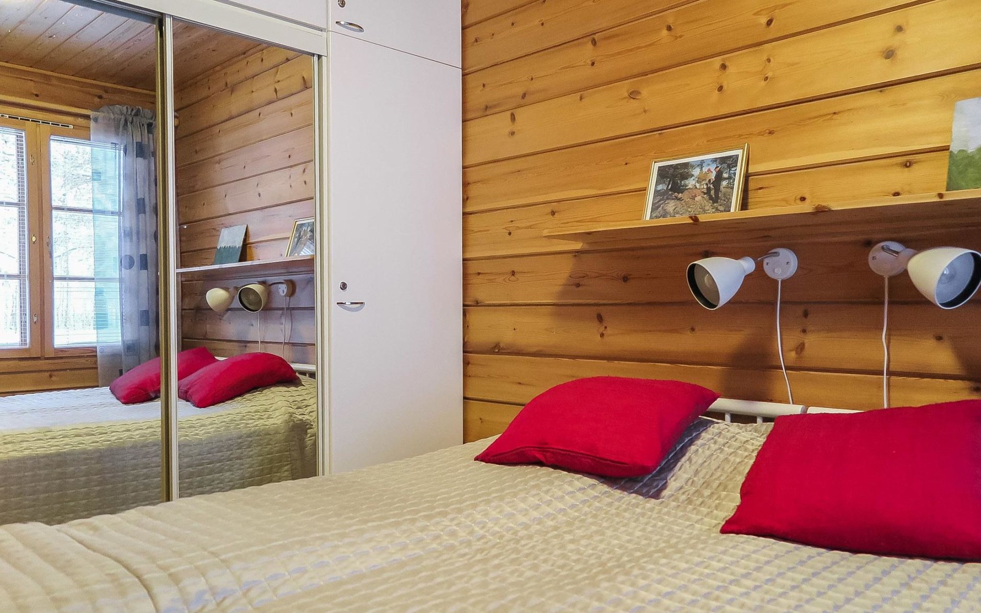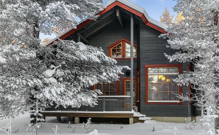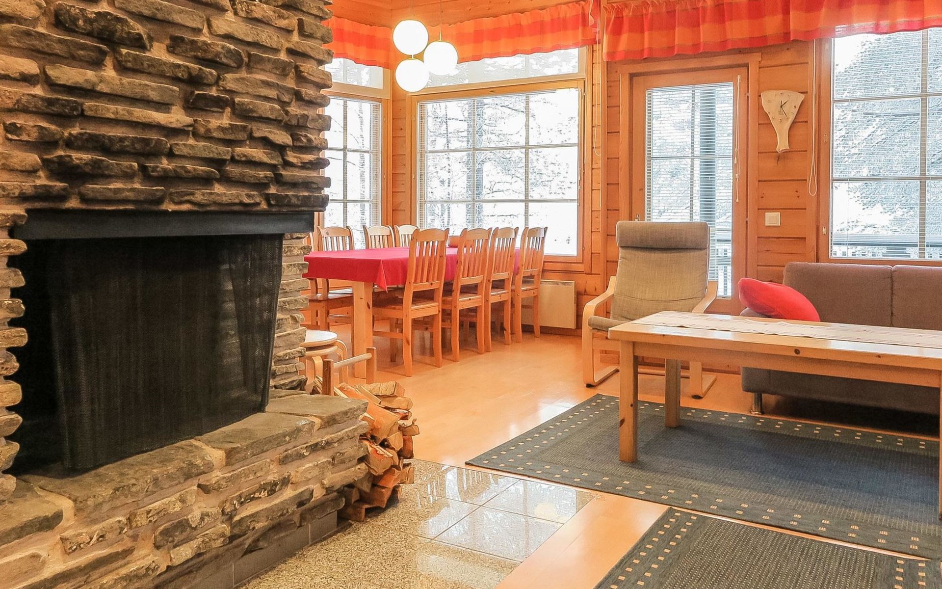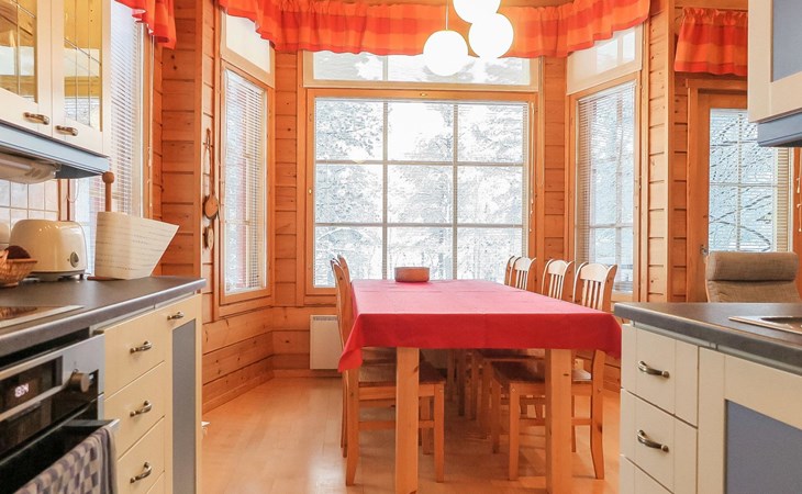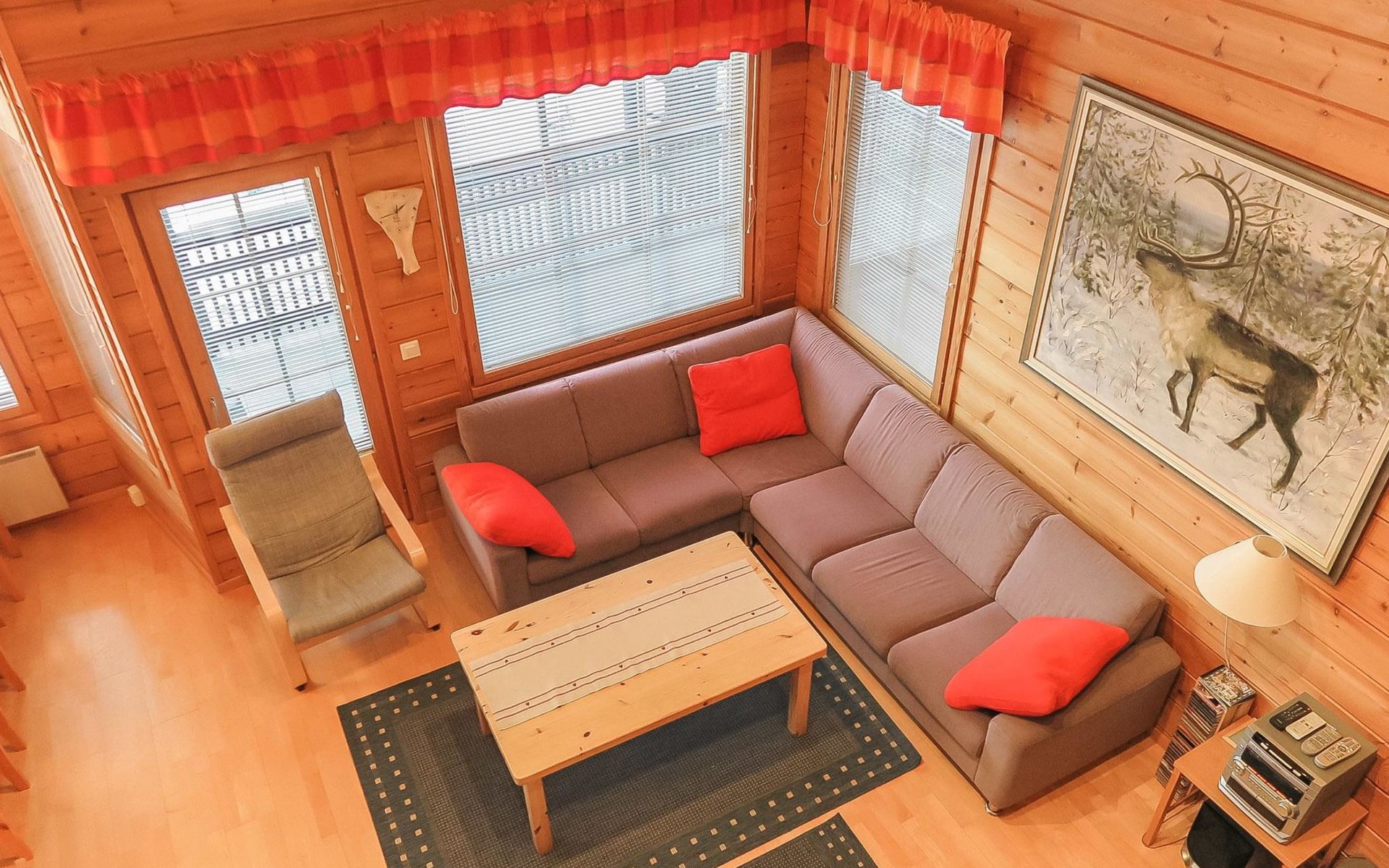 On the ground floor living area/kitchen, 2 bedrooms, each with 2 beds, sauna, washroom, separate WC and a covered porch. On the upper floor there are 2 bedrooms with sloped roofs, each with 2 beds, WC also on the upper floor.