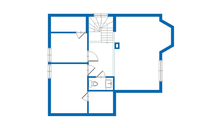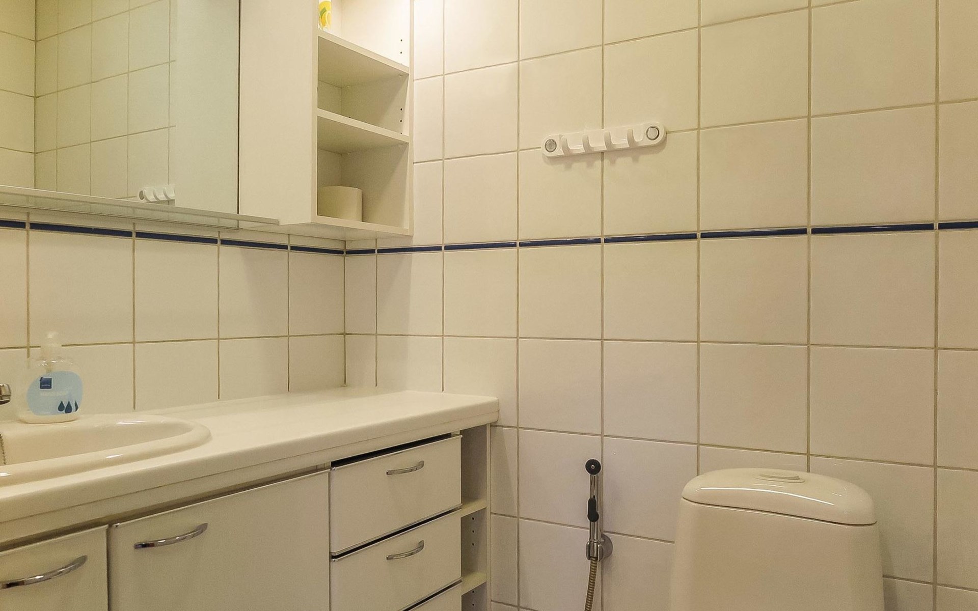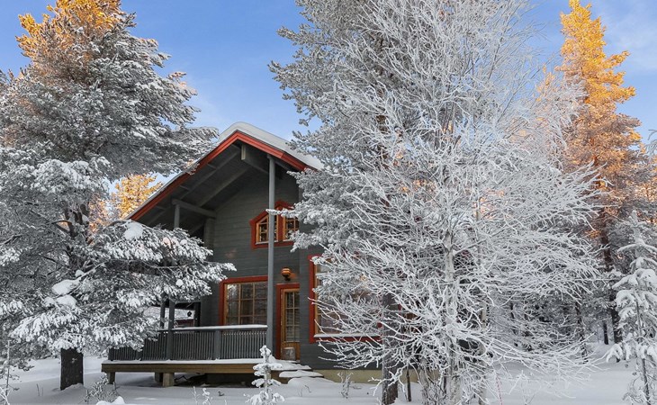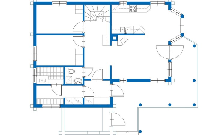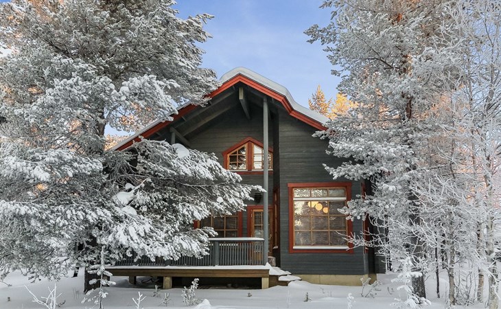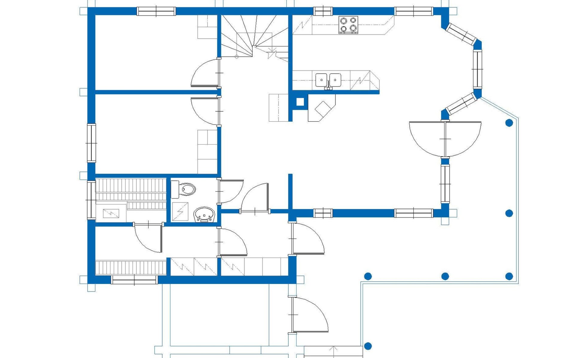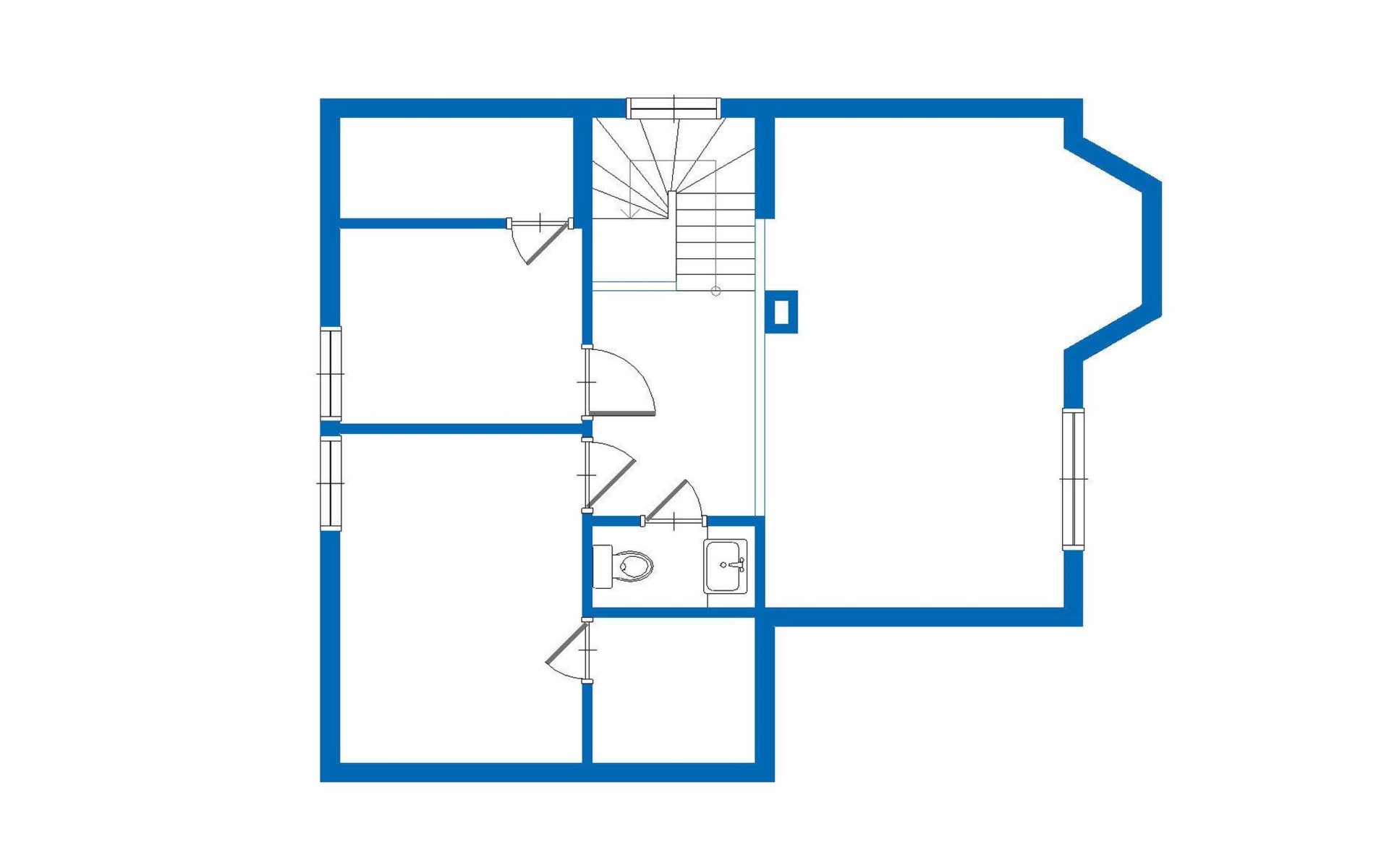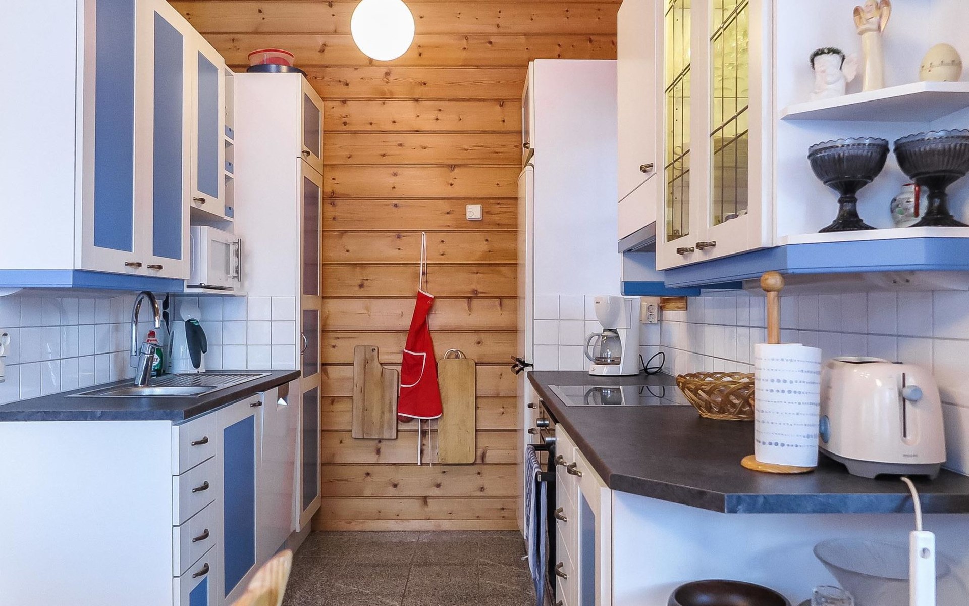 On the ground floor living area/kitchen, 2 bedrooms, each with 2 beds, sauna, washroom, separate WC and a covered porch. On the upper floor there are 2 bedrooms with sloped roofs, each with 2 beds, WC also on the upper floor.