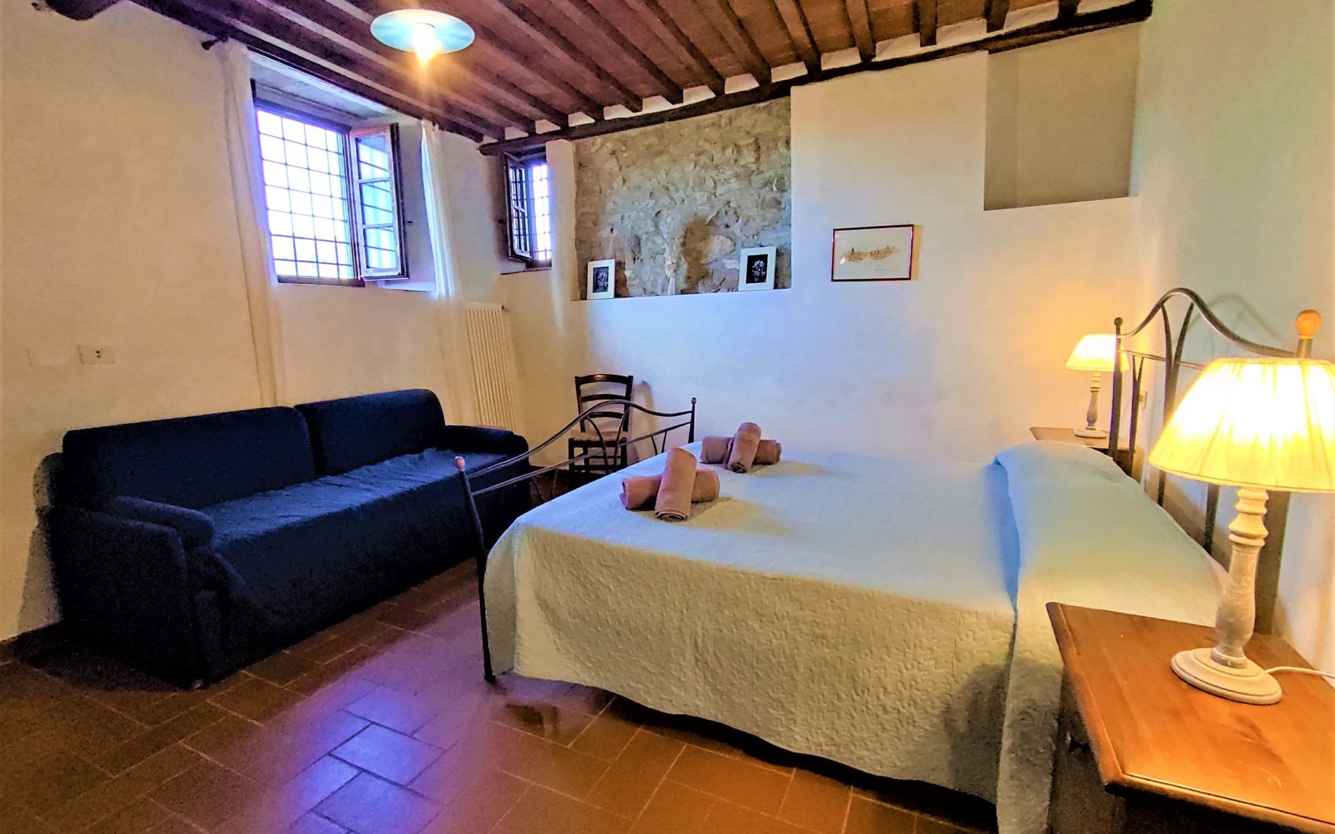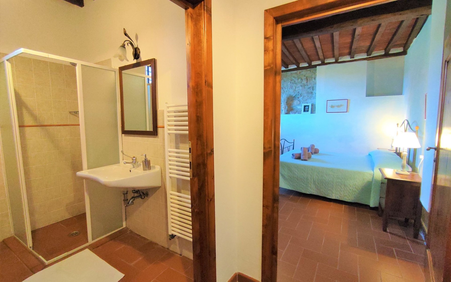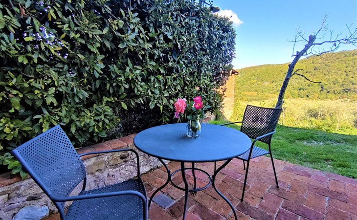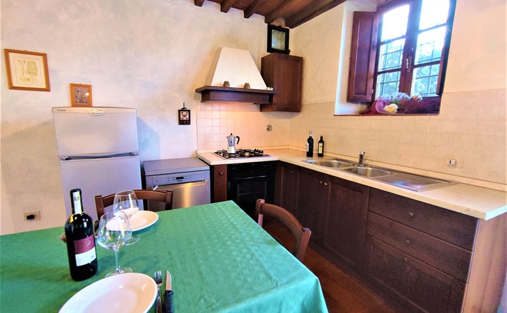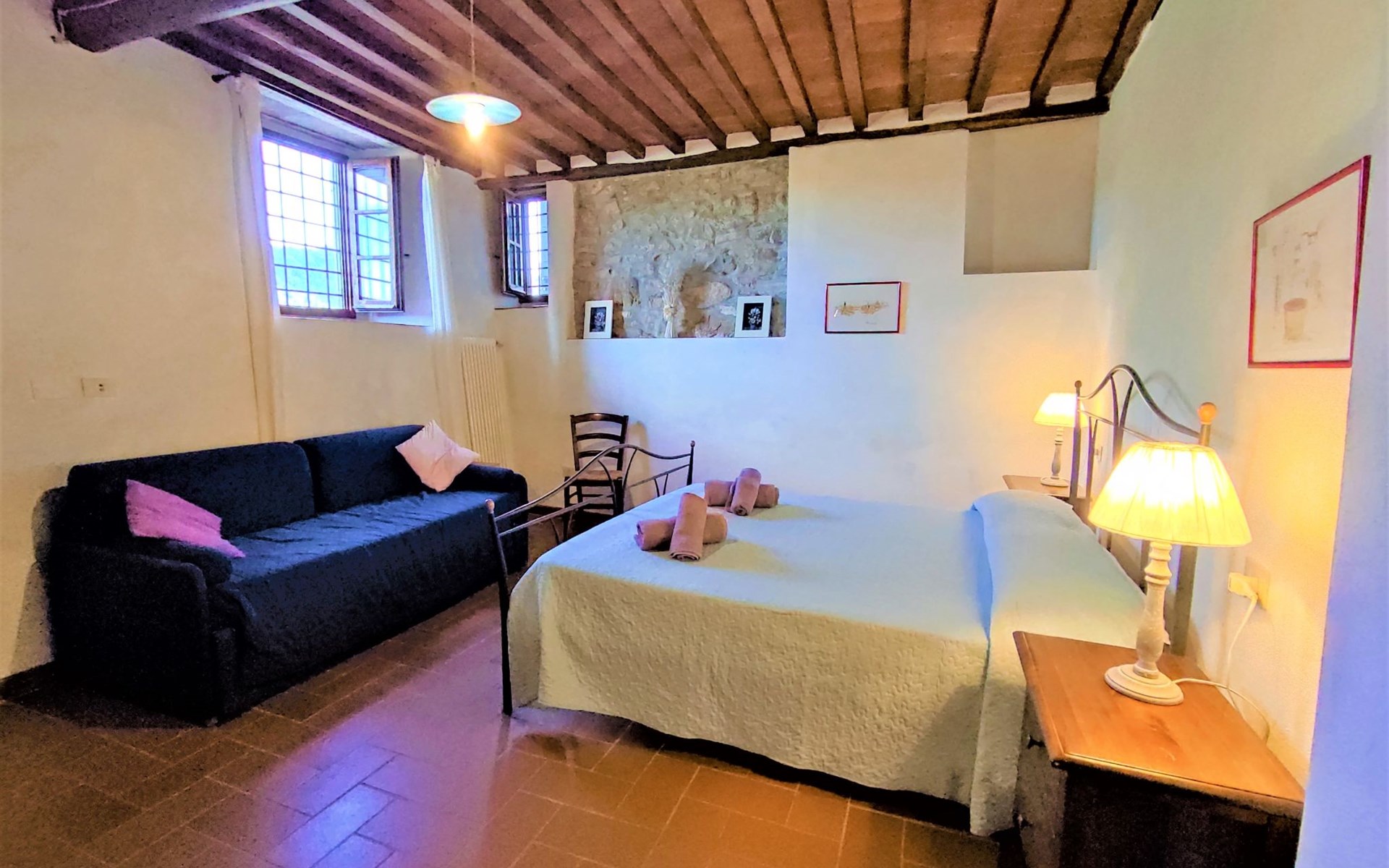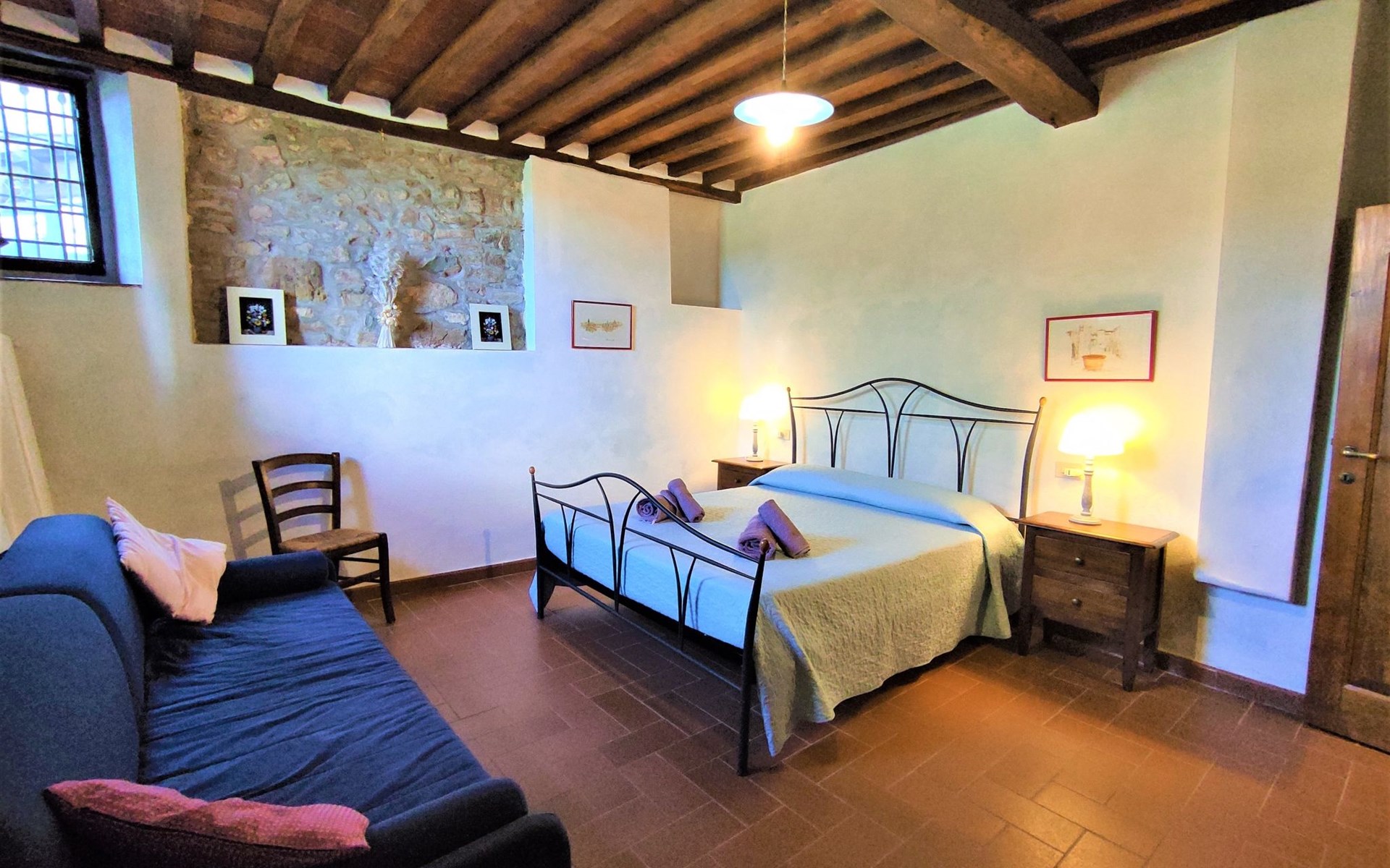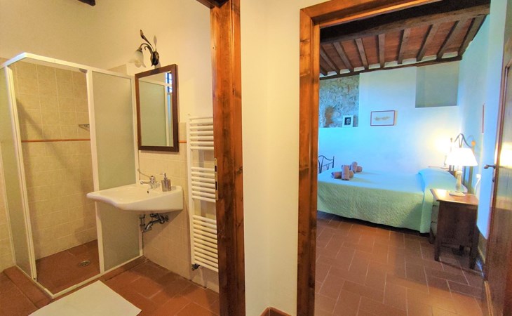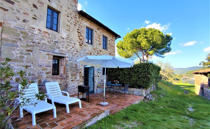 Large, rustic on a vinyard country house "Fattoria l'Ottavo", 400 m a.s.l., from the 18th century, renovated, surrounded by meadows and vineyards. 3 houses in the residence. 9 apartments in the residence. In the district of Lucolena in Chianti 12 km from the centre of Greve in Chianti, 13 m from the centre of Figline Valdarno, in a secluded, sunny, elevated position, in the countryside. For shared use: property 40 ha, natural garden, meadow, swimming pool fenced (8 x 4 m, seasonal availability: 01.May. - 15.Oct. pool opening hours: 08:00-20:00). Outdoor shower, terrace, garden furniture, barbecue, pool maintenance by the owner/gardener. In the house: reception, restaurant, breakfast room, WiFi, washing machine (for shared use). Linen change weekly. Breakfast possible on request (extra). 200 m long narrow motor access to the grounds. Parking on the premises. Shop 700 m, grocery 700 m, supermarket 12 km, shopping centre 13 km, restaurant 1 km, bar 700 m, bakery 700 m, bicycle rental 12 km, bus stop "Lucolena" 700 m, railway station "Figline Valdarno" 13 km, sandy beach "Calambrone" 110 km, indoor swimming pool 13 km, lake Trasimeno 114 km. Golf course (18 hole) 20 km, tennis 12 km, riding stable 2 km, walking paths from the house 100 m. Nearby attractions: Firenze 37 km, Siena 50 km, Arezzo 54 km, San Gimignano 65 km. Please note: car recommended. Reception open 10:00-17:00 hrs. Suitable for families, baby equipment (included). Suitable for events. Local sale of farm products. Please note: the owner lives on the same property. All houses/apartments are individually designed/furnished.