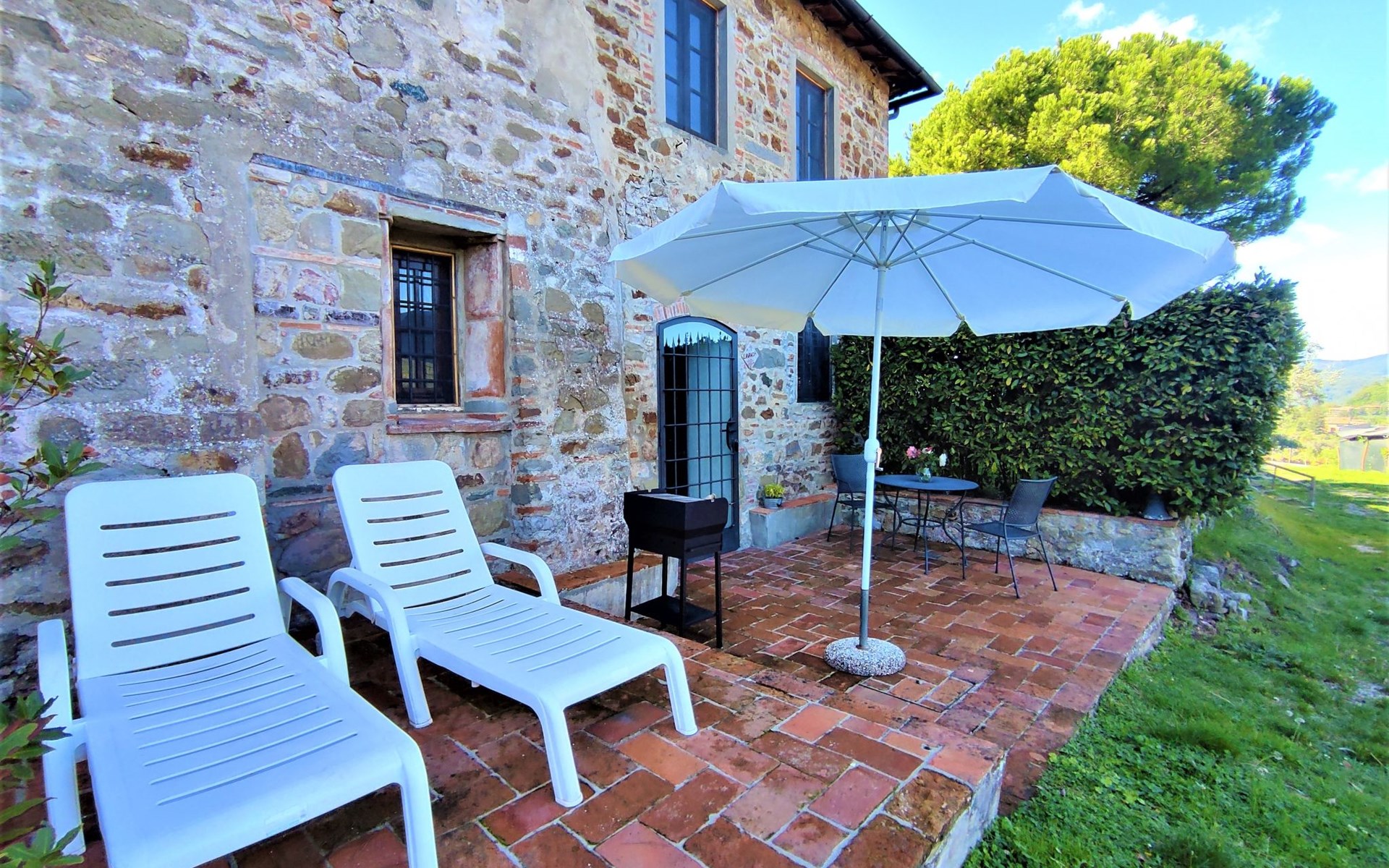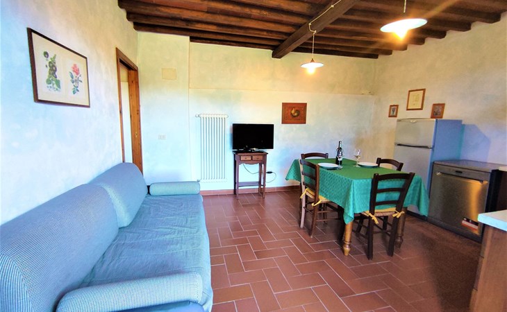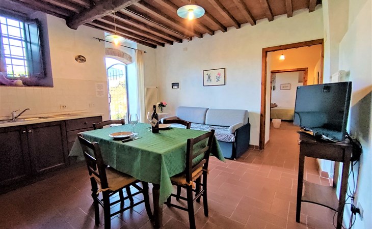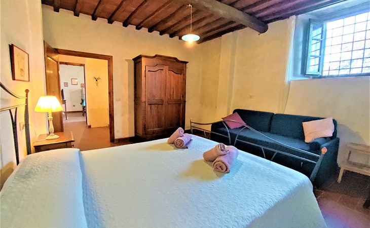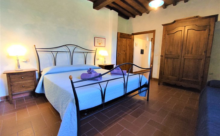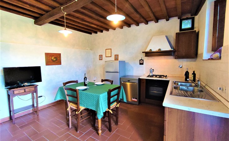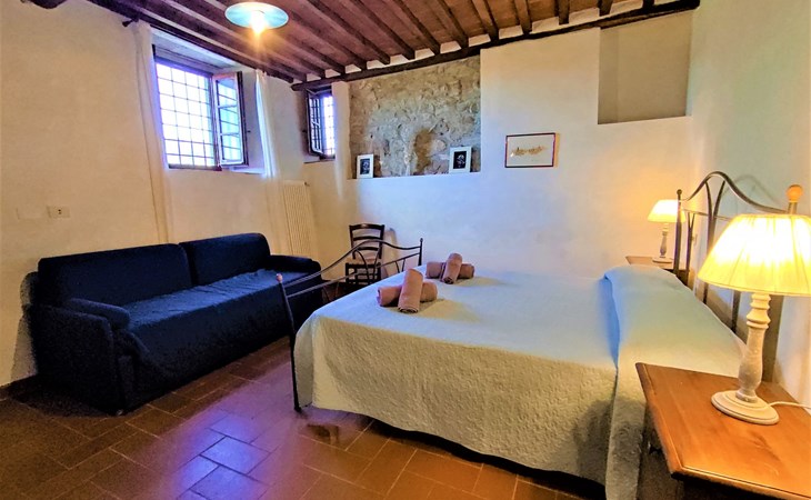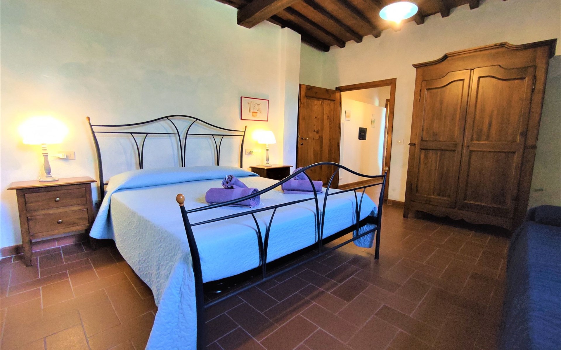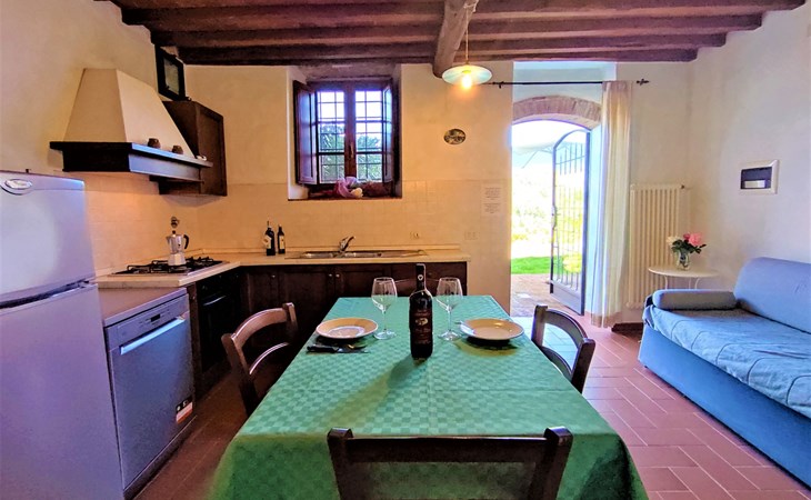Large, rustic on a vinyard country house "Fattoria l'Ottavo", 400 m a.s.l., from the 18th century, renovated, surrounded by meadows and vineyards. 3 houses in the residence. 9 apartments in the residence. In the district of Lucolena in Chianti 12 km from the centre of Greve in Chianti, 13 m from the centre of Figline Valdarno, in a secluded, sunny, elevated position, in the countryside. For shared use: property 40 ha, natural garden, meadow, swimming pool fenced (8 x 4 m, seasonal availability: 01.May. - 15.Oct. pool opening hours: 08:00-20:00). Outdoor shower, terrace, garden furniture, barbecue, pool maintenance by the owner/gardener. In the house: reception, restaurant, breakfast room, WiFi, washing machine (for shared use). Linen change weekly. Breakfast possible on request (extra). 200 m long narrow motor access to the grounds. Parking on the premises. Shop 700 m, grocery 700 m, supermarket 12 km, shopping centre 13 km, restaurant 1 km, bar 700 m, bakery 700 m, bicycle rental 12 km, bus stop "Lucolena" 700 m, railway station "Figline Valdarno" 13 km, sandy beach "Calambrone" 110 km, indoor swimming pool 13 km, lake Trasimeno 114 km. Golf course (18 hole) 20 km, tennis 12 km, riding stable 2 km, walking paths from the house 100 m. Nearby attractions: Firenze 37 km, Siena 50 km, Arezzo 54 km, San Gimignano 65 km. Please note: car recommended. Reception open 10:00-17:00 hrs. Suitable for families, baby equipment (included). Suitable for events. Local sale of farm products. Please note: the owner lives on the same property. All houses/apartments are individually designed/furnished.