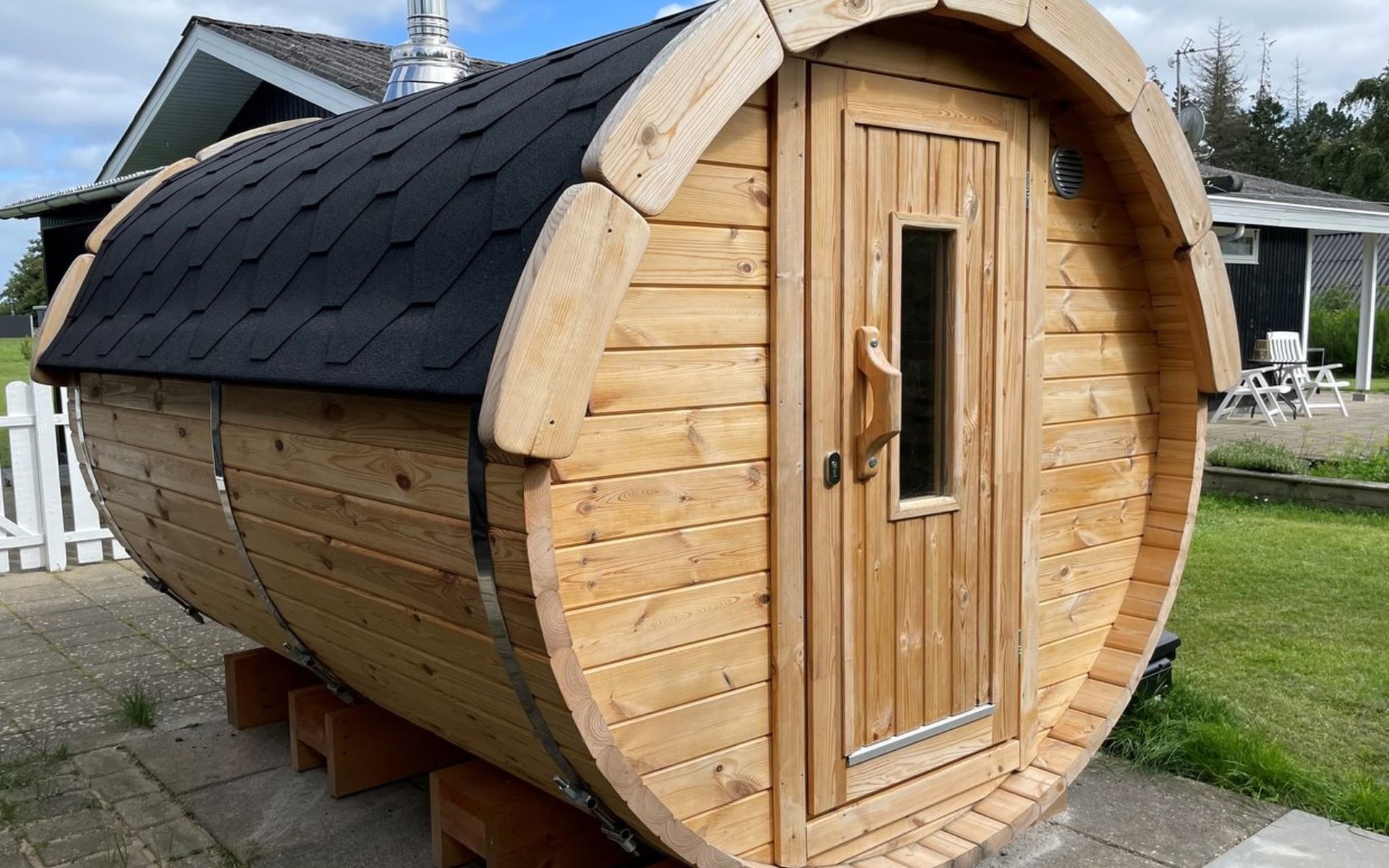 Single-family house, built in 1980. 300 m from the sea. Private: natural state property 1'228 m2. Outdoor shower, barbecue, children's playground (swing). In the house: trampoline, washing machine, tumble dryer. Parking at the house. Grocery 6 km.