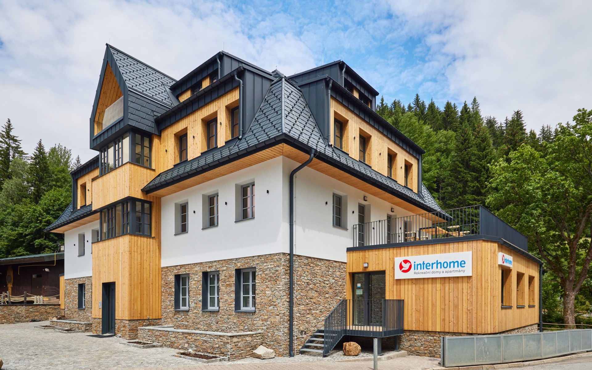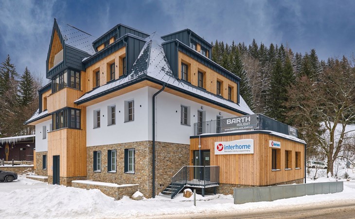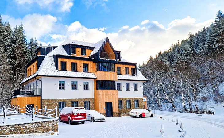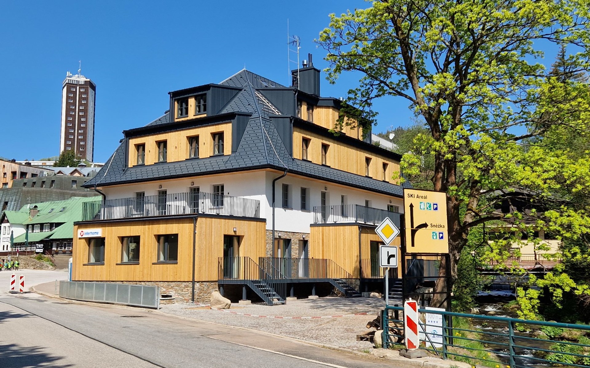 Modern, luxurious residence "Máj", 3 storeys, detached, renovated in 2023. In the centre of Pec pod Sněžkou, 100 m from the edge of the forest, 1.3 km from the skiing area, 10 m from the river. In the house: storage room for skis, central heating system. Parking at the house. Shop, grocery 200 m, restaurant 60 m, bar 100 m, café, bicycle rental 500 m, pub garden 60 m, bus stop "Pec pod Sněžkou" 300 m, indoor swimming pool 500 m. Sports centre 500 m, walking paths from the house 20 m, cycle lane, ski lift 1.3 km, chair lift 1.3 km, skisport facilities 1.3 km, ski rental 60 m, ski bus stop 200 m, ski school 1.3 km, children's ski school 1.3 km, cross country ski track 150 m, children's playground 400 m. Nearby attractions: Relaxpark, bobová dráha 400 m, Sněžka (lanovka) 1.2 km, Obří důl, Modrý důl, vodopády 3 km, Malá Úpa 8 km, Janské Lázně 15 km, Vrchlabí, Trutnov 30 km. Well-known ski regions can easily be reached: Pec pod Sněžkou – Černá Hora 1.3 km, Velká Úpa 2.5 km, Janské Lázně 15 km. Well-known lakes can easily be reached: Dolce 25 km. Hiking paths: Krkonošský národní park. Groups of teenagers on request only.