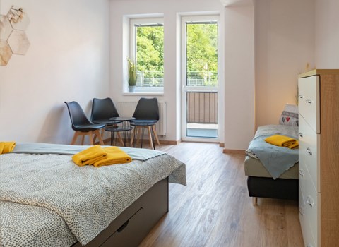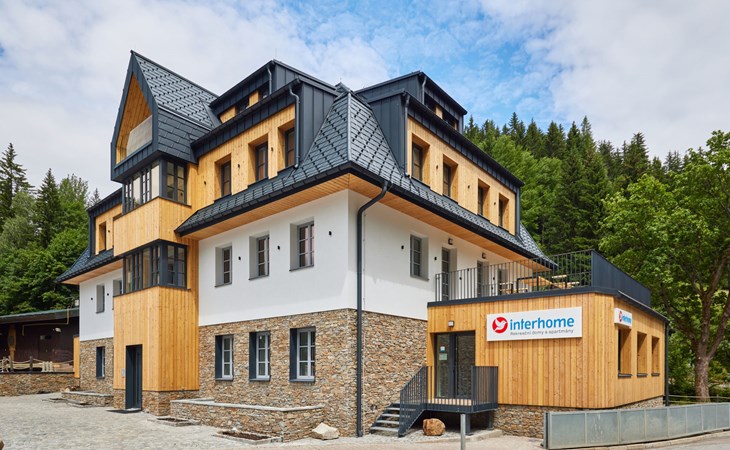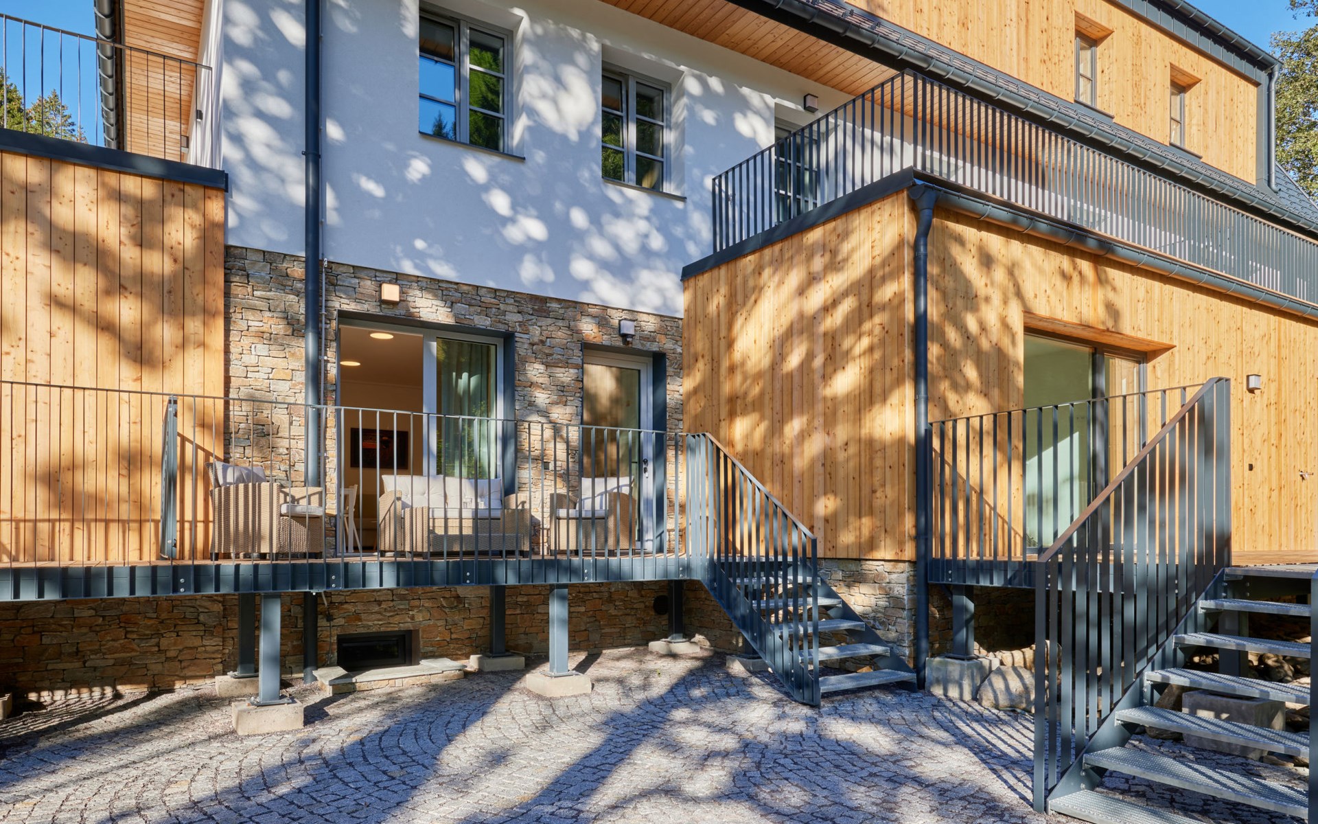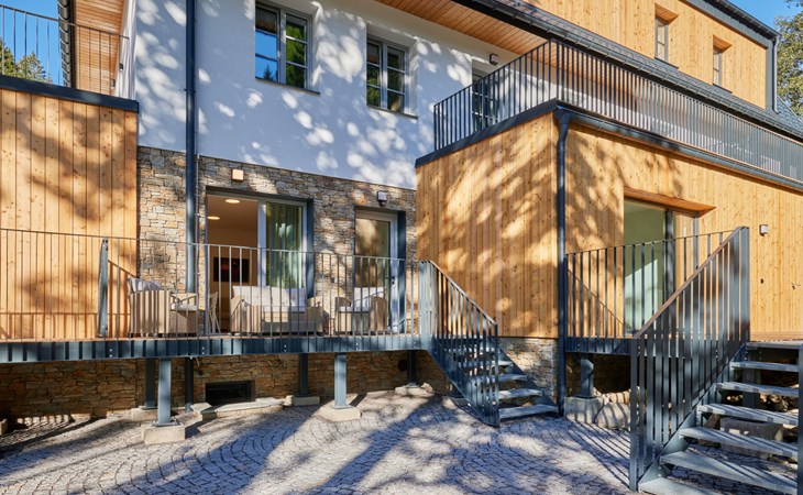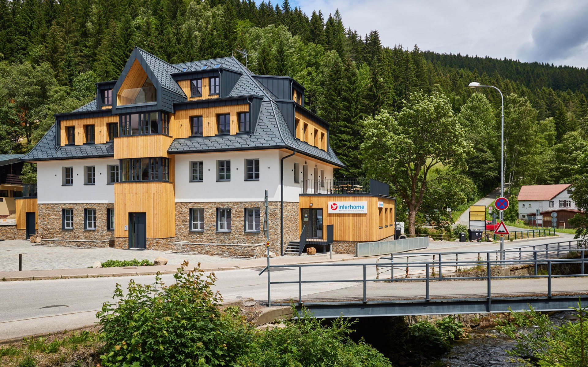 Modern, luxurious residence "Máj", 3 storeys, detached, renovated in 2023. In the centre of Pec pod Sněžkou, 100 m from the edge of the forest, 1.3 km from the skiing area, 10 m from the river. In the house: storage room for skis, central heating system. Parking at the house. Shop, grocery 200 m, restaurant 60 m, bar 100 m, café, bicycle rental 500 m, pub garden 60 m, bus stop "Pec pod Sněžkou" 300 m, indoor swimming pool 500 m. Sports centre 500 m, walking paths from the house 20 m, cycle lane, ski lift 1.3 km, chair lift 1.3 km, skisport facilities 1.3 km, ski rental 60 m, ski bus stop 200 m, ski school 1.3 km, children's ski school 1.3 km, cross country ski track 150 m, children's playground 400 m. Nearby attractions: Relaxpark, bobová dráha 400 m, Sněžka (lanovka) 1.2 km, Obří důl, Modrý důl, vodopády 3 km, Malá Úpa 8 km, Janské Lázně 15 km, Vrchlabí, Trutnov 30 km. Well-known ski regions can easily be reached: Pec pod Sněžkou – Černá Hora 1.3 km, Velká Úpa 2.5 km, Janské Lázně 15 km. Well-known lakes can easily be reached: Dolce 25 km. Hiking paths: Krkonošský národní park. Groups of teenagers on request only.