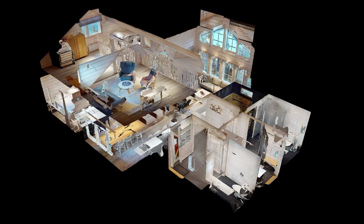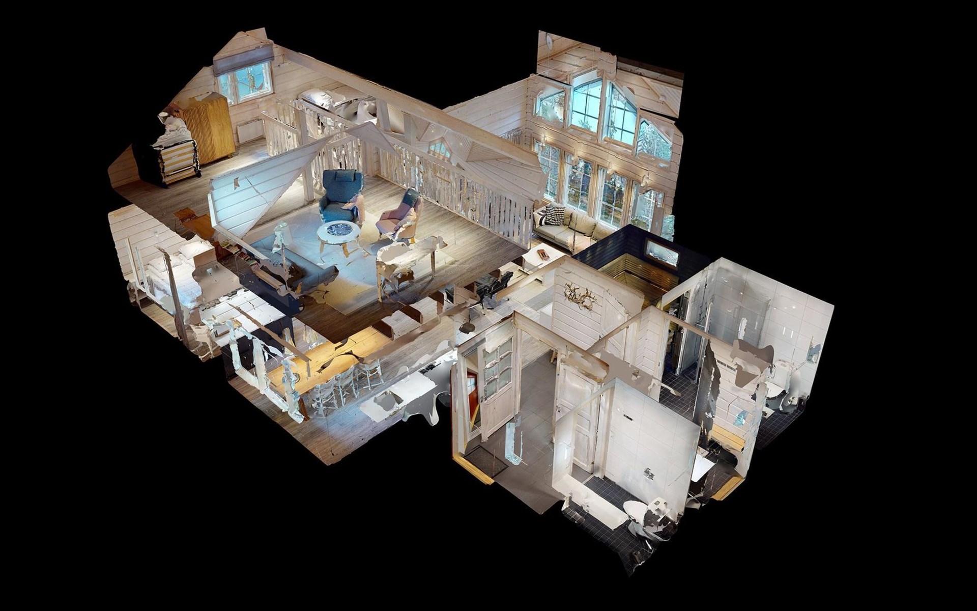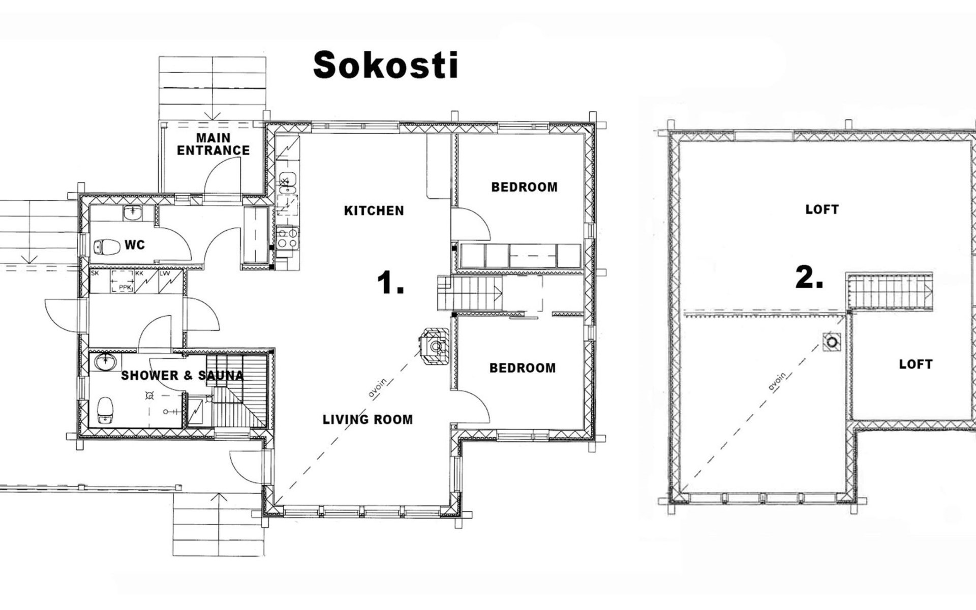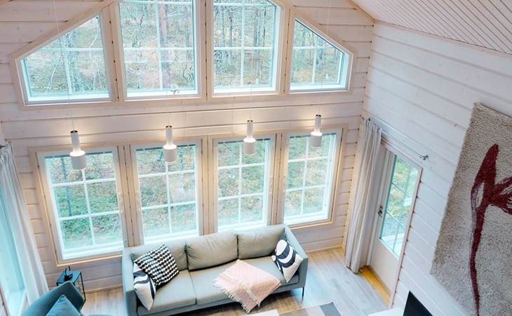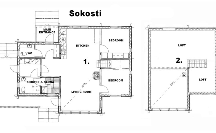 The cottage has a living room with an open kitchen, 2 bedrooms, loft-like upper floor is standing height approx. 2 meters wide.