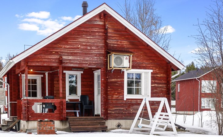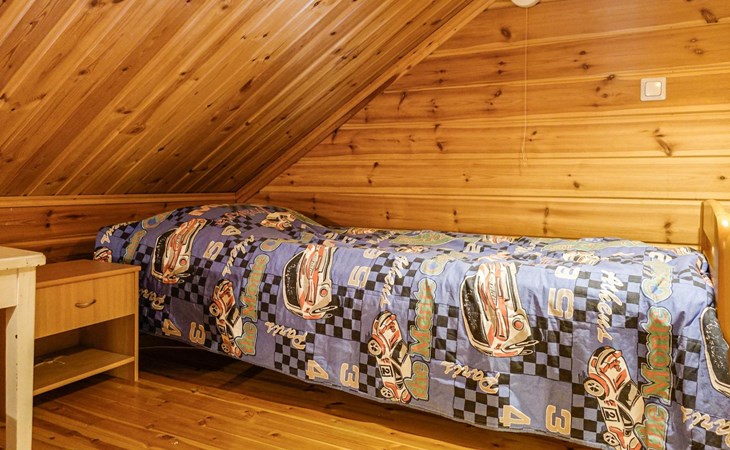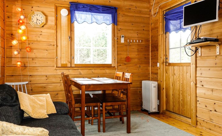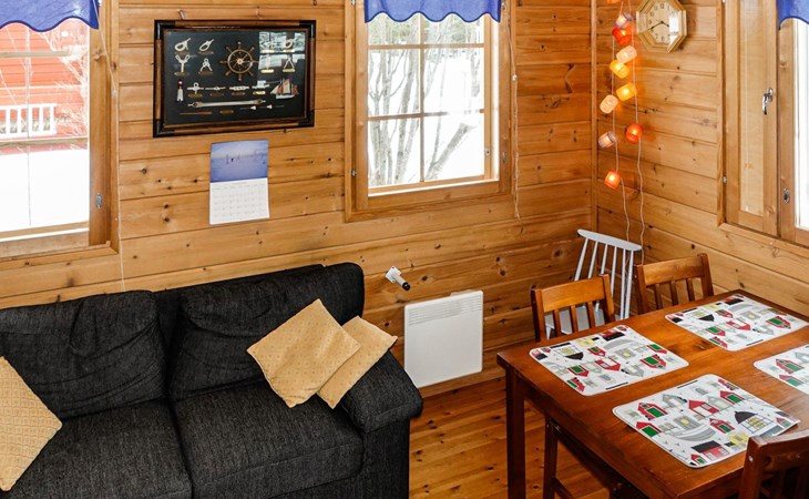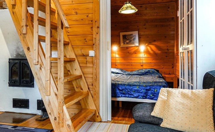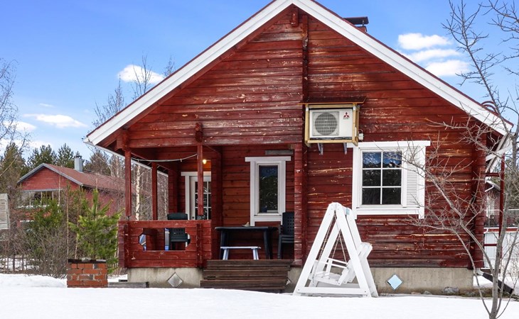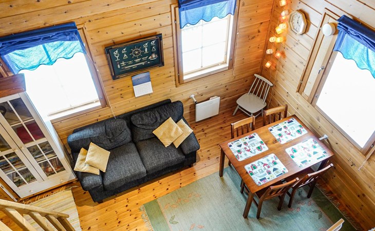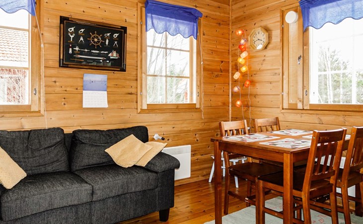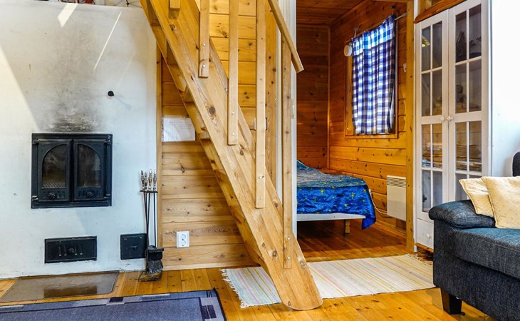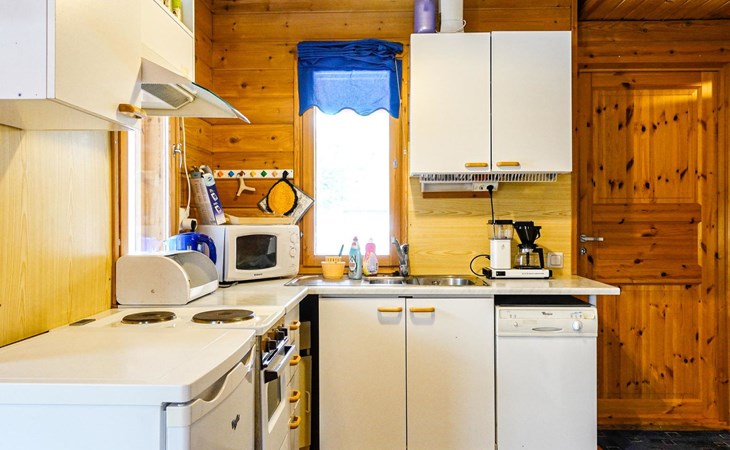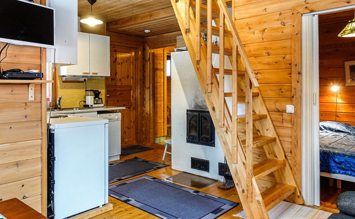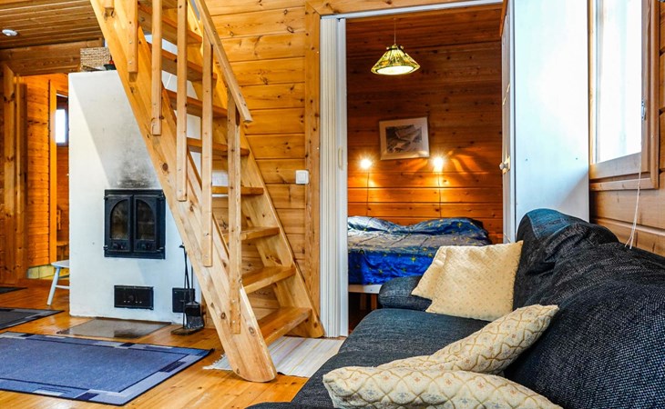 Log/panel cottage 2004, living room/kitchen, alcove 2 beds, low sleeping loft 2 beds, open porch (9 m²), washroom, sauna (electric stove).