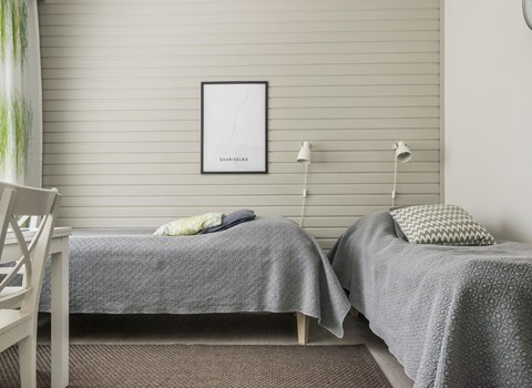 On the ground floor kitchen, bedroom with two beds 80*200 cm, sauna (electric sauna stove), washroom and open porch. In addition, sleeping loft (steep stairs), with 2 box springs, 80*200 cm. No child gate.