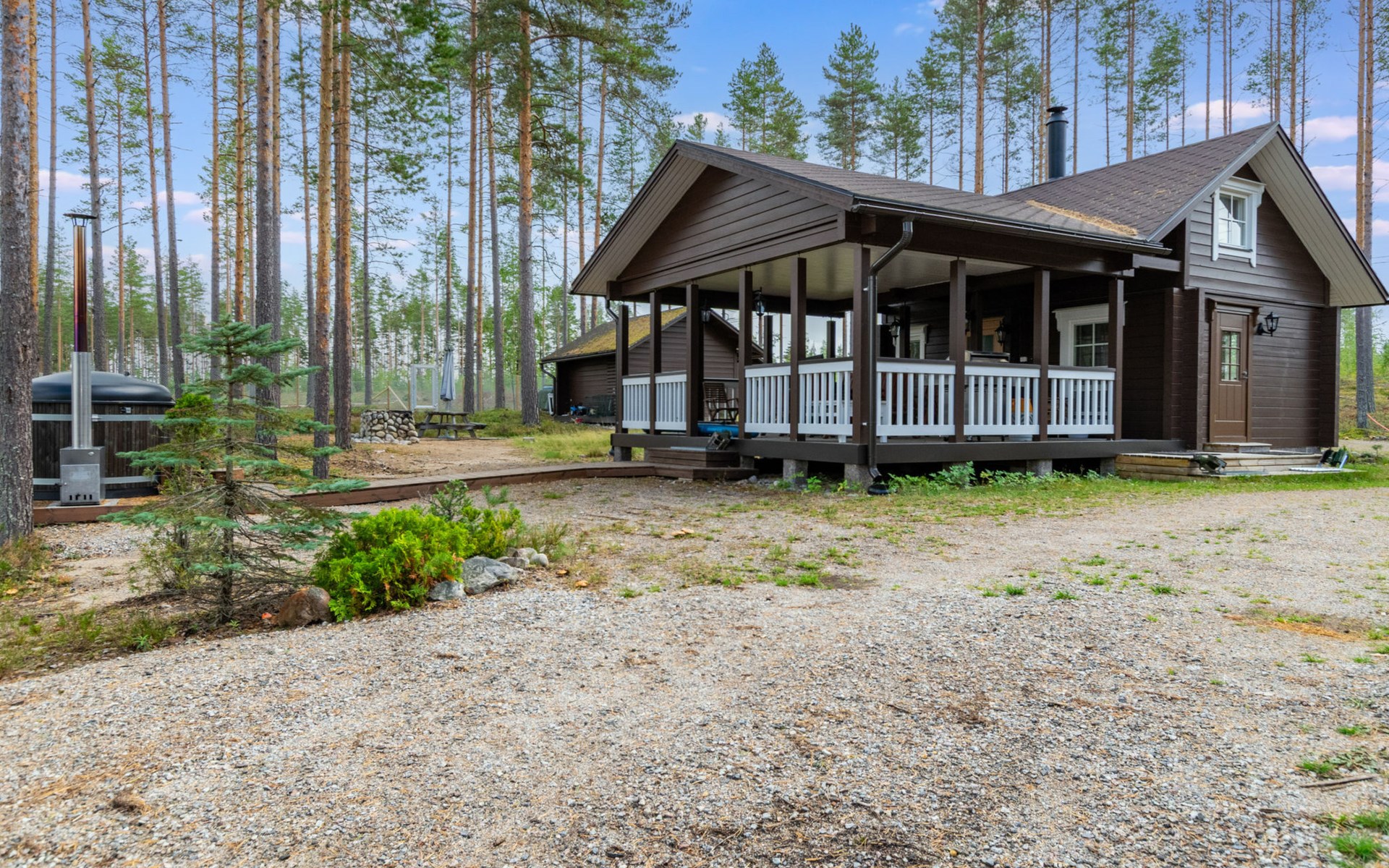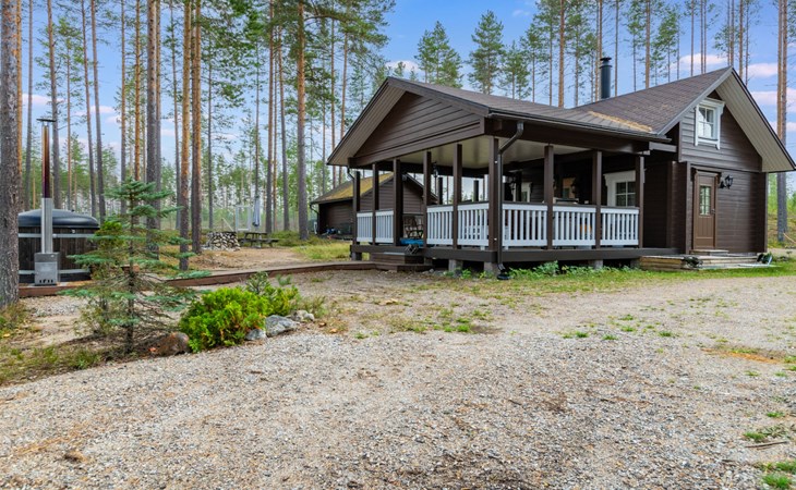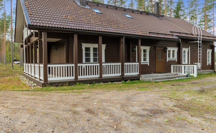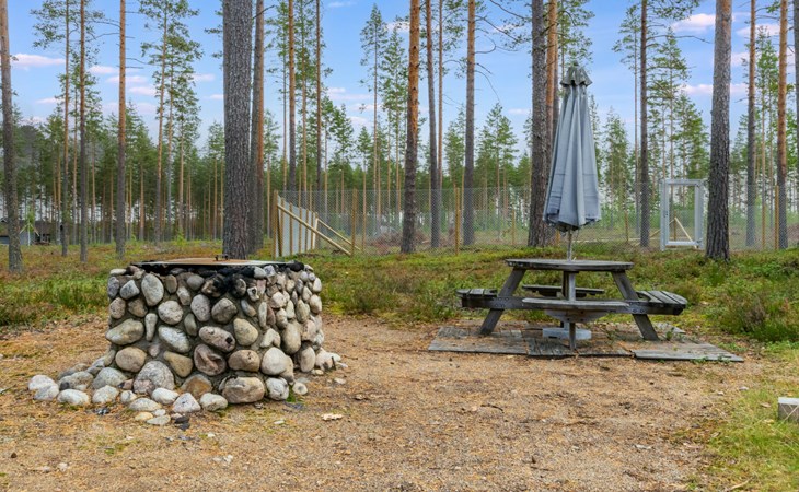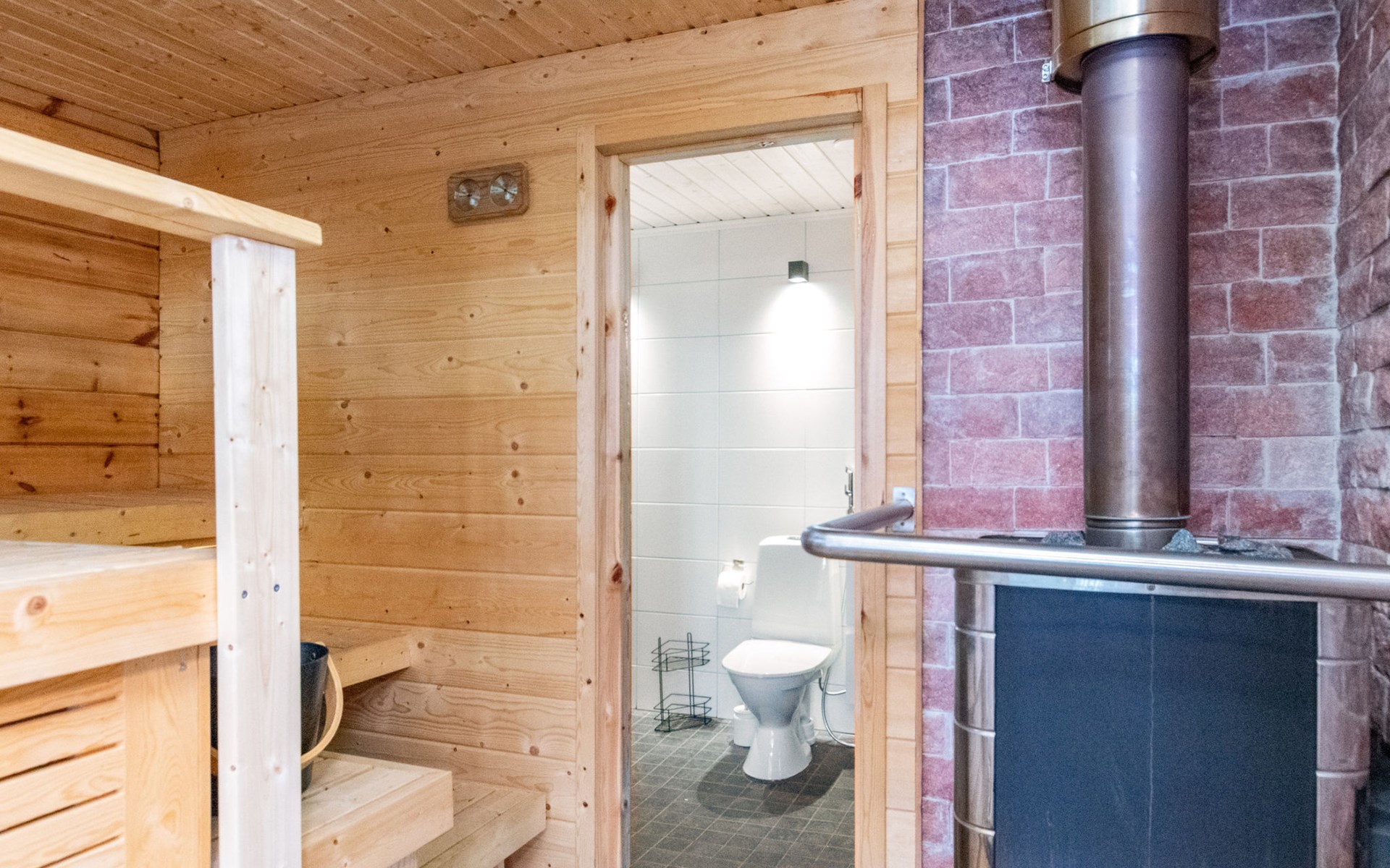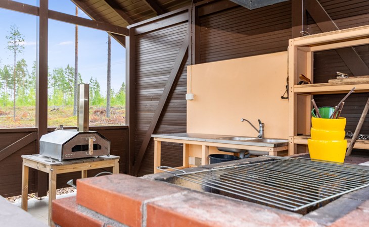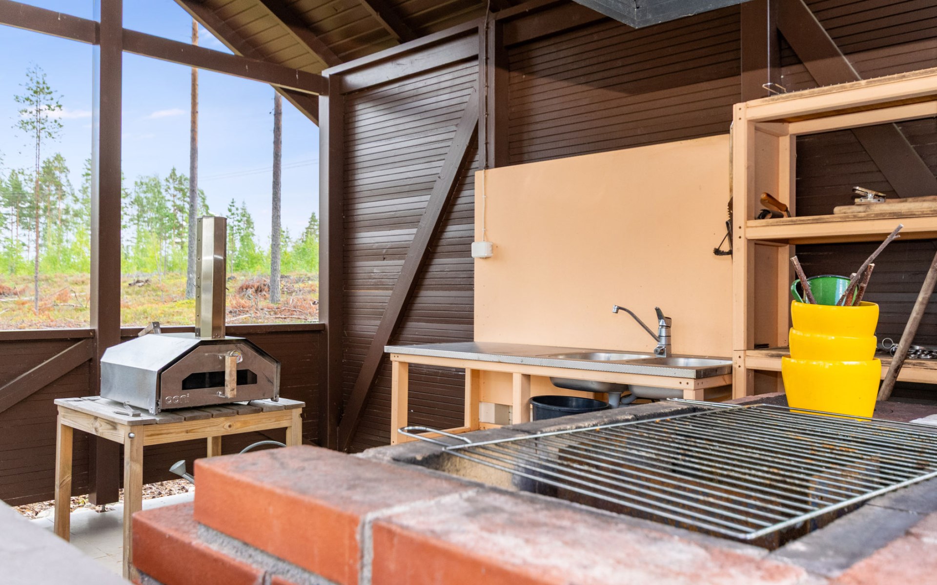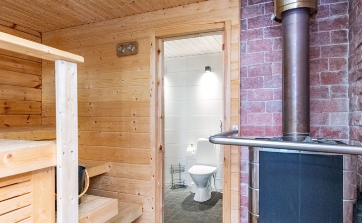 A separate sauna building with a wood stove in the sauna, a toilet, shower and washing machine in the washroom, a fireplace room with a sofa bed for two. A large covered terrace, which is connected to a table and a dining table for the whole group. Wooden summer kitchen for outdoor cooking. Open swimming in winter.
