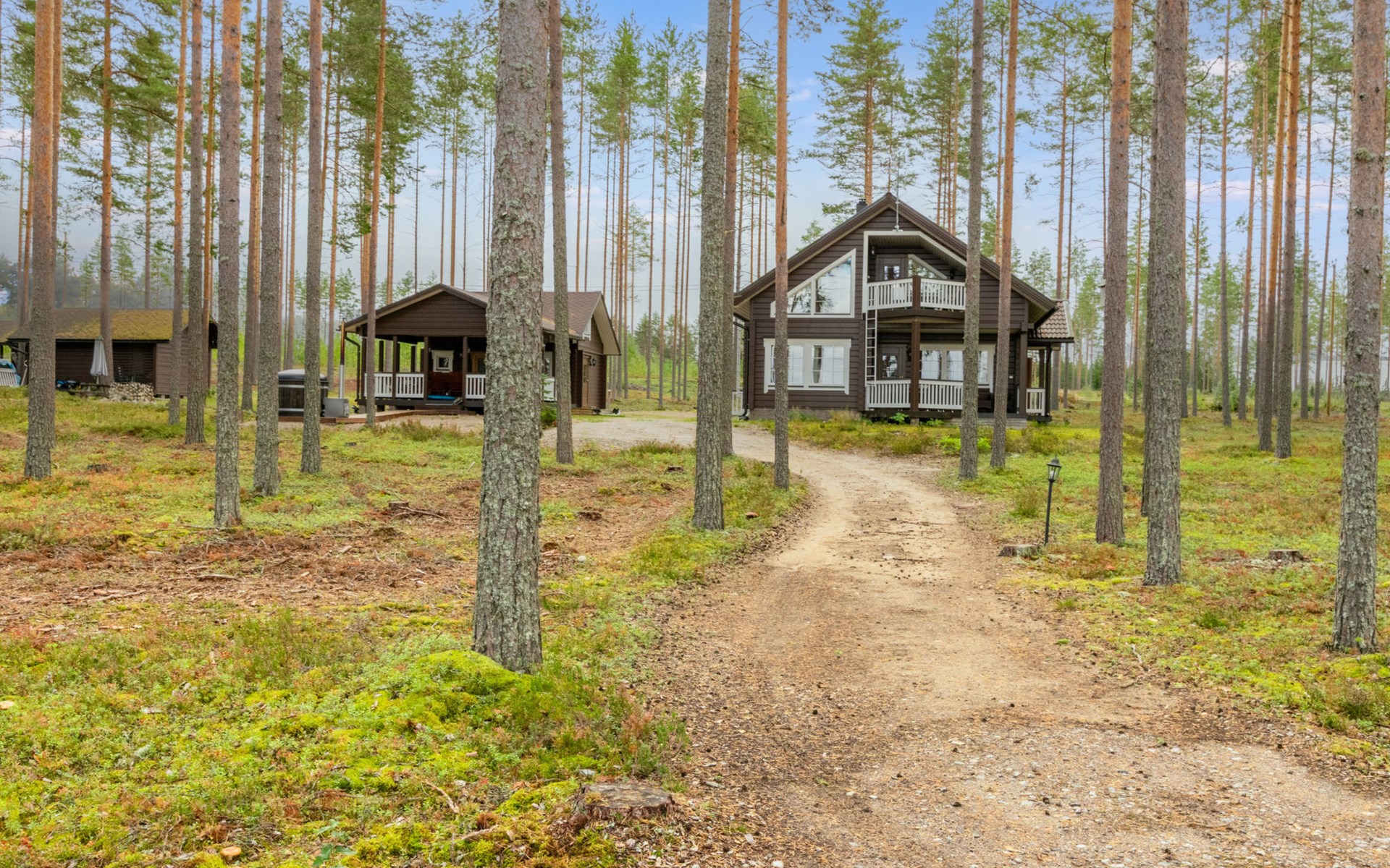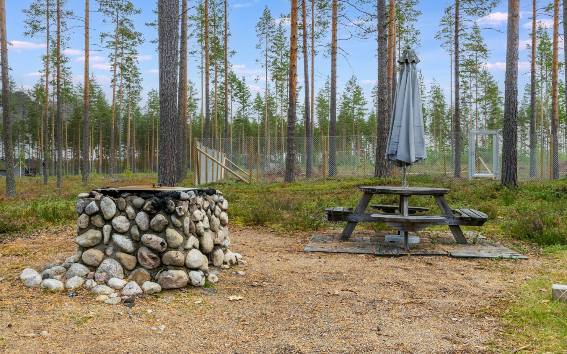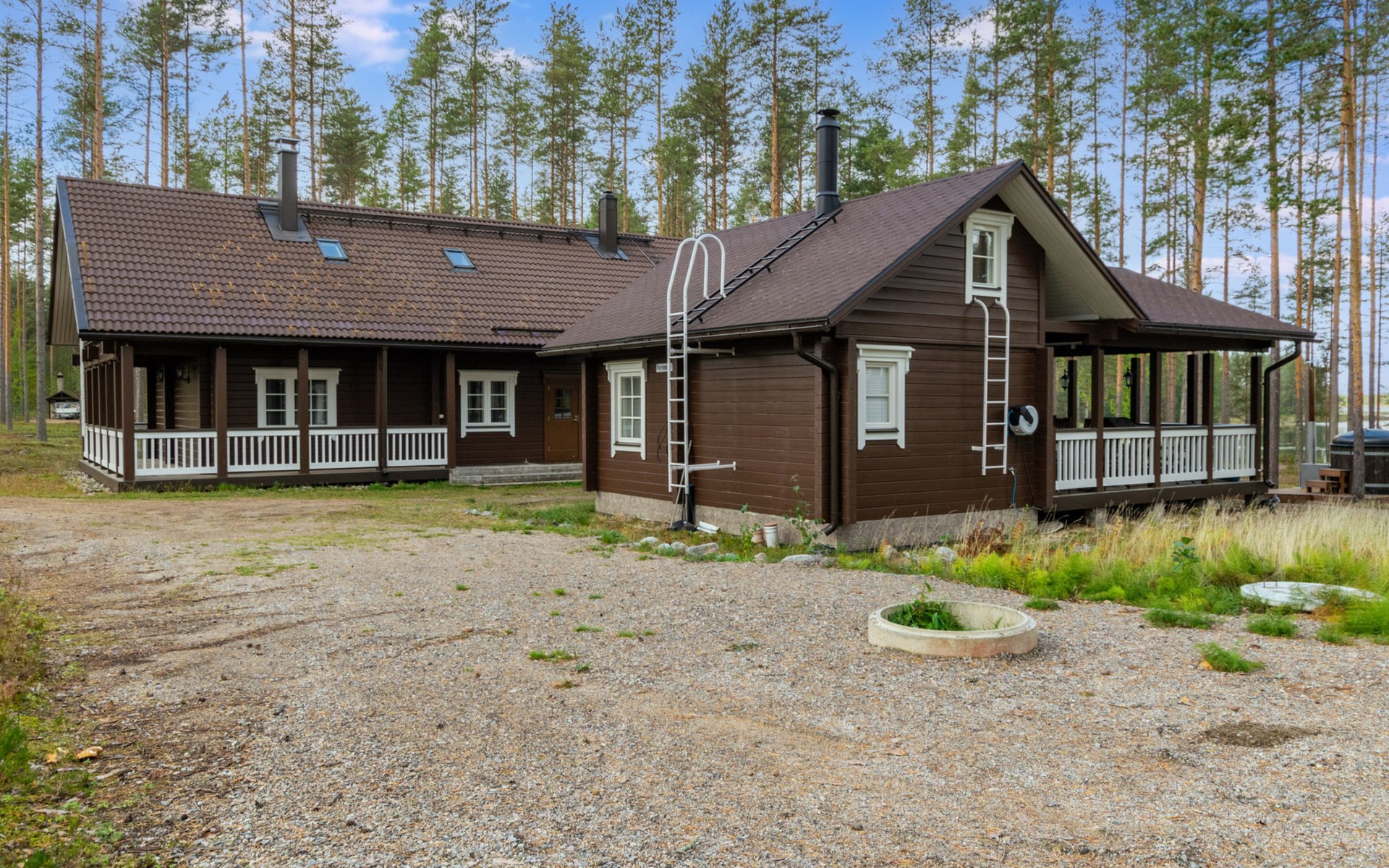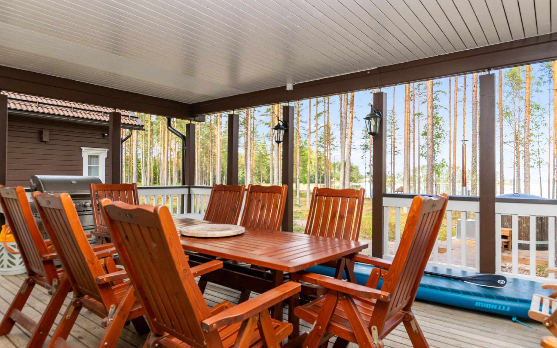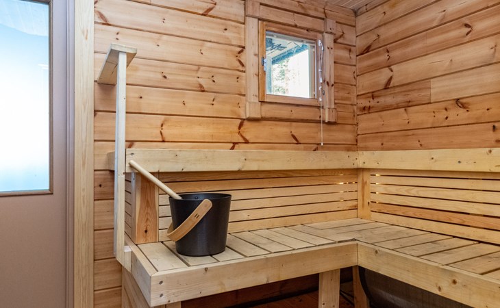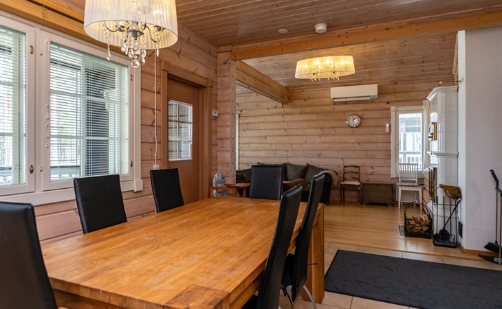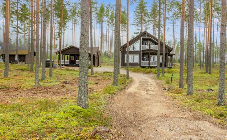 A separate sauna building with a wood stove in the sauna, a toilet, shower and washing machine in the washroom, a fireplace room with a sofa bed for two. A large covered terrace, which is connected to a table and a dining table for the whole group. Wooden summer kitchen for outdoor cooking. Open swimming in winter.