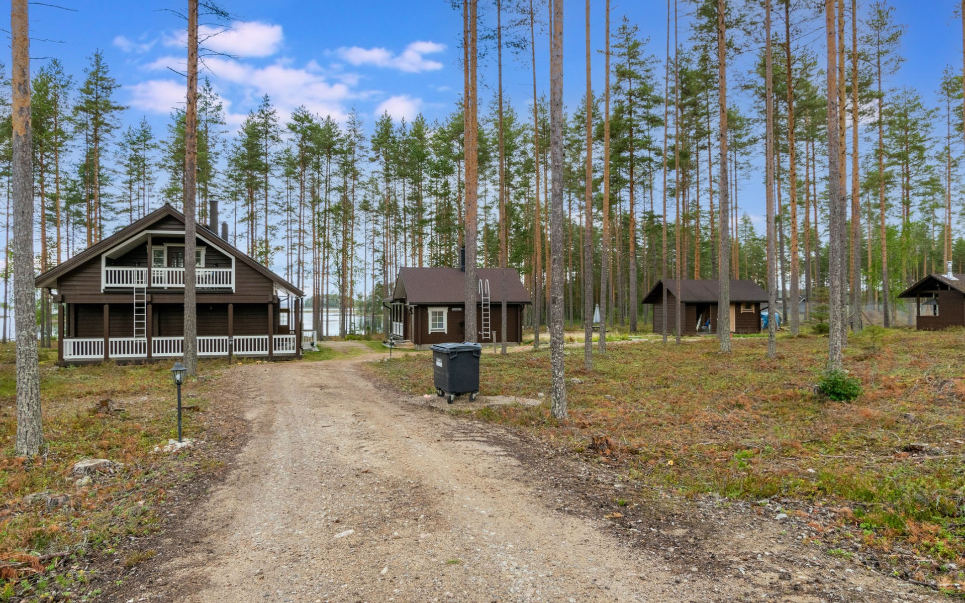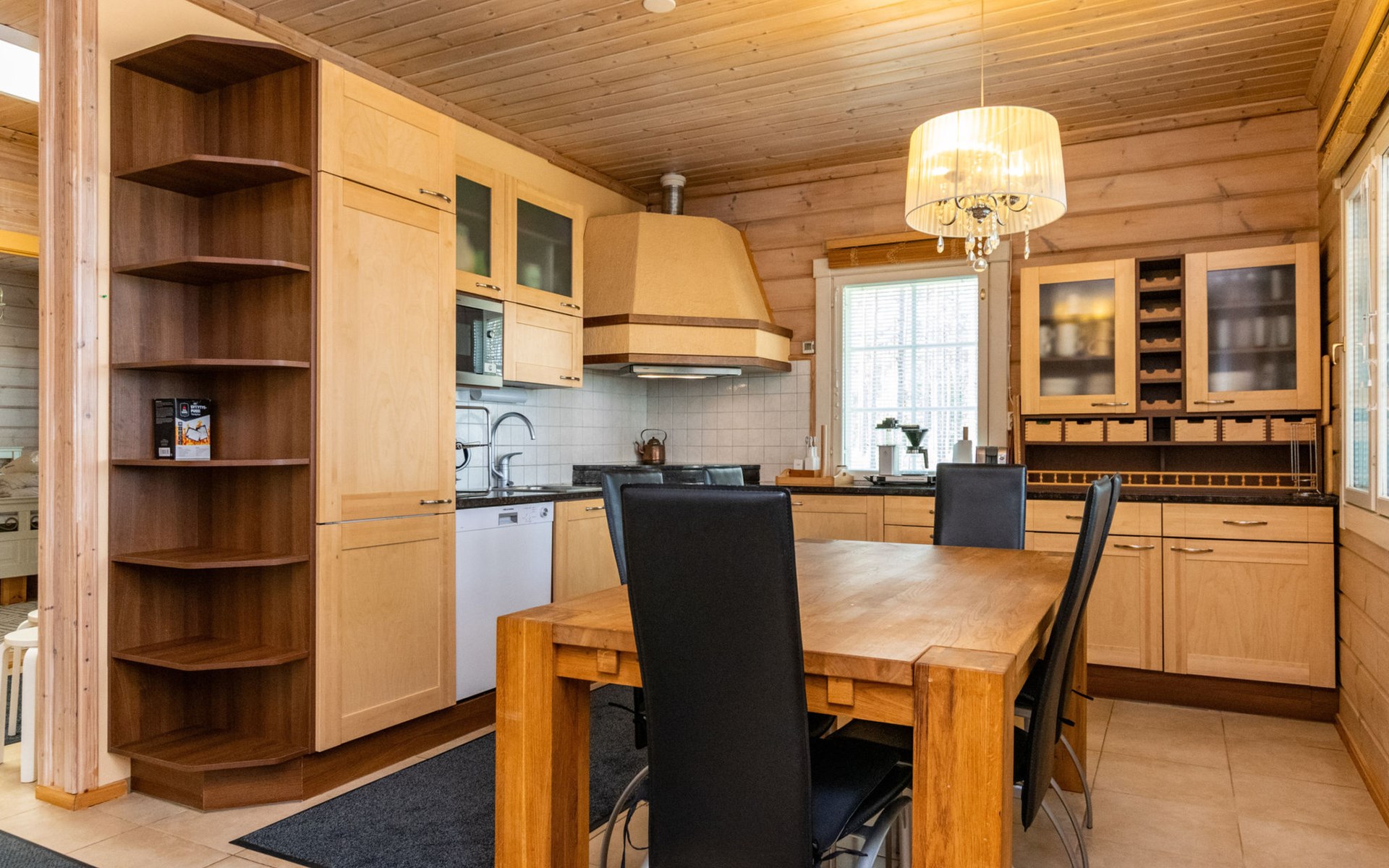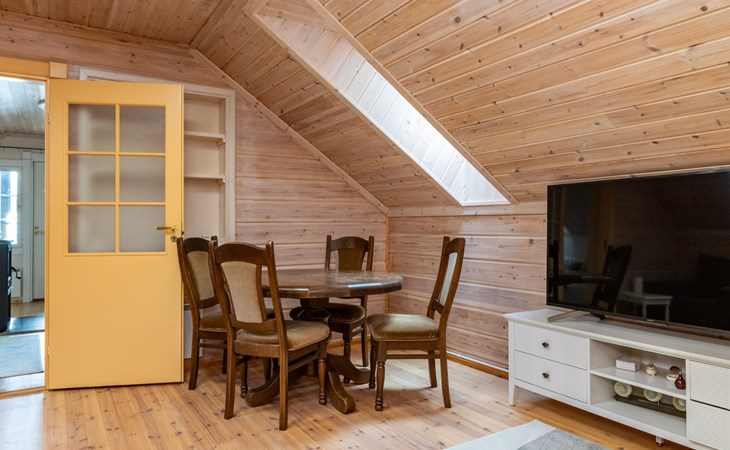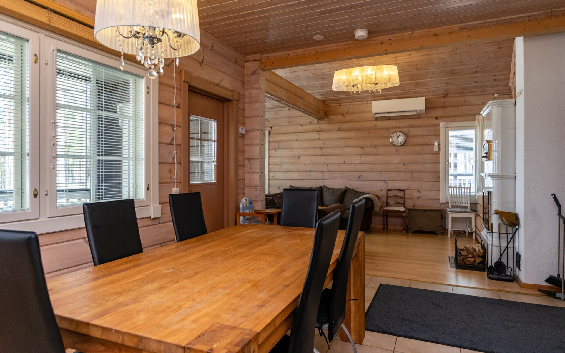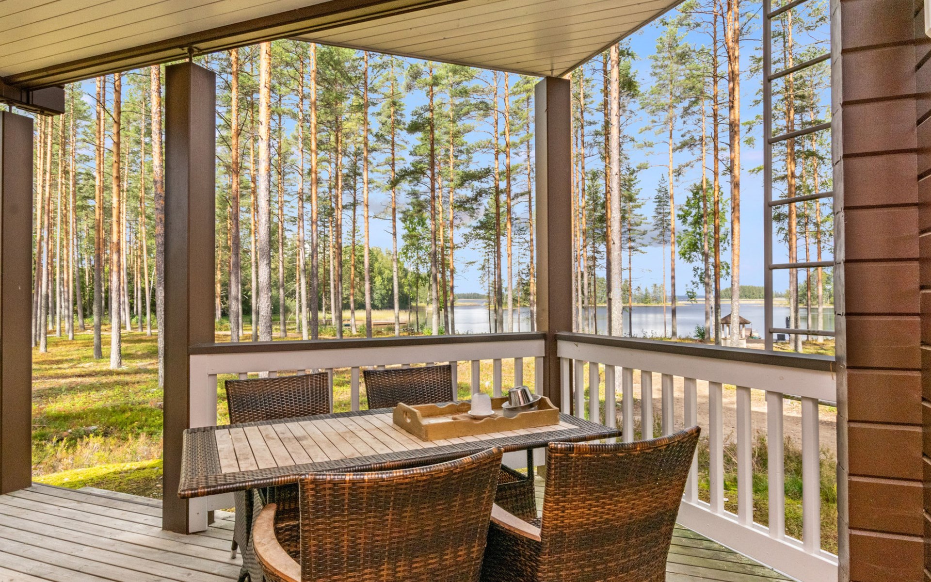 A separate sauna building with a wood stove in the sauna, a toilet, shower and washing machine in the washroom, a fireplace room with a sofa bed for two. A large covered terrace, which is connected to a table and a dining table for the whole group. Wooden summer kitchen for outdoor cooking. Open swimming in winter.