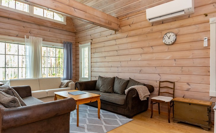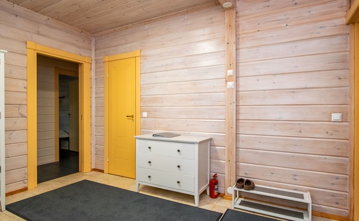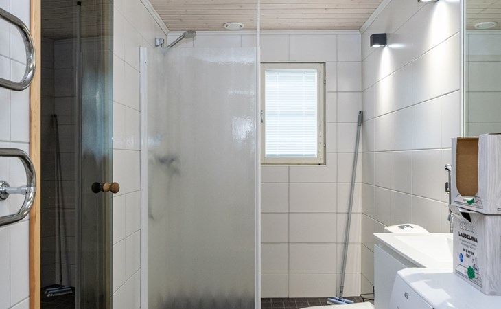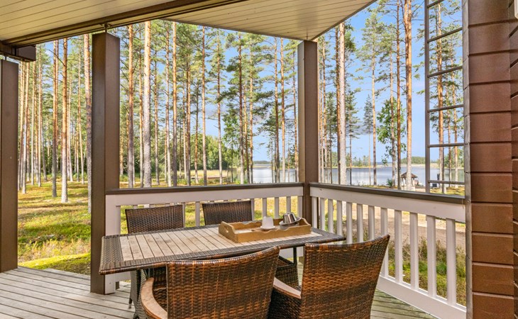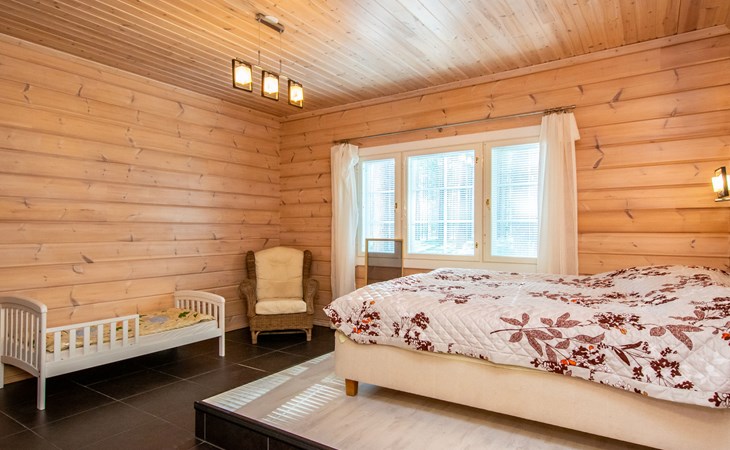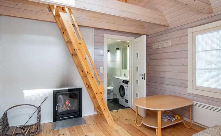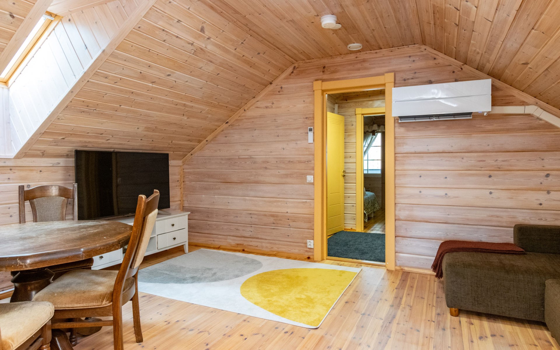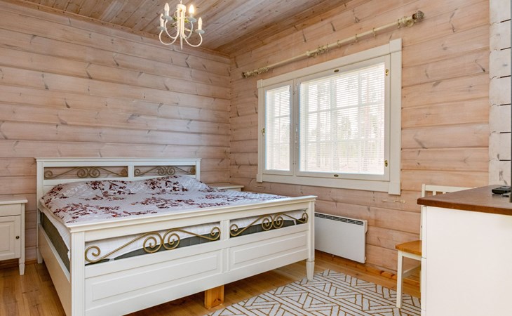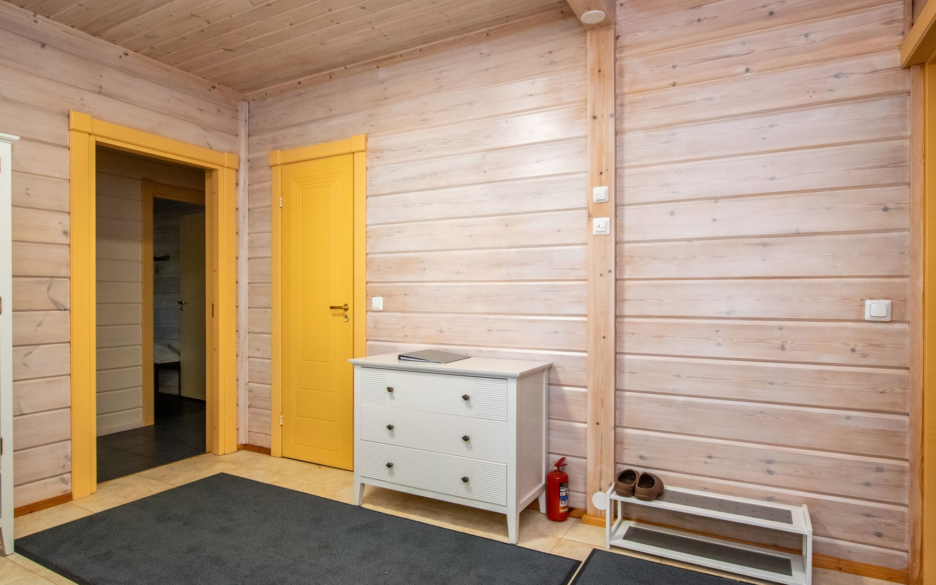 A separate sauna building with a wood stove in the sauna, a toilet, shower and washing machine in the washroom, a fireplace room with a sofa bed for two. A large covered terrace, which is connected to a table and a dining table for the whole group. Wooden summer kitchen for outdoor cooking. Open swimming in winter.