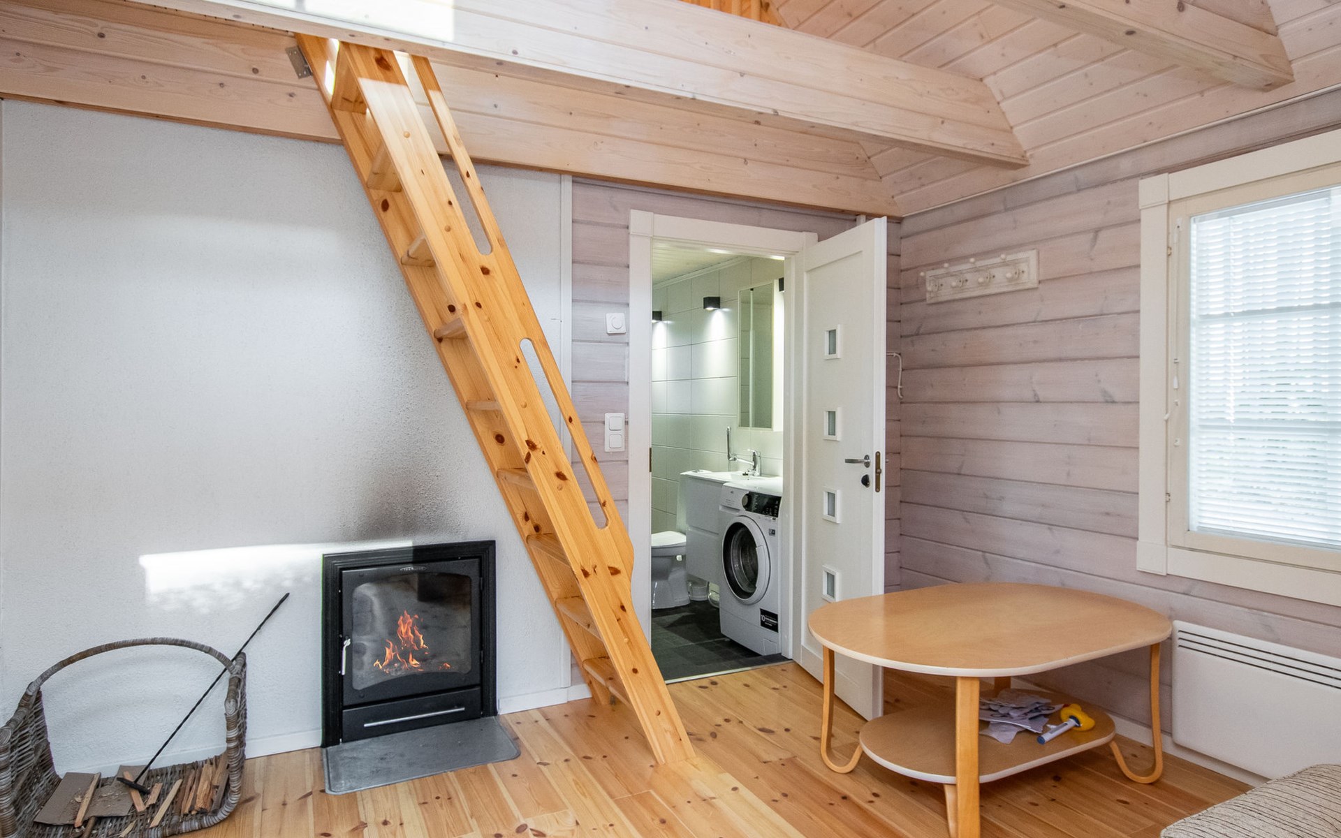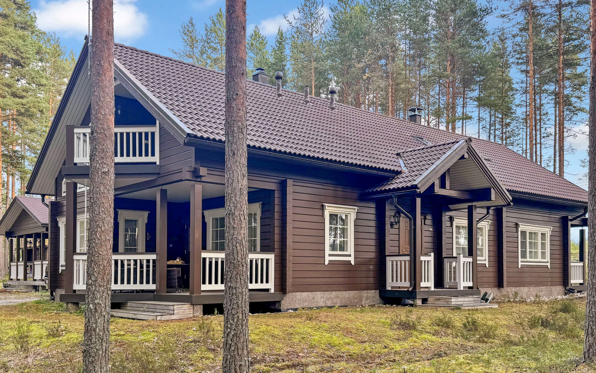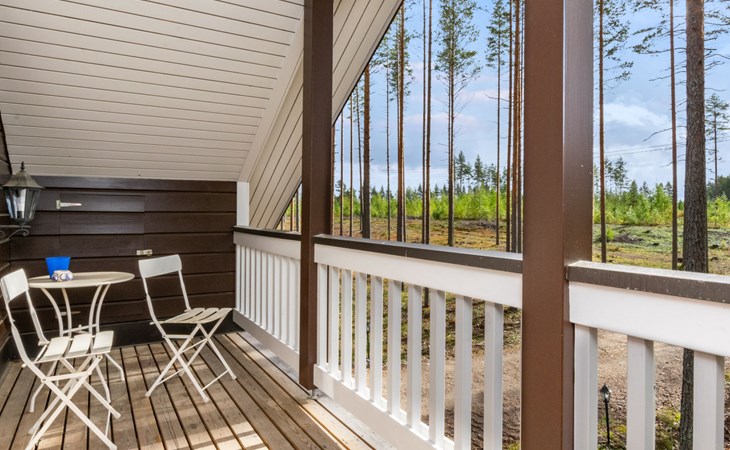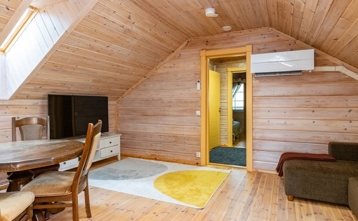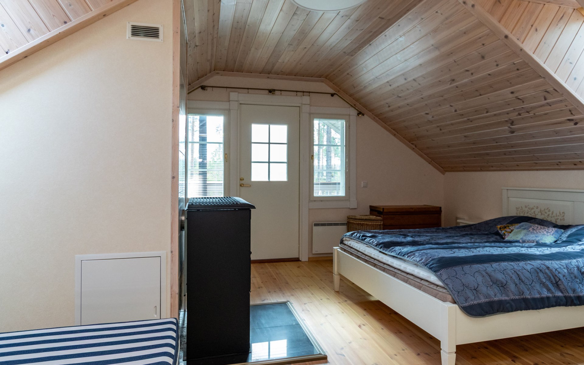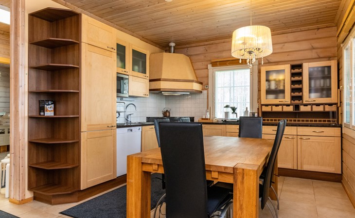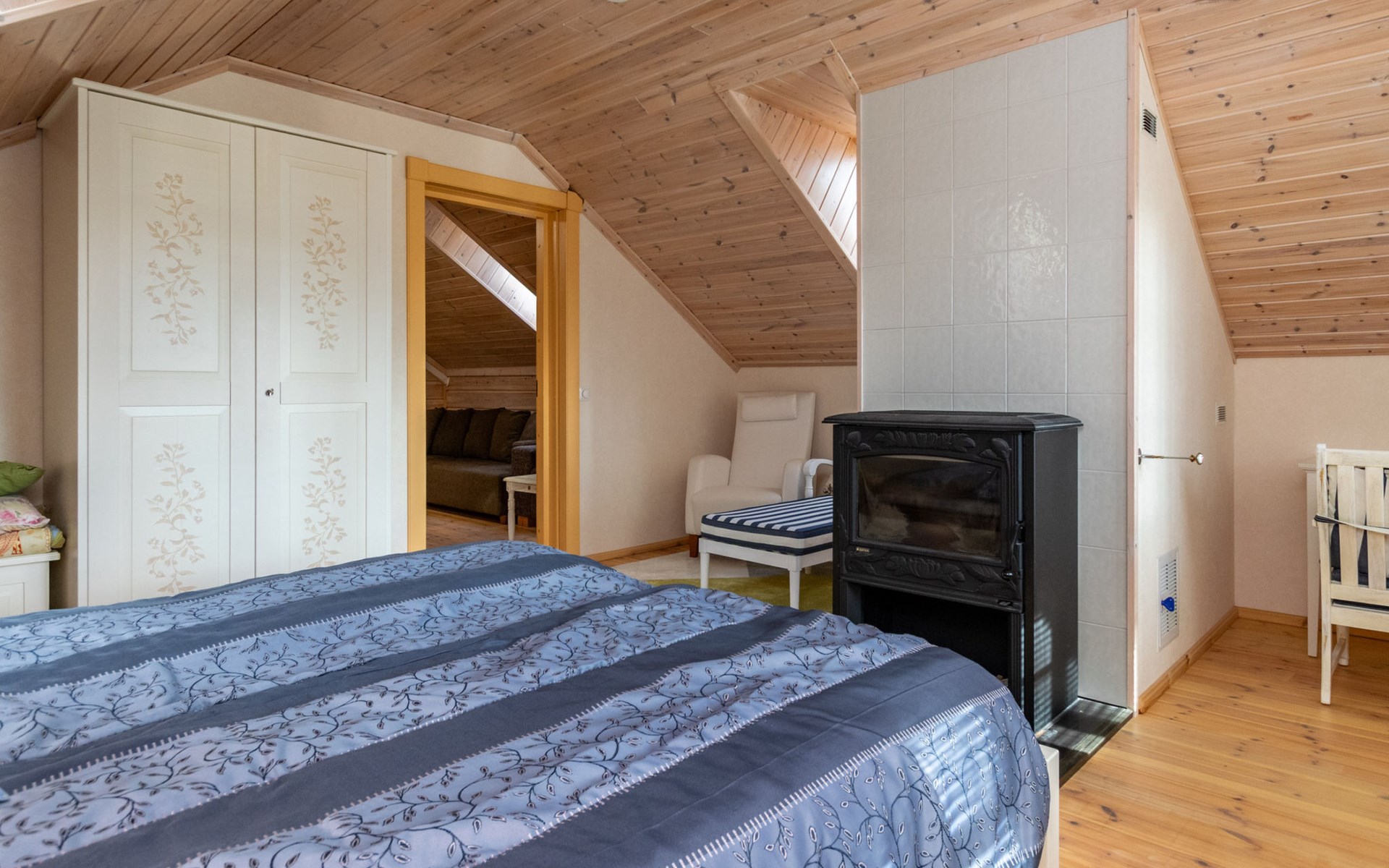A separate sauna building with a wood stove in the sauna, a toilet, shower and washing machine in the washroom, a fireplace room with a sofa bed for two. A large covered terrace, which is connected to a table and a dining table for the whole group. Wooden summer kitchen for outdoor cooking. Open swimming in winter.
