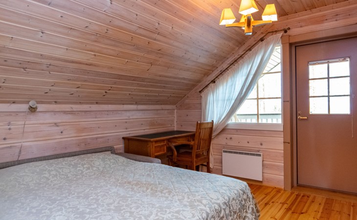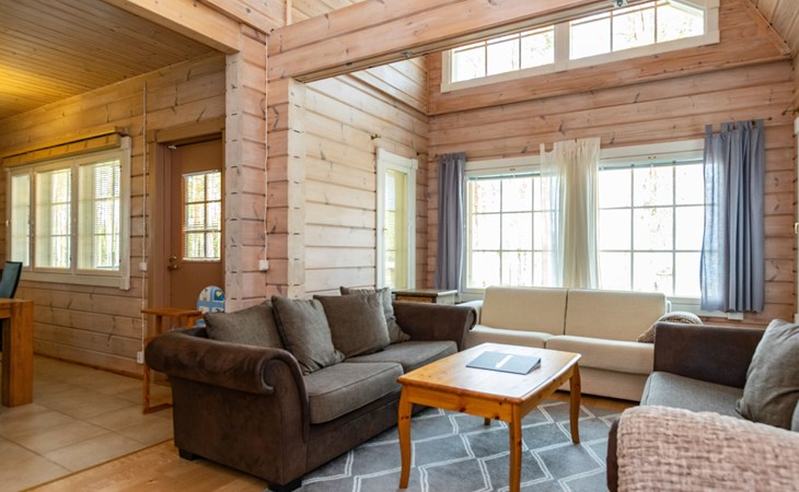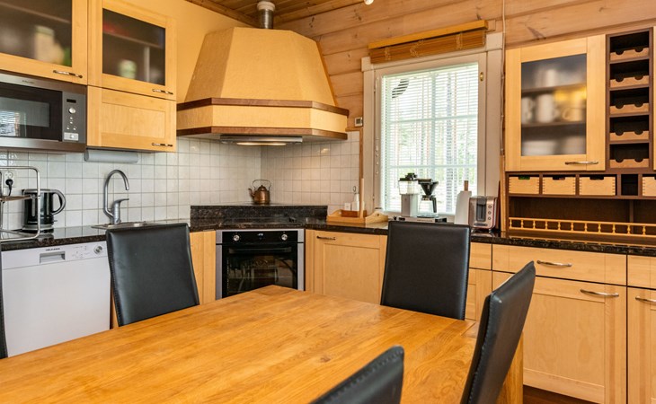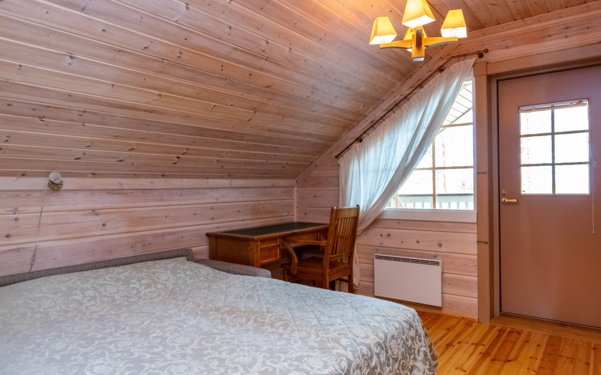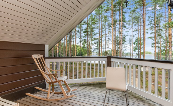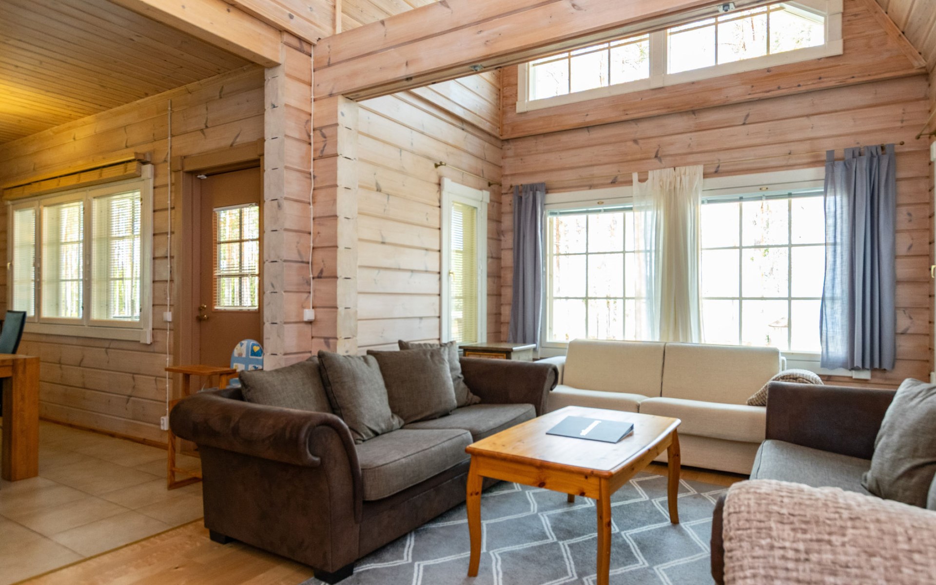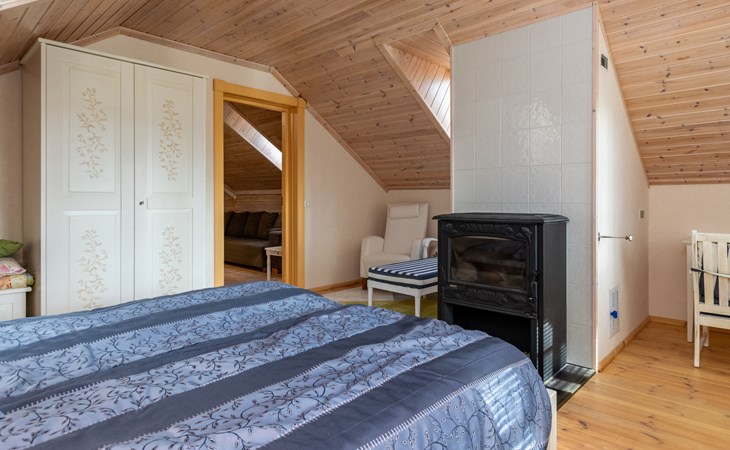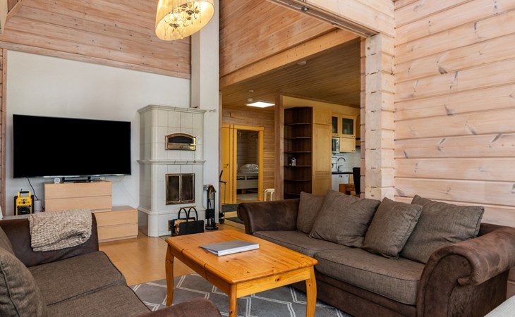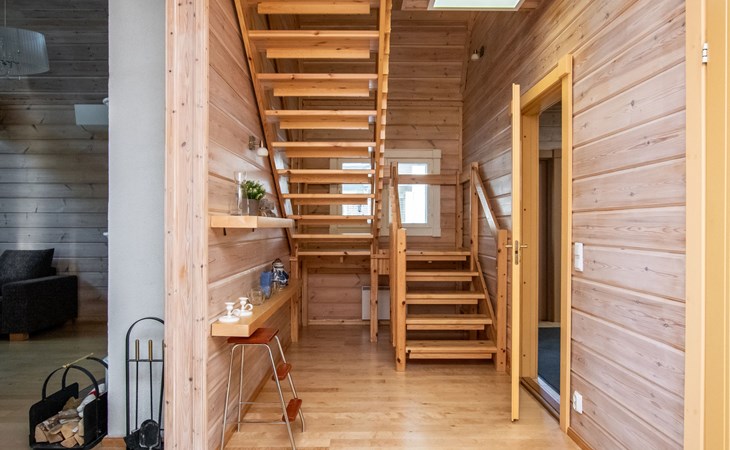 A separate sauna building with a wood stove in the sauna, a toilet, shower and washing machine in the washroom, a fireplace room with a sofa bed for two. A large covered terrace, which is connected to a table and a dining table for the whole group. Wooden summer kitchen for outdoor cooking. Open swimming in winter.