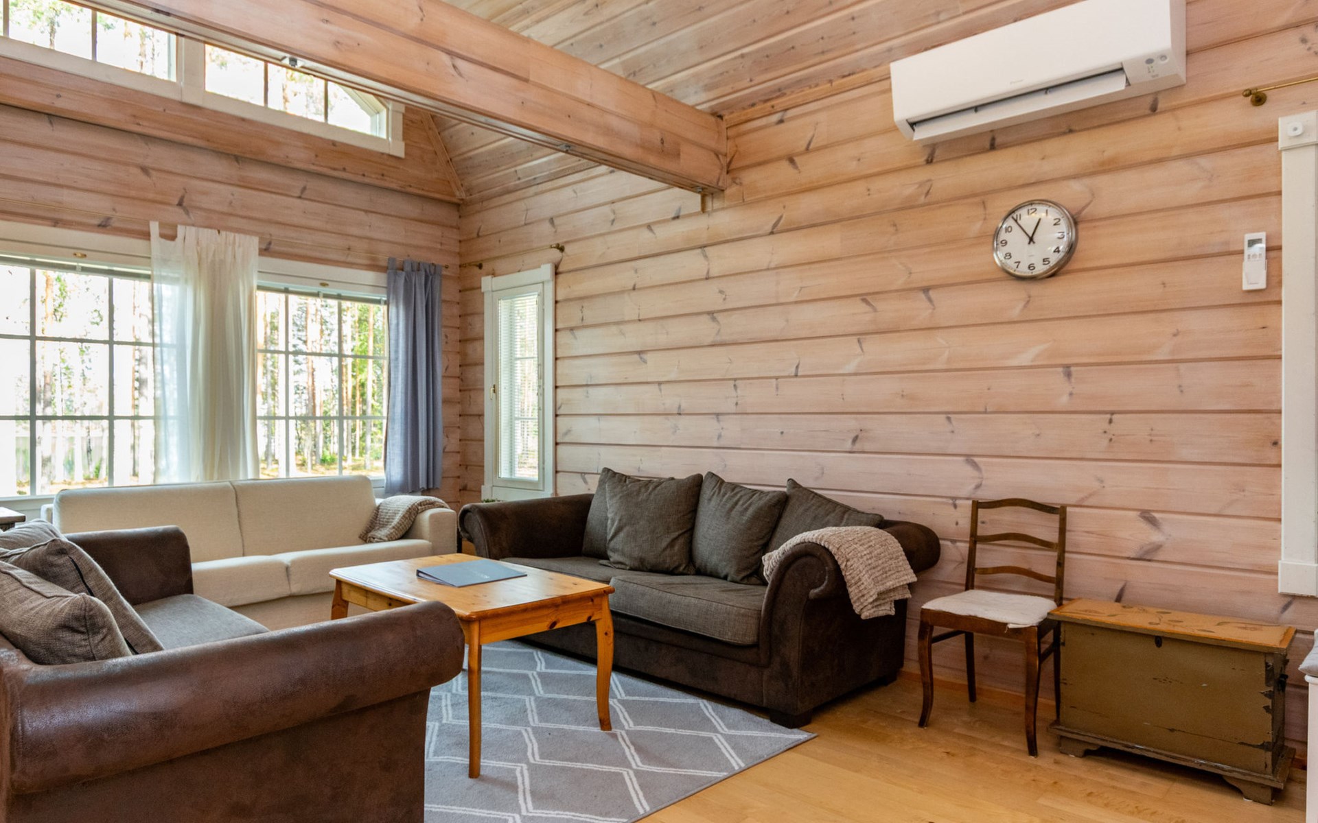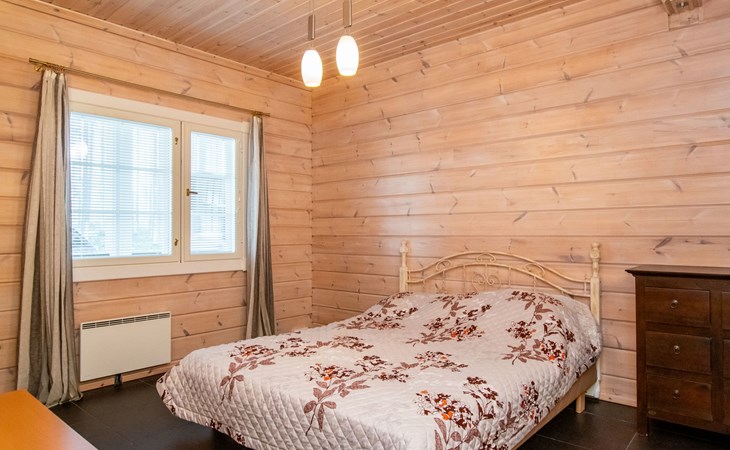 Log cabin 2013, living room kitchen with air heat pump, 3 bedrooms with double bed in each, toilet and shower in the bathroom, hall, covered back terrace.