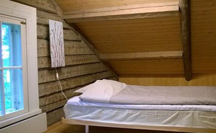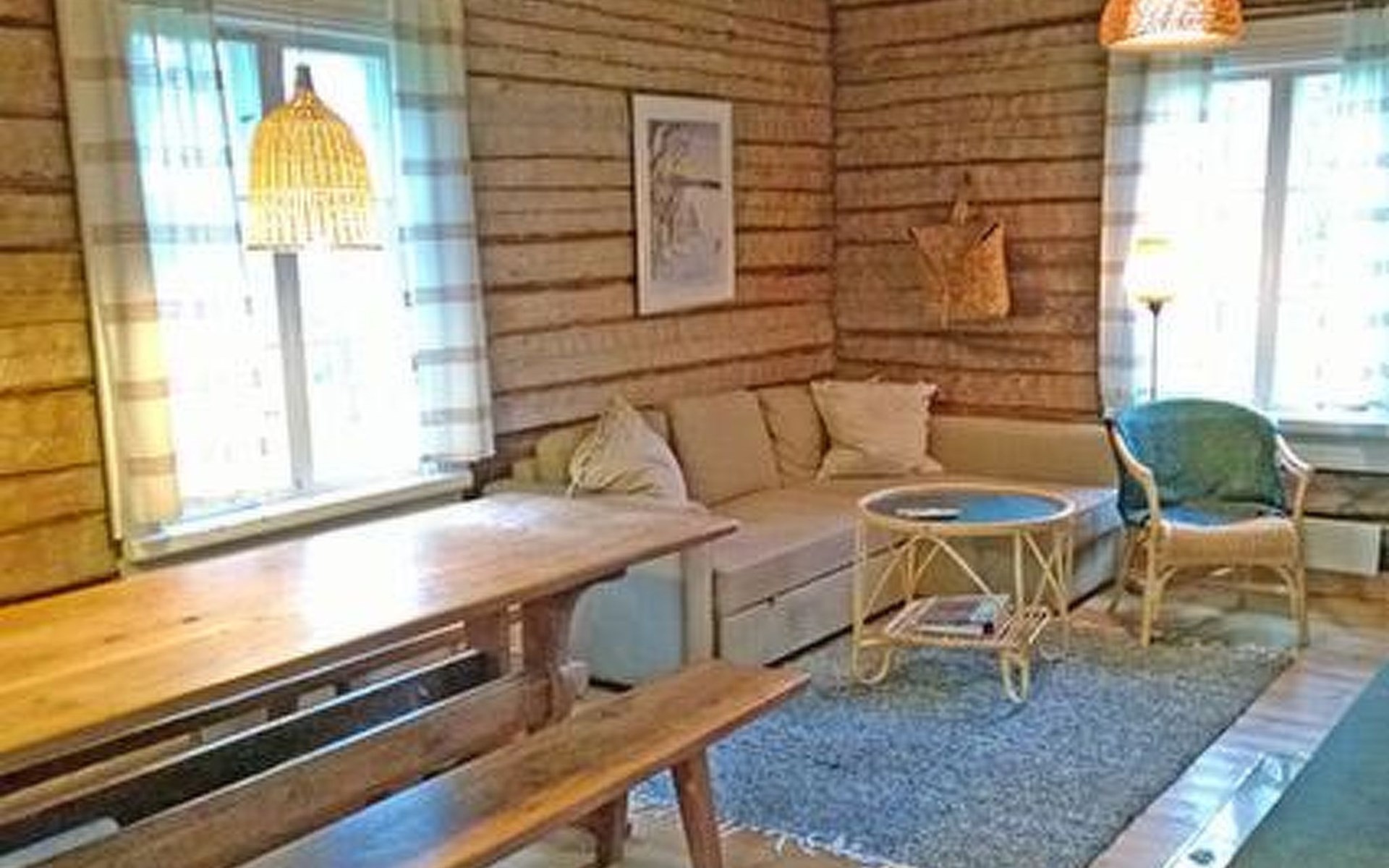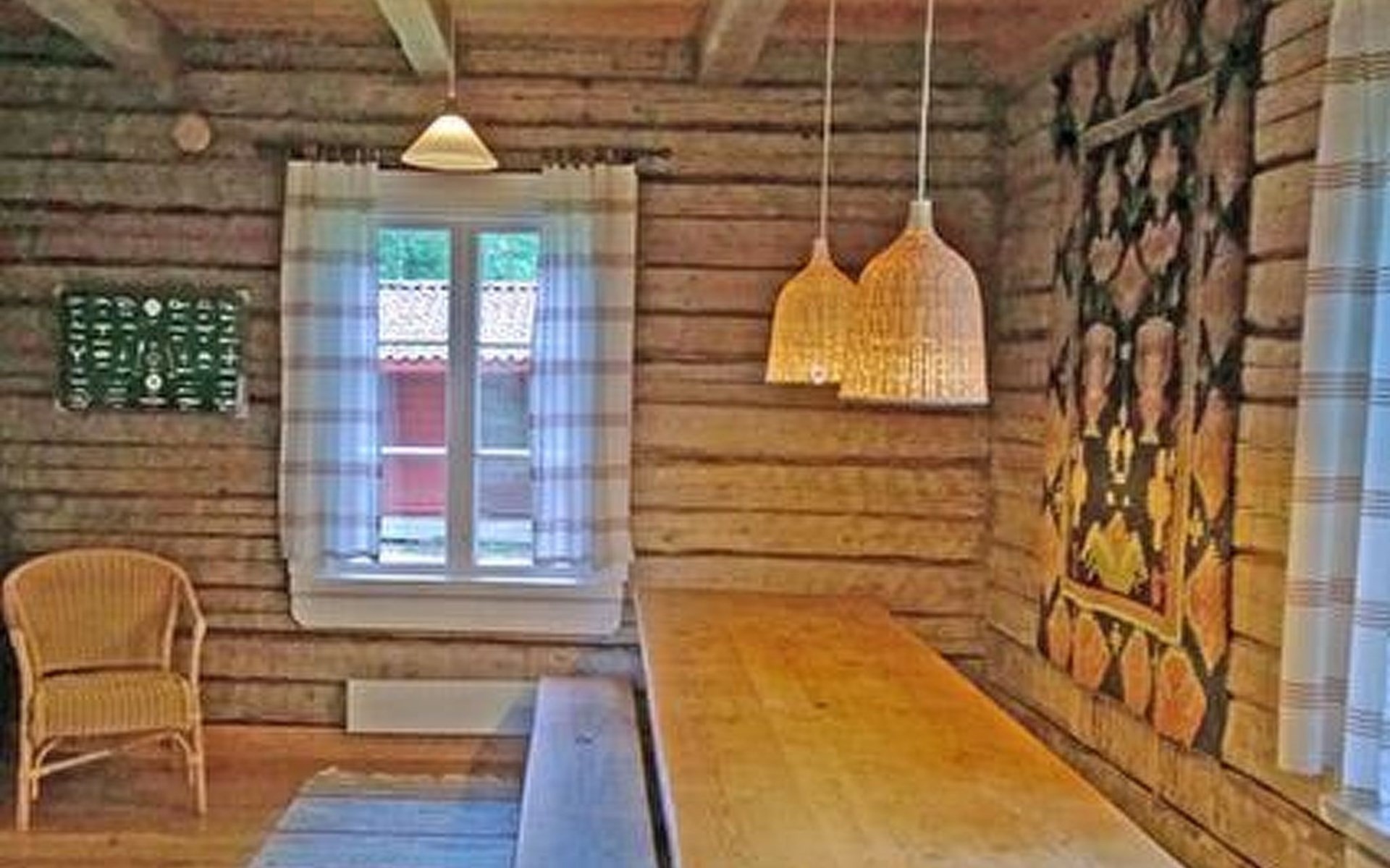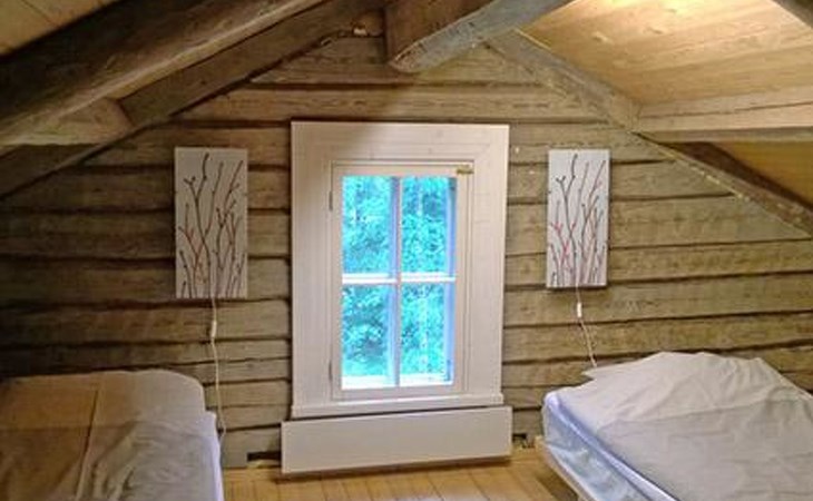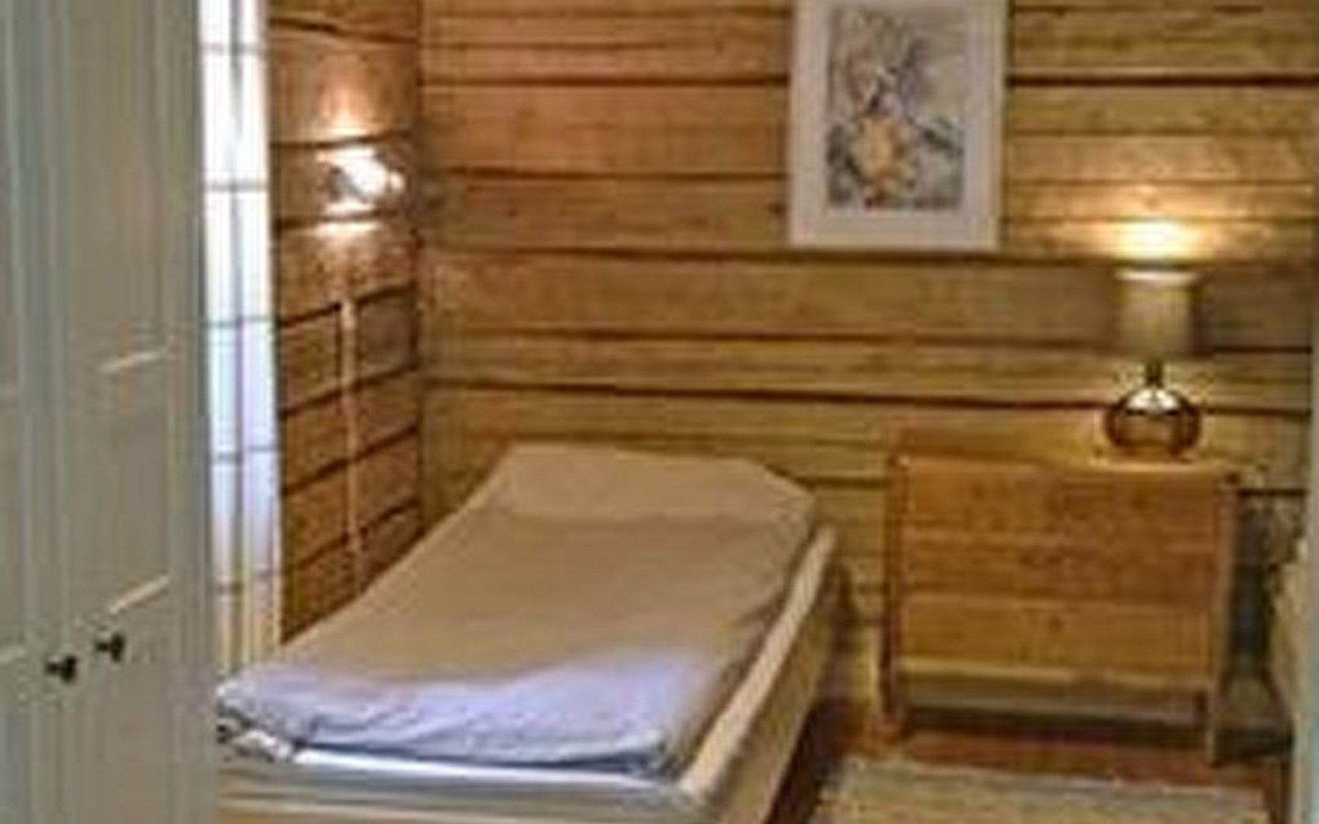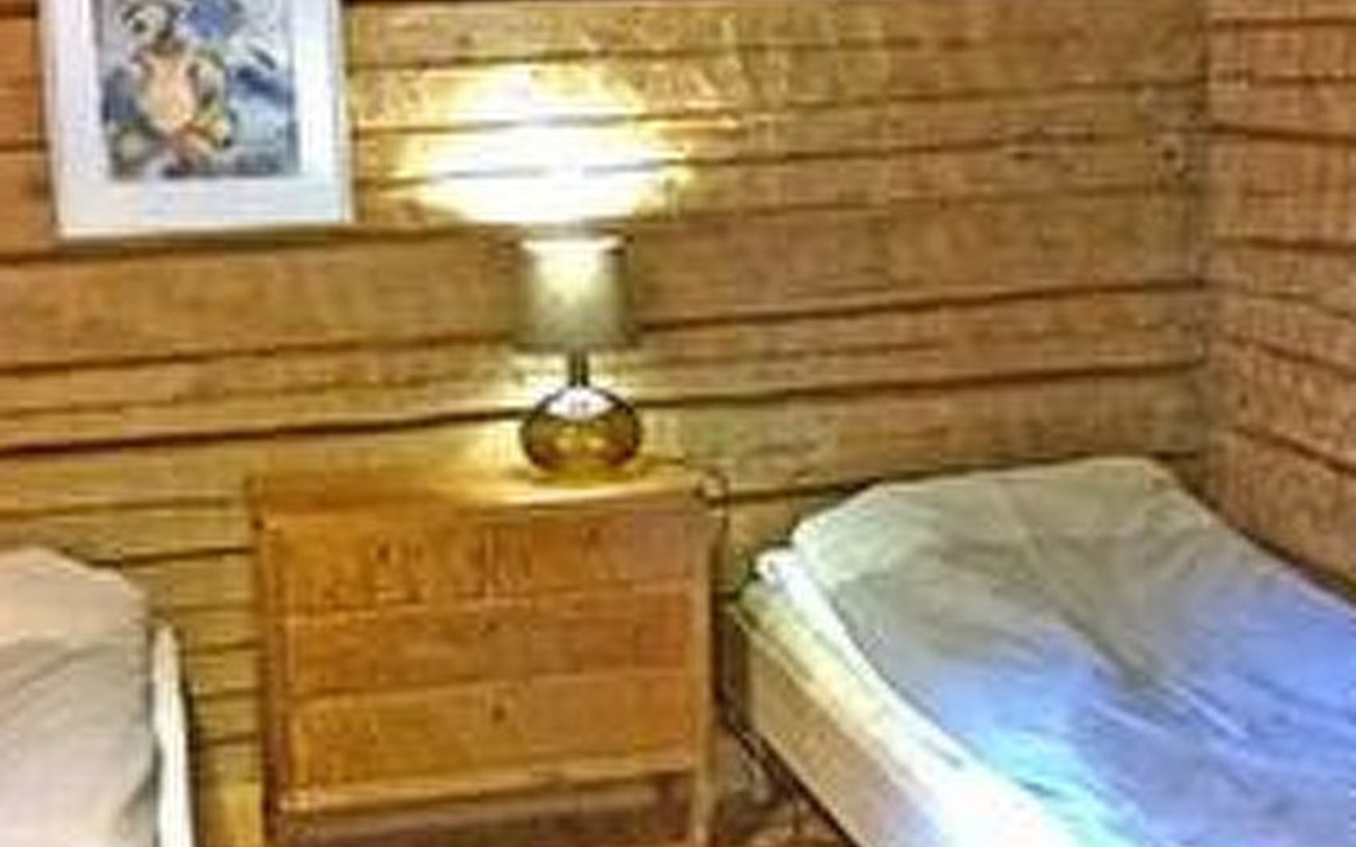 Log cottage 1986, living room/kitchen, bedroom 2 beds, upstairs 2 sleeping alcoves closed off by curtains, 3 beds in each (exceptionally in this property, alcoves are included in the number of bedrooms). Additionally 2 extra beds upstairs glazed and open porch.